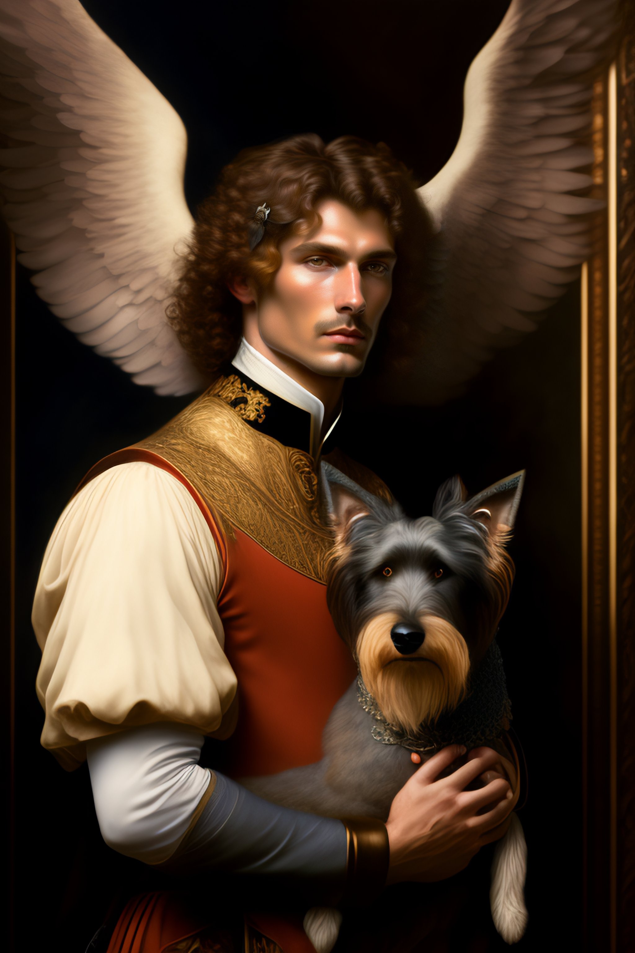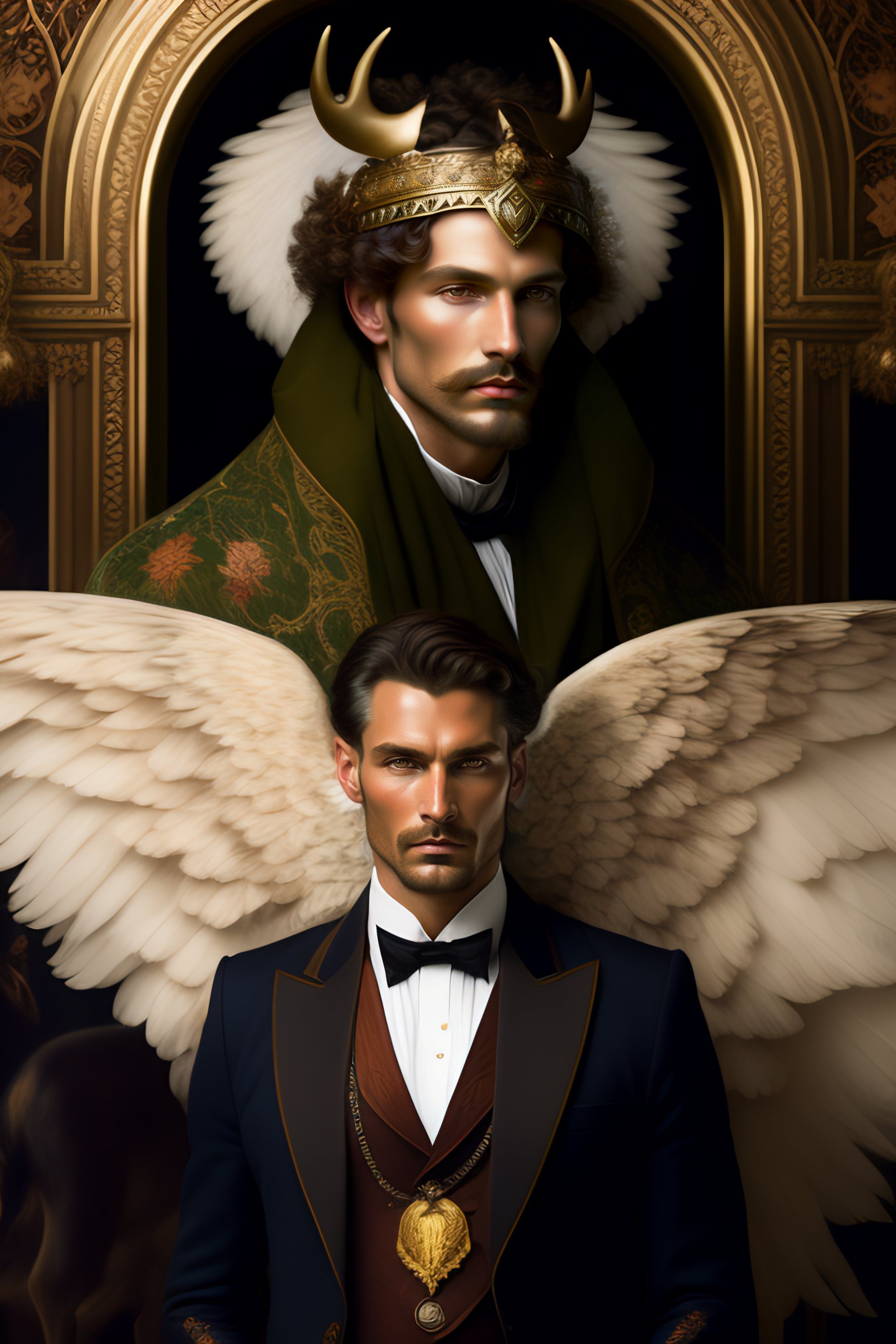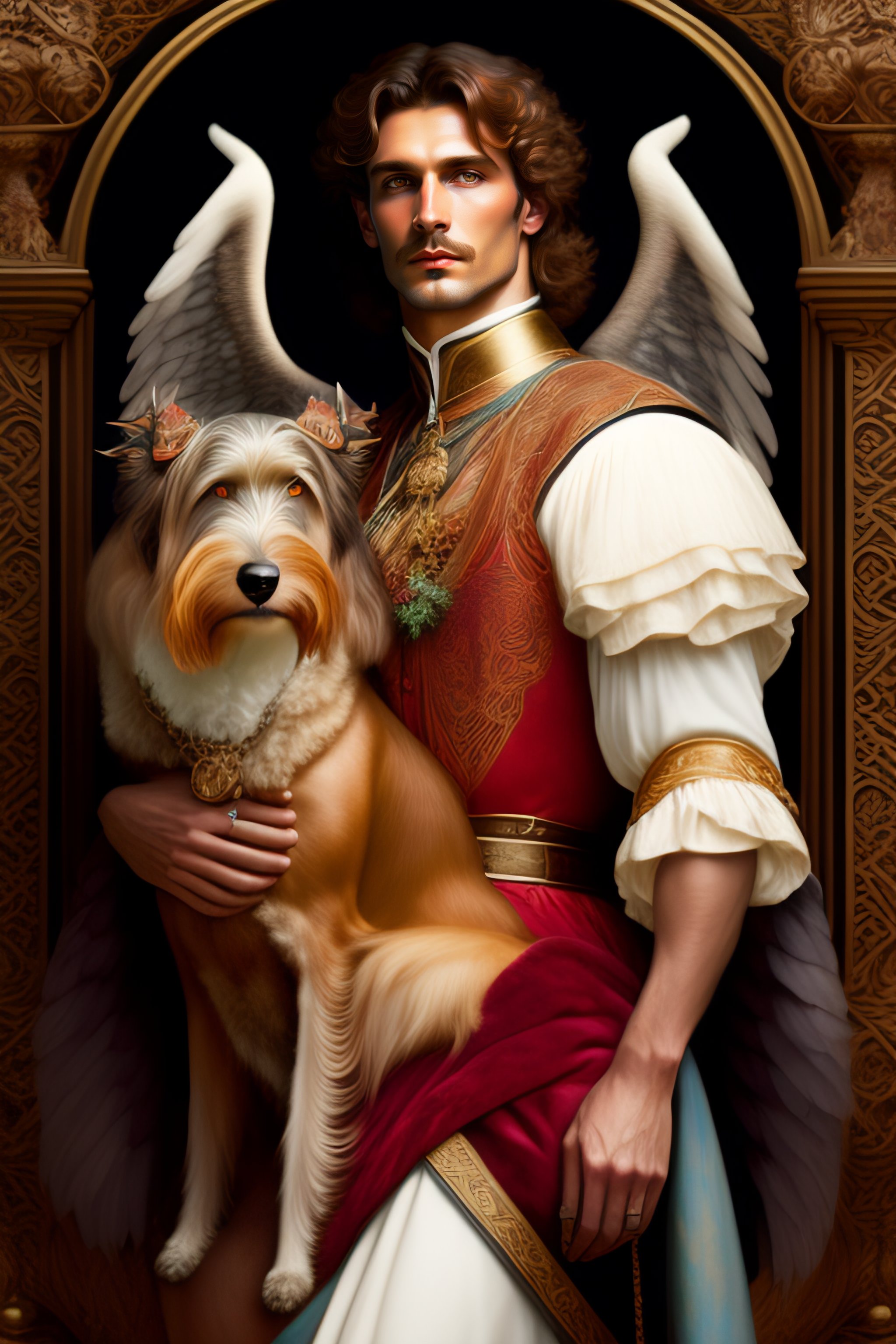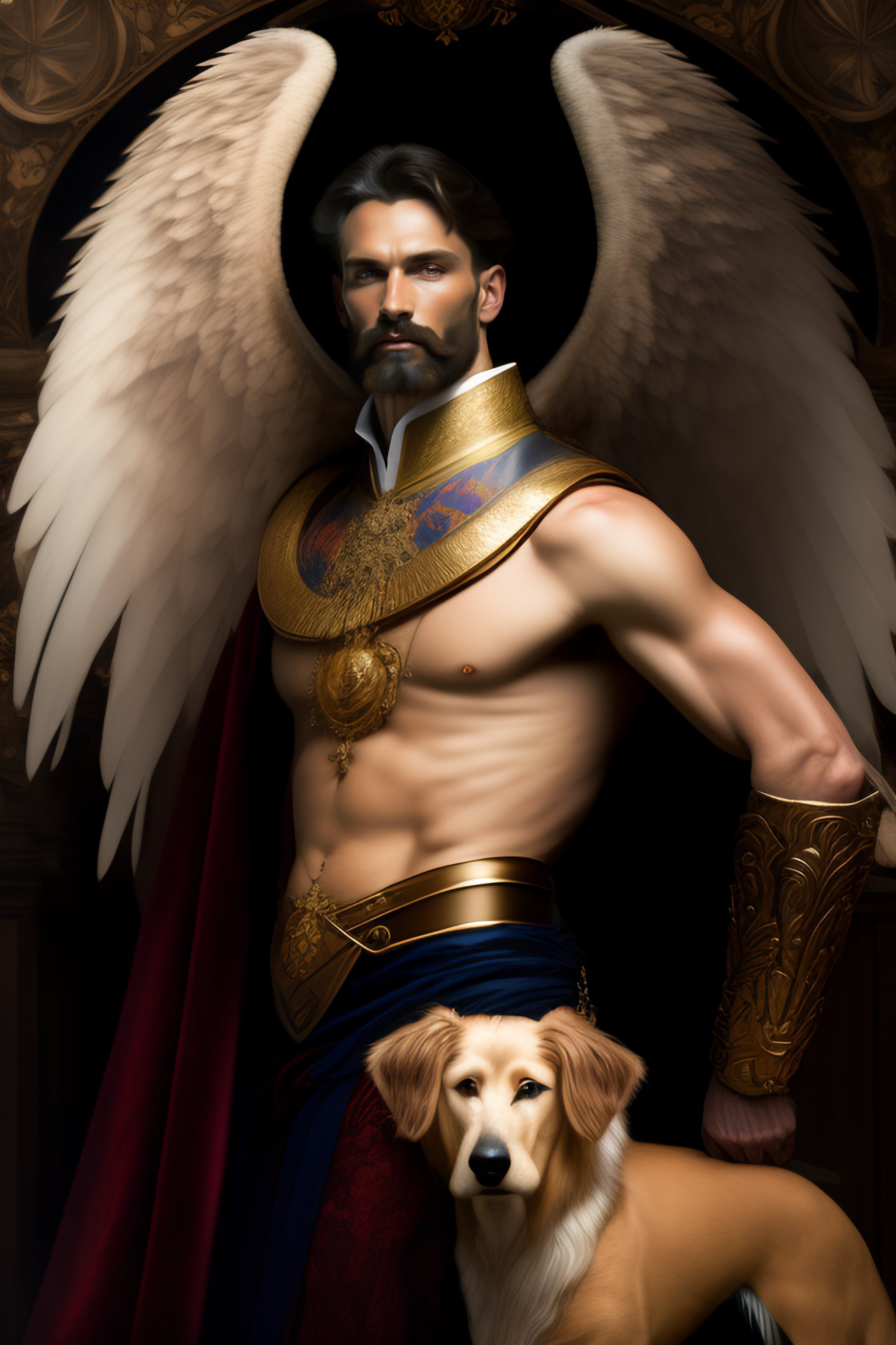 A fallen angel with a scottish deerhound, young, beautiful, atractive man, satan mask, big deer horns, d&d mood, intricate, evil, trickster, wearing tunics, devil prince, elegant, sharp focus, canvas, painting style, illustration, highly detailed, photorealistic, digital painting, concept art, high definition, art by greg rutkowski, alphonse mucha, jan van eyck, august sander, michaelangelo and alexandre cabanel