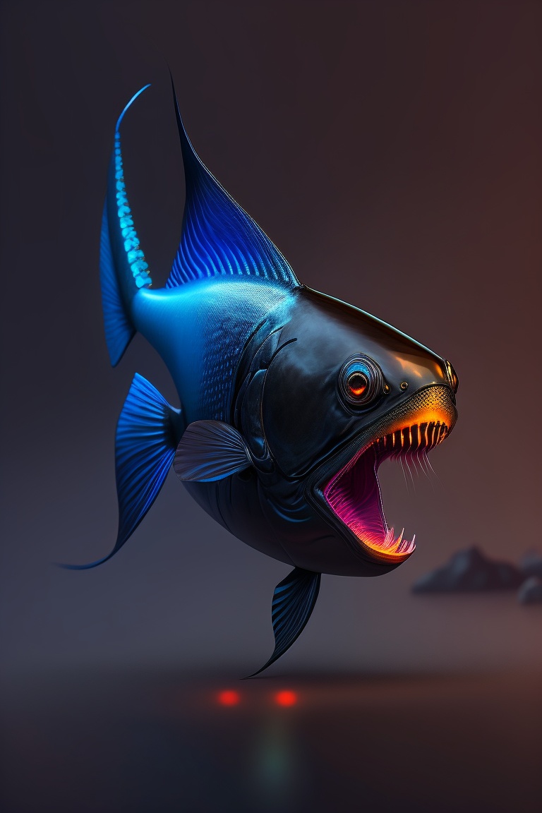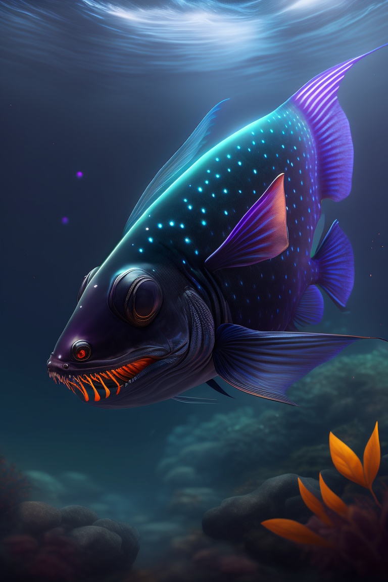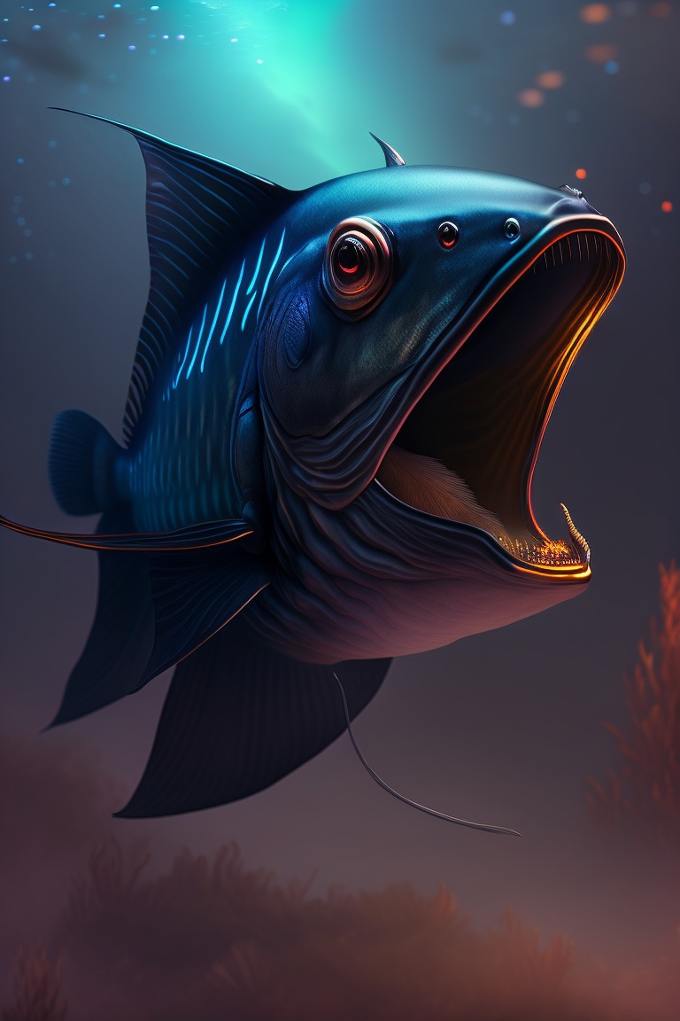 A glowing black dragonfish with big open mouth and numerous long whiskers, profil view with long tail, can see its full body. head turn to us. lurking in a deep and dark sea, surrounded by other mysterious bizzard fishes and creatures. scifi. surreal.