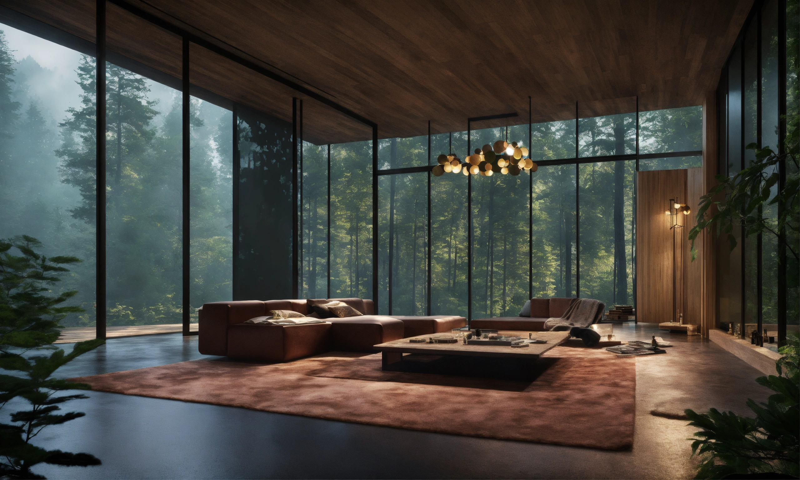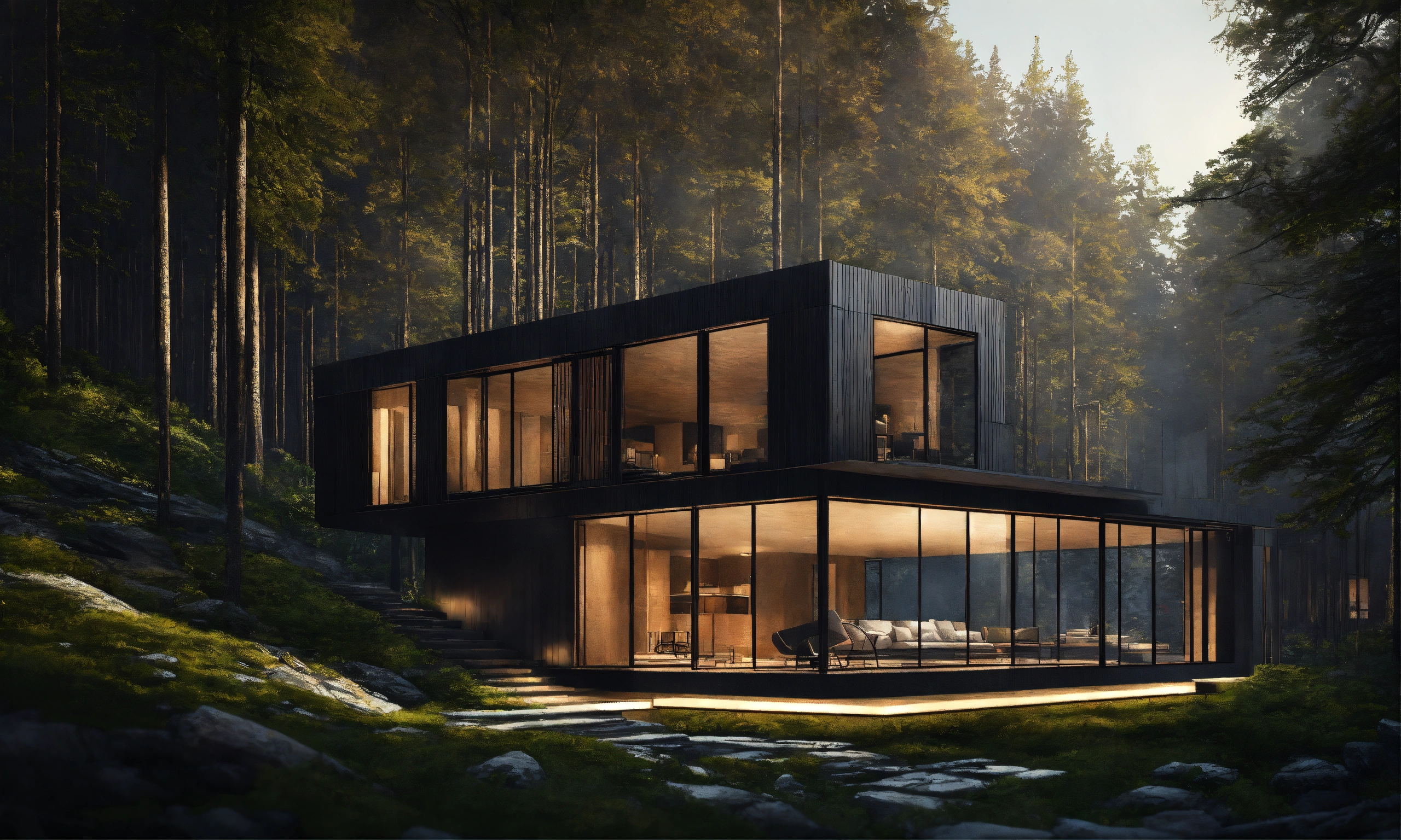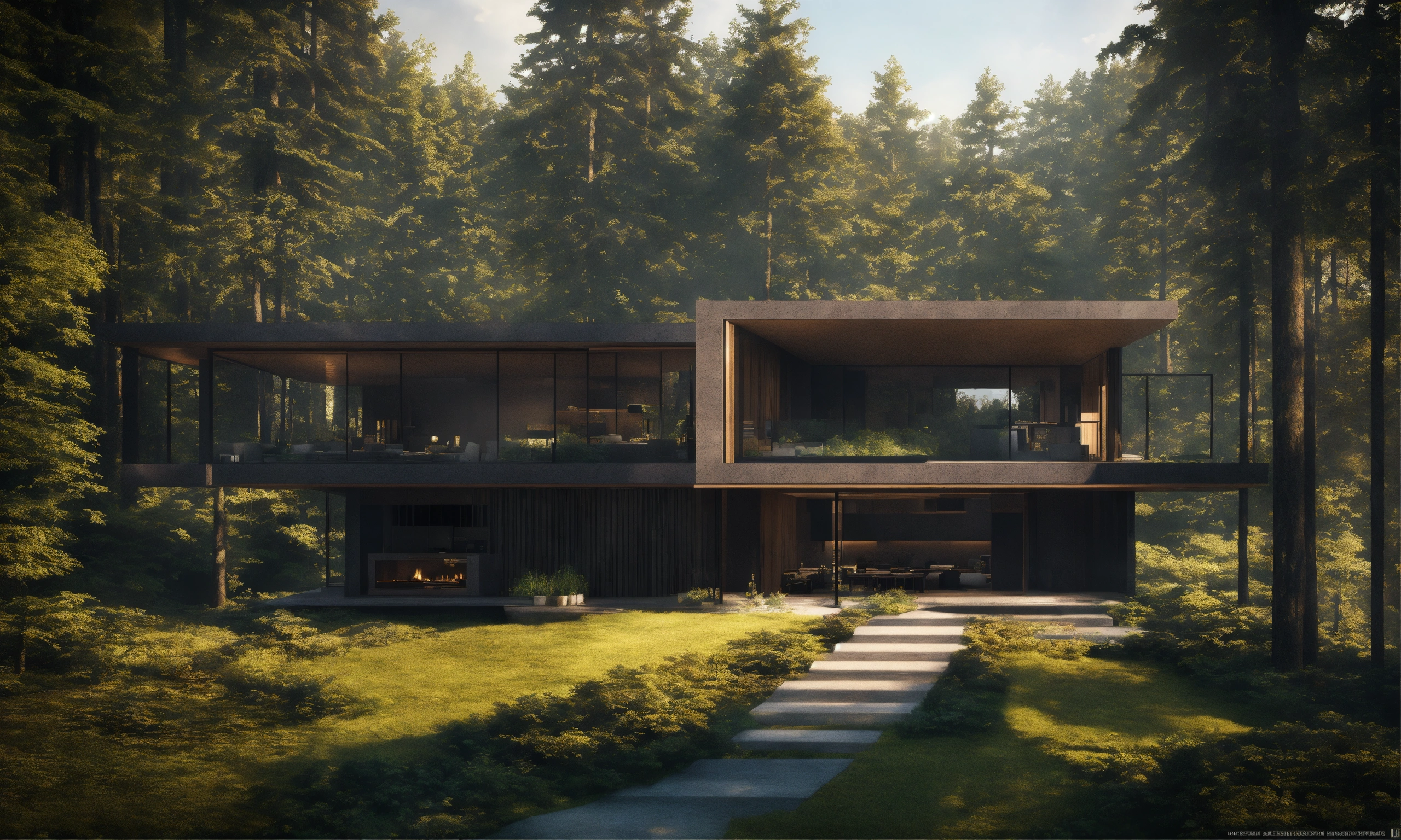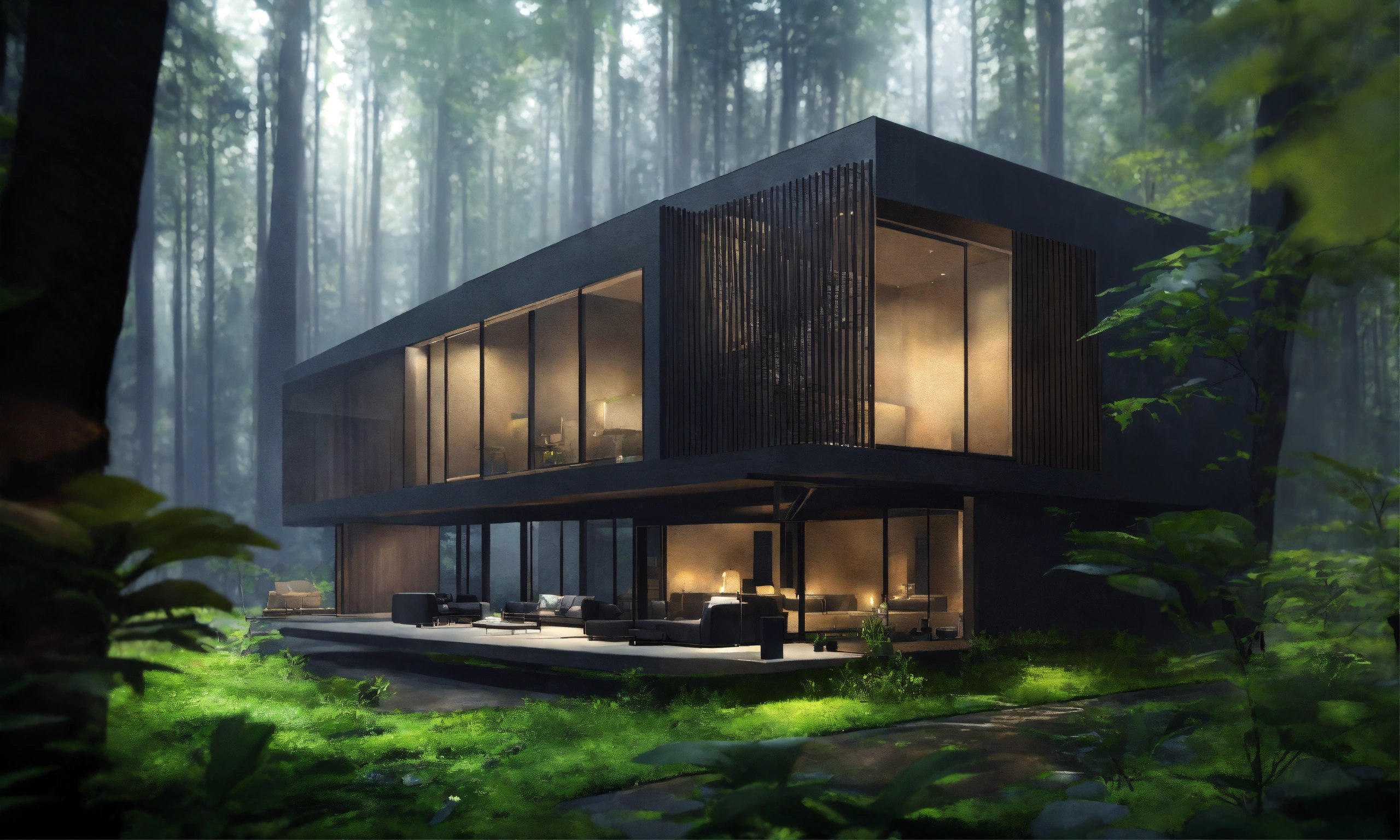 Concept art of interior design of forest luxurious home, dark modern architecture house, in the middle of the forest mansion
