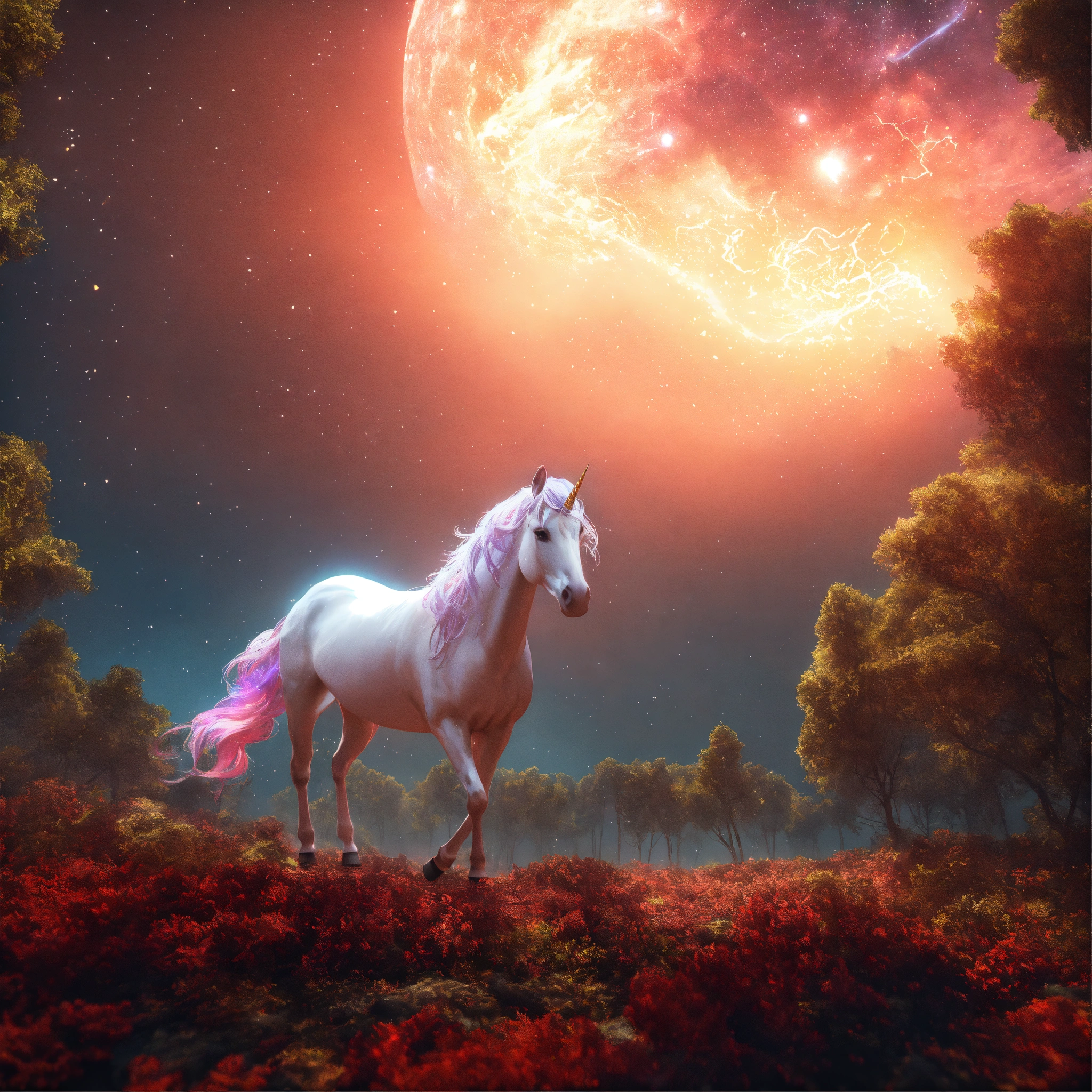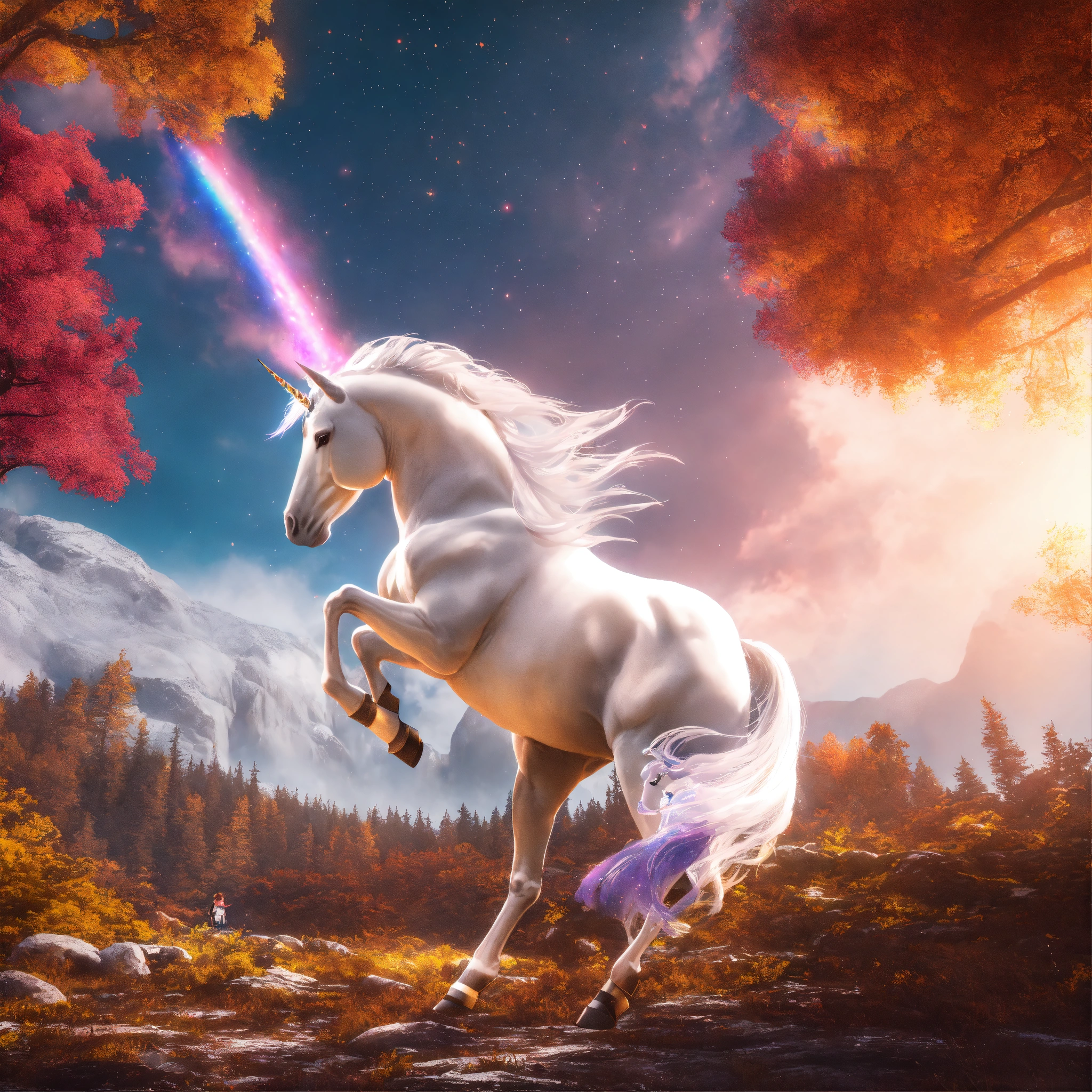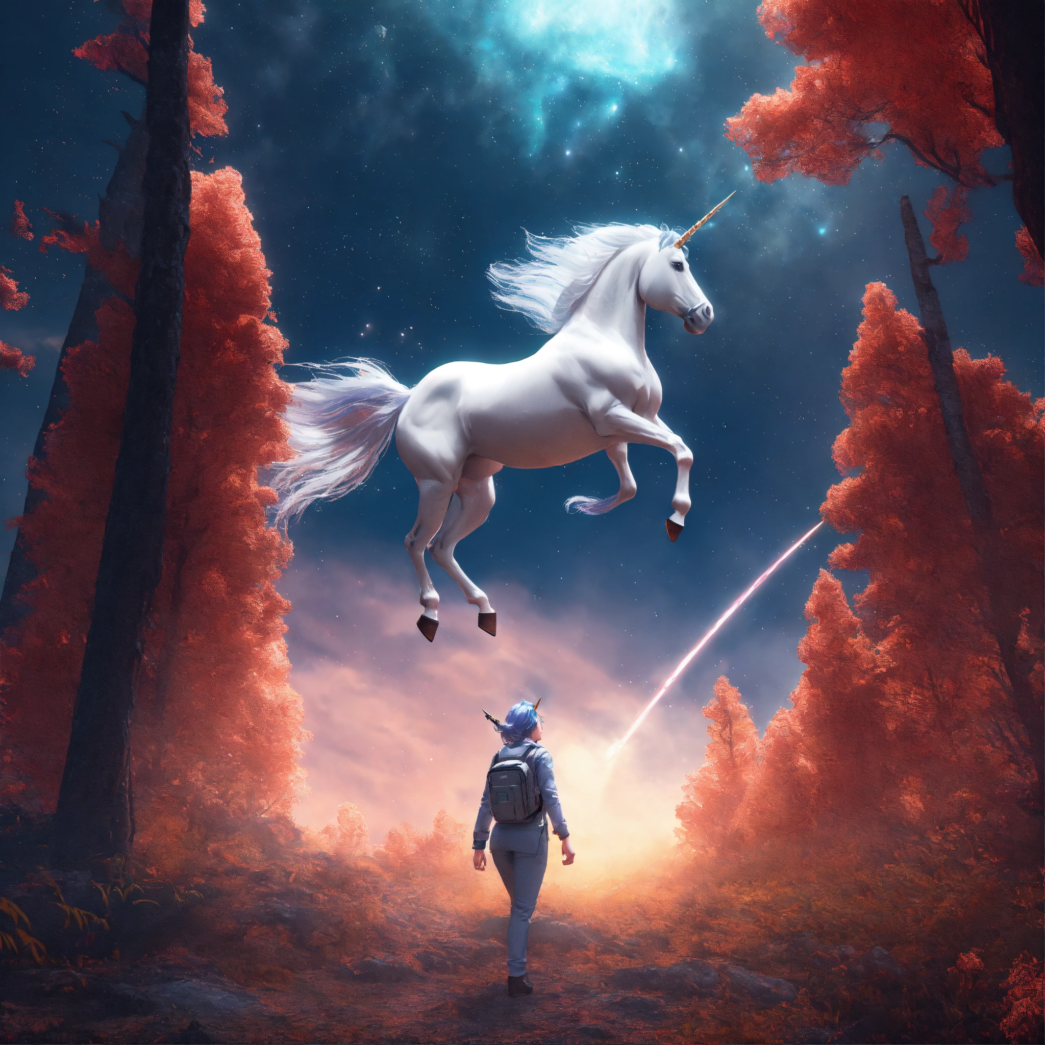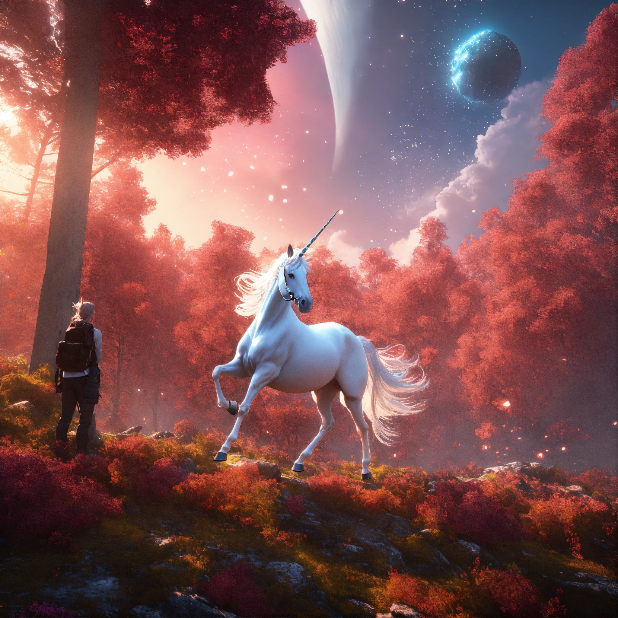 Unicorn white and woman in love, flying in sky nebula, artstation scifi 3d scene of a showing forest, maximalism, ambient occlusion, atmospheric haze, unreal engine, hyper realism, realistic shading, cinematic composition, realistic render, octane render, detailed textures, photorealistic, wide shot