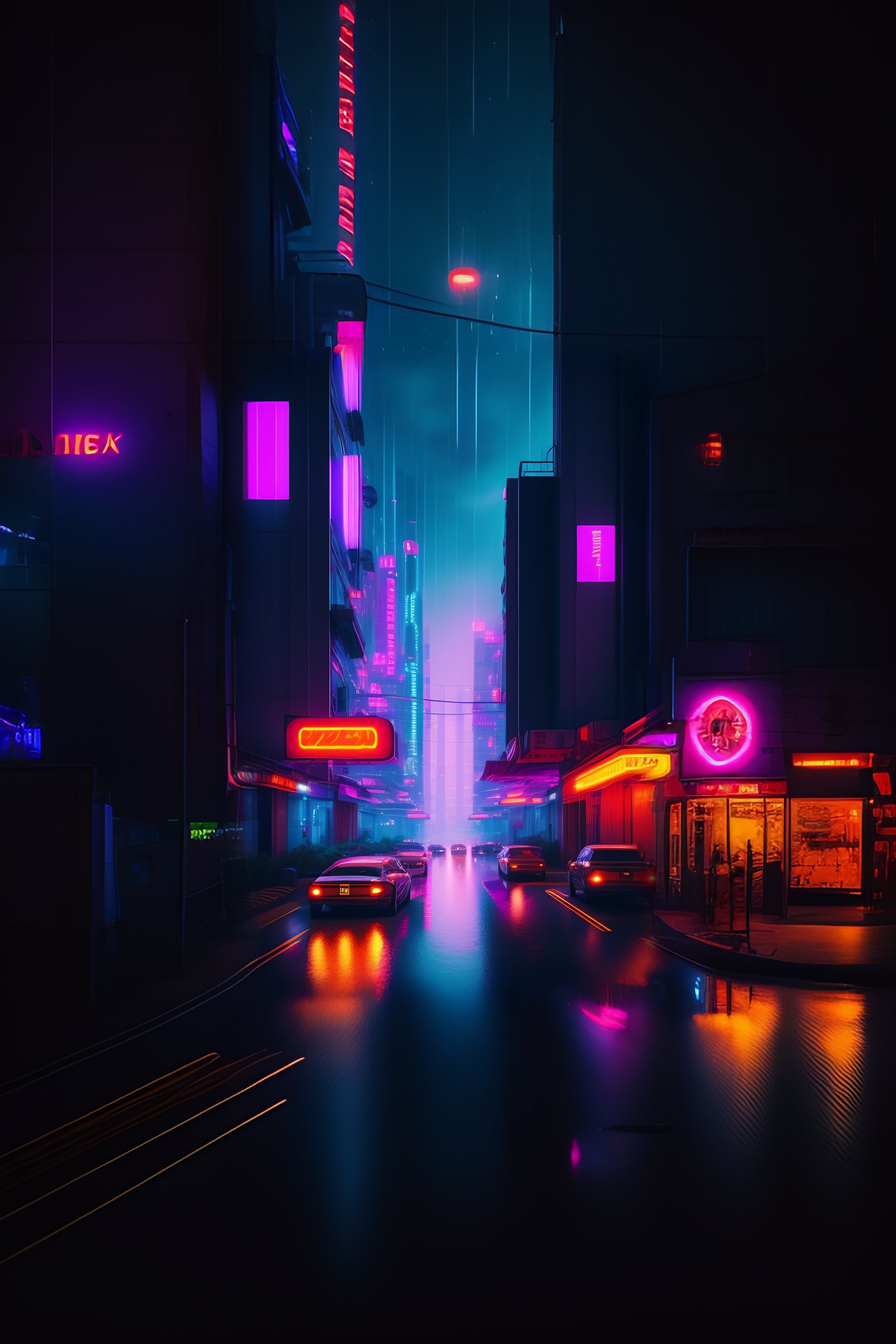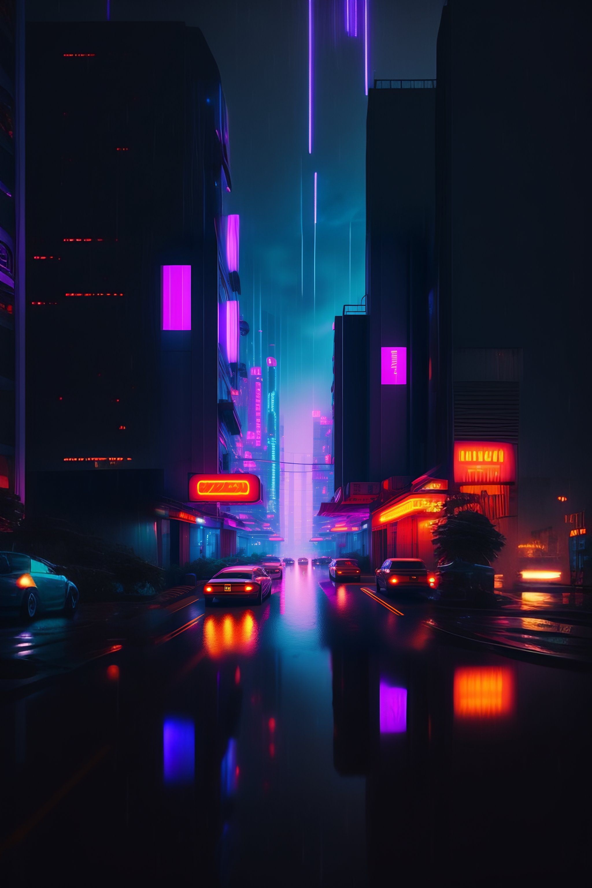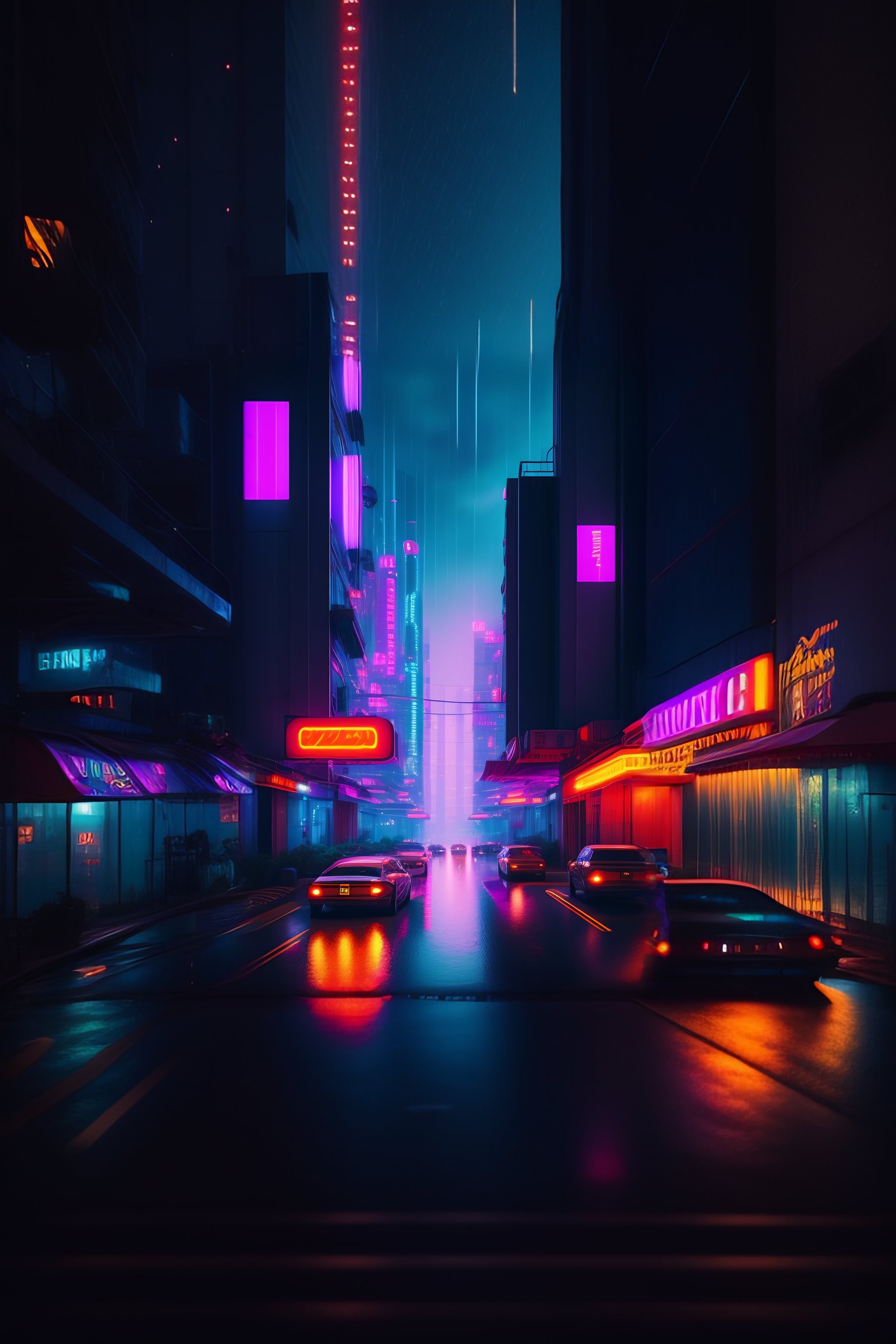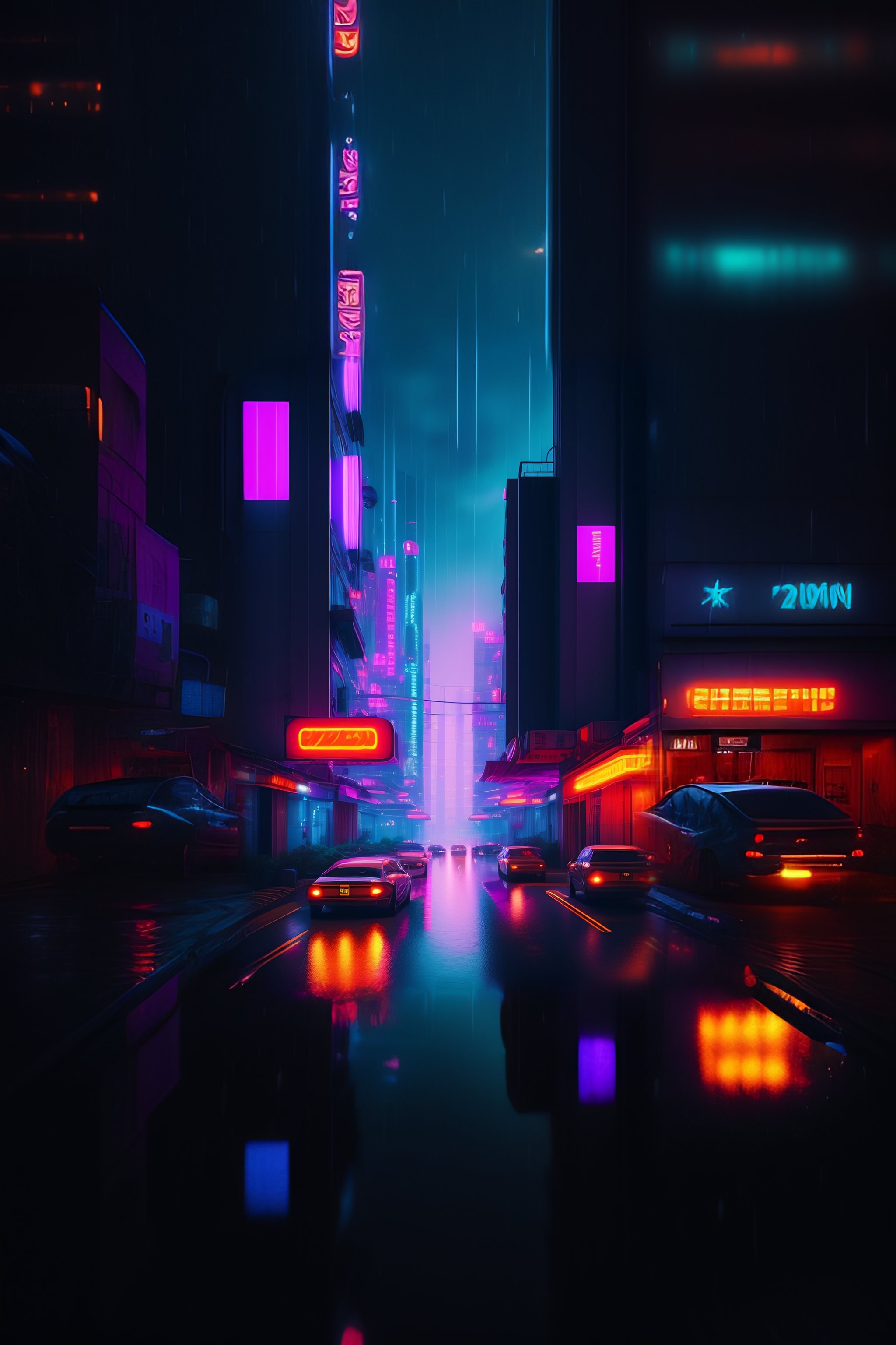 Cyberpunk neon city vibe at night with stars on the sky and rainy weather