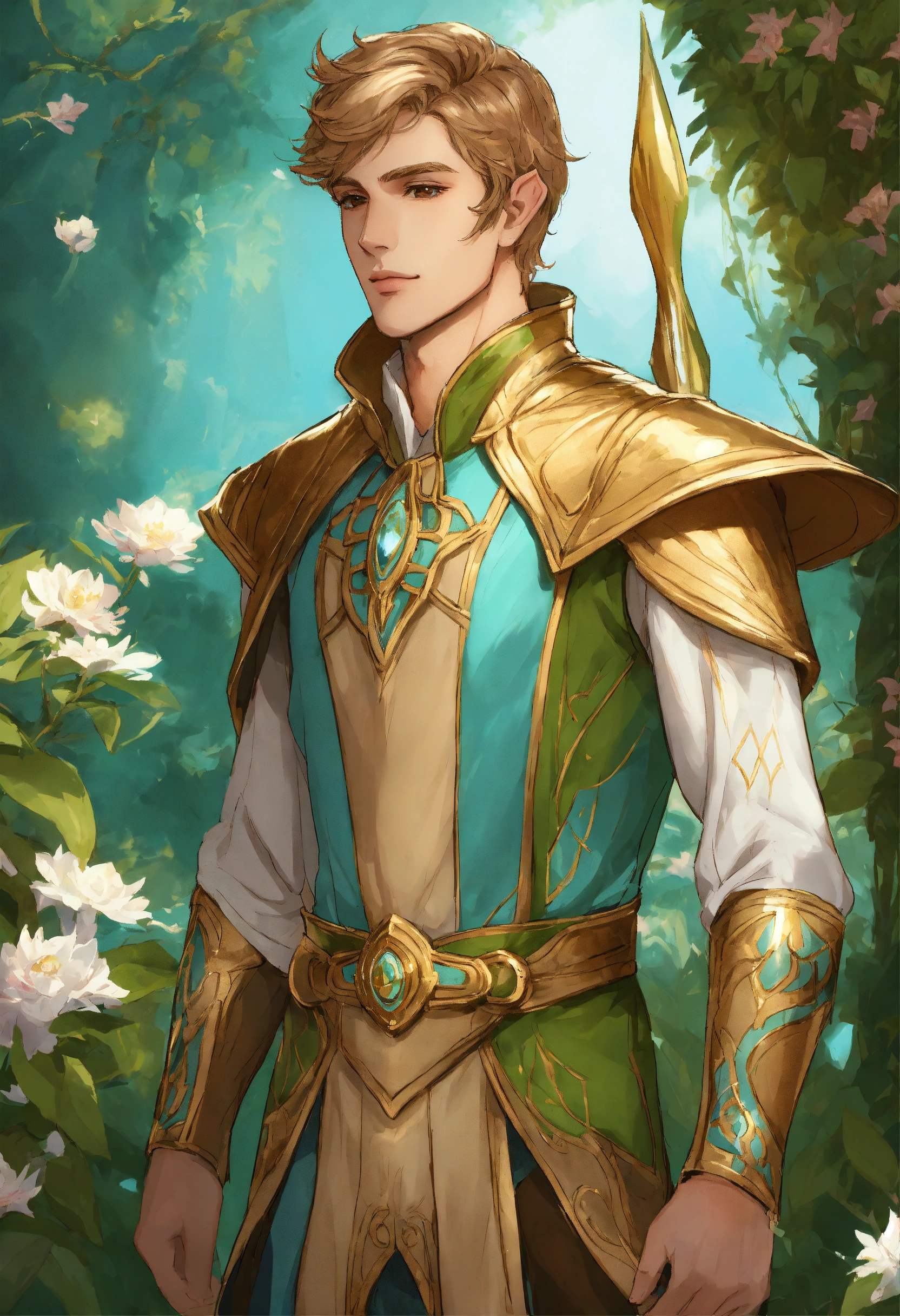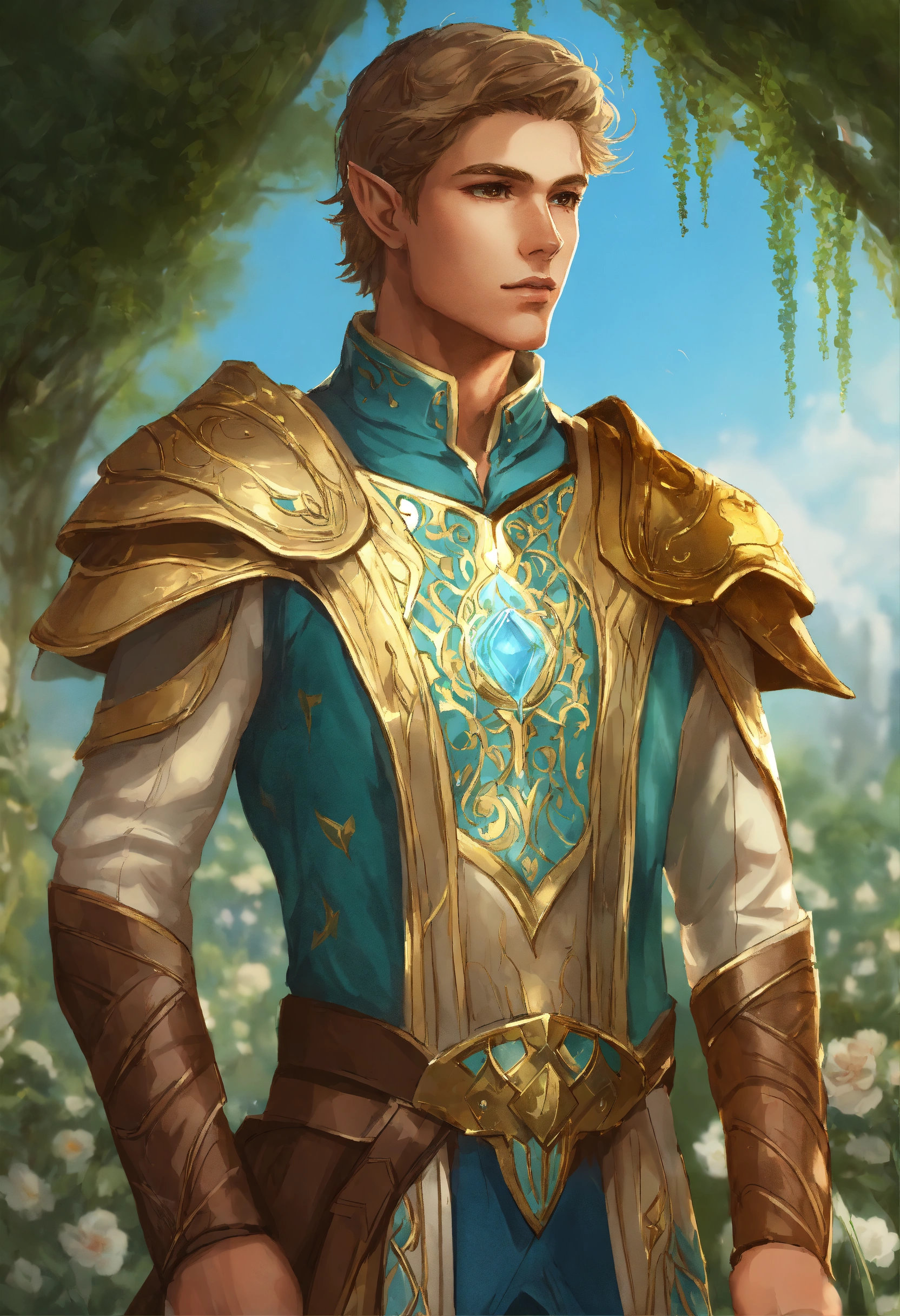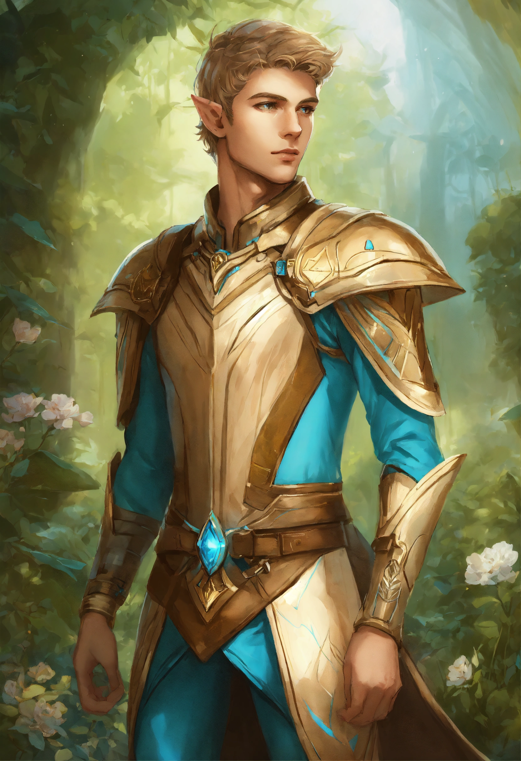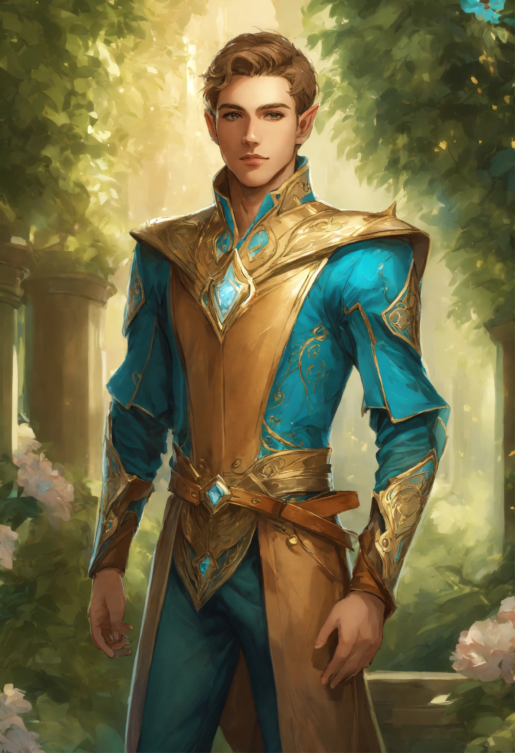 Drawing of an elf, royalty, sci fi, cybernetic, gold and light blue royal sci fi outfit, light brown hair, standing in an elegant elven garden, handsome, male high elf, 25 years old, elf ear