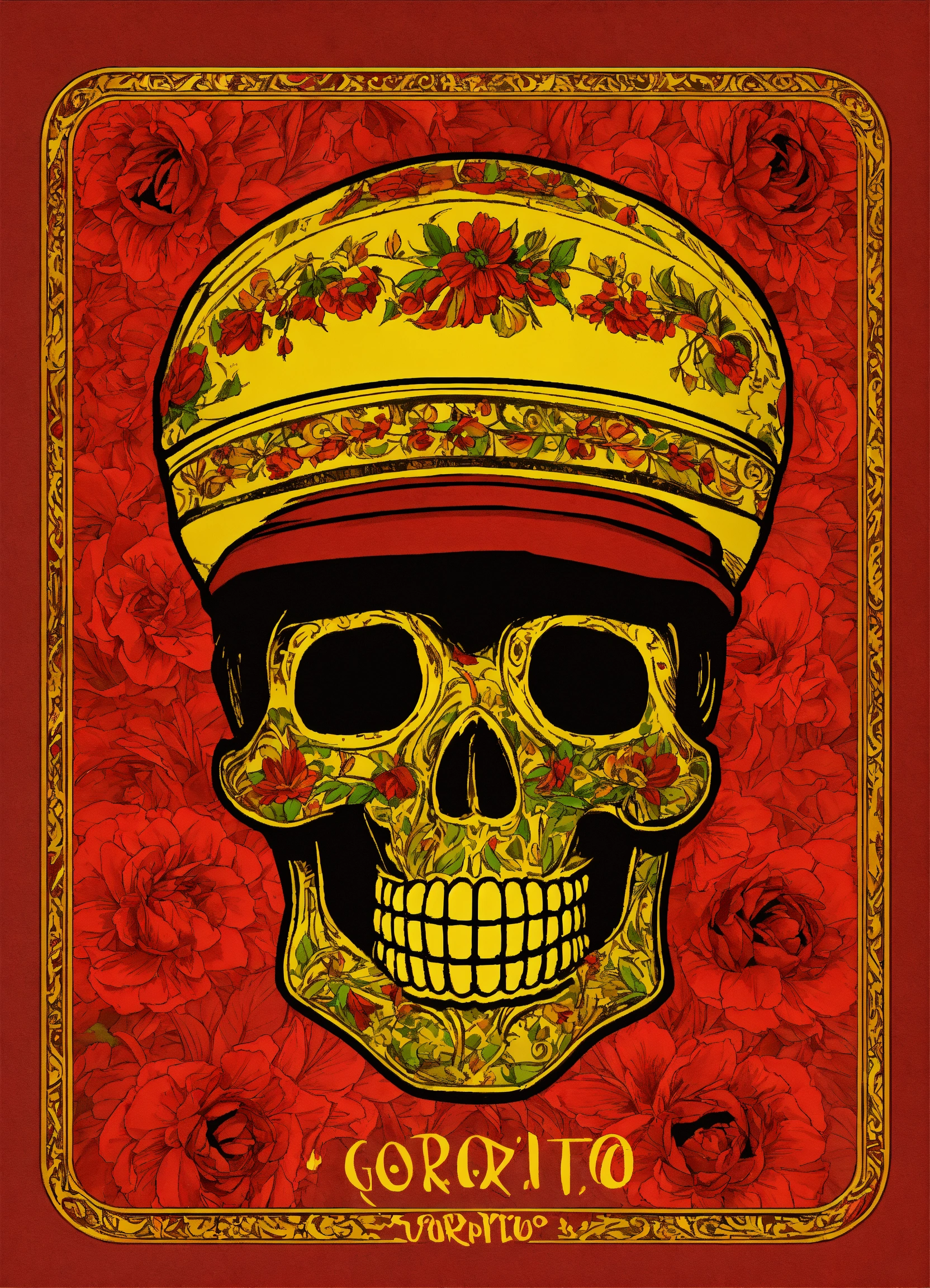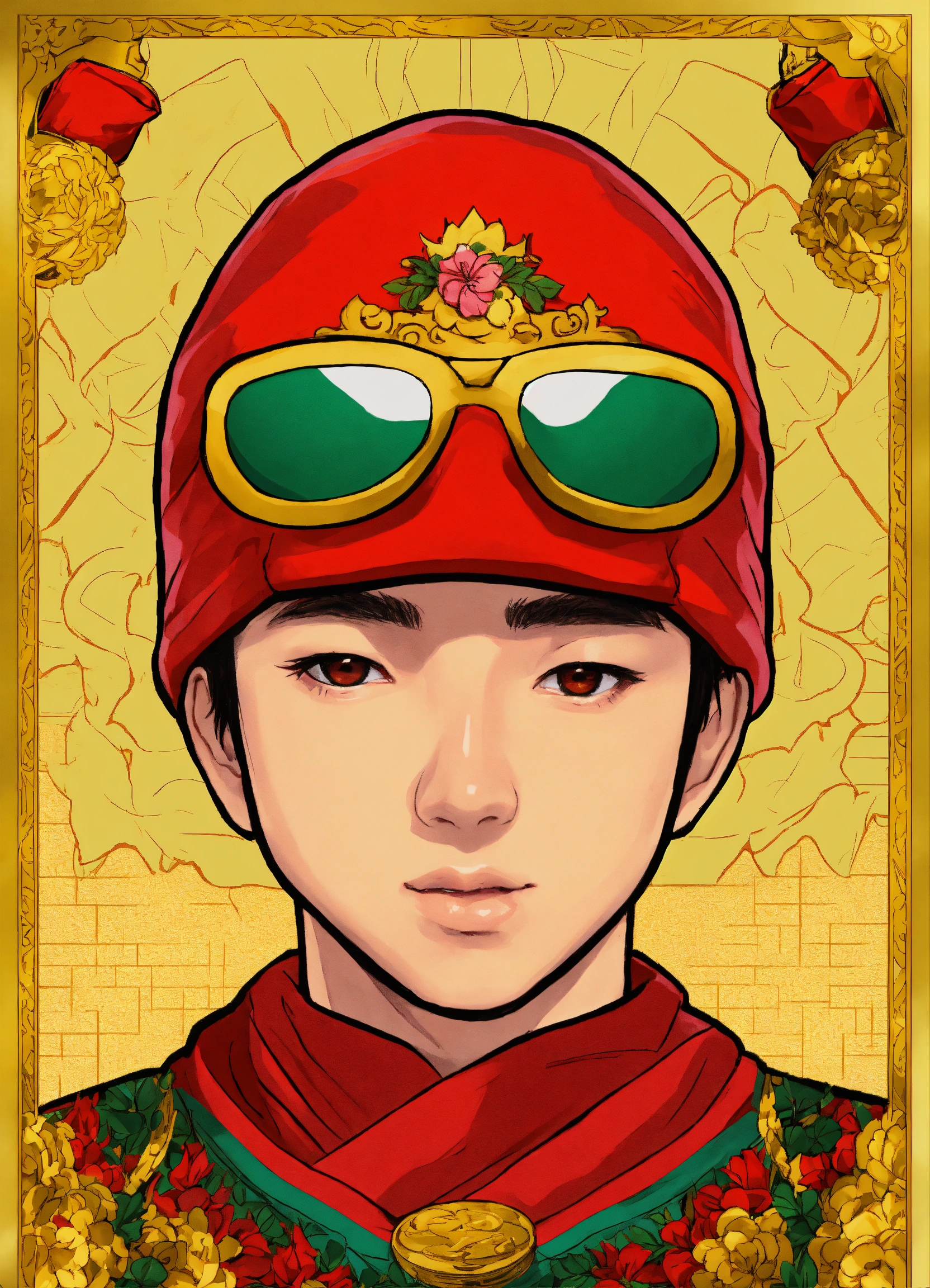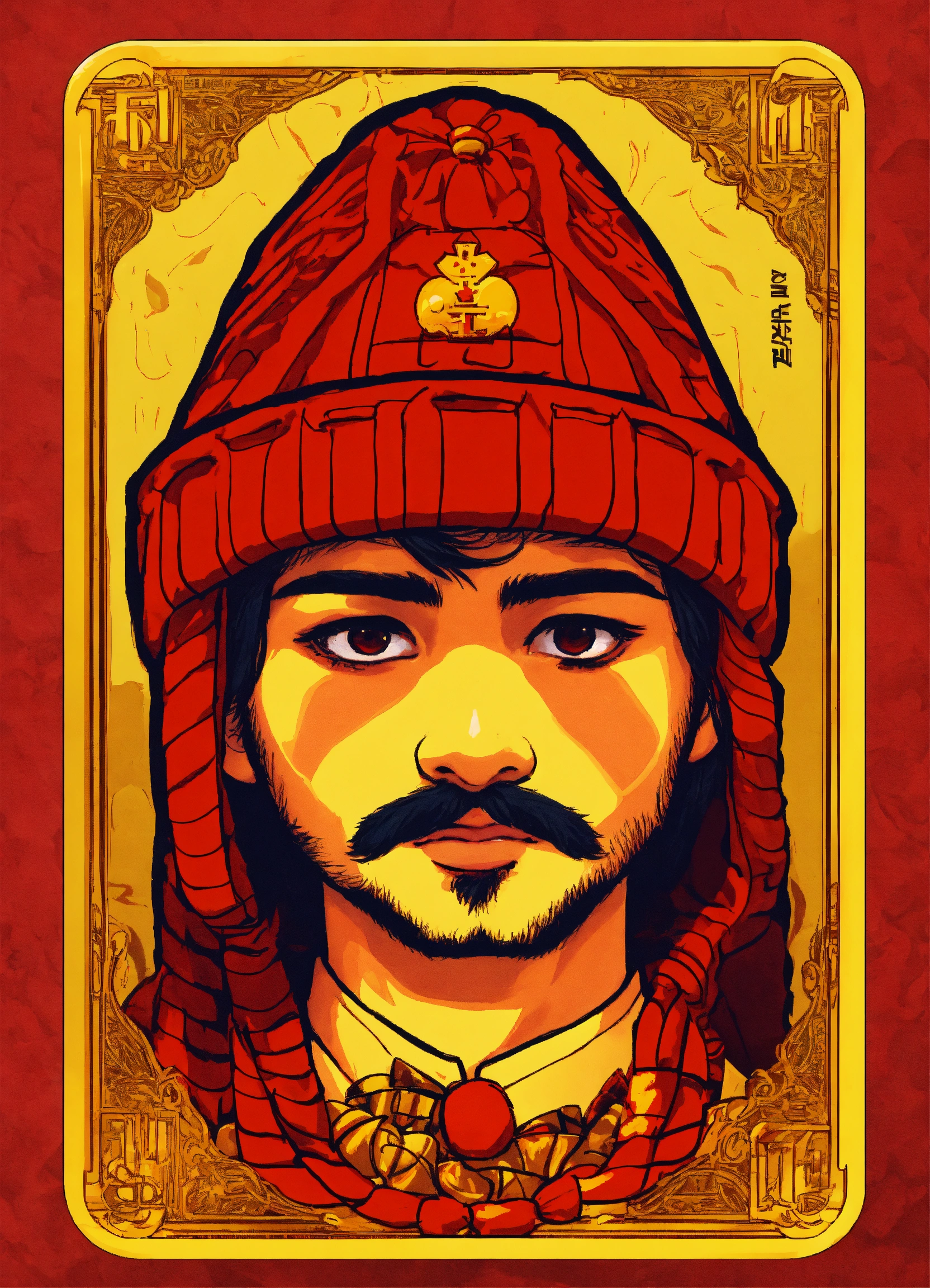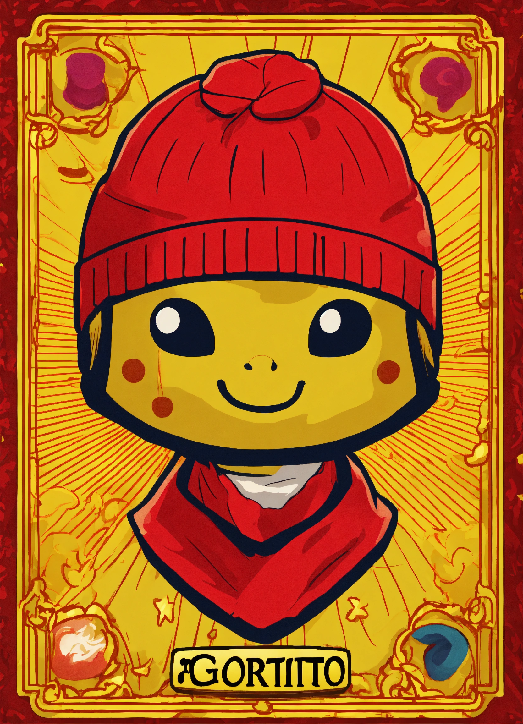 A red beanie with no person wearing it, based on the card "el gorrito" of the mexican lottery deck in anime style. gold-yelllow background card styled.