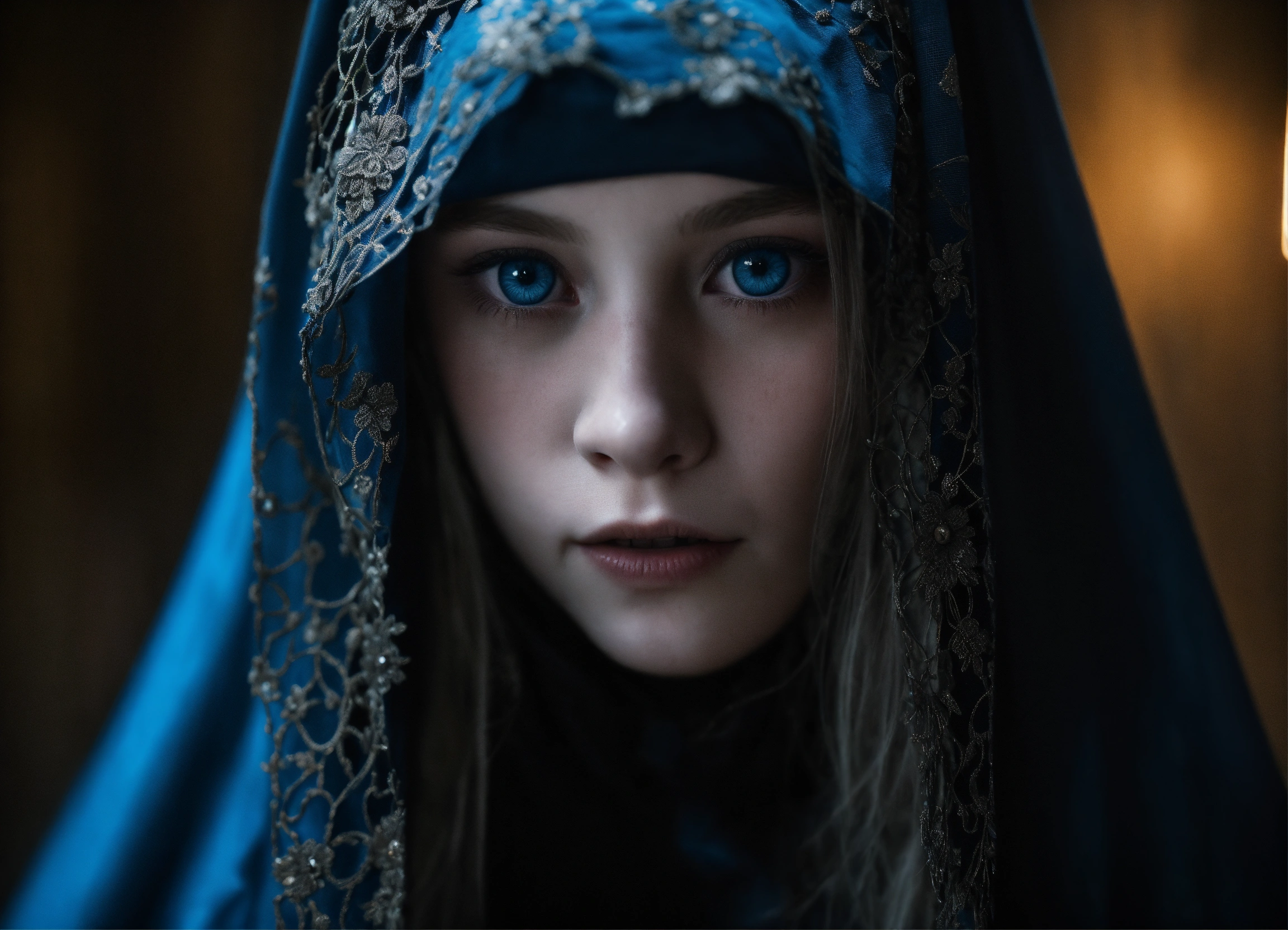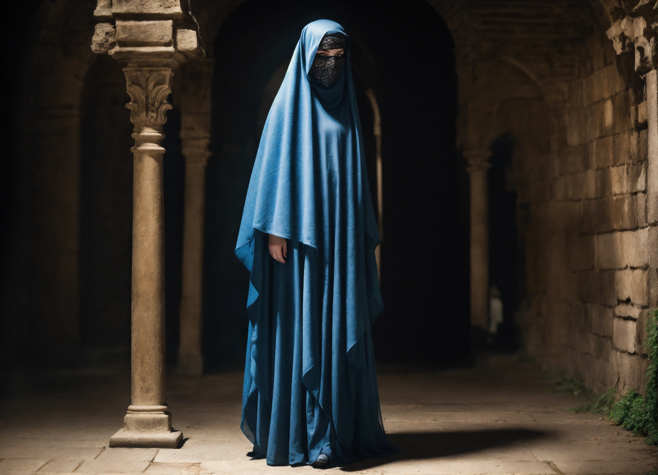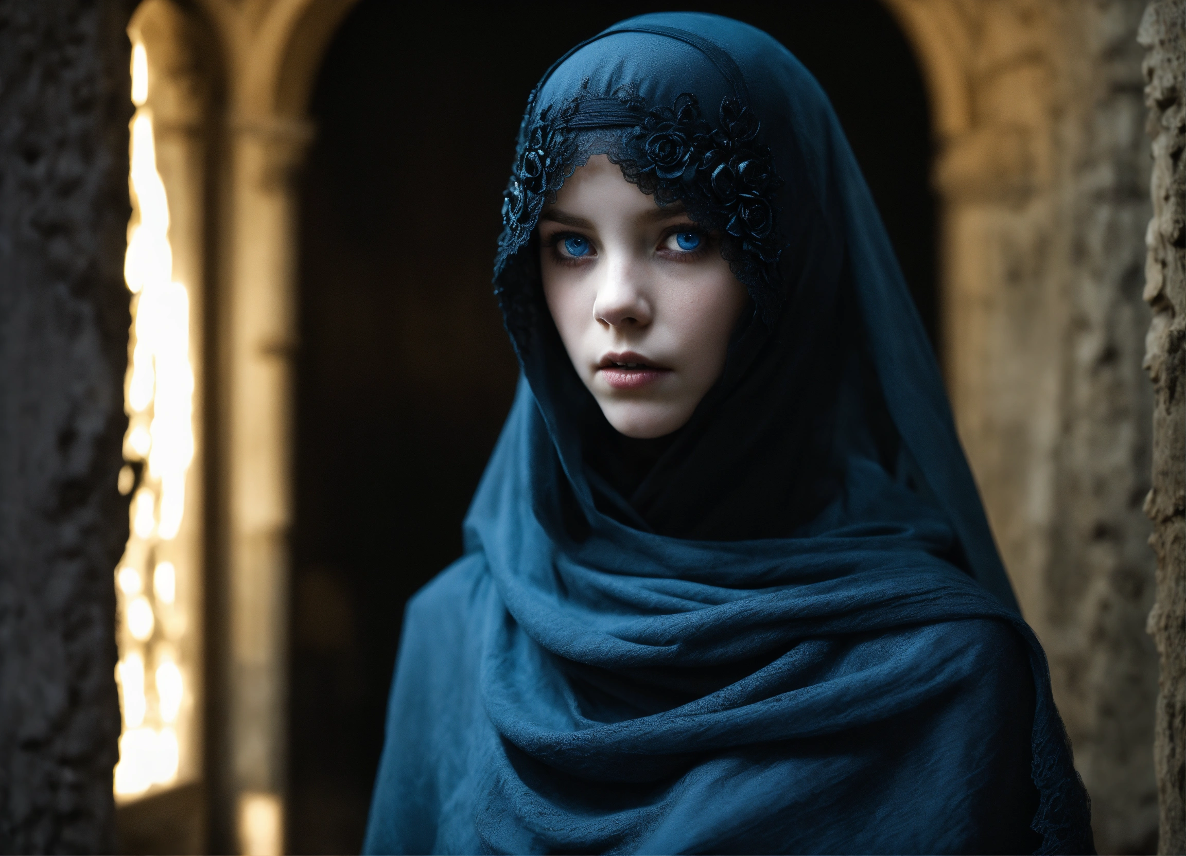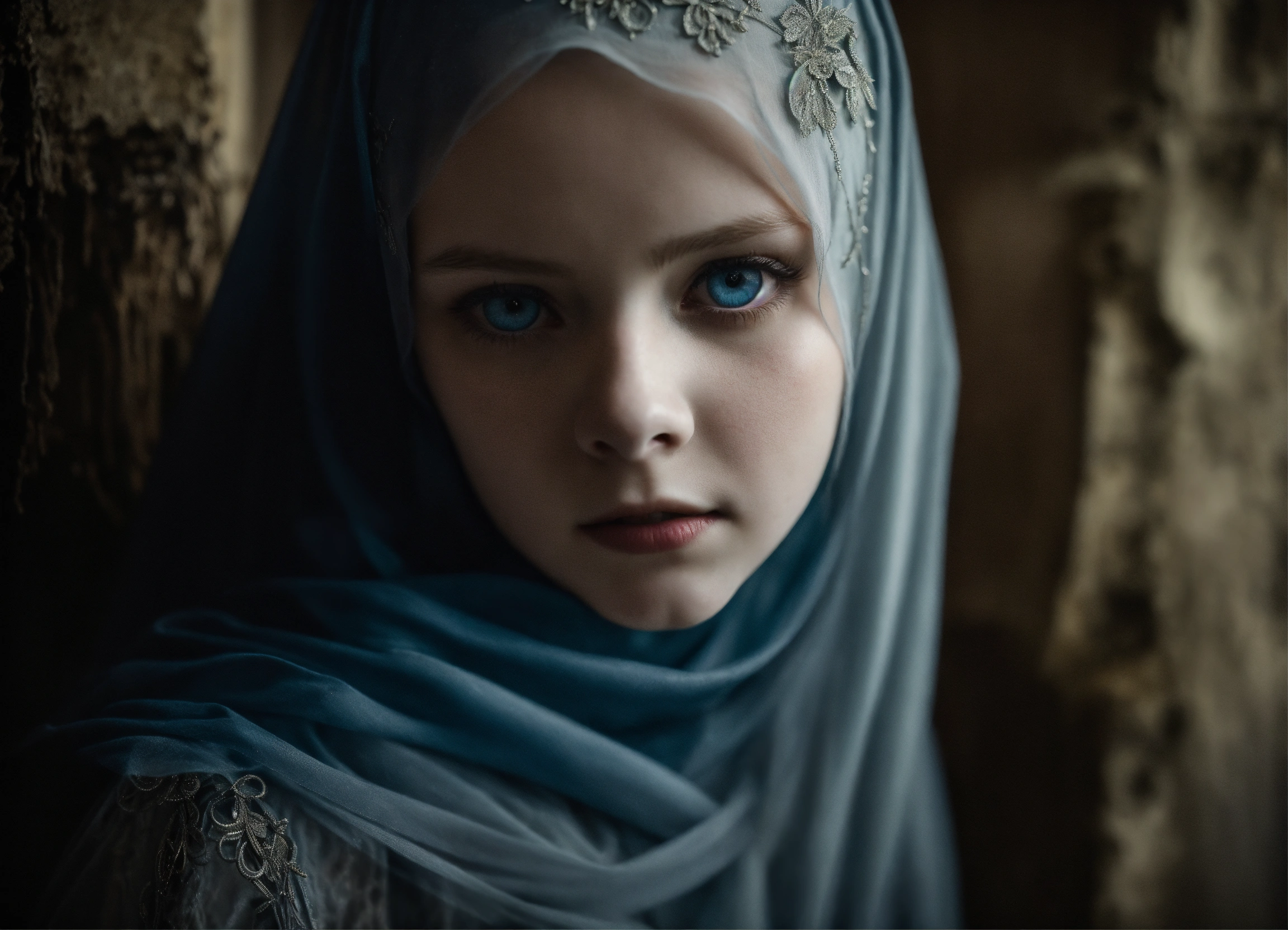 Body portrait of a very childish deadly pale ultra slim twelve year old female child with a veil in the syle of a niqab covers her face, she is a goth necromancer with waist long silverwhite hair, very flat belly, ultra skinny, very slim body, emaciated body, completely emaciated, ultra narrow face, alabaster skin, pale as a corpse, glowing blue eyes, ultra slim face, innocent looking, in a gloomy crypt, lasziv, kindlich, unschuldig, childlike, graceful, wispy, glowing blue eyes, ghostly, dead, evil, demonic, undead, darkness, grotesque, mysterious, dark, cold ambient lighting, extremely detailed, fantasy, medieval setting