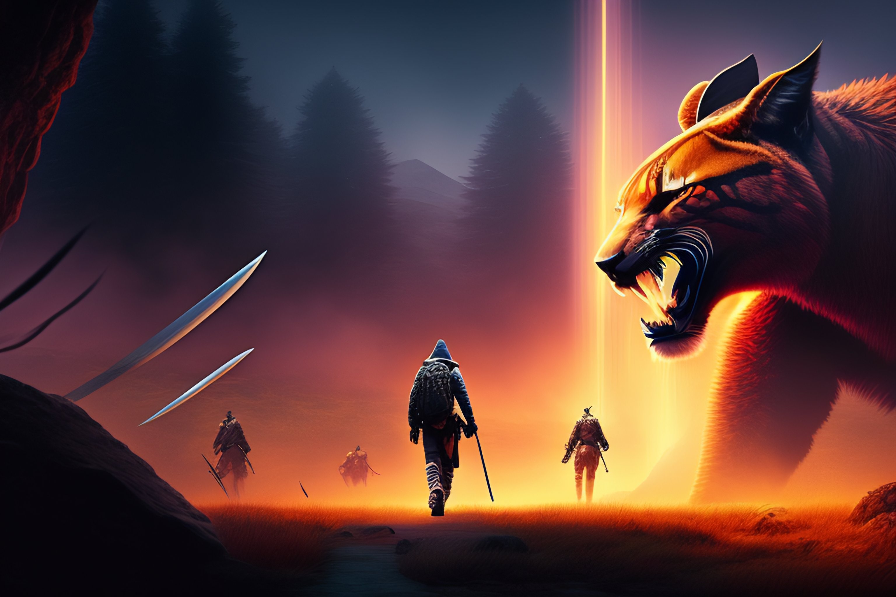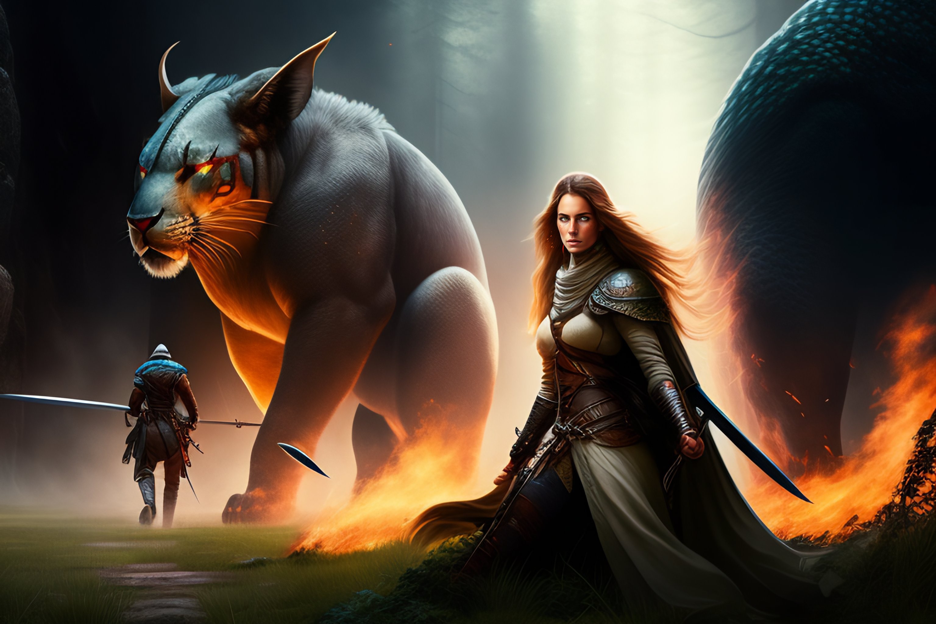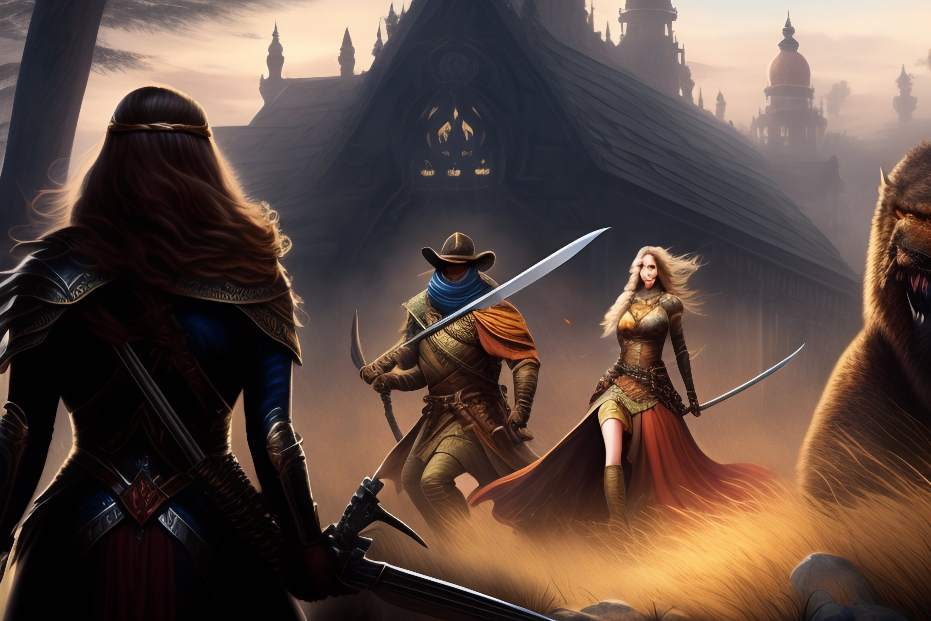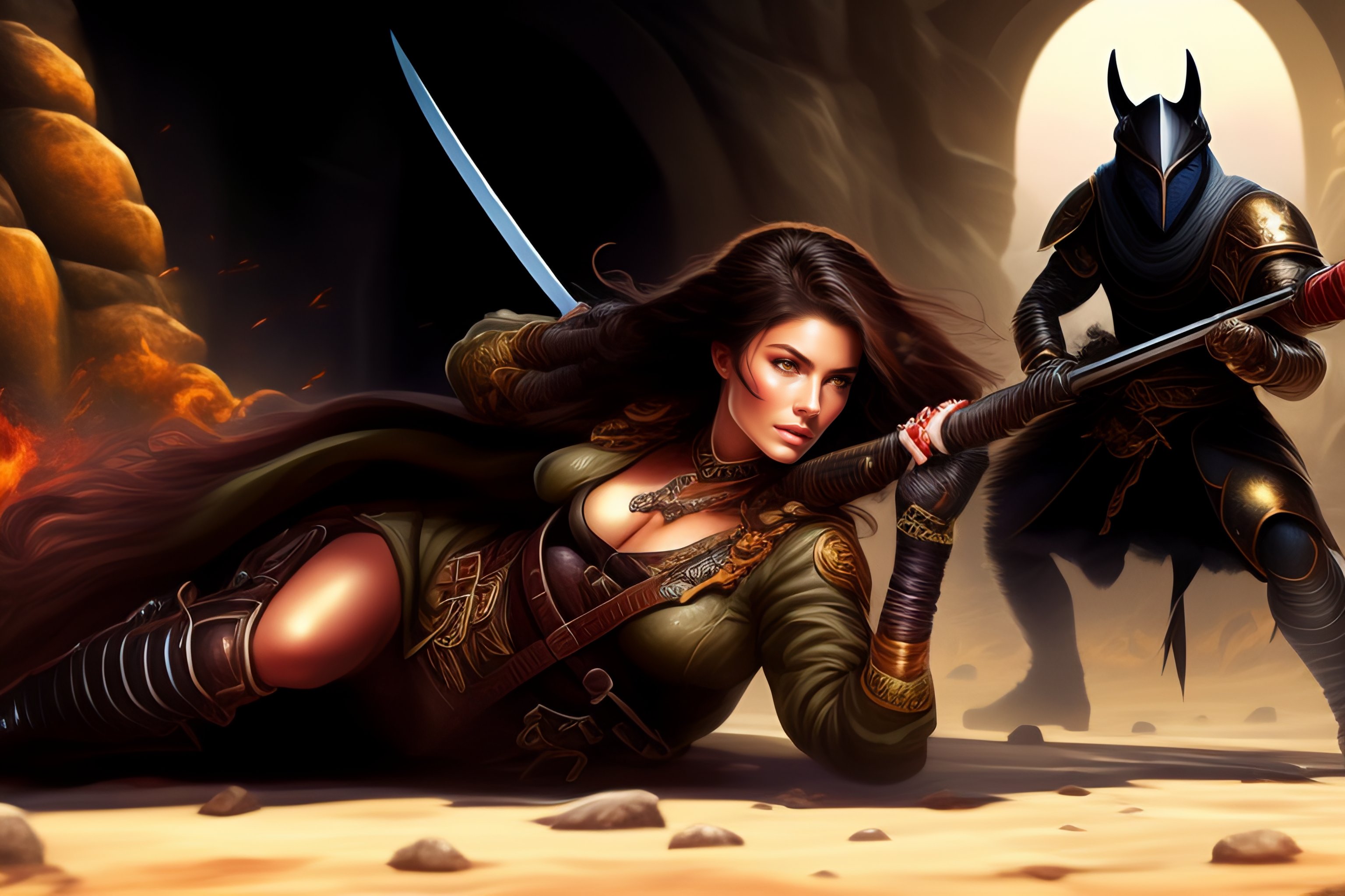 A injured female hunter is fell down at the center of the image, hunters armed with swords are attacked by monsters are illustrated on the background