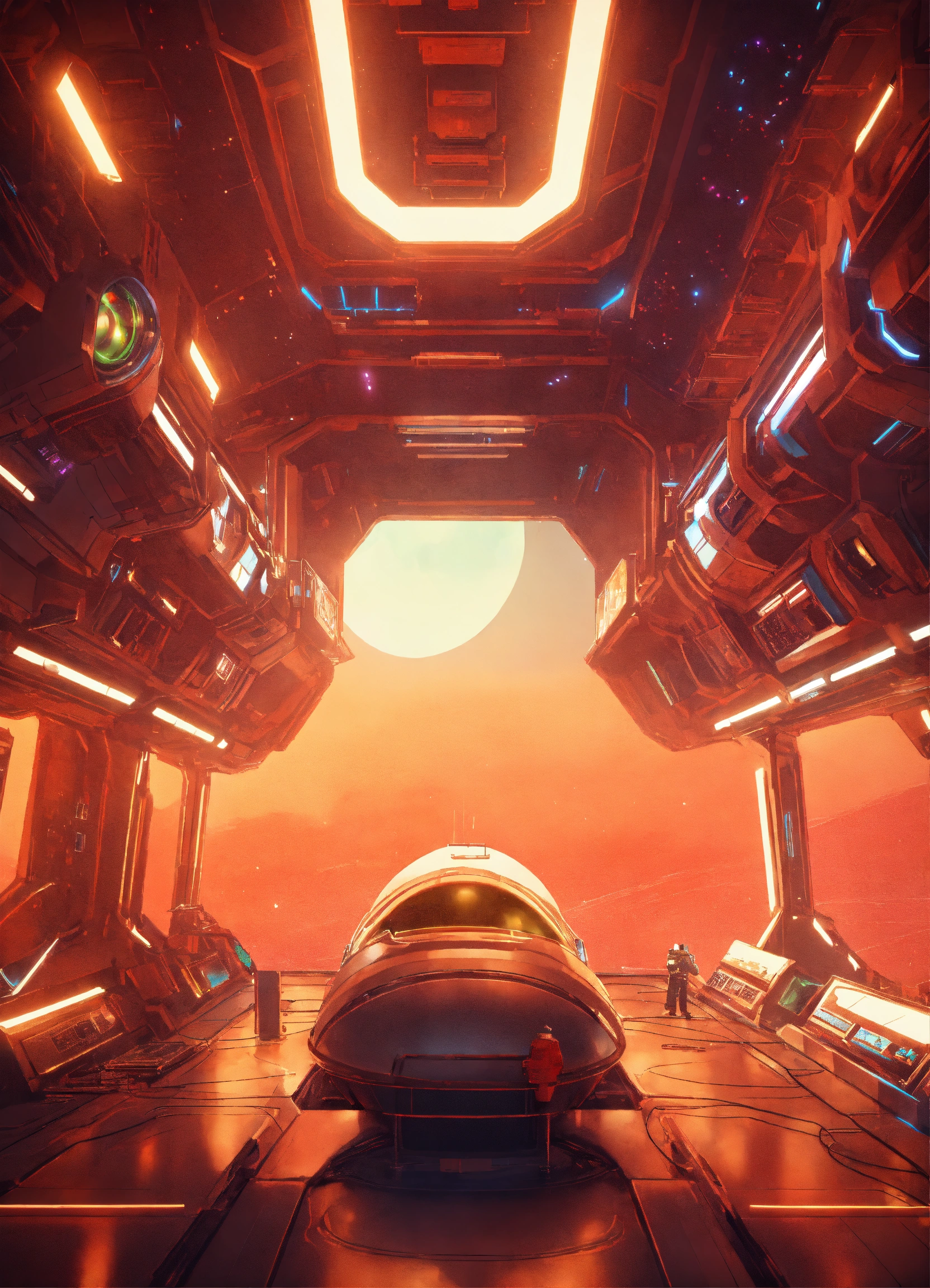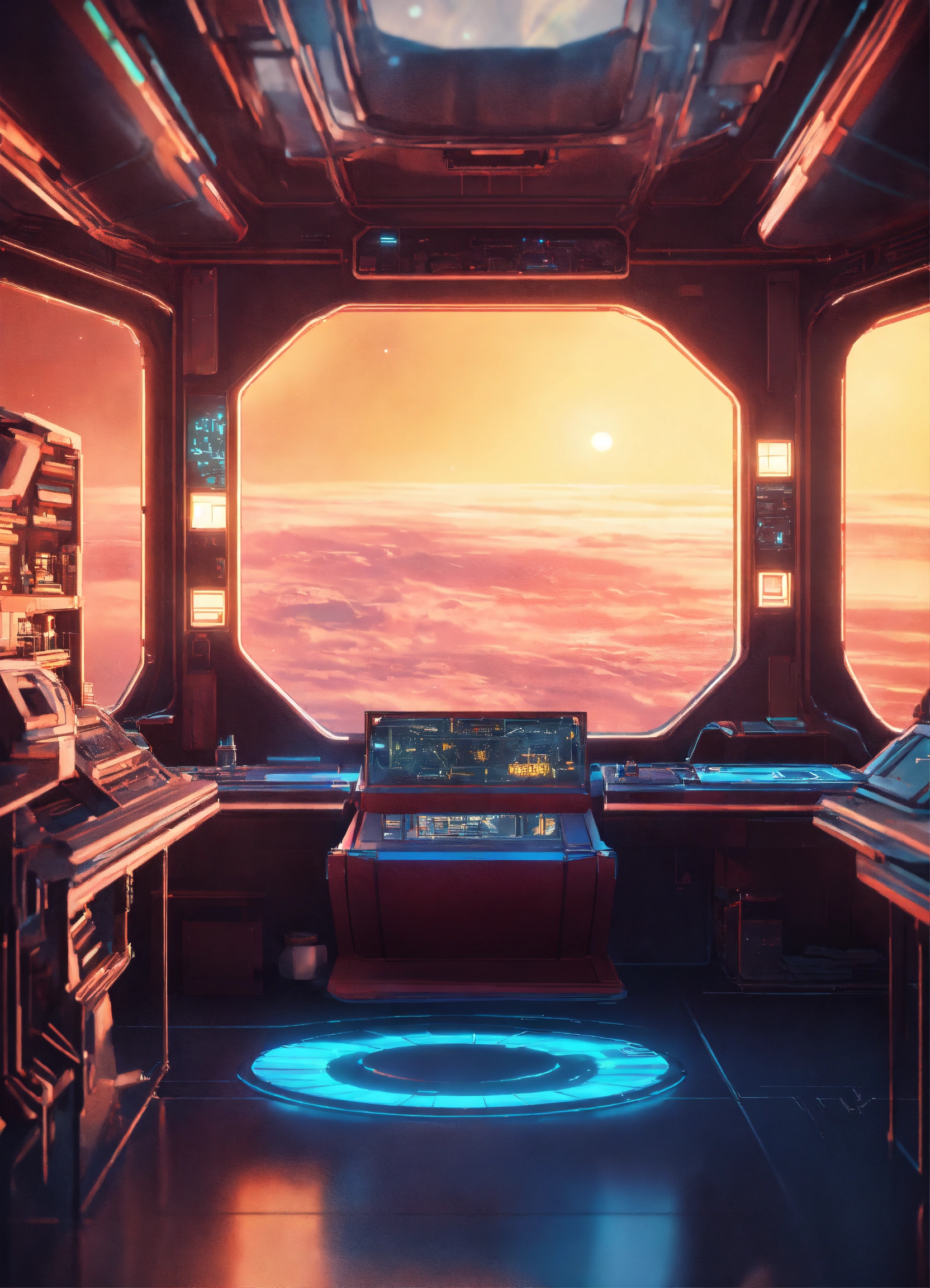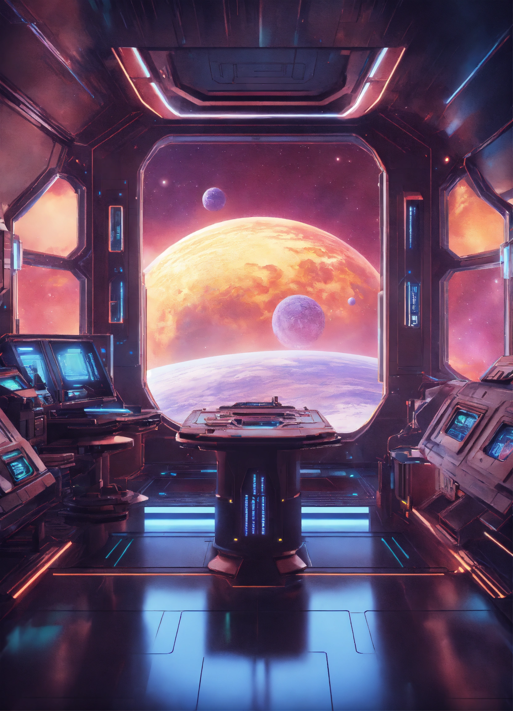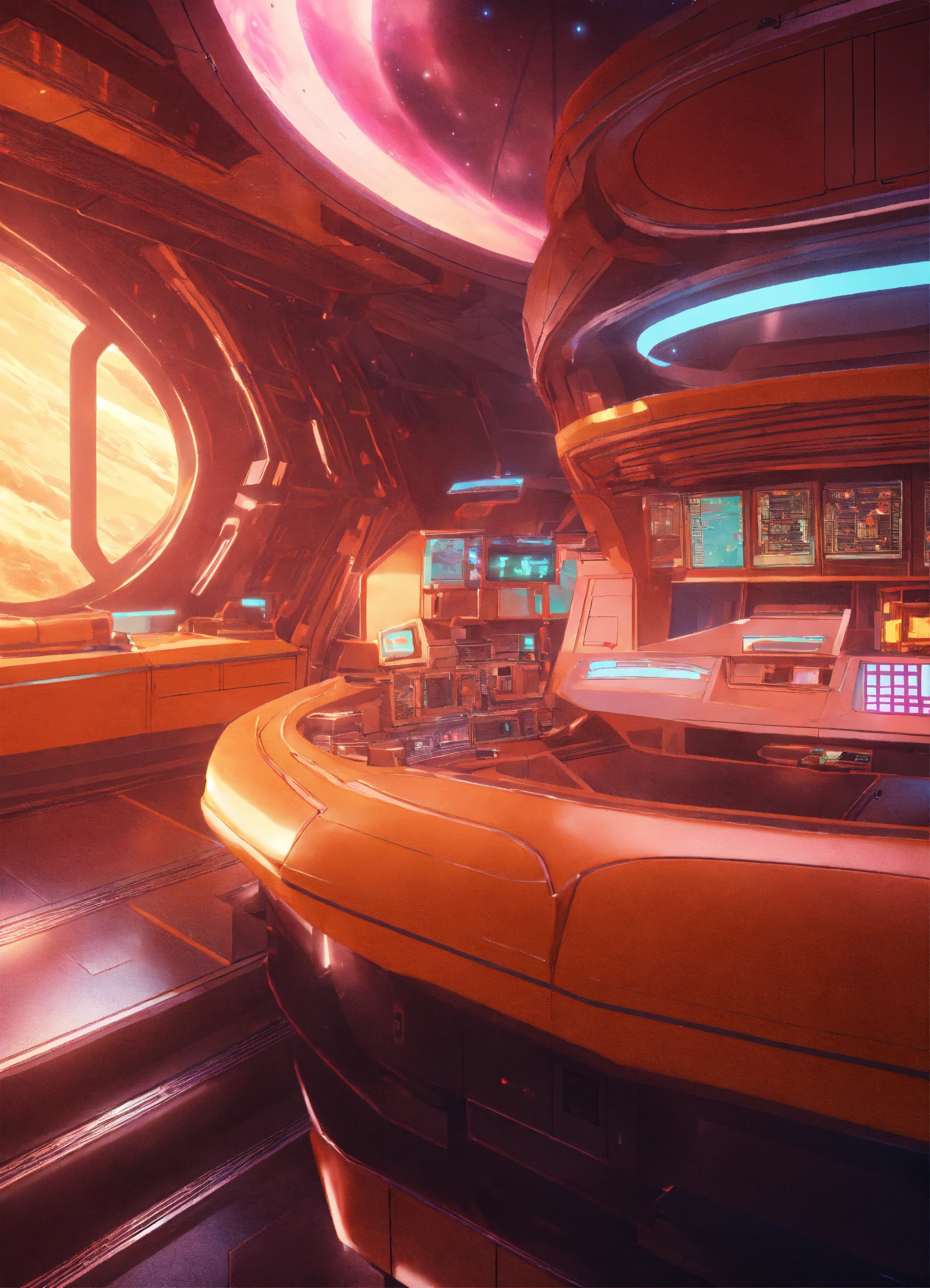 Space composition in sci-fi style, anime style interior of a spaceship in the background, retro rendering, 8k.