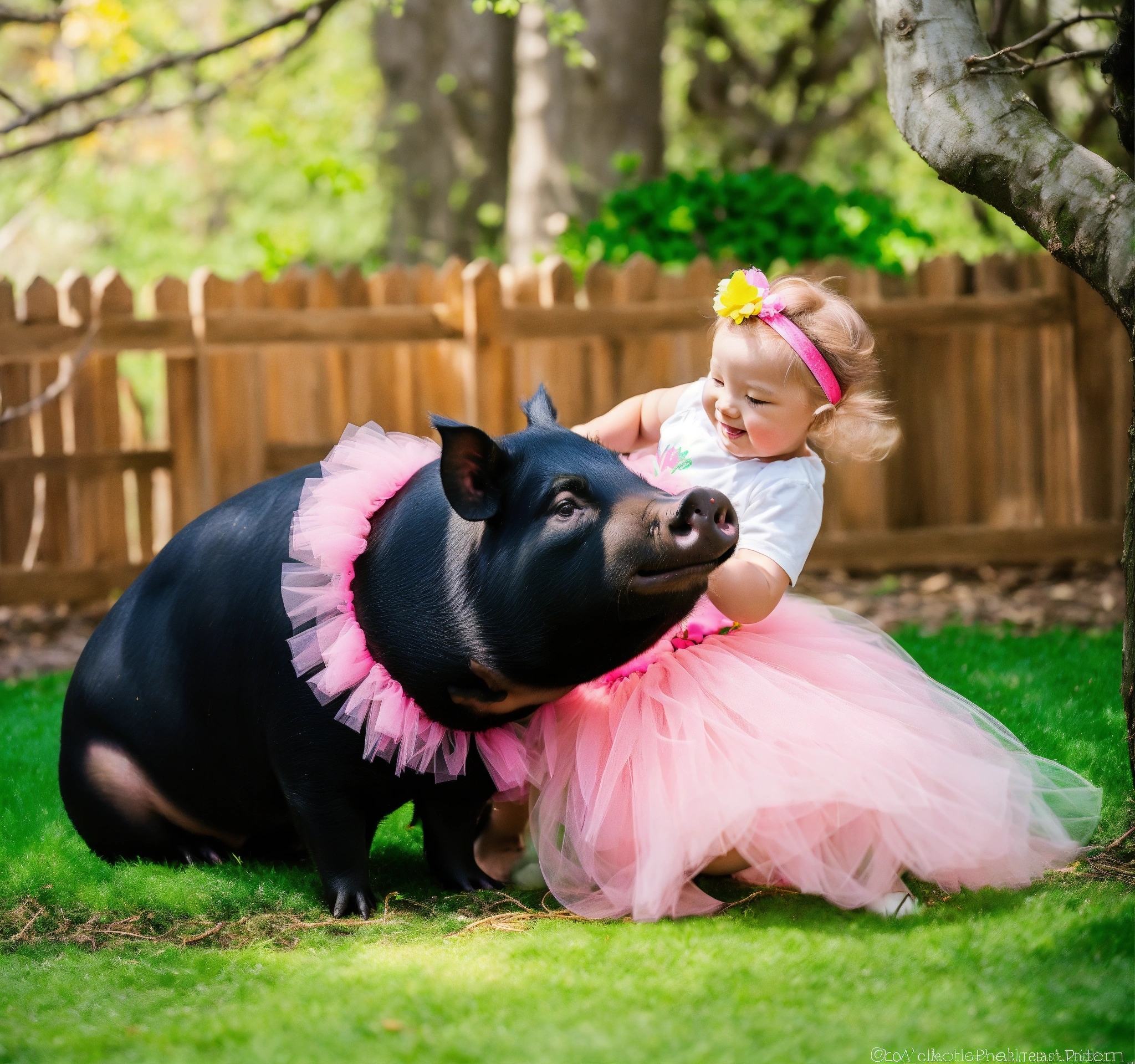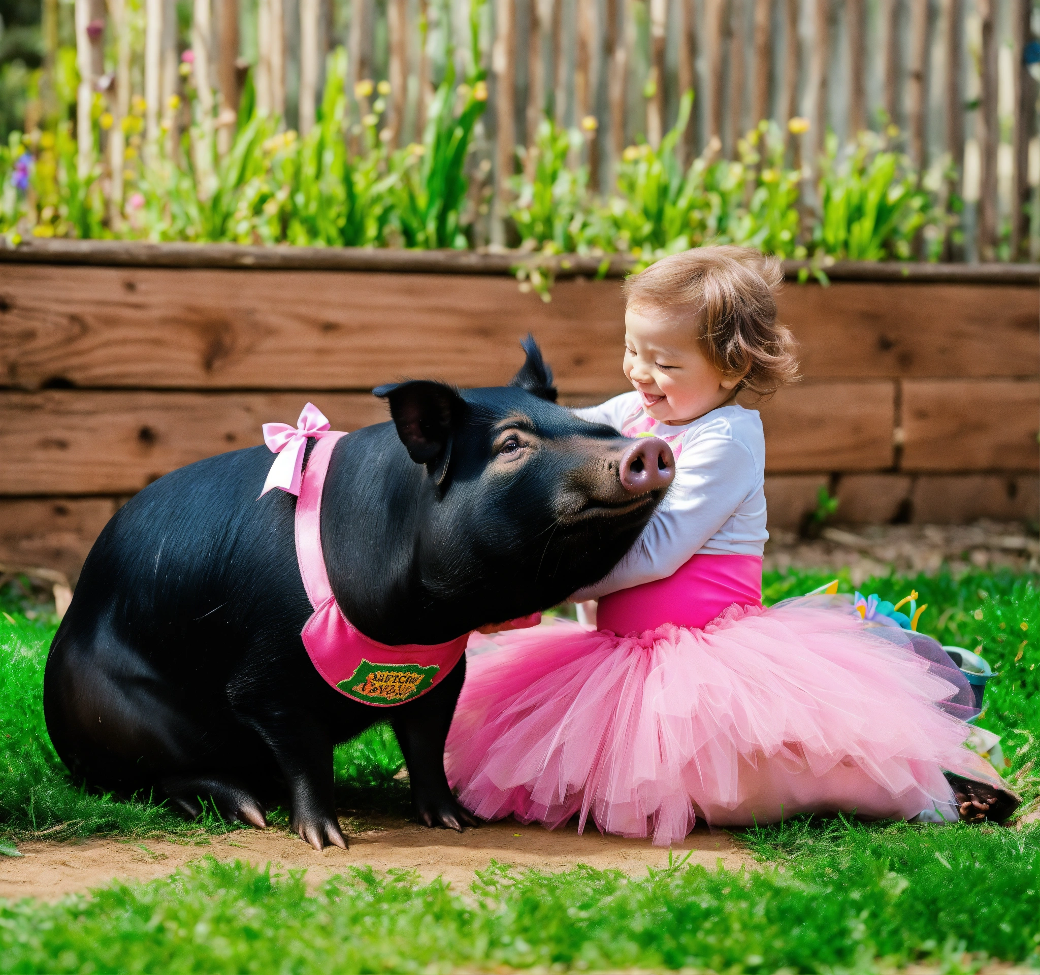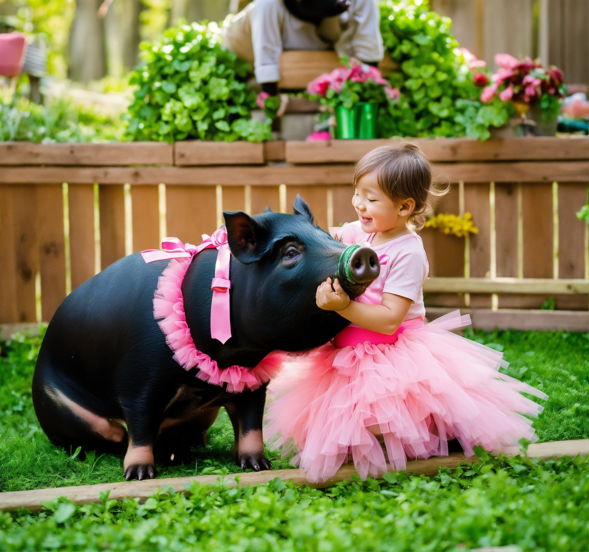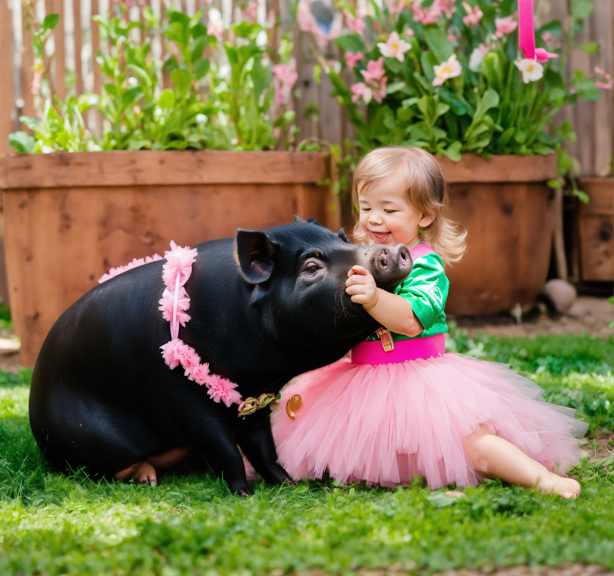 A black potbelly pig getting a belly rub from a leprechaun wearing a pink tutu