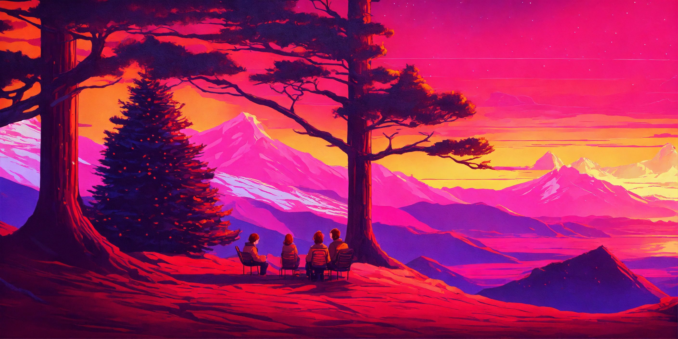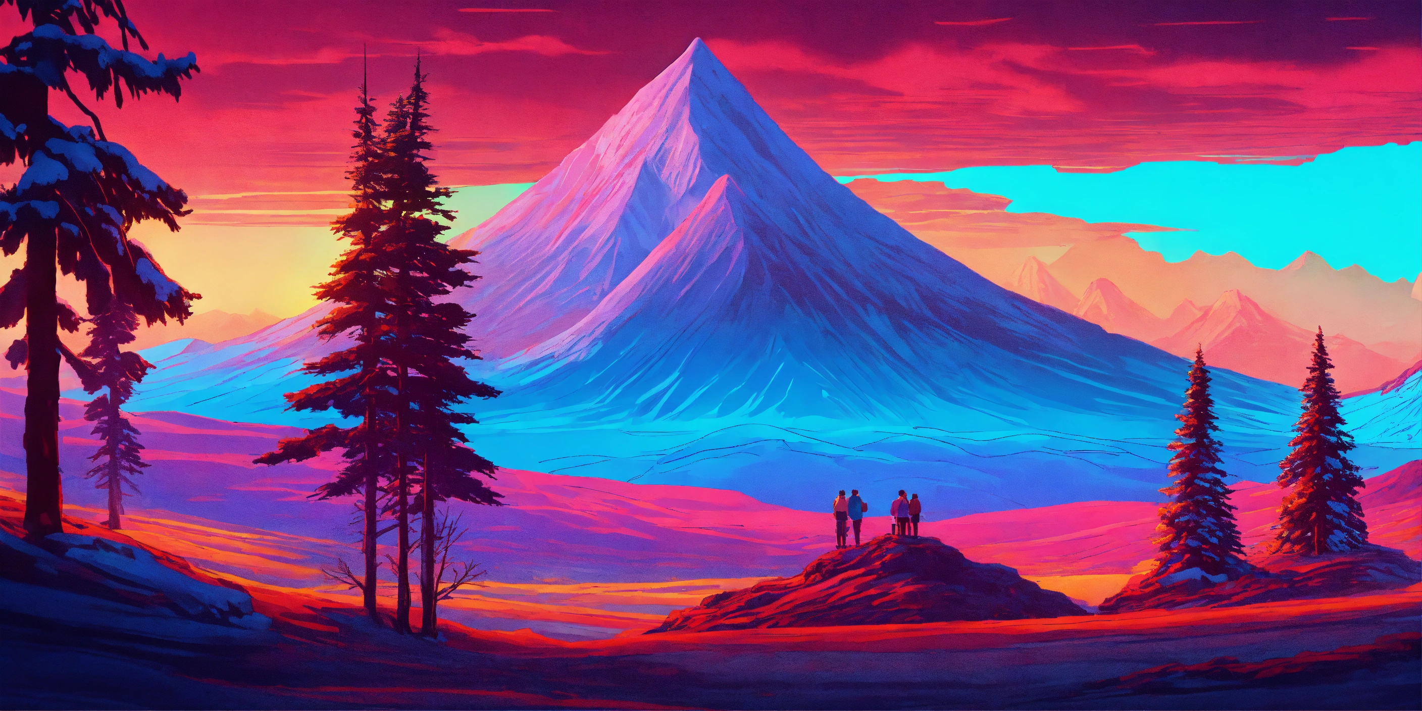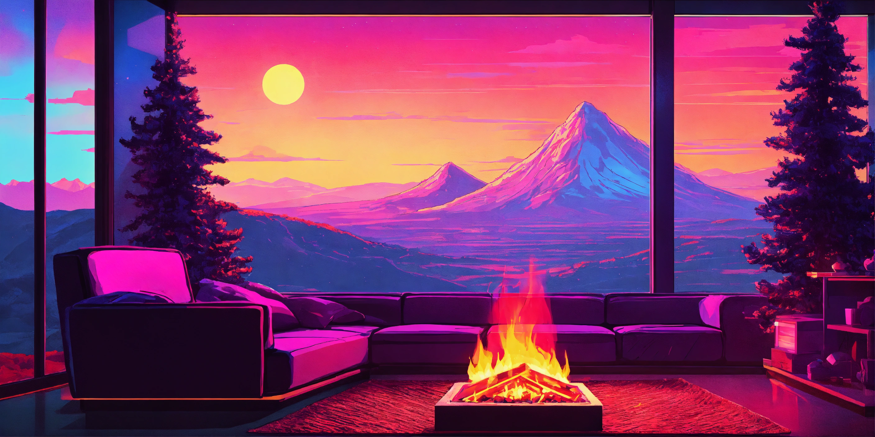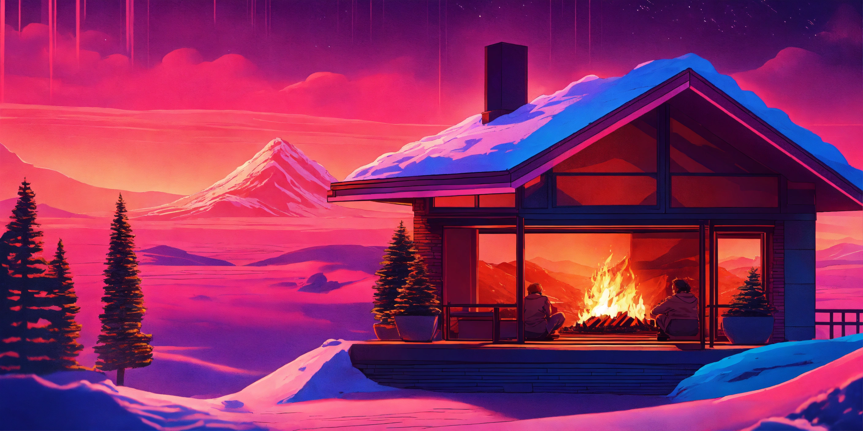 Synthwave style snowy lava hills pine trees landscape form a room with warm fireplace and a family in the future
