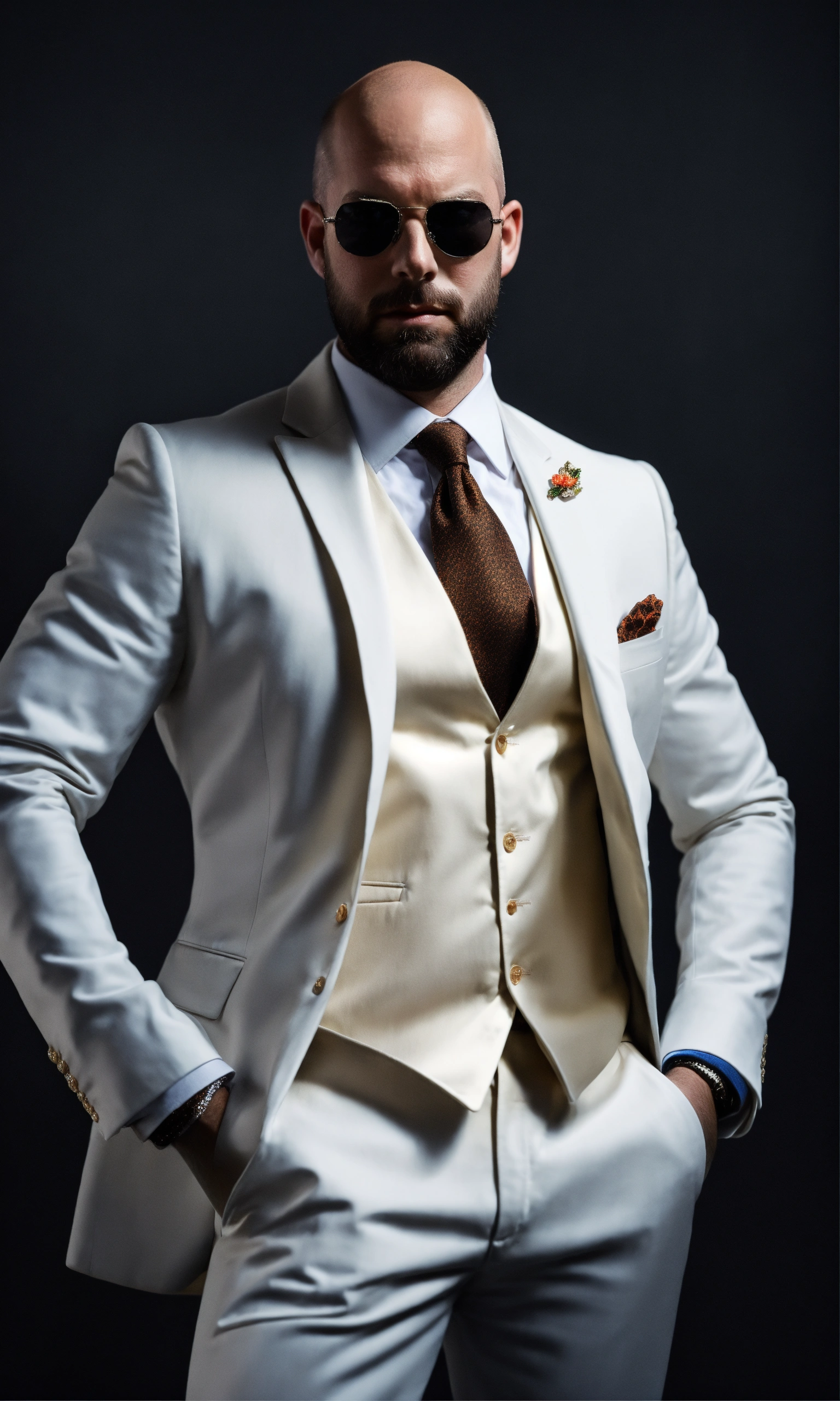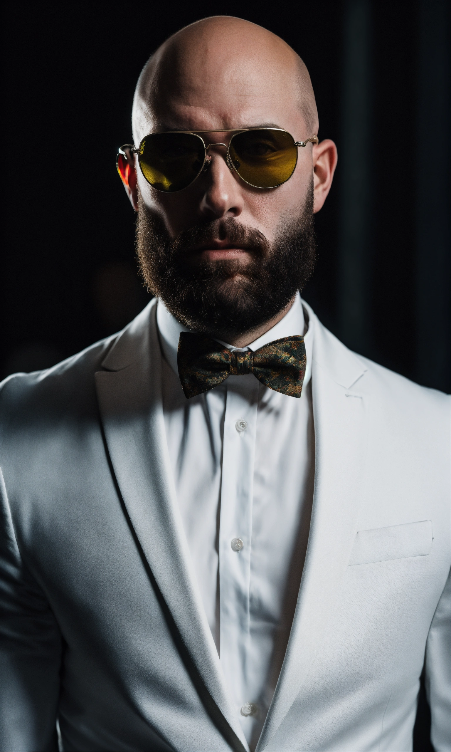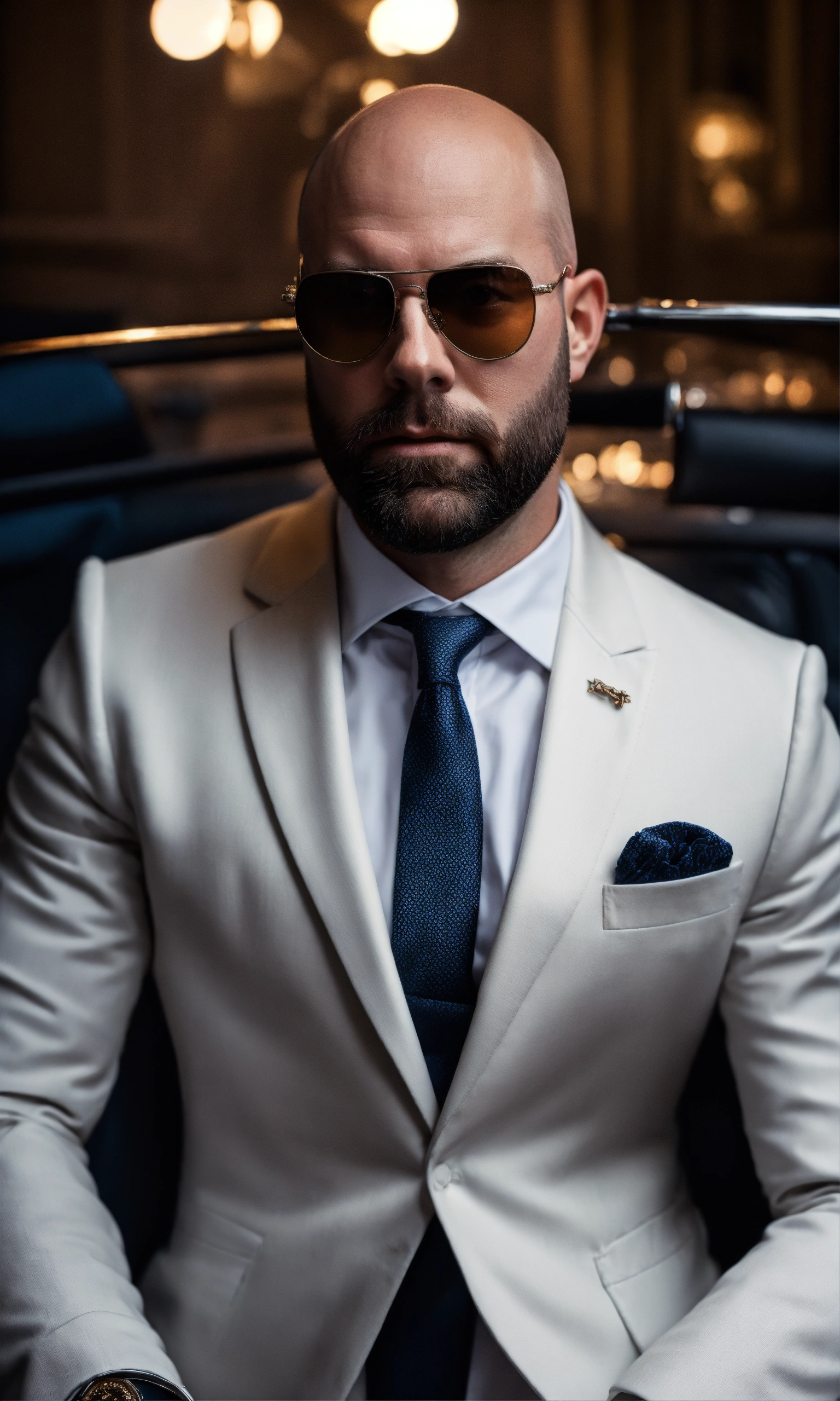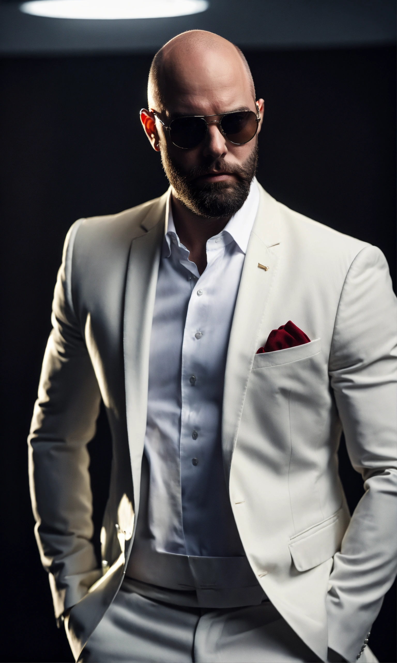 Image of bald andrew tate, short beard, in a white suit, with luxury sunglasses, facing at camera, super realistic, high resolution, dark room