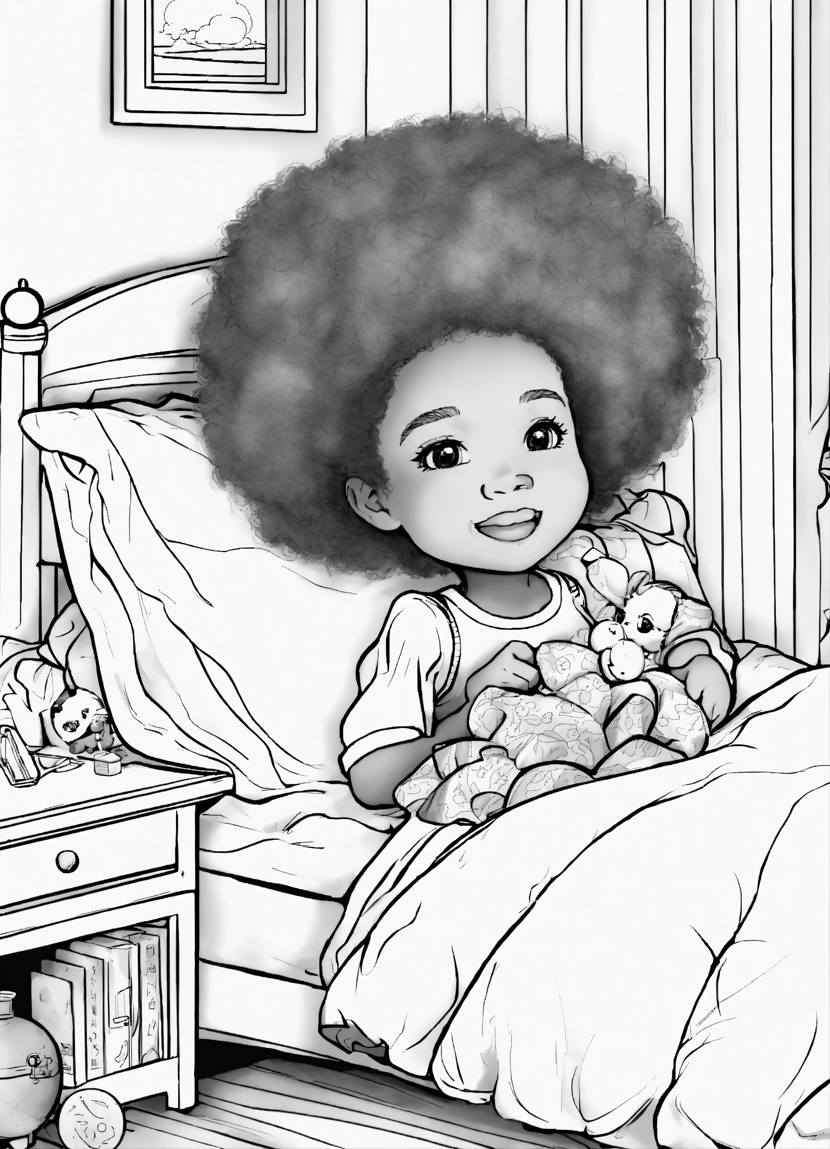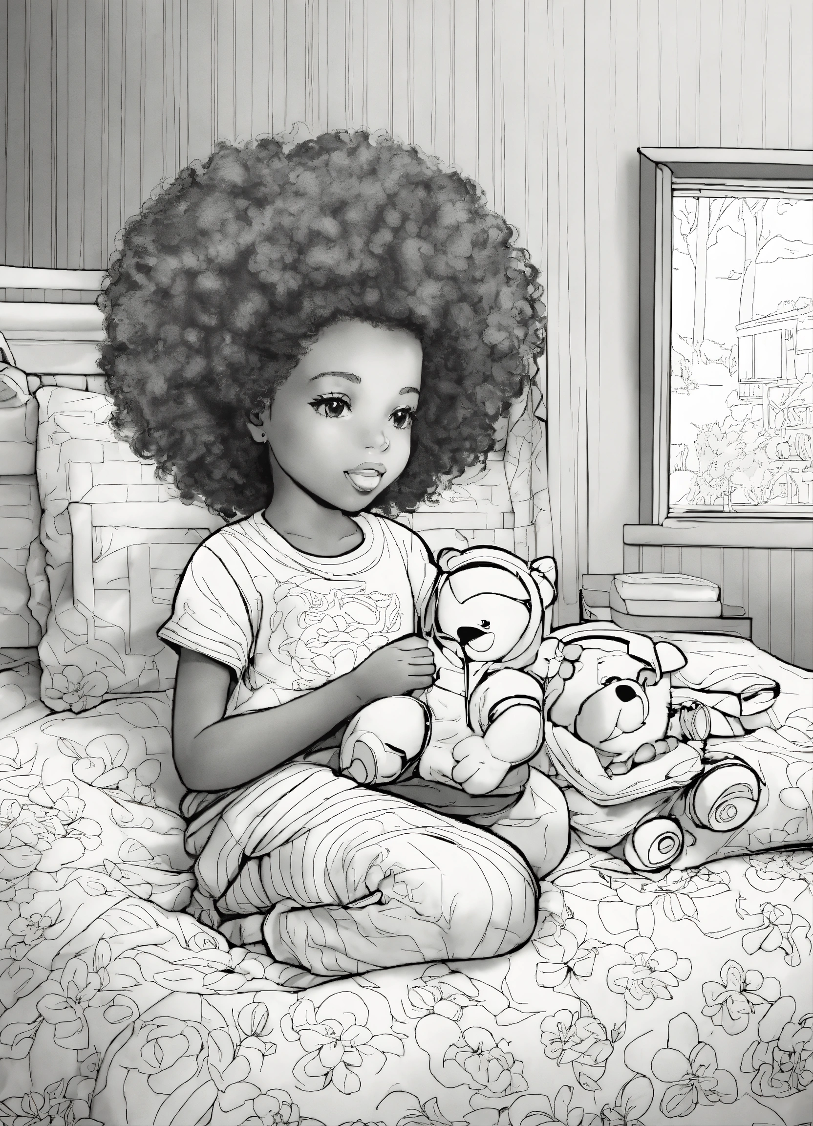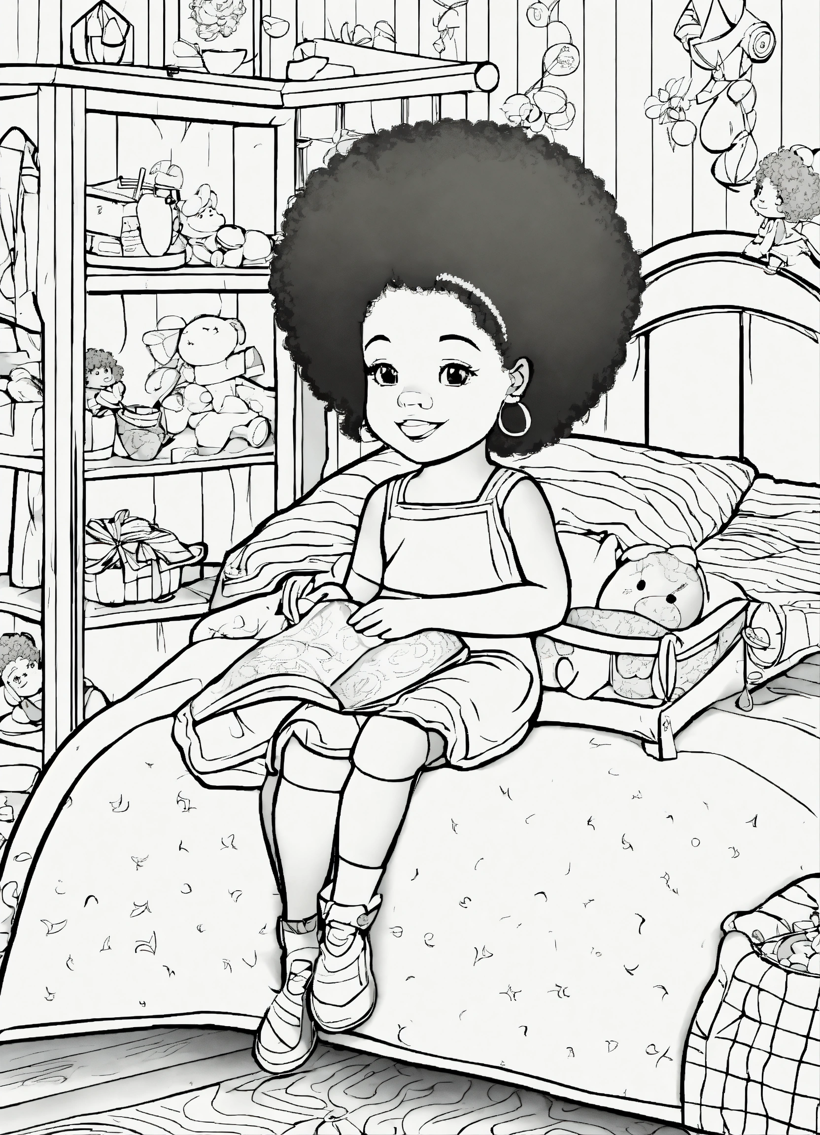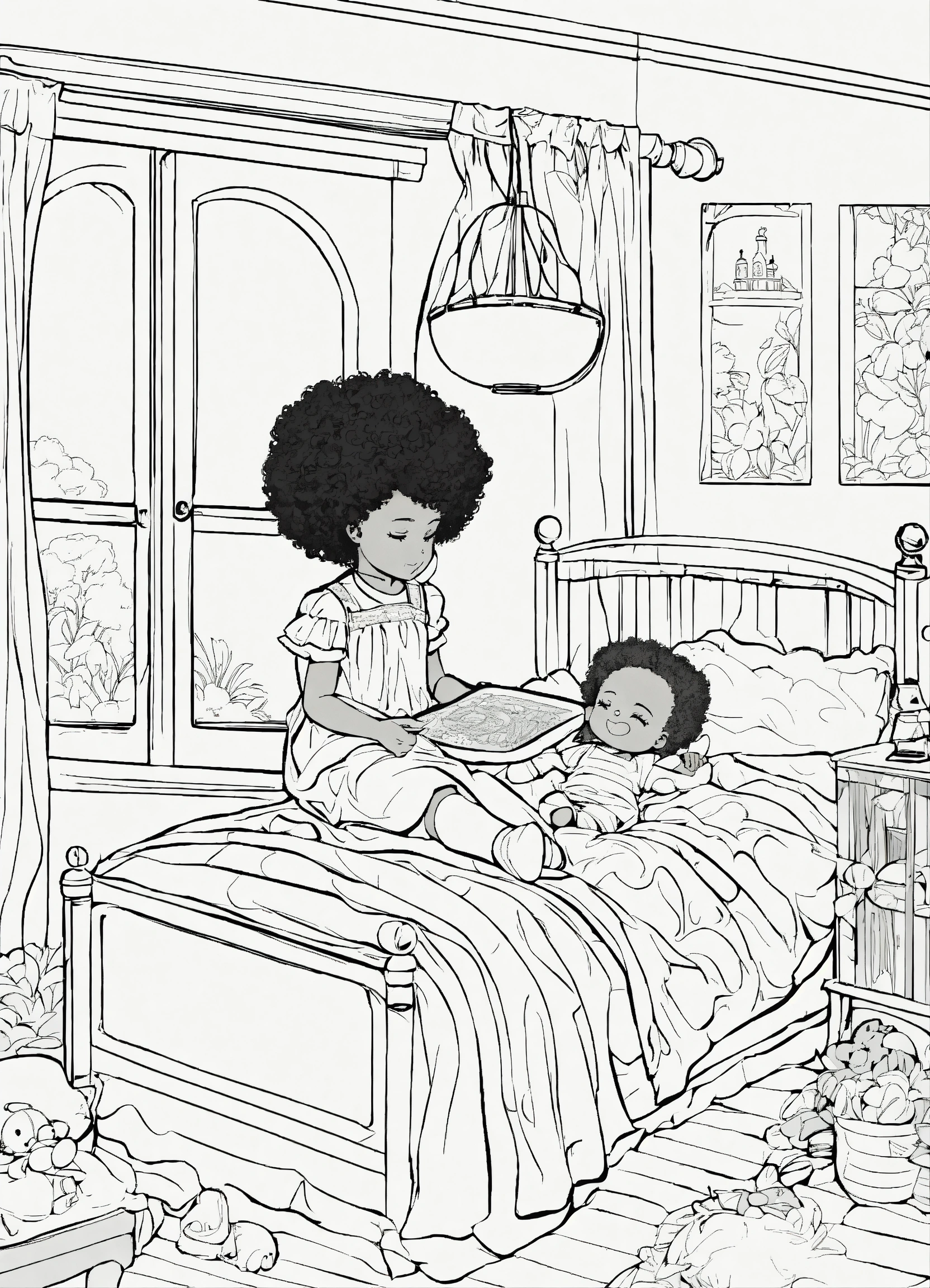 Vector, line art, coloring page, with afro american features, little girl playing with a doll. in her bed room, no shading, --no grey