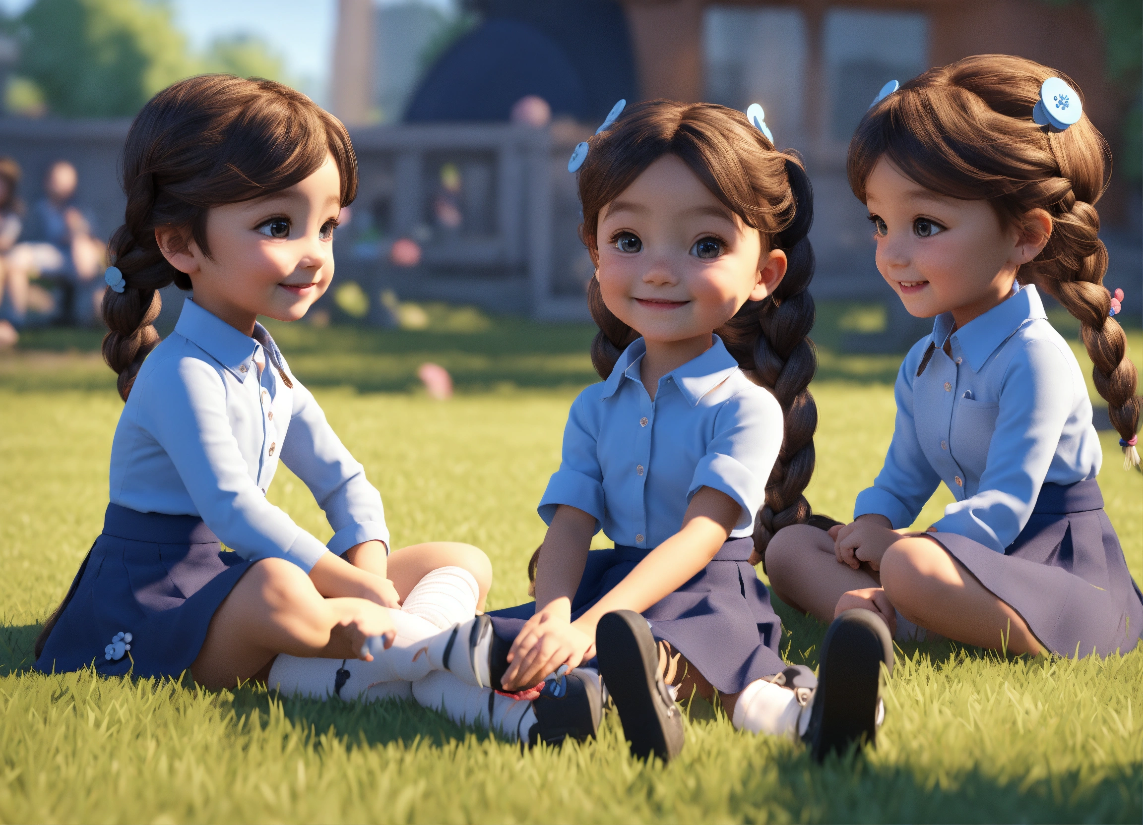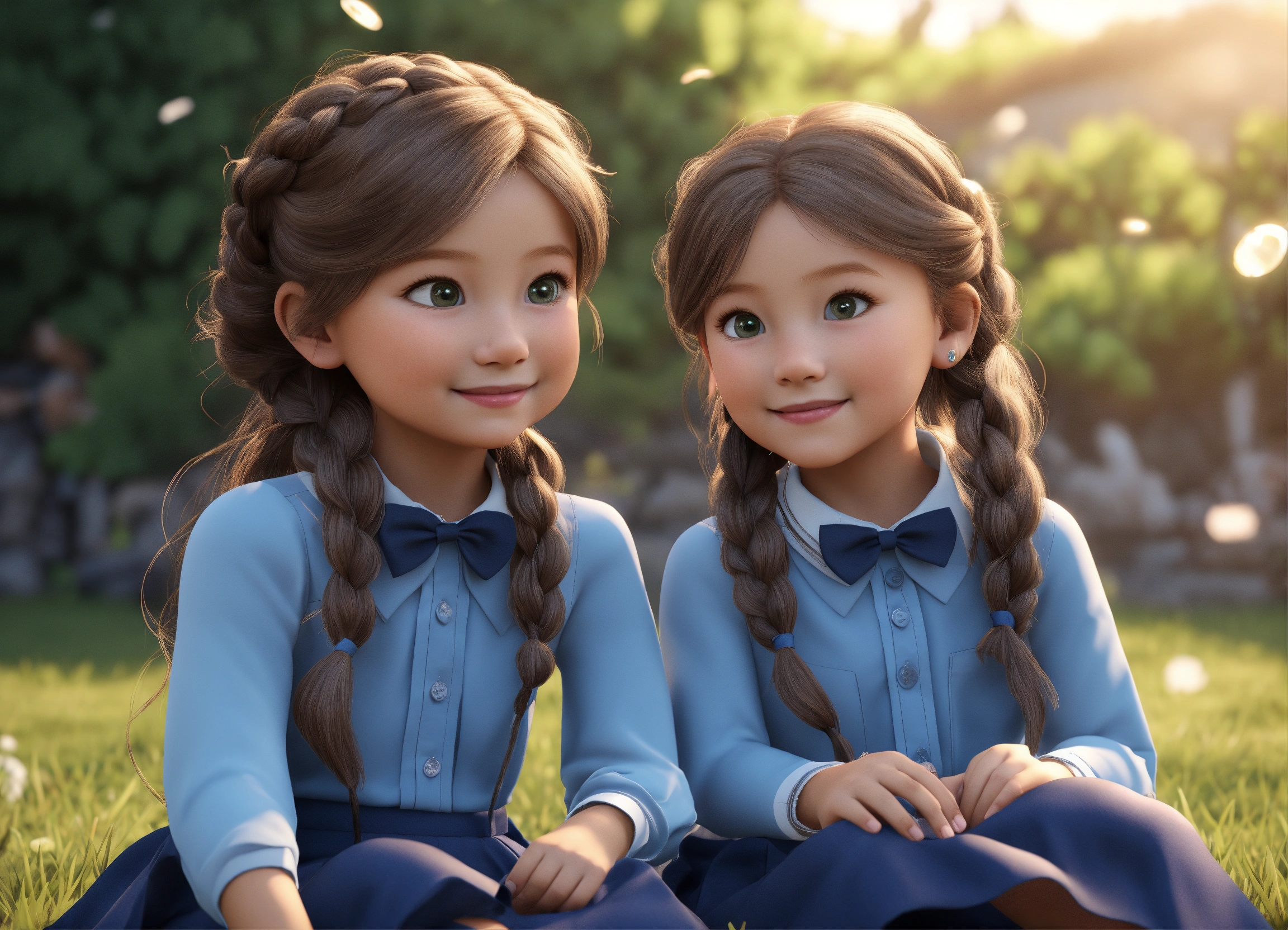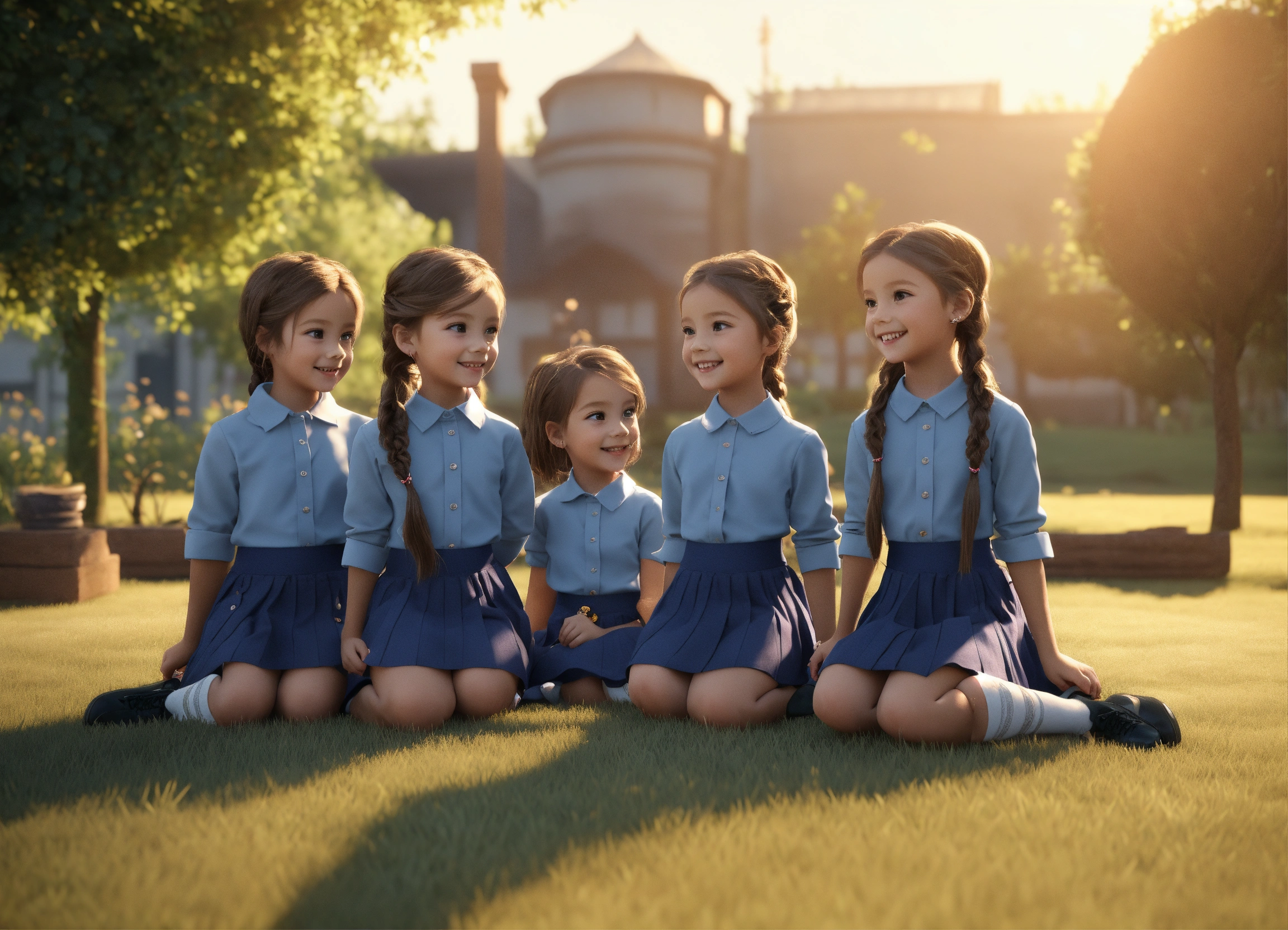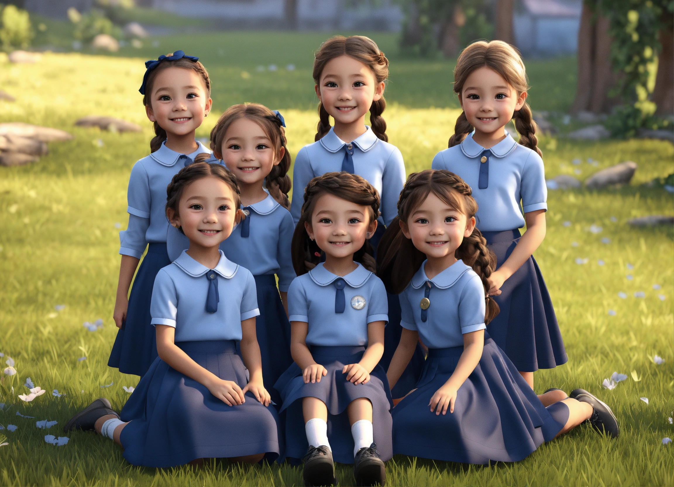 A group of cute 5-year-old girls, wearing a light blue button-down shirt with a light blue collar, long sleeves, a navy blue maxi skirt, white tights, dark shoes. hair gathered in a braid, they sit in a circle on the grass and smile. unreal engine rendering model in cartoon 3d style 8k.