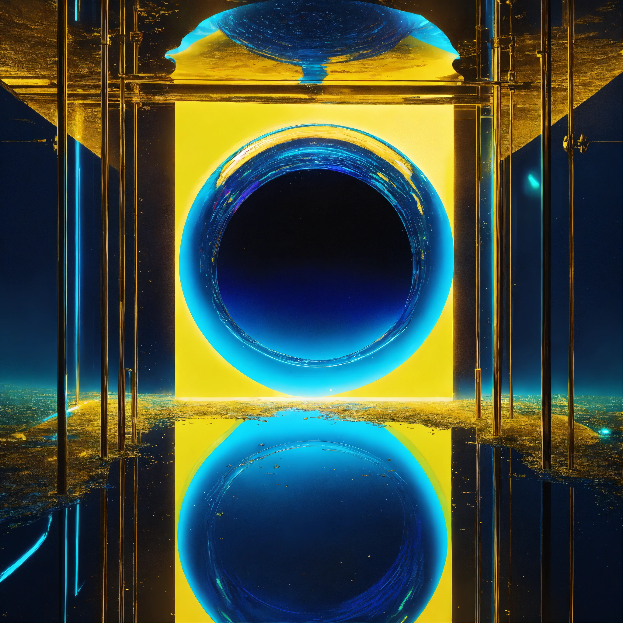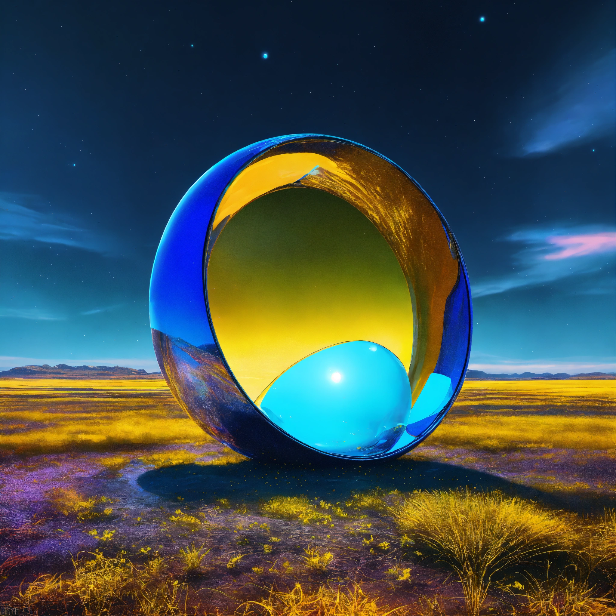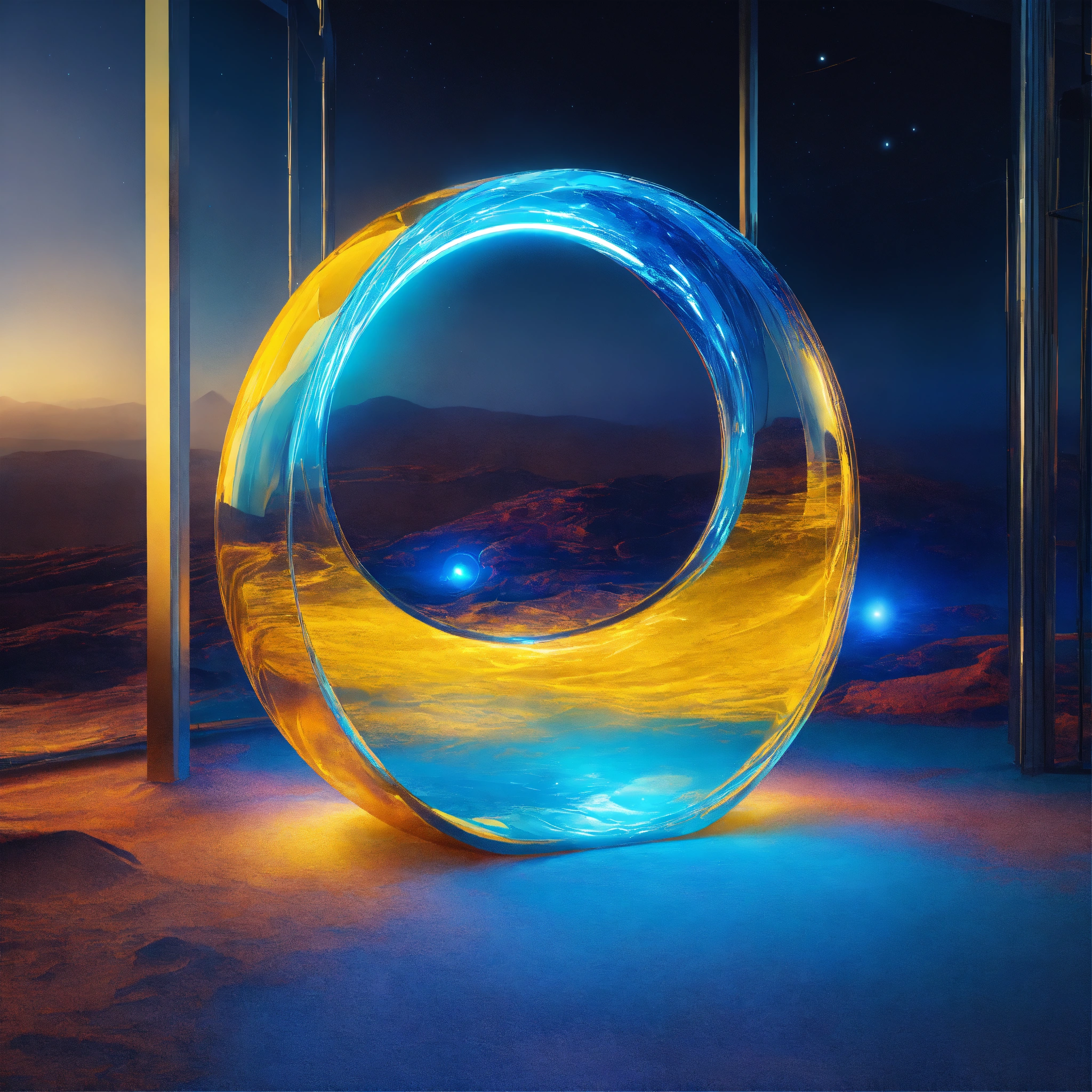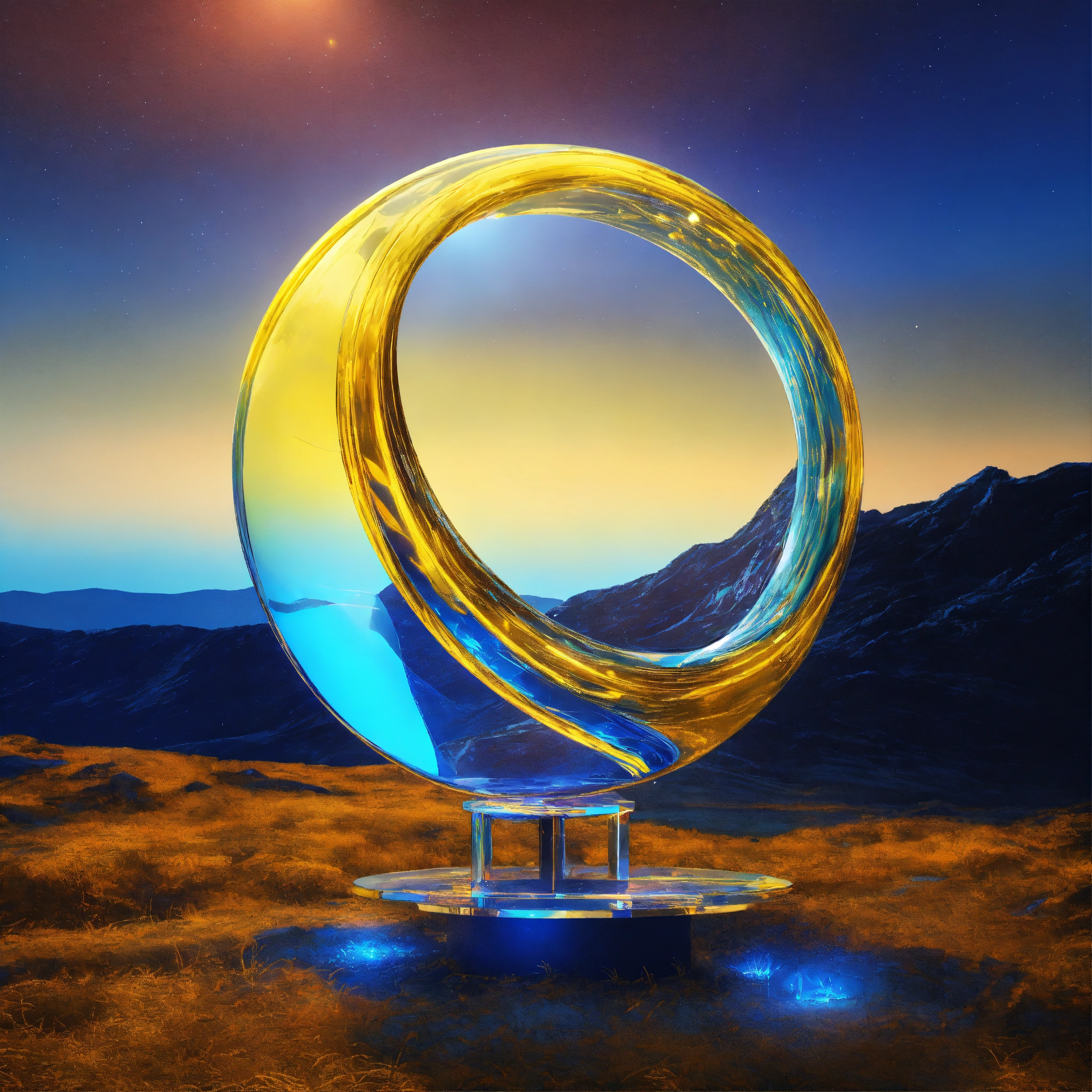 Metallic and glassy surface, vivid tones of blue and yellow, surreal futuristic neatly object, heavenly and intense neon lights, a glass installation on the open land without. background of a dreamy world. symbolizing a portal to another dimension. one abstract representative object floating. --ar 169 --s 1000 --c 15