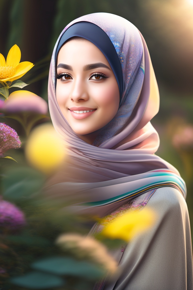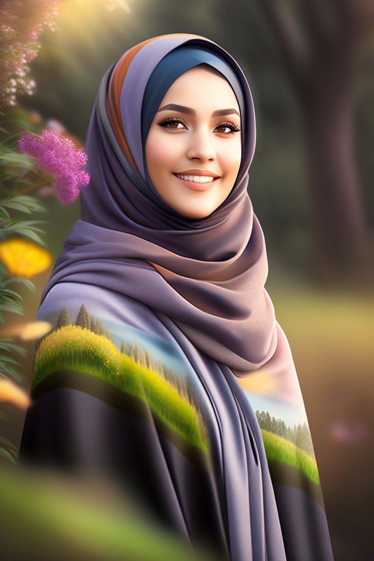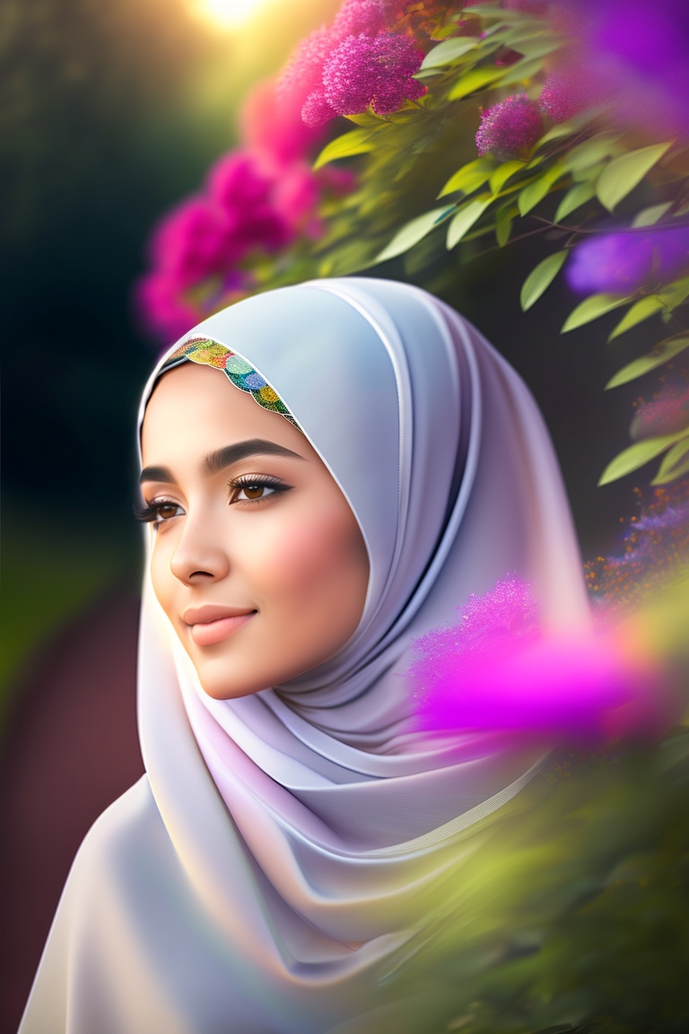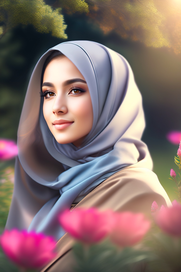 In an outdoor setting, a stunning hijabi girl stands with an enchanting blur of nature as her backdrop. the soft focus of trees, flowers, and sunlight creates a picturesque scene that complements her beauty. her hijab flutters gently in the breeze, and her confident gaze reflects the harmony between her and the natural world around her.