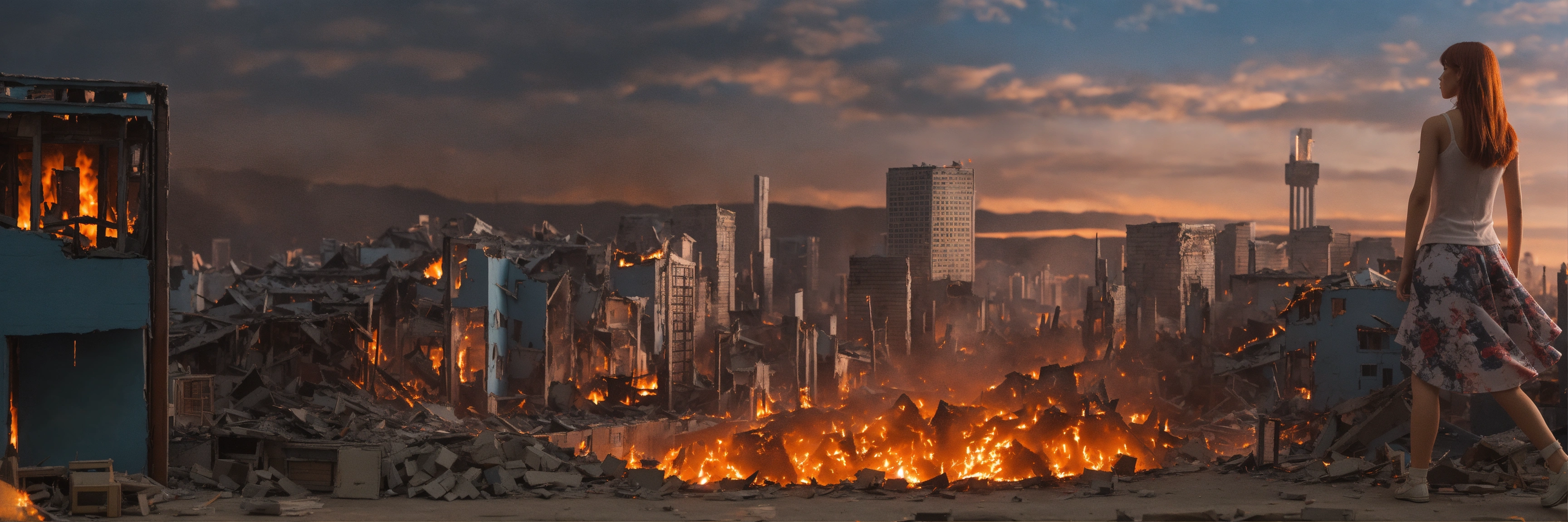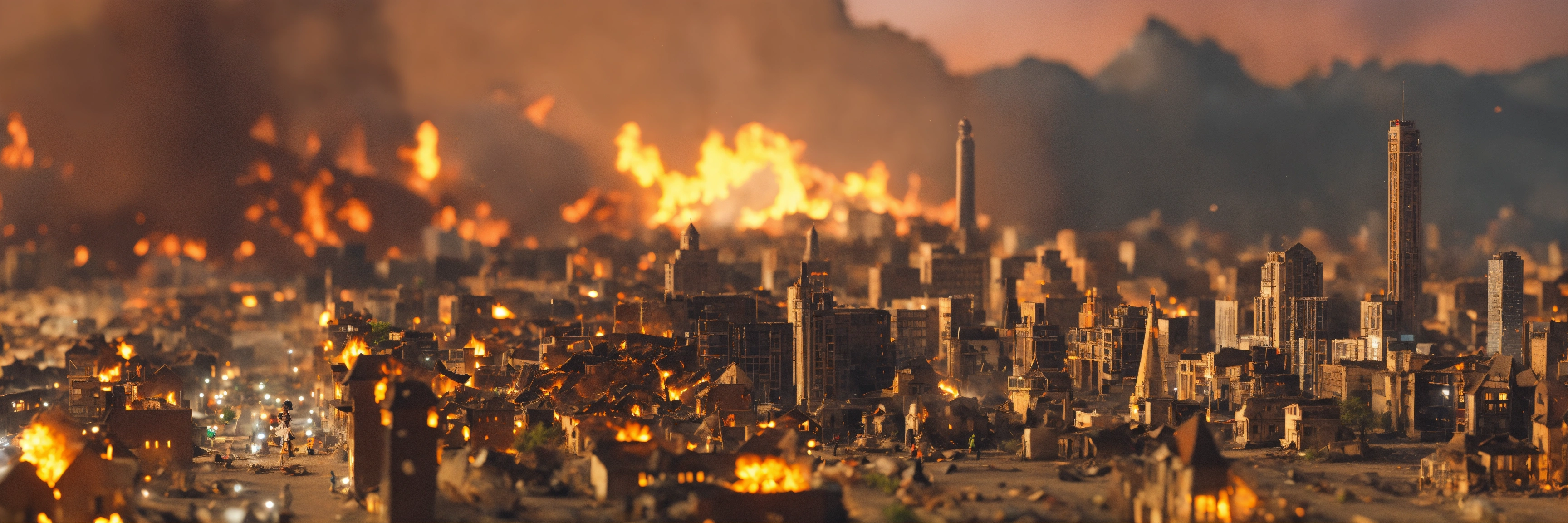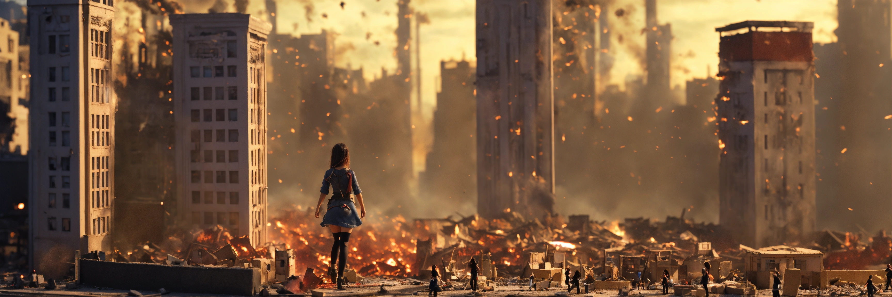 A ((massive)) (giantess1.5) emo girl walks through the middle of a tiny model city, destruction, violence, fire, size, miniature, minuscule, tiny, low angle, close up