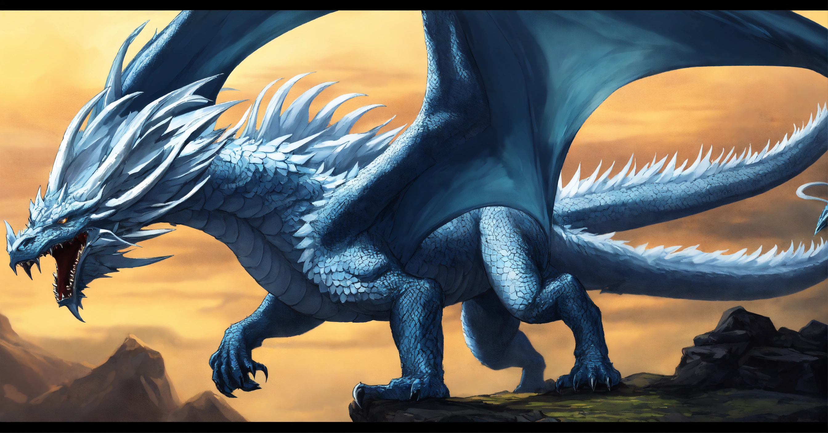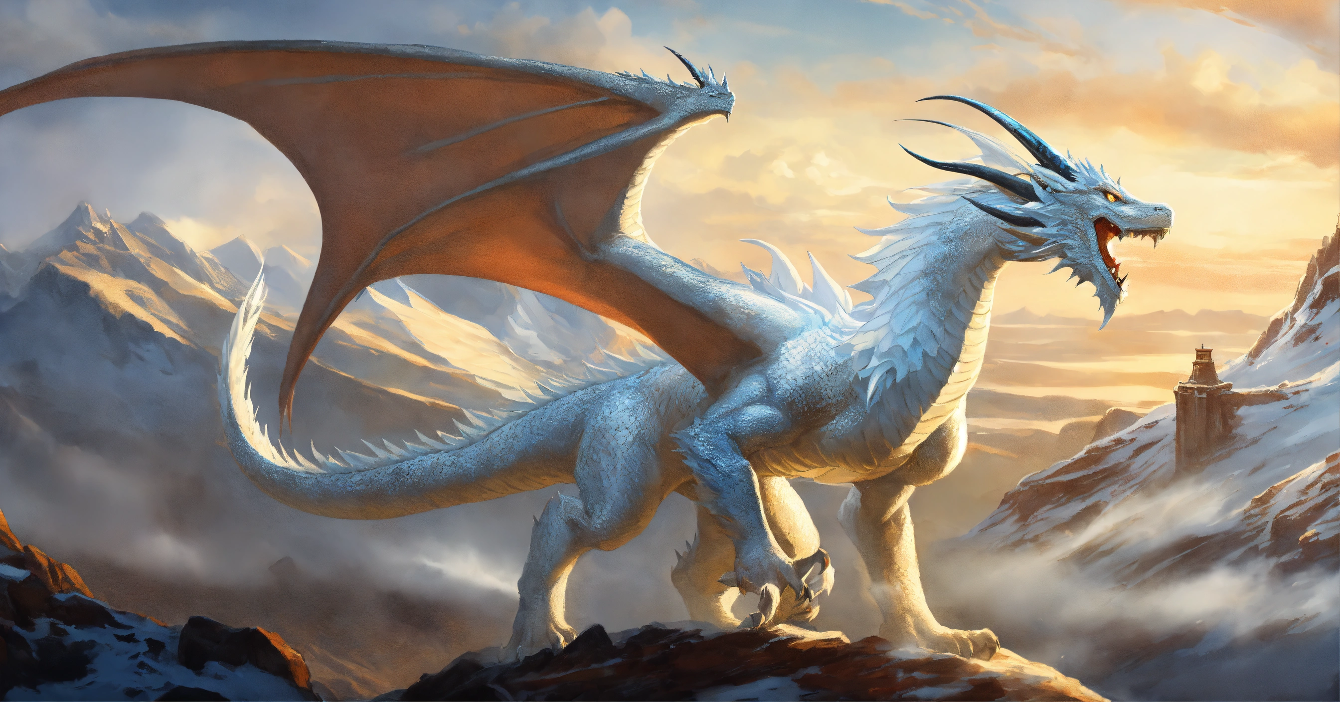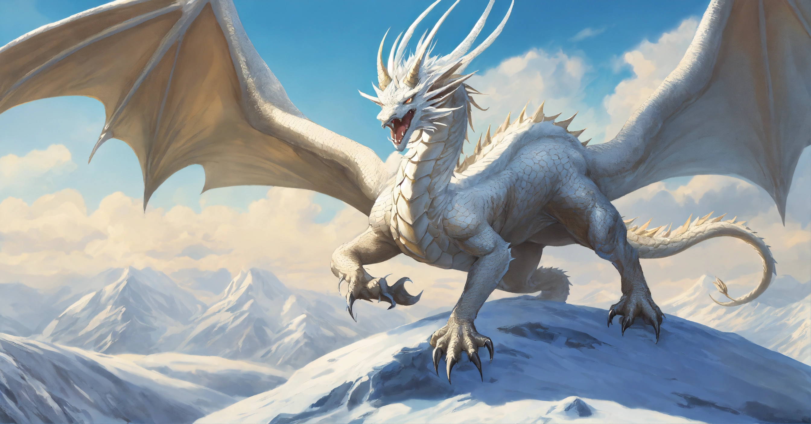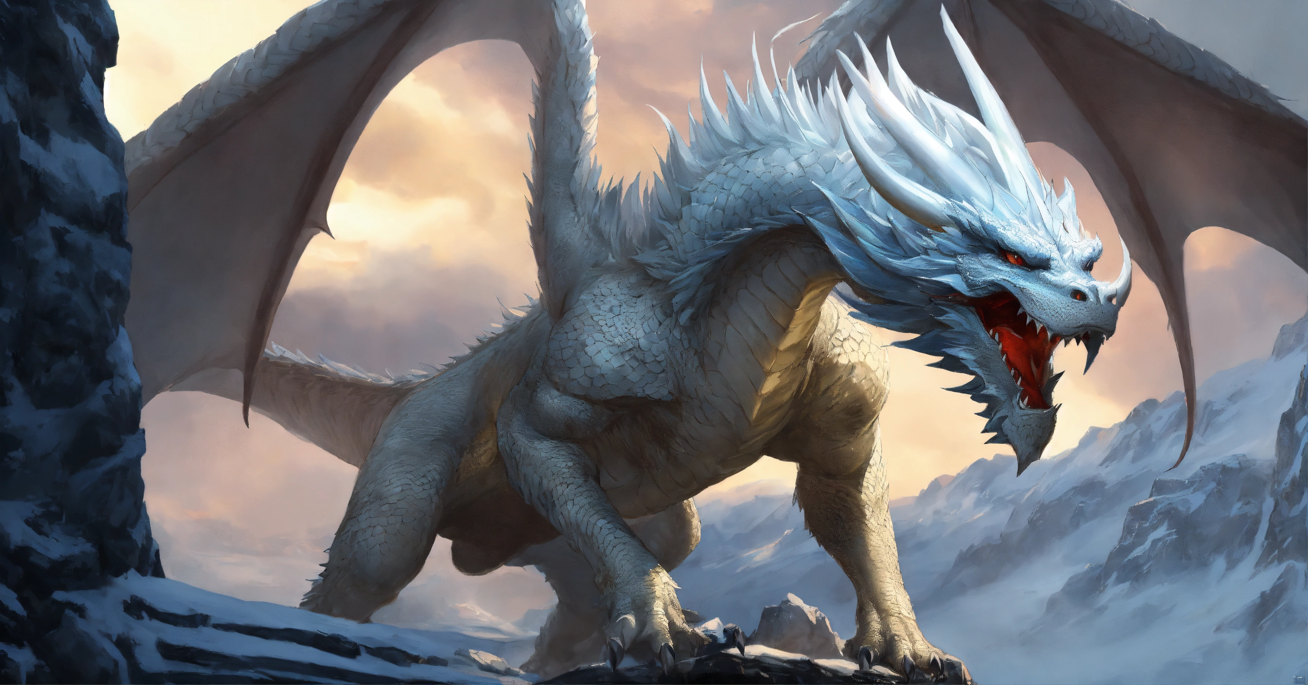 Fine art, delicate detail, menacing, angry white dragon with a beak. his skin is smooth and matte, like ice white, elongated face with large horns, spikey arms. his wings are long and elegant providing impressive strength in the air. the dragon is very agile and fast and can navigate the sky with grace and elegance. he is a hunter and powerful, and the sight of him in the sky is impressive, icy region background, in the style of dungeons and dragons monster manual, graphic novel art