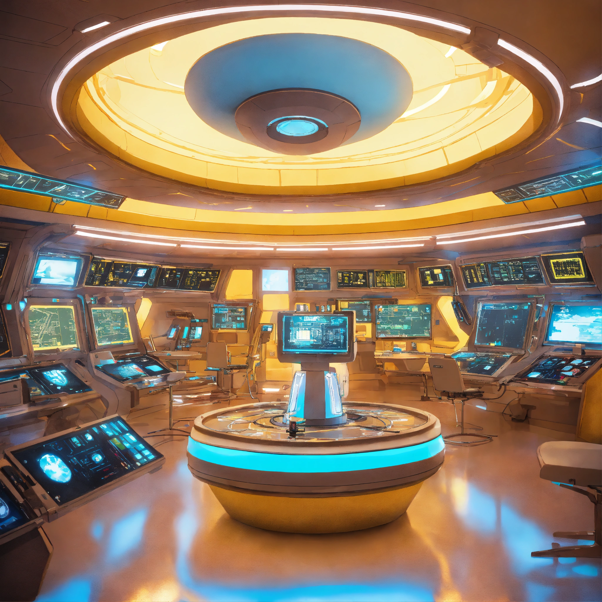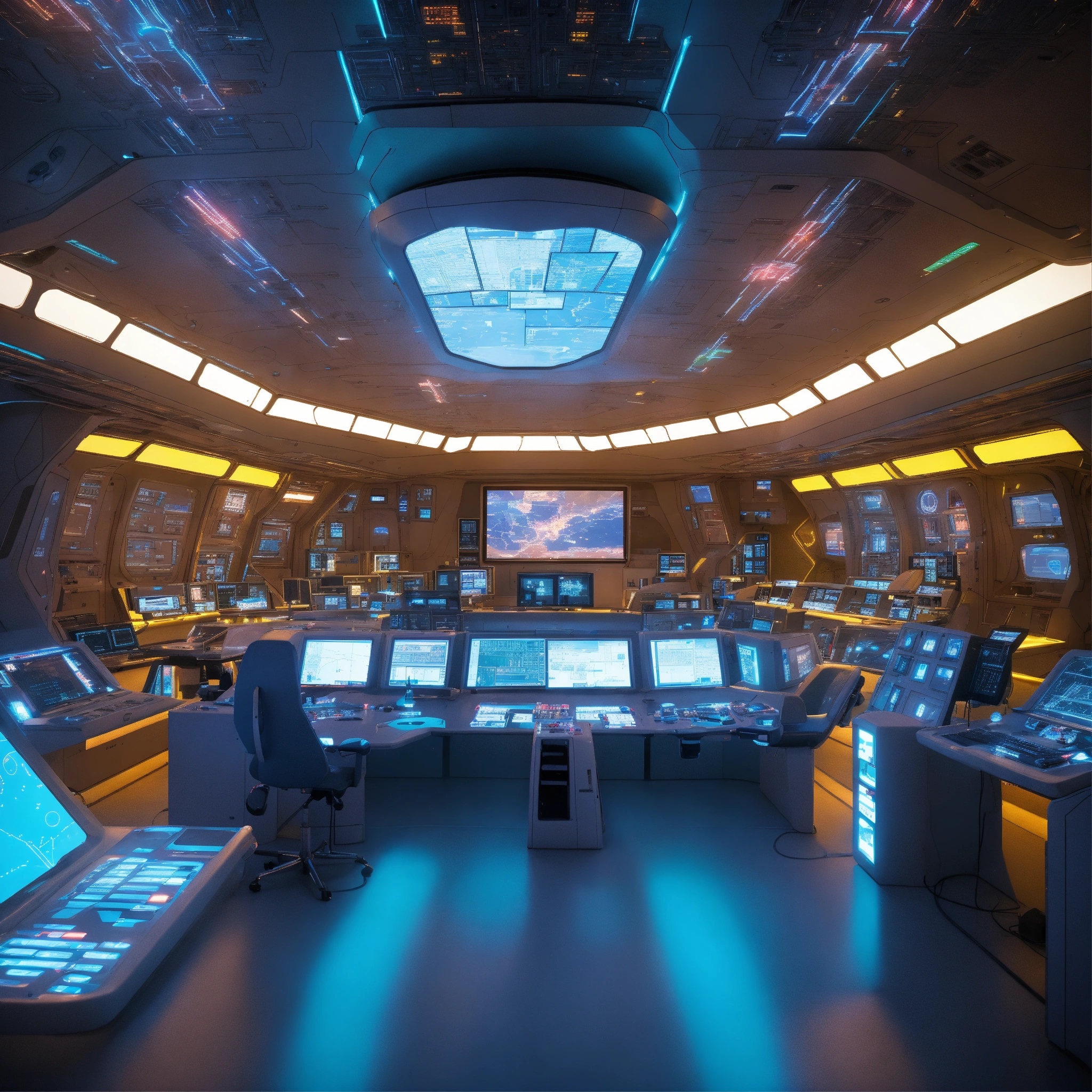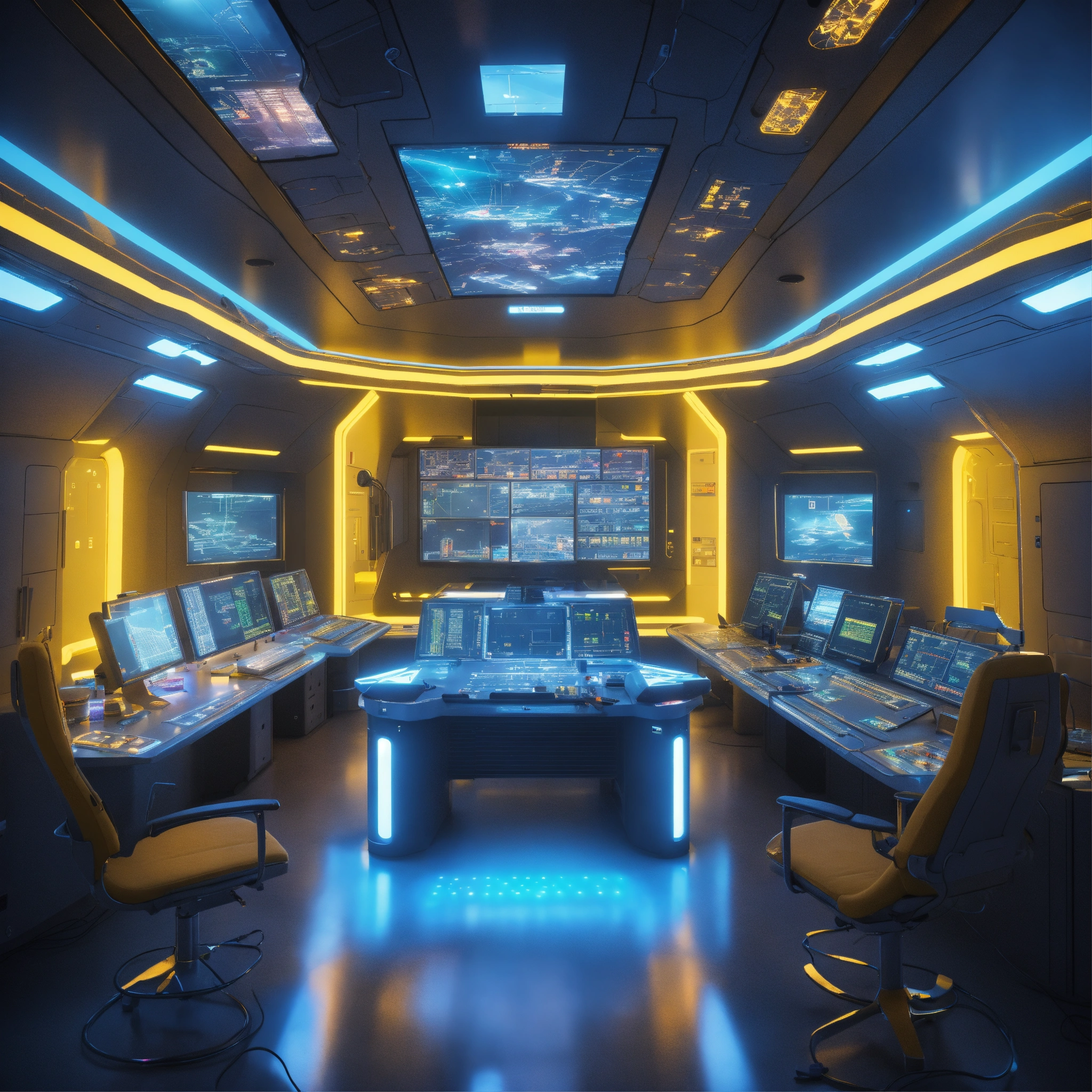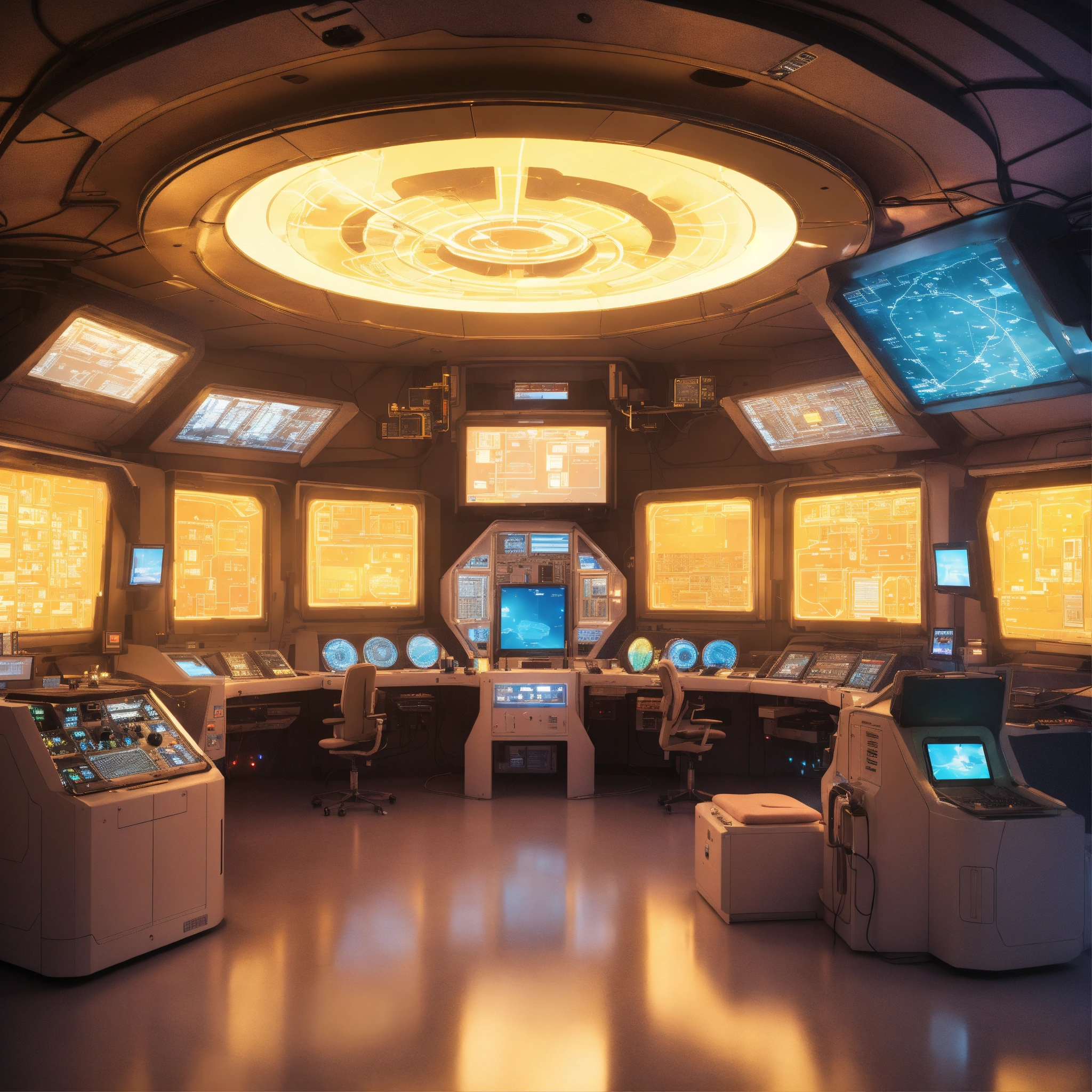 The interior of a futuristic time-traveling spaceship. the scene depicts the control room, a spacious area filled with control panels and computers illuminated by bright and futuristic lights. screens display route calculations and holographic projections. it is clearly identifiable as a futuristic medical vessel, with the presence of illuminated medical crosses emitting a soft and soothing glow. although the scene lacks characters, it should evoke a dynamic and active atmosphere. main colors are white, blue and yellow