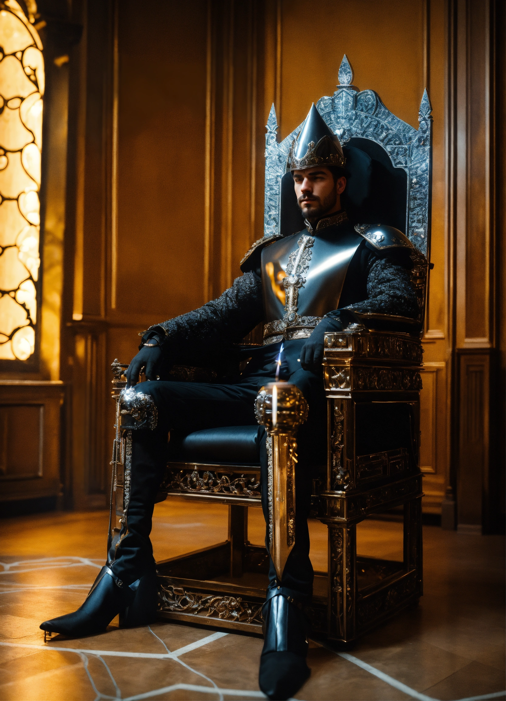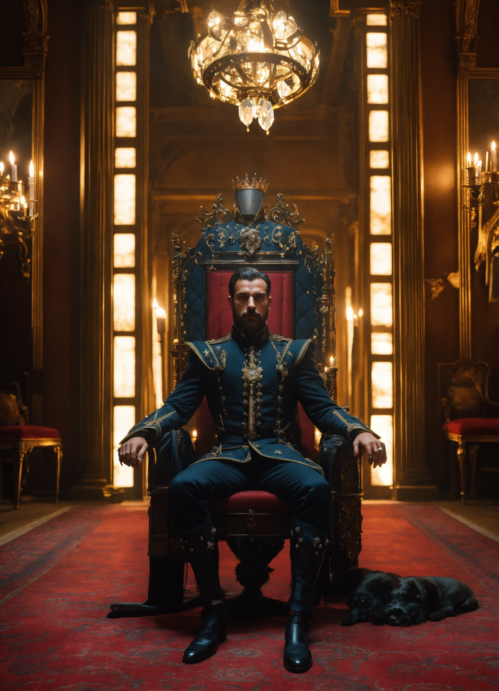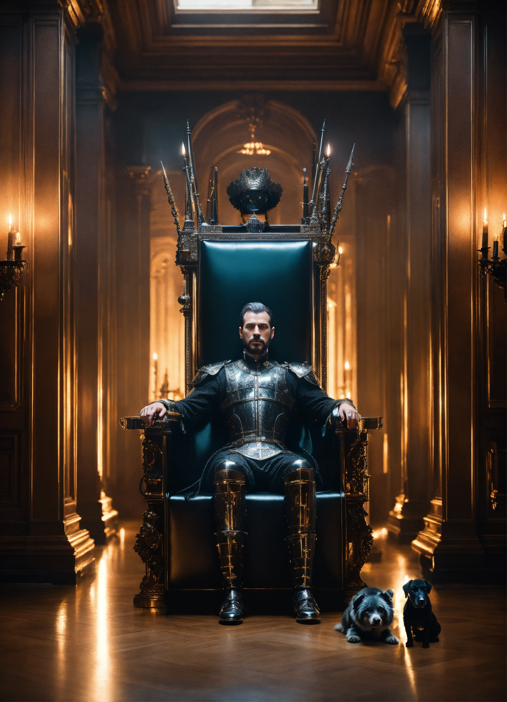 An ultrarrealistic distant photograph of a futuristic medieval king style power suit, made of black mate metal and polymer, full crystal hull, for a man, visible wires, sitting in a throne, two dogs sleeping in the floor, squared floor, imposing, modern minimalism, elegant, dystopia, mysterious, godlike, scary, in a victorian era large palace room whit candle lights, smok ambient, 8k