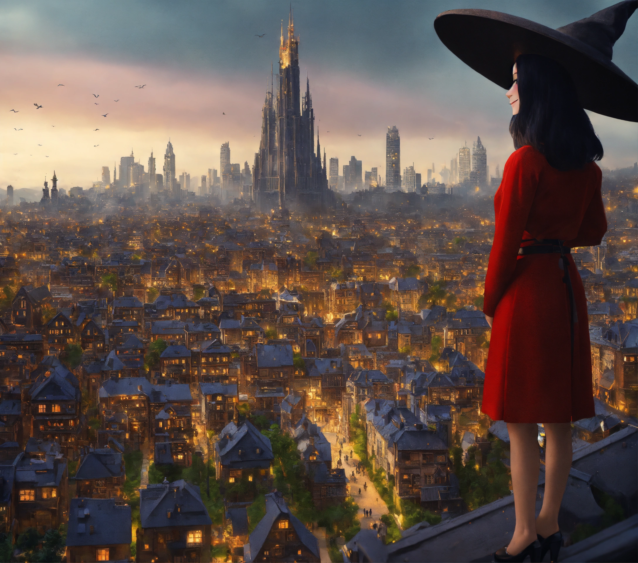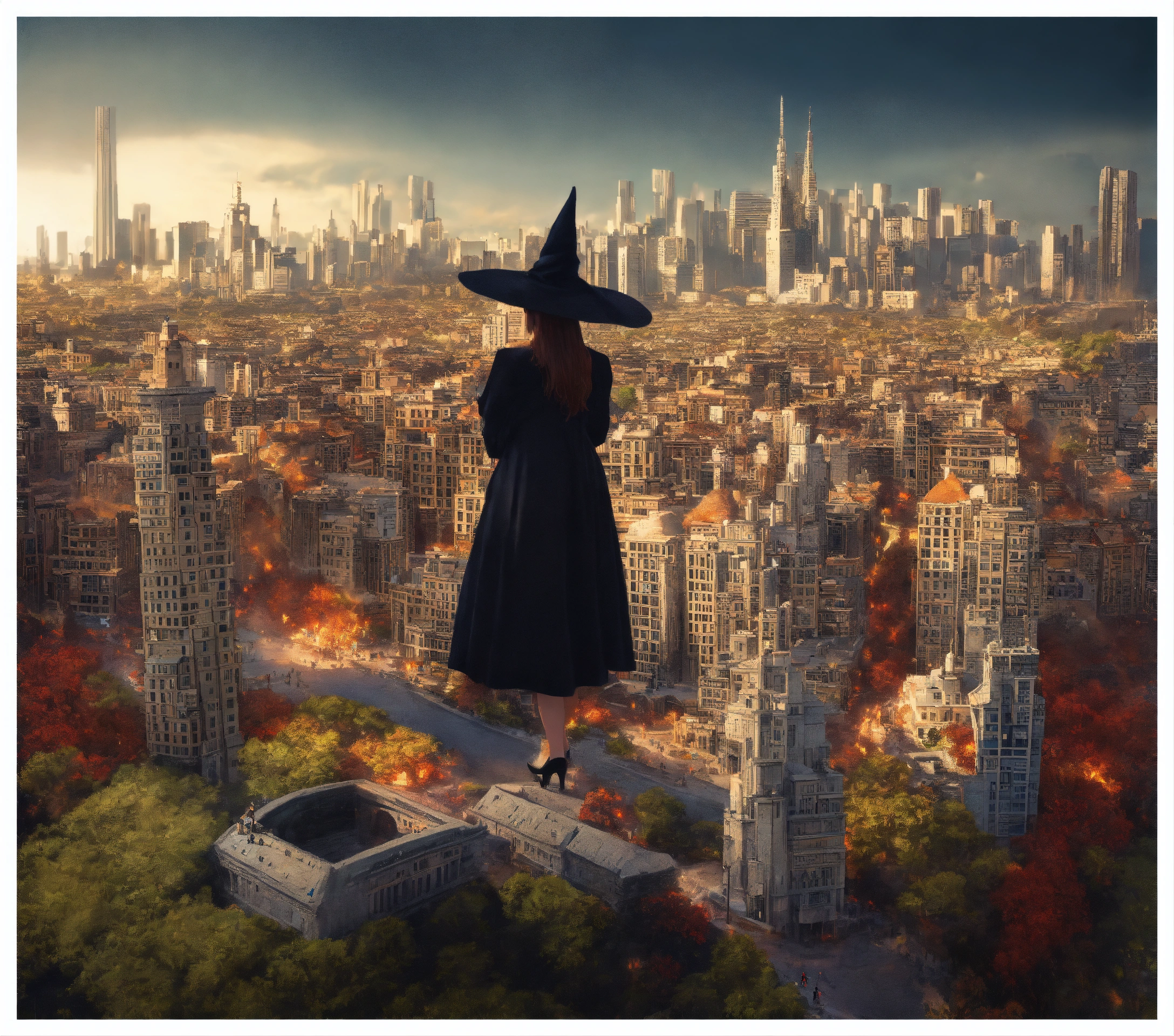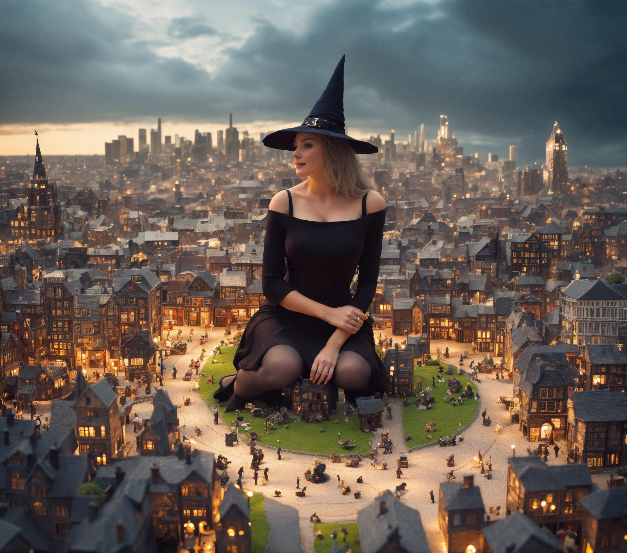 A ((gigantic)) (massive2) giantess witch examines a (((tiny))) model city, (tiny people) wander about the city, arrogant, minuscule, minute, tiny, archaic, (((beautiful))), looming, fantasy, active pose, dramatic, majestic, lounging, photo, smirk