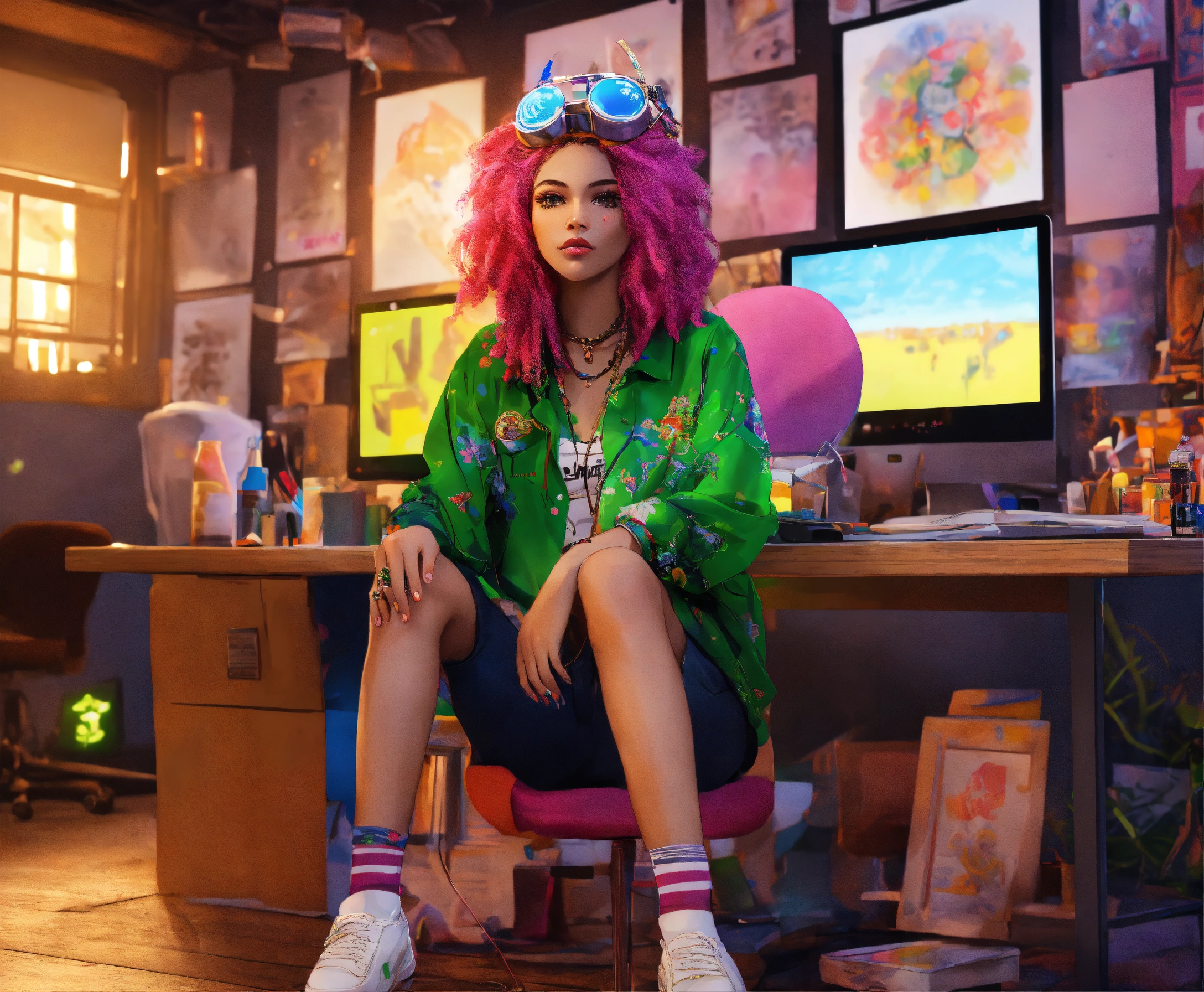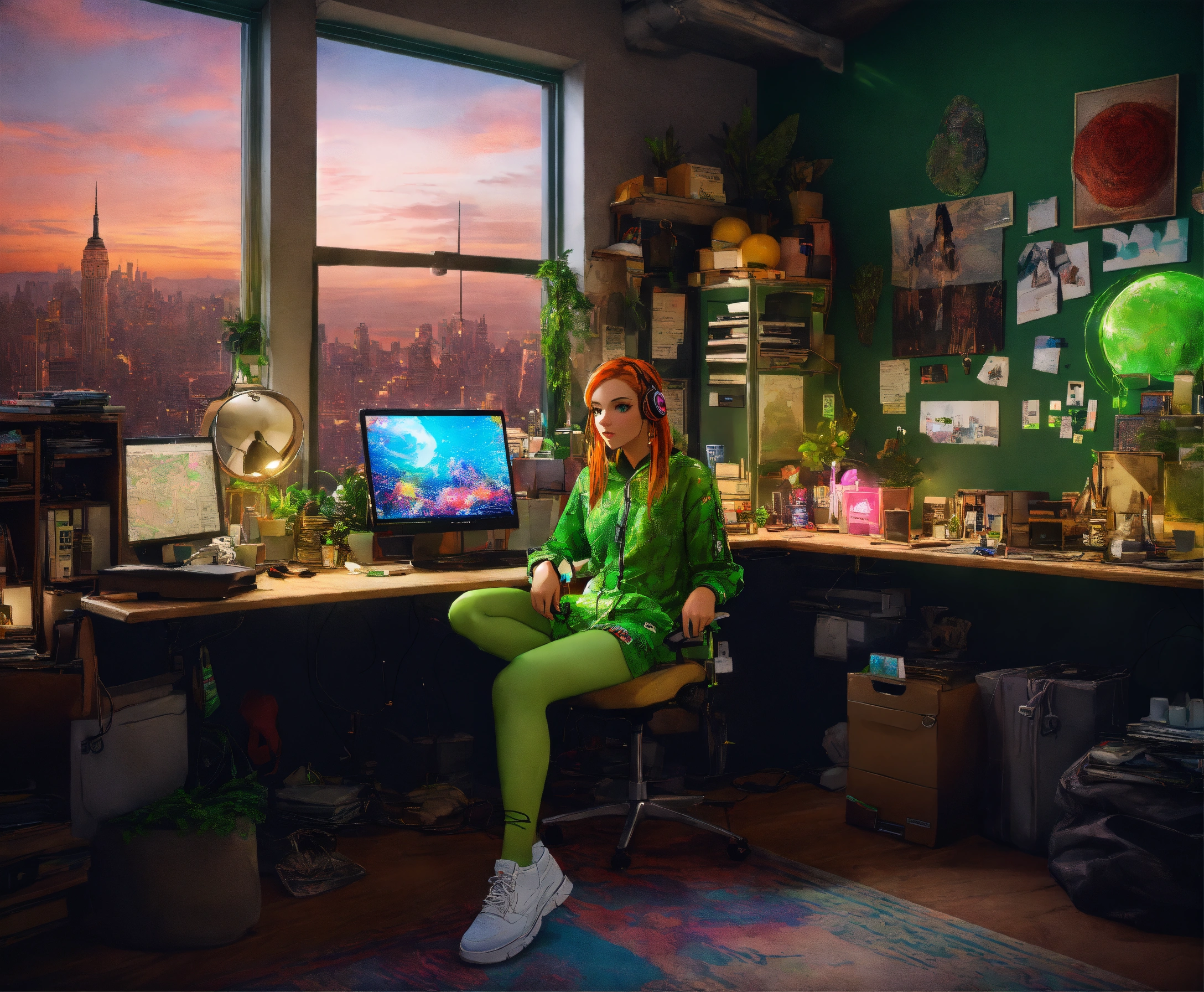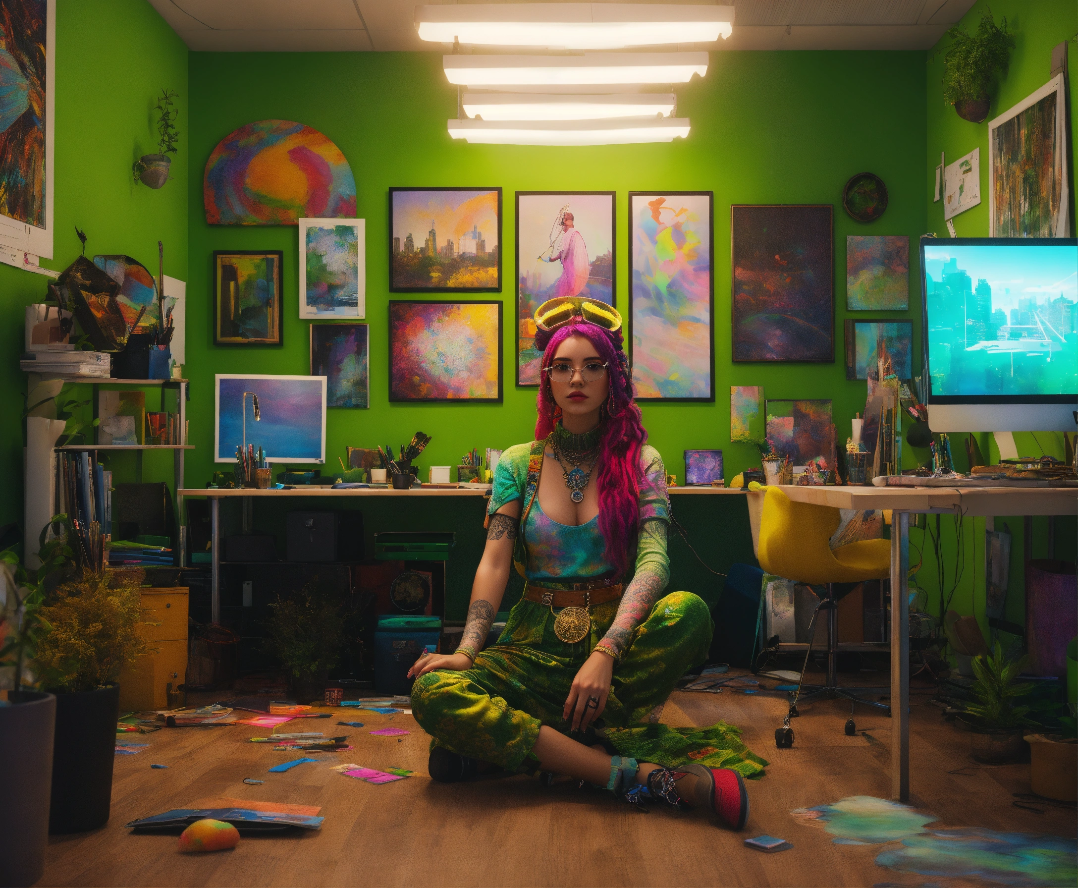 Orion, a green girl sitting in a mundane office with, adhd, trippy, corporate, hippy, hipster, millennial girl, eccentric style, artist, co-workers, nyc, punk visual art, unreal engine