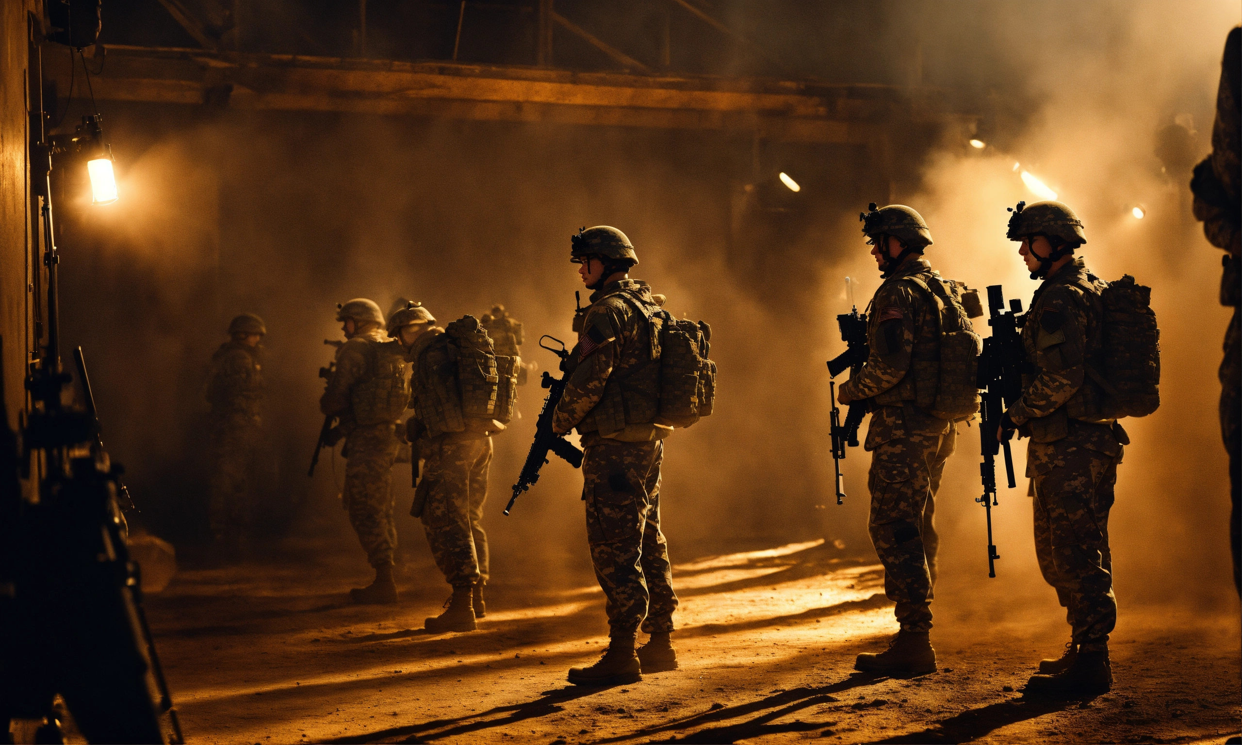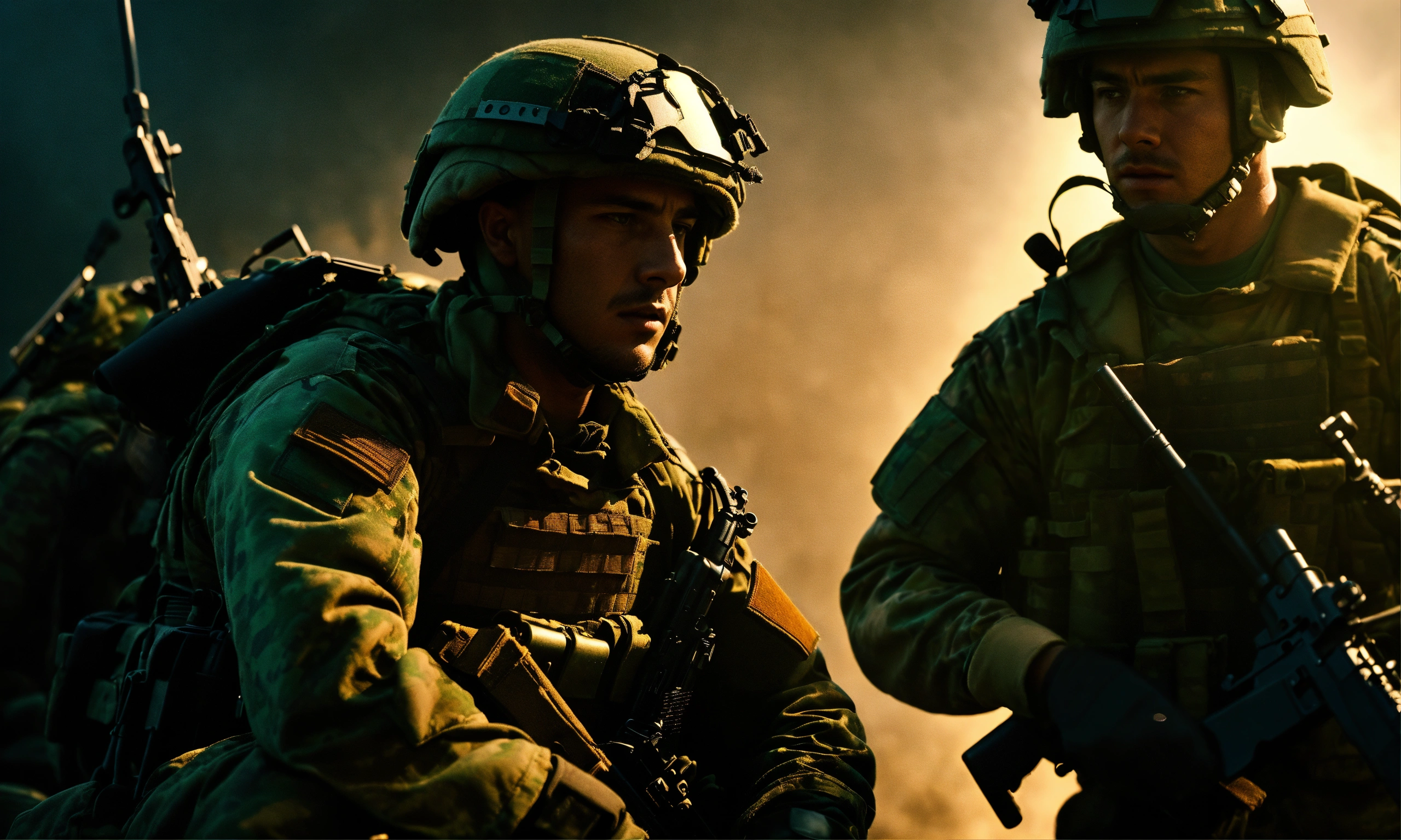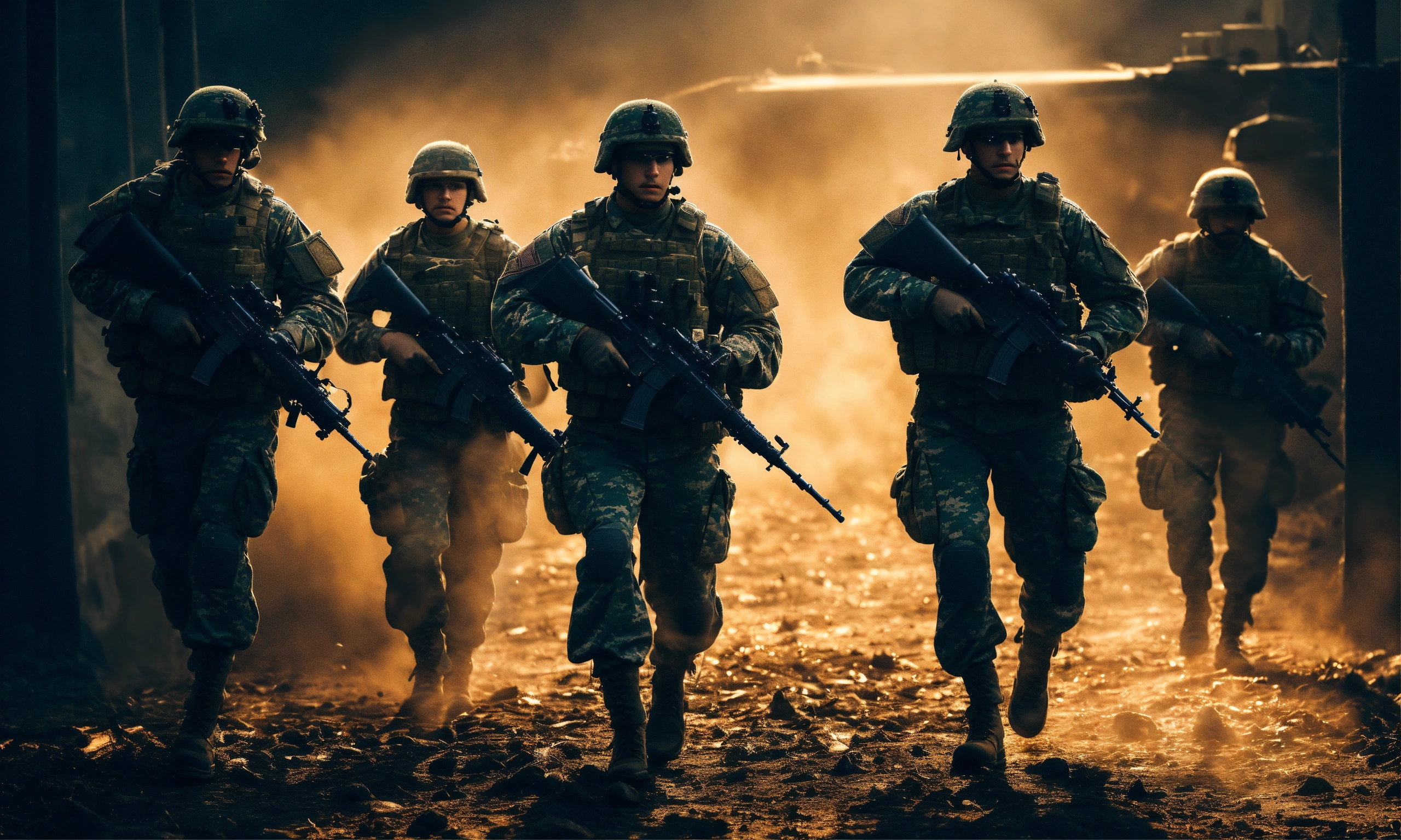Produce me an image of soldiers readies to fight, movie image, filtered through spotlight. ensure high resolution, 8k image, realistic.