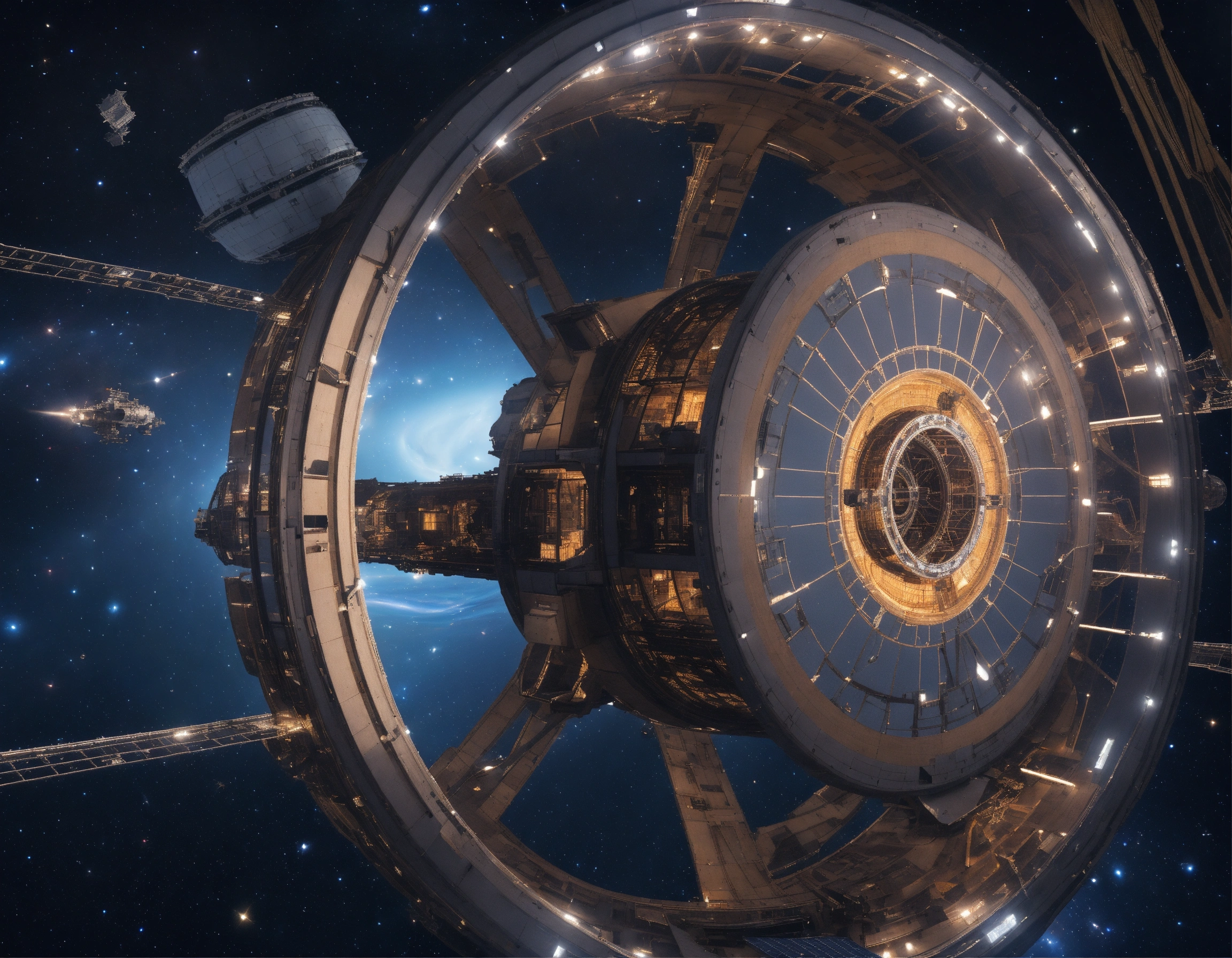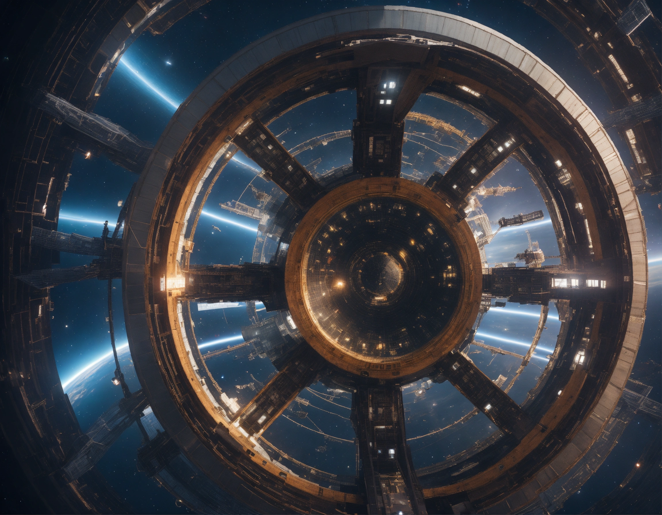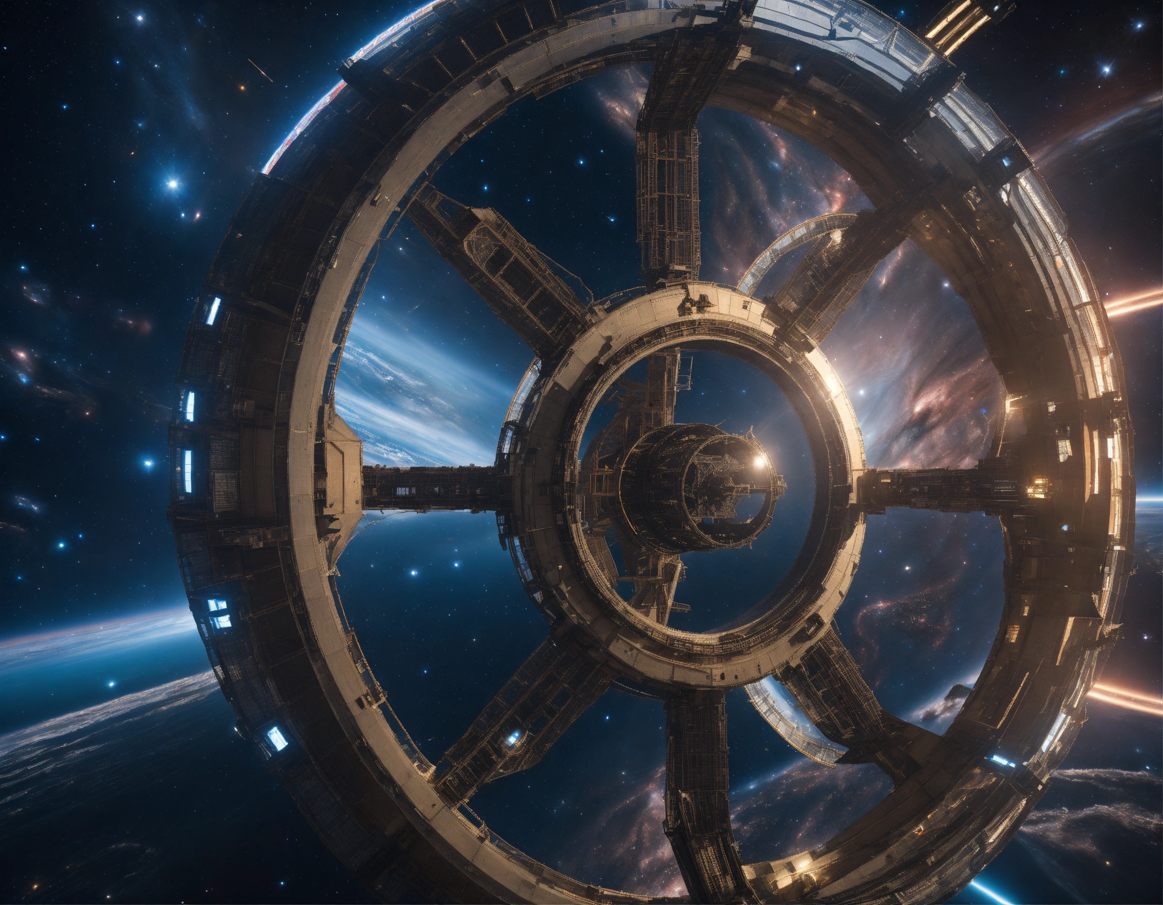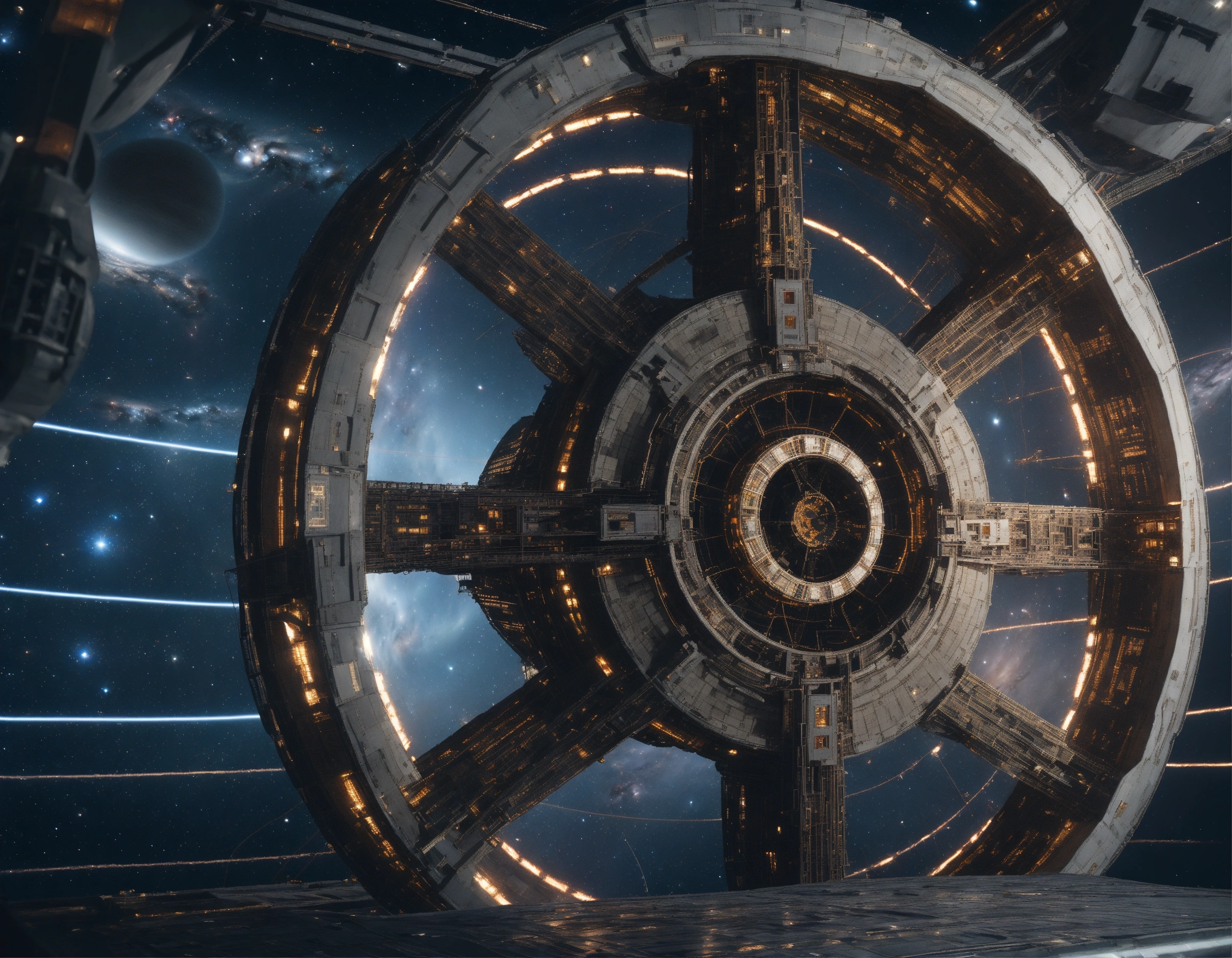 A highly realistic photo from a distance view of a futuristic thin wheel-shaped space station in space void, with a thin perimeter and many radial bridges, forming a wheel-shape, in the middle of space simple, elegant, minimalist, disc-sha ped, 8k