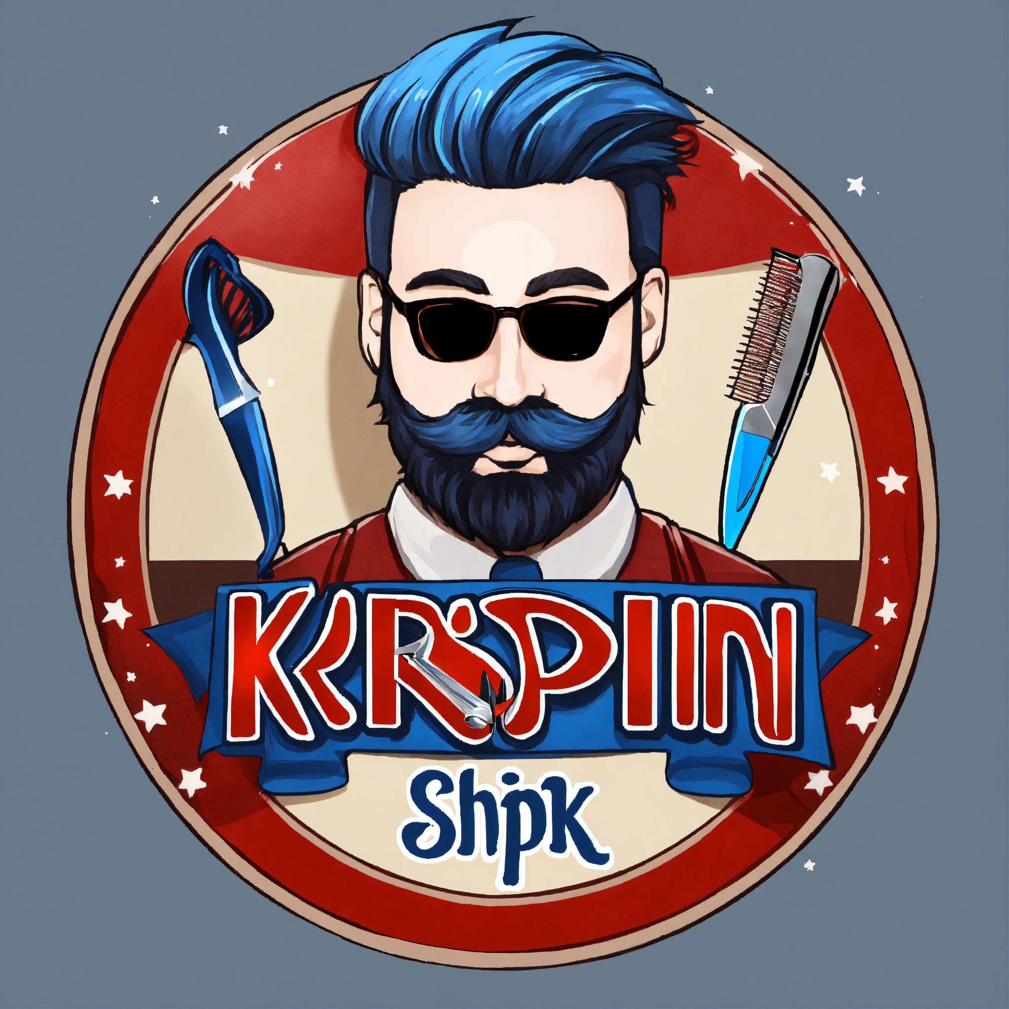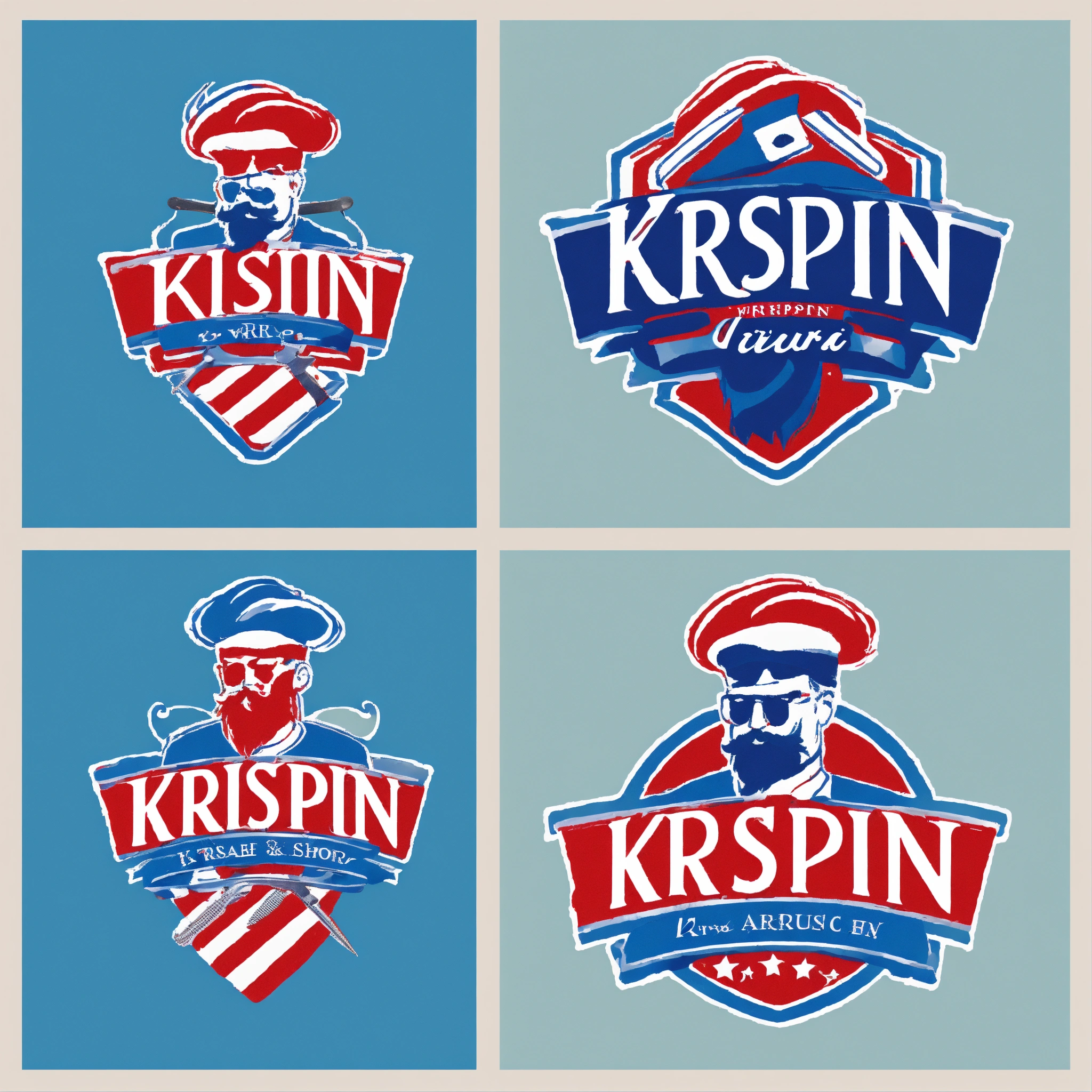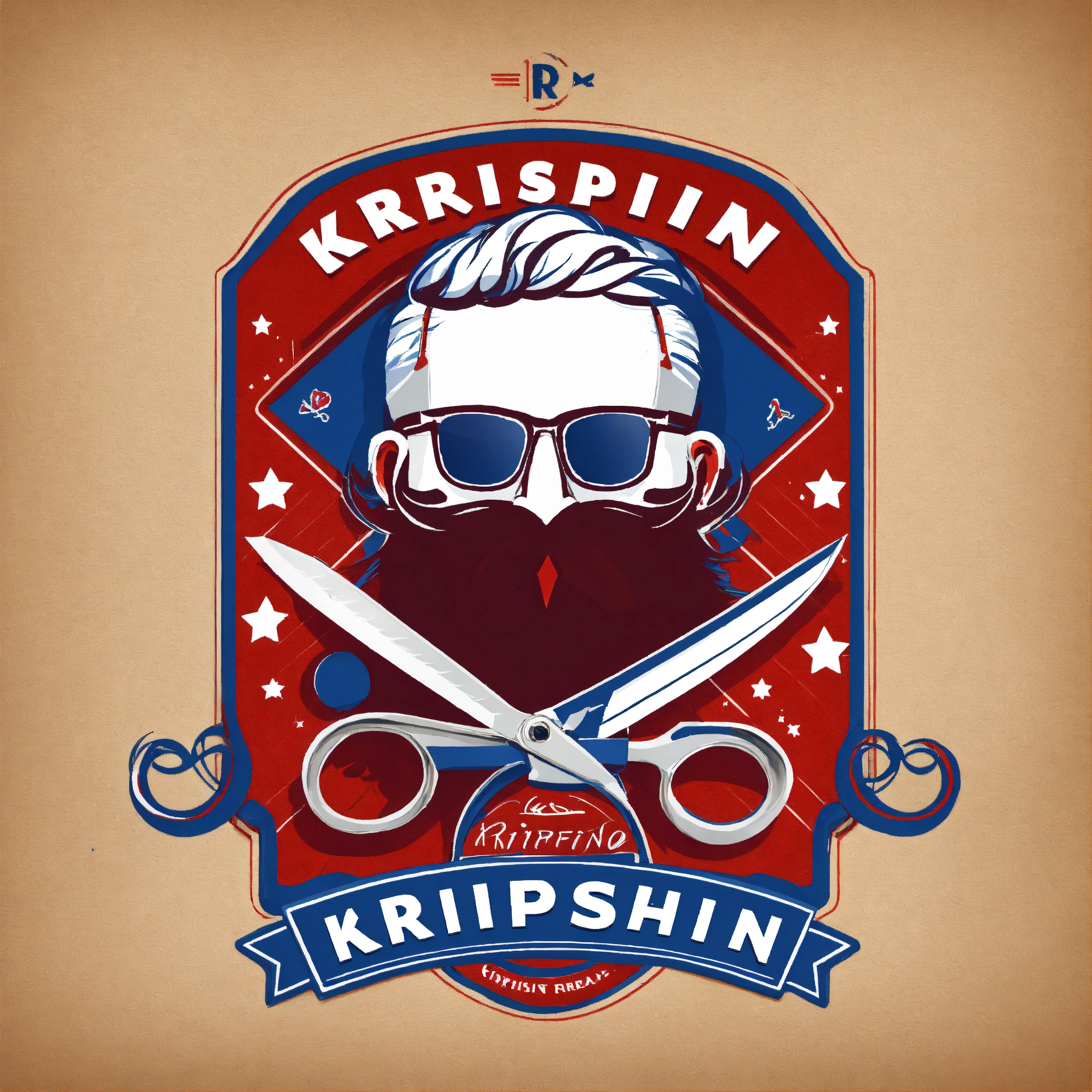 Write word "krispin" "krispin" "krispin" as a logo, headline font, "krispin", white red blue colors, barber shop themed, include scissors, include mustache, only the word "krispin", no other words, 8k, "krispin"