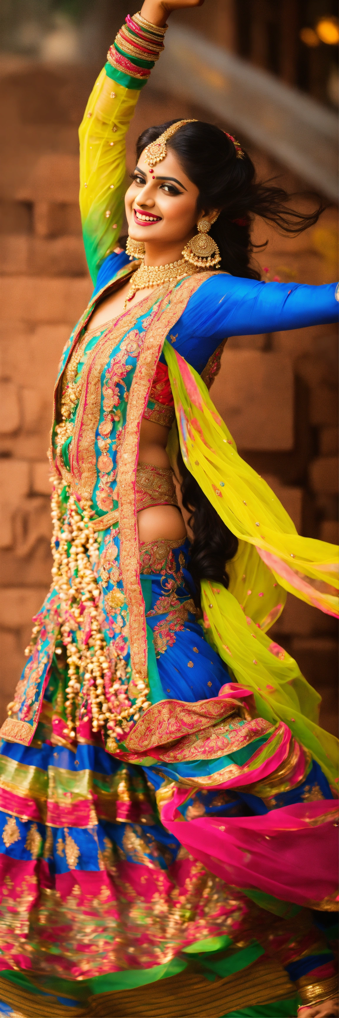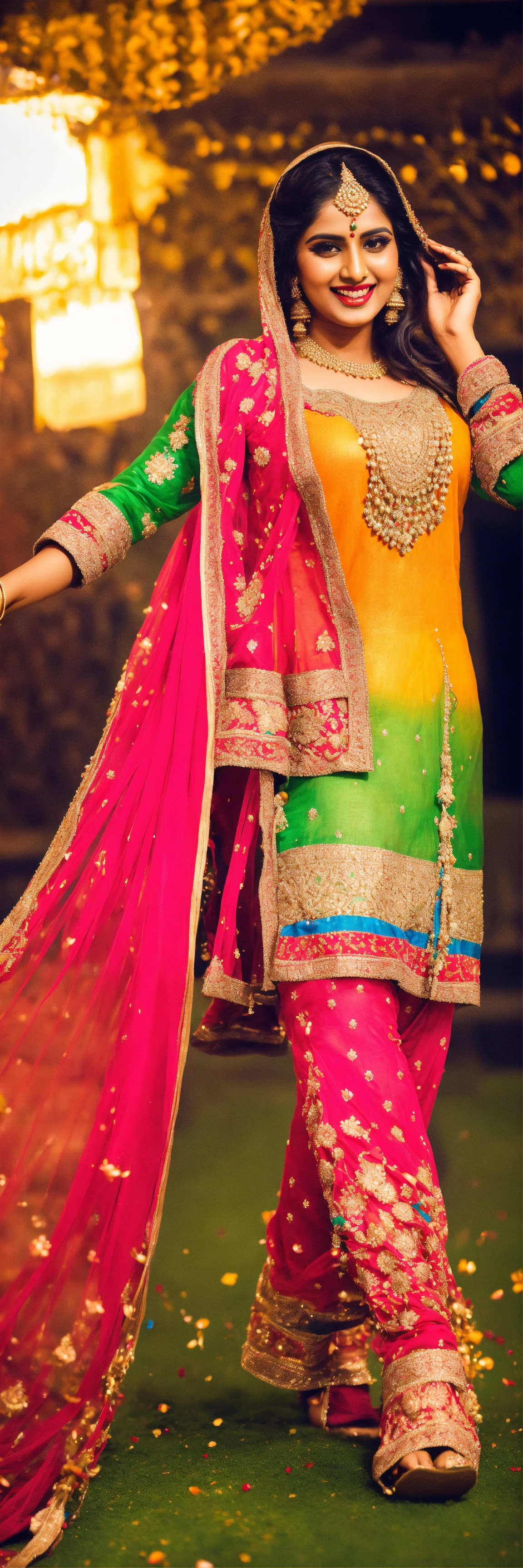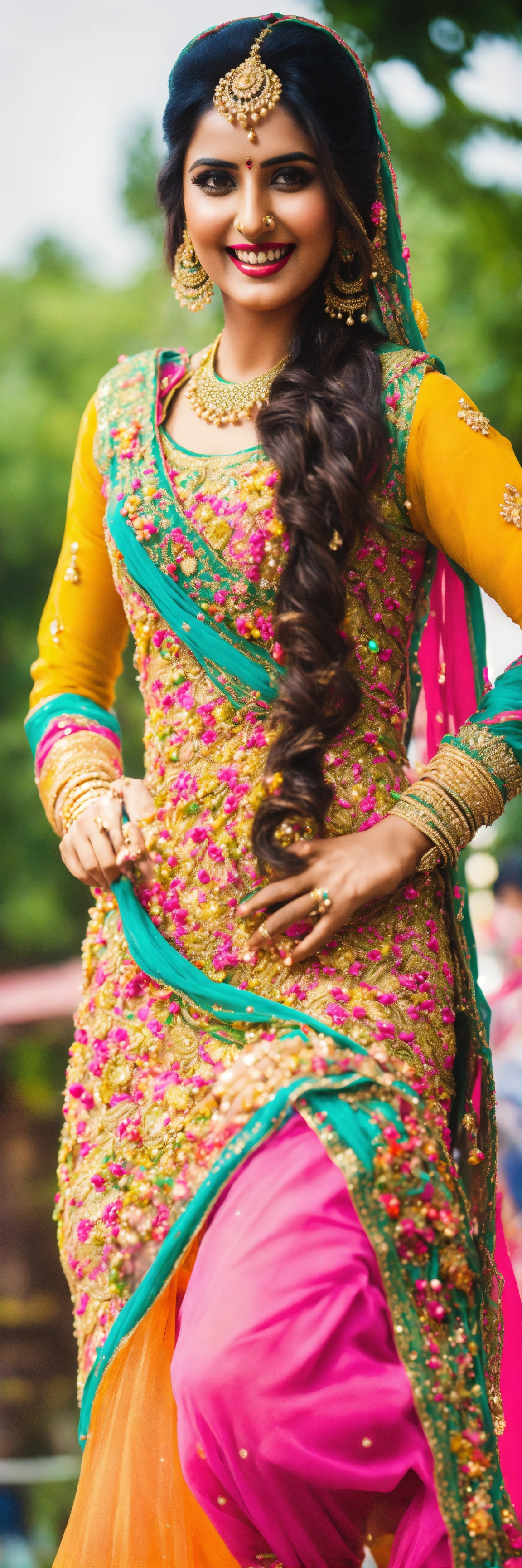 Gorgeous punjabi woman, performing bhangra, wearing multi color salwar suit, full body, bridal jewellery, long hairs, cute smile, shiny eyes, nice shape body