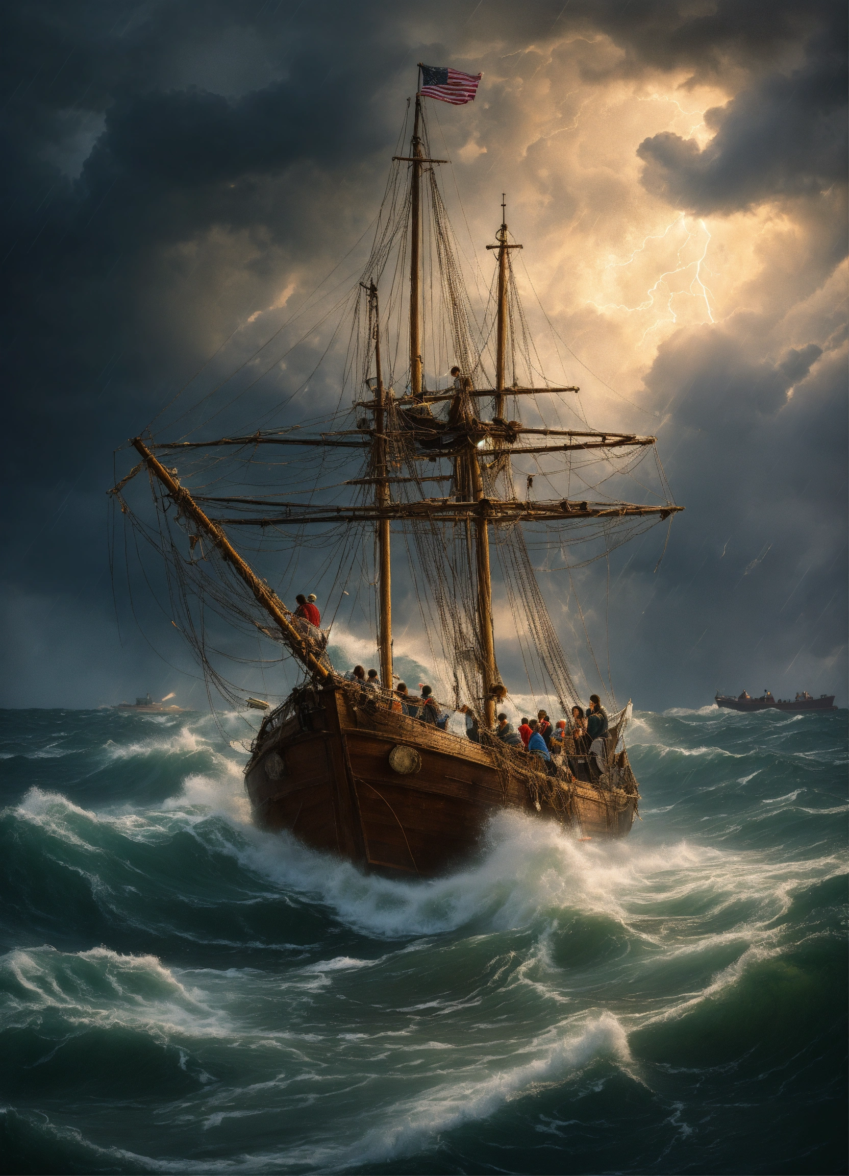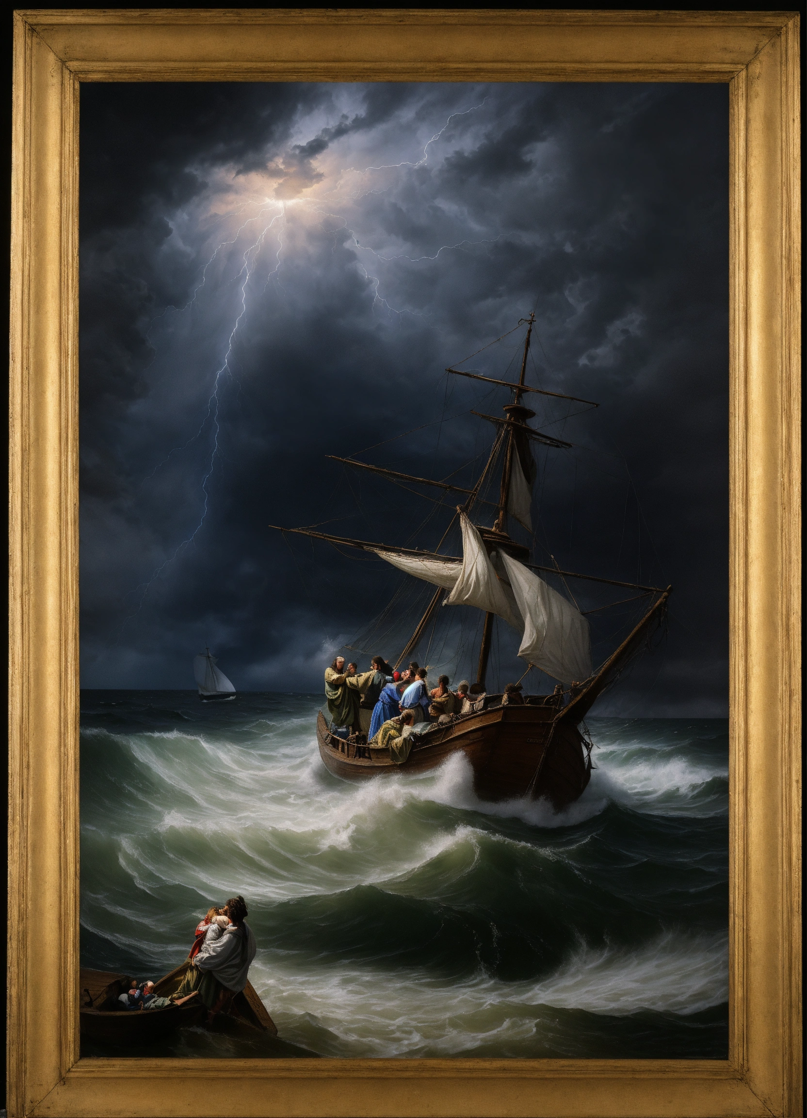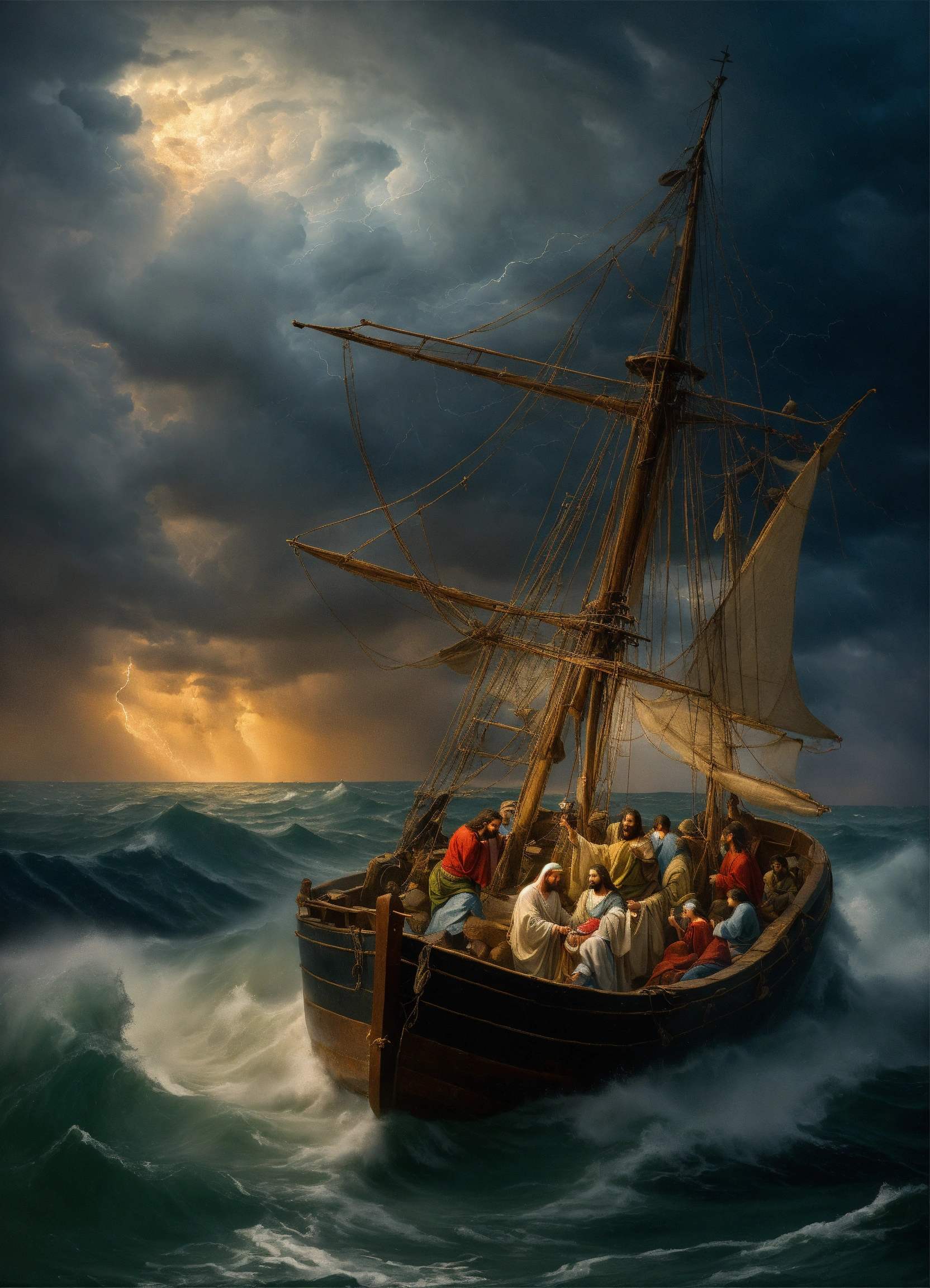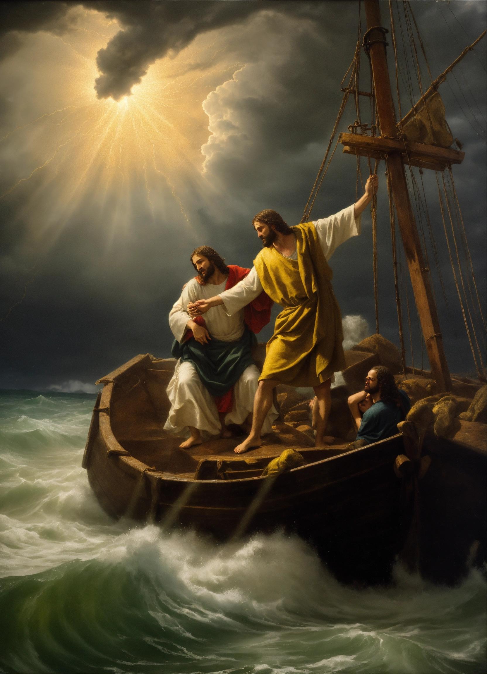Image of a stormy night at sea during a fierce tempest. in the center of the scene, jesus is depicted holding peter by the hands. both figures are illuminated with a soft, divine light, providing a stark contrast to the dark, turbulent waters surrounding them. peter's face reflects a mix of fear and relief, while jesus' expression is one of compassion and assurance. rain pours down, but their connection remains steady, emphasizing the powerful moment of rescue and faith amidst the storm.