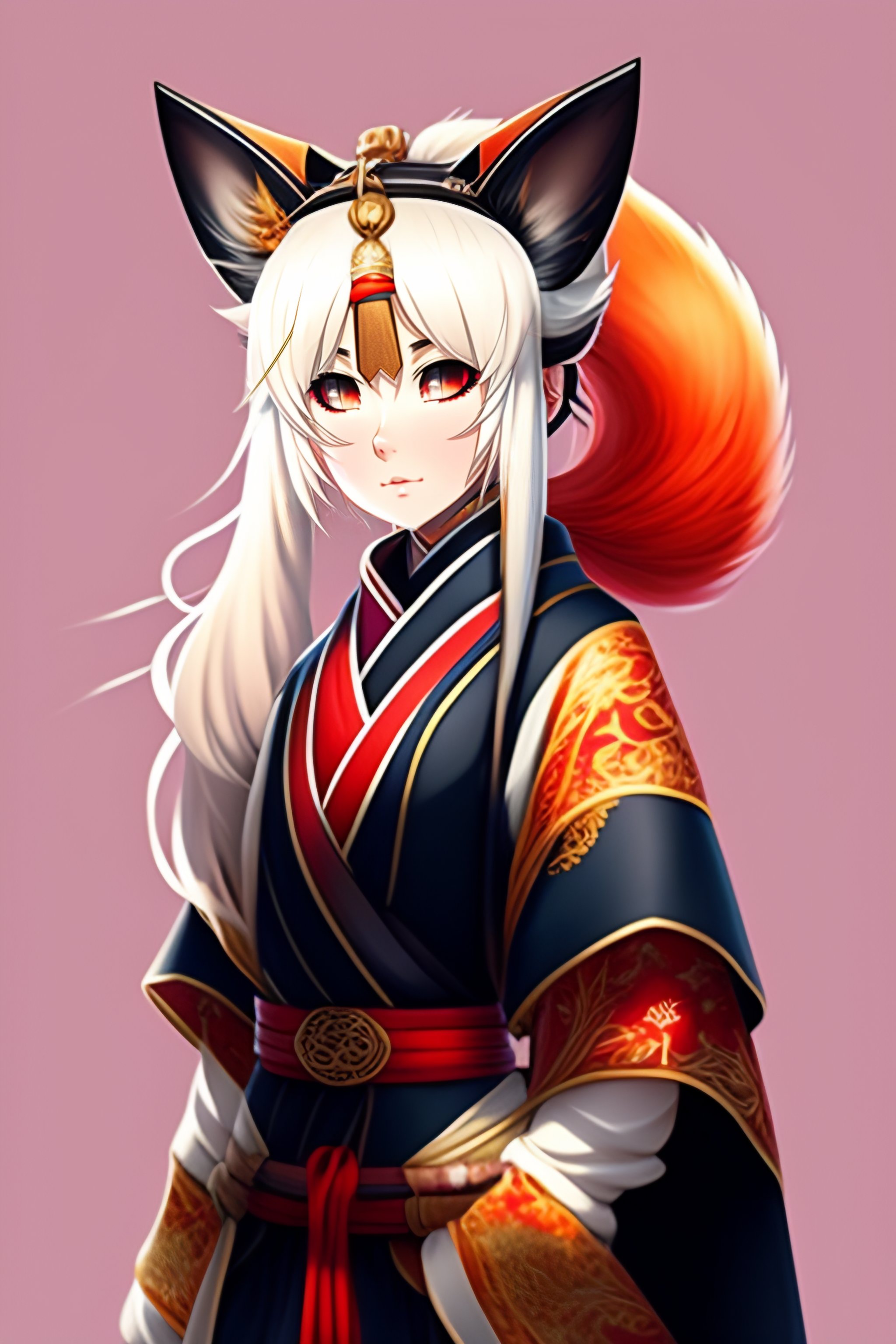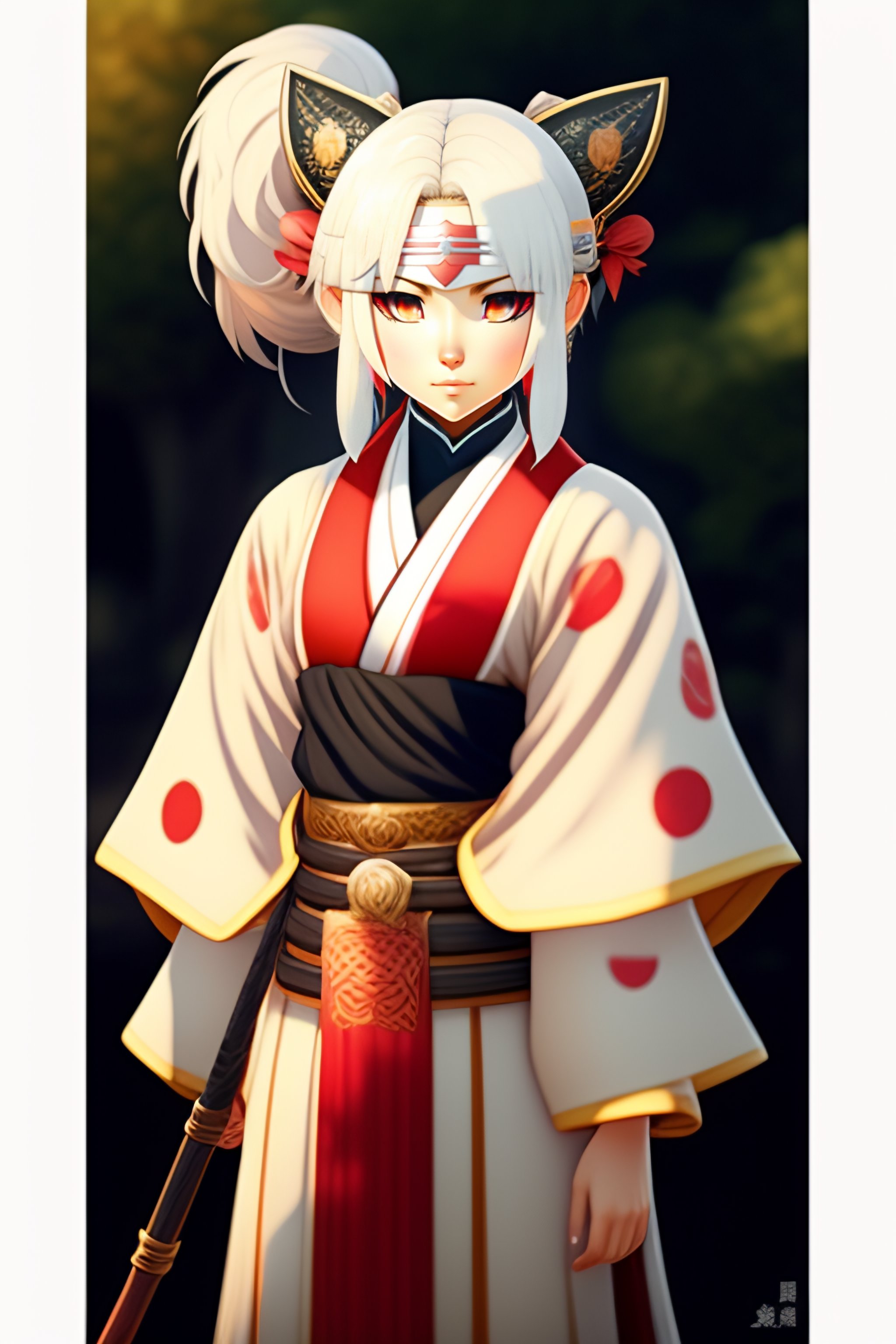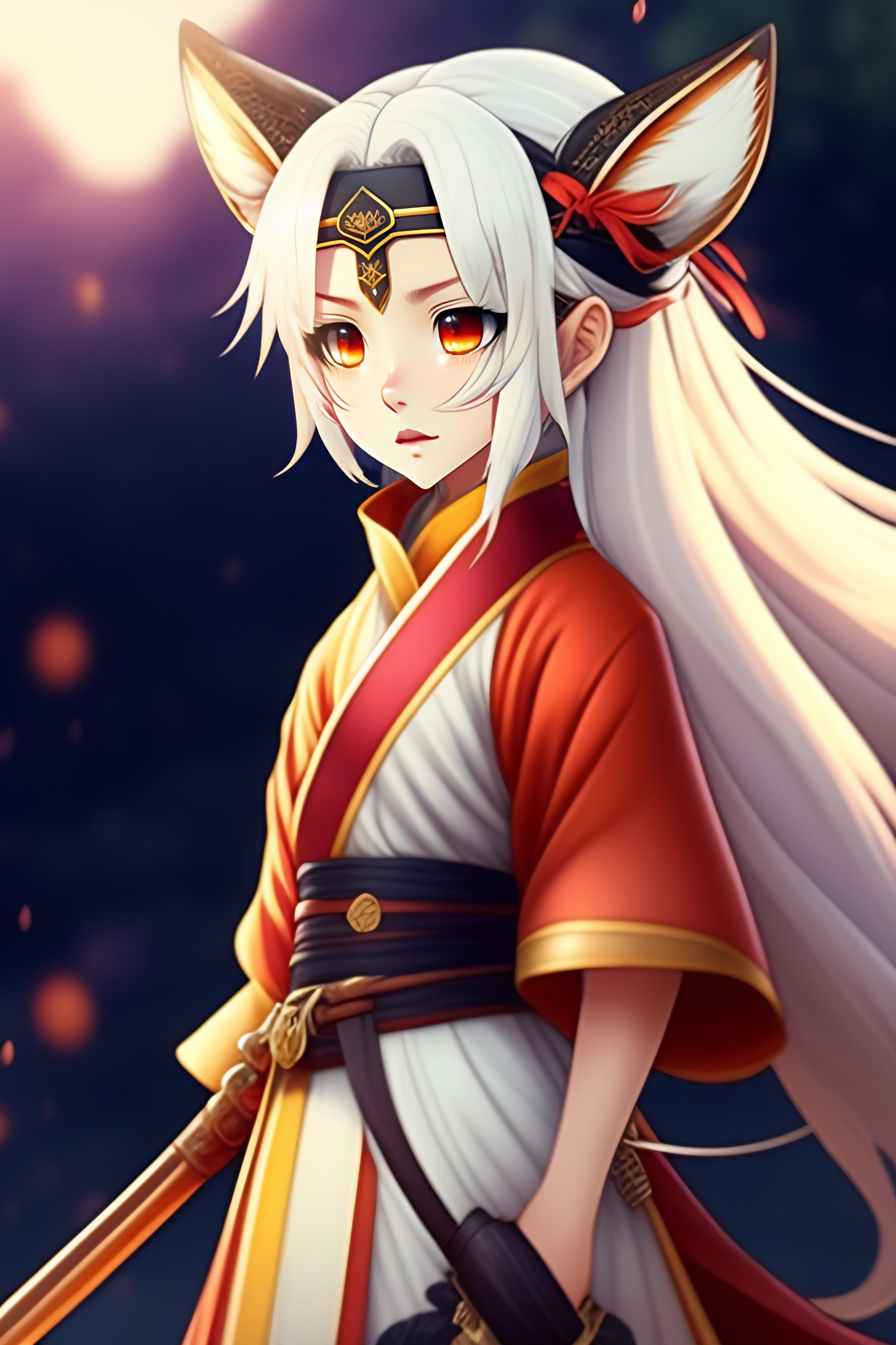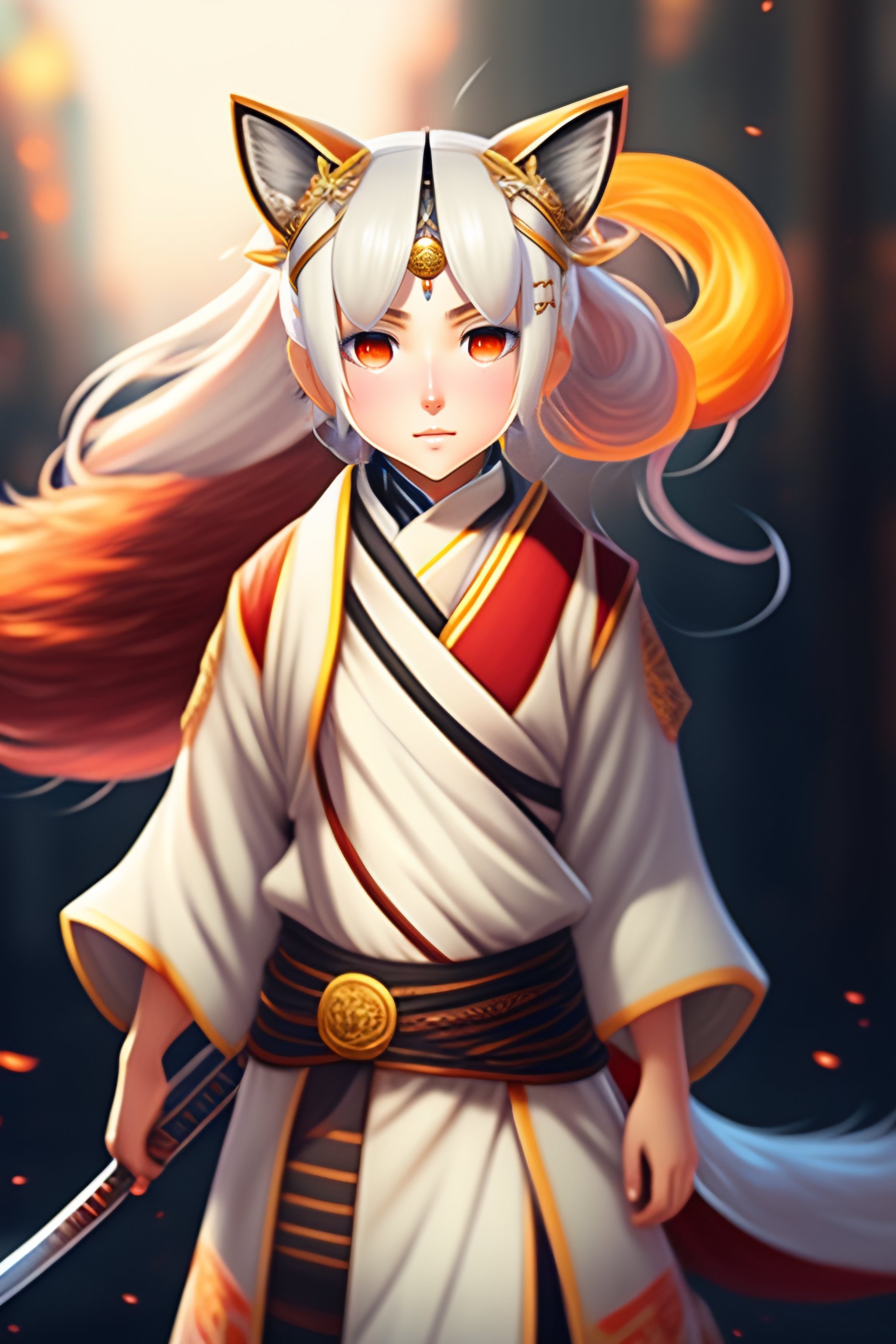 Girl has two fox tails with white hair wearing a blindfold that hides her eyes, dressed in a kimono, a katana on her belt, manga style