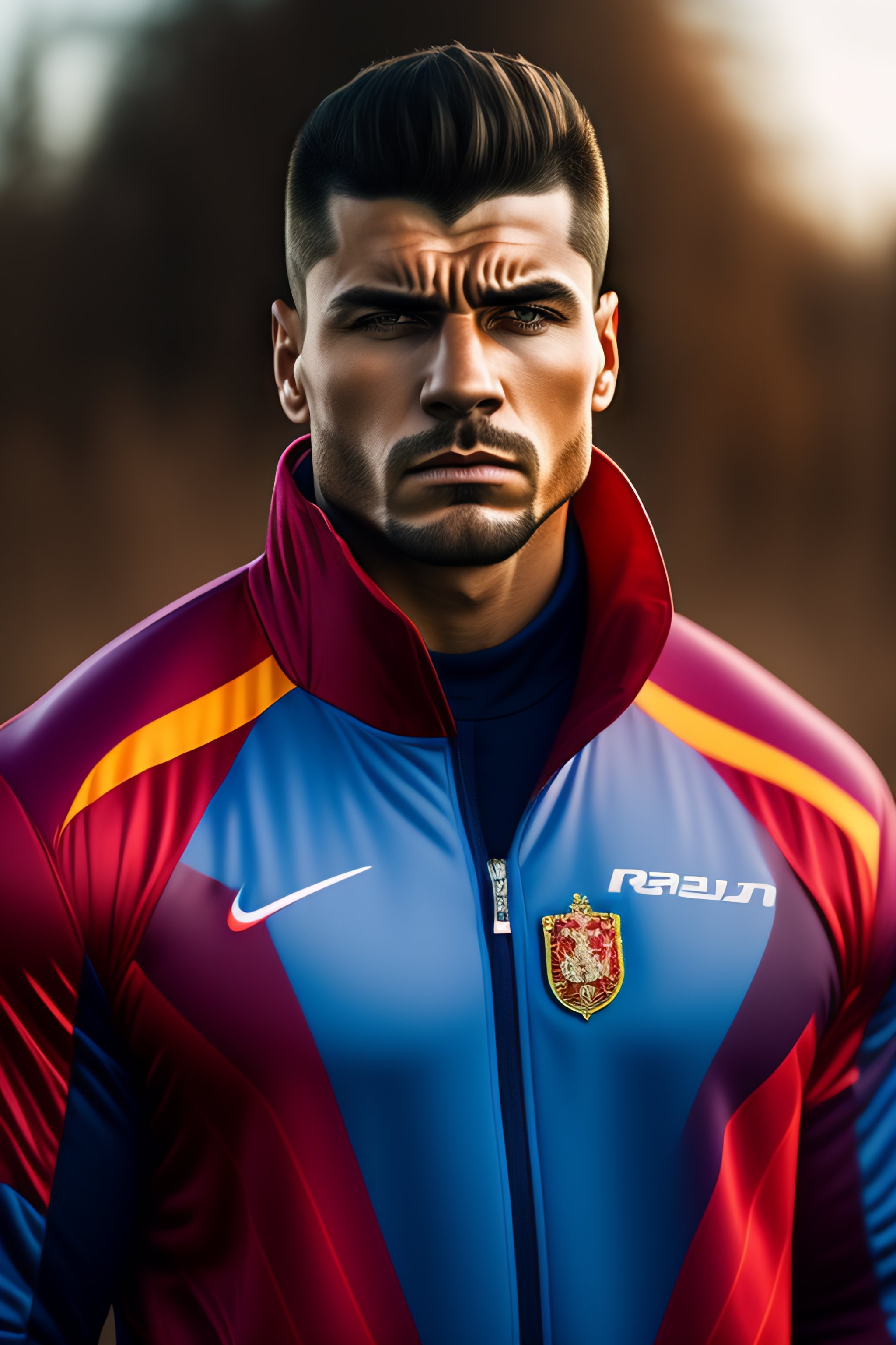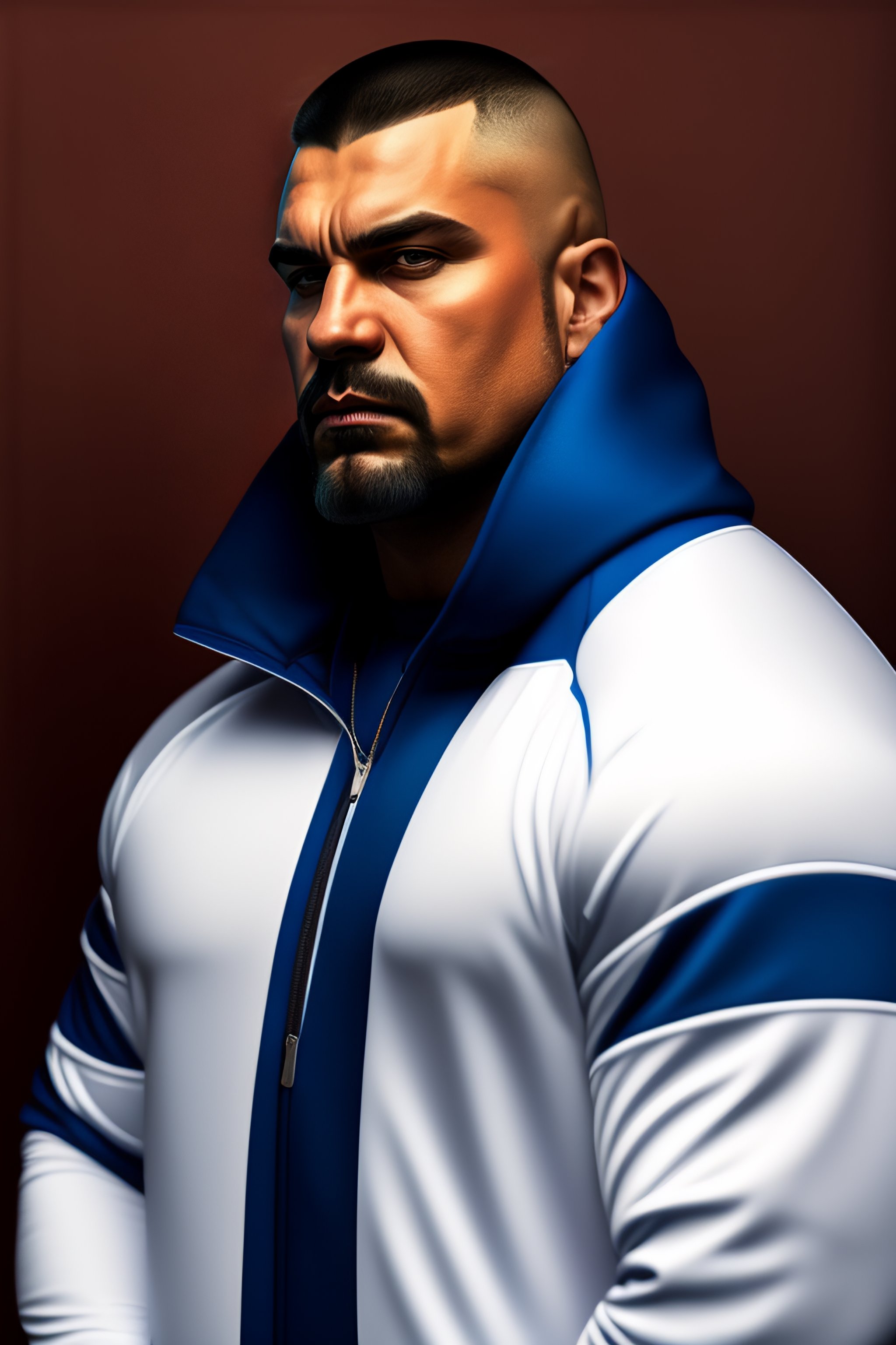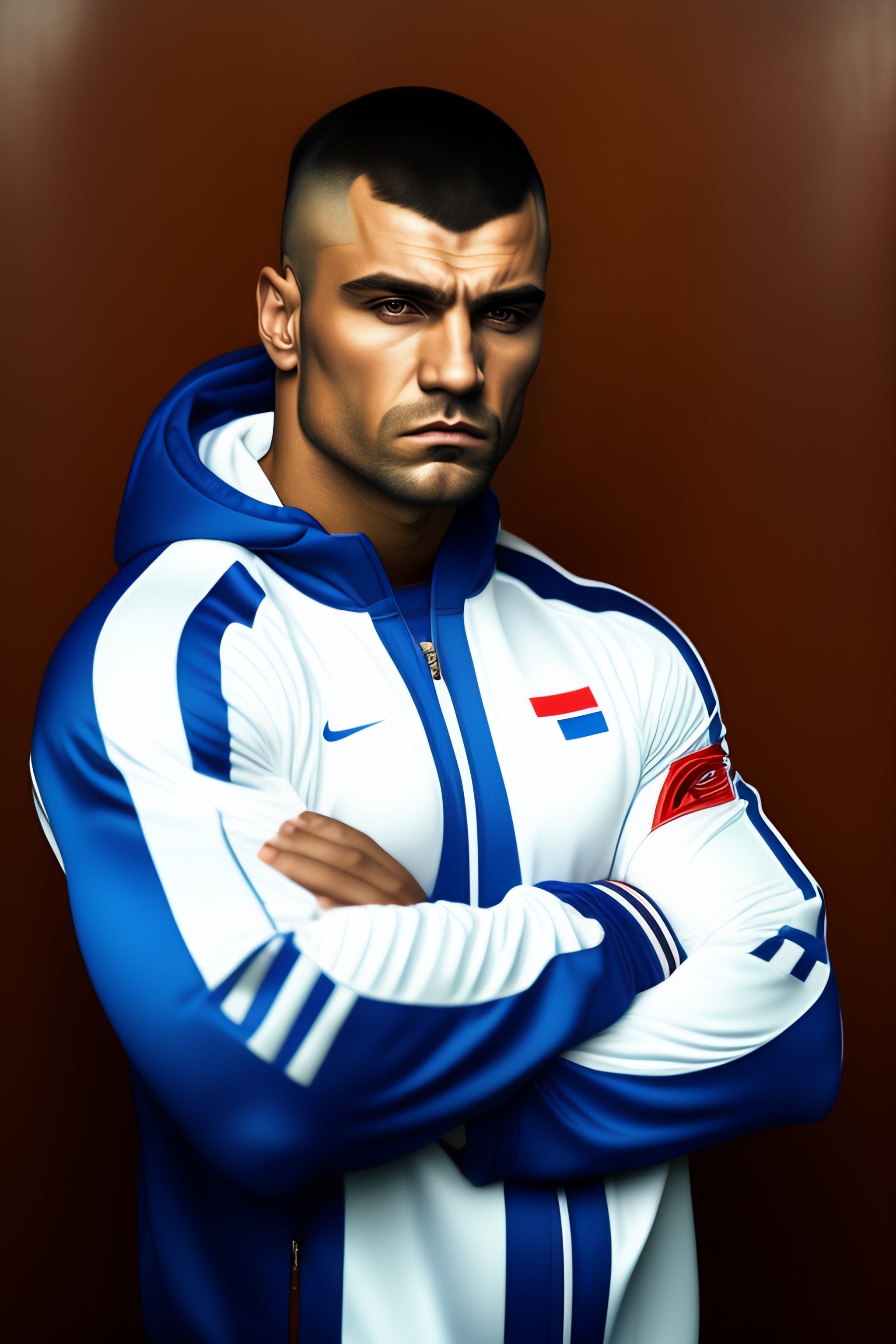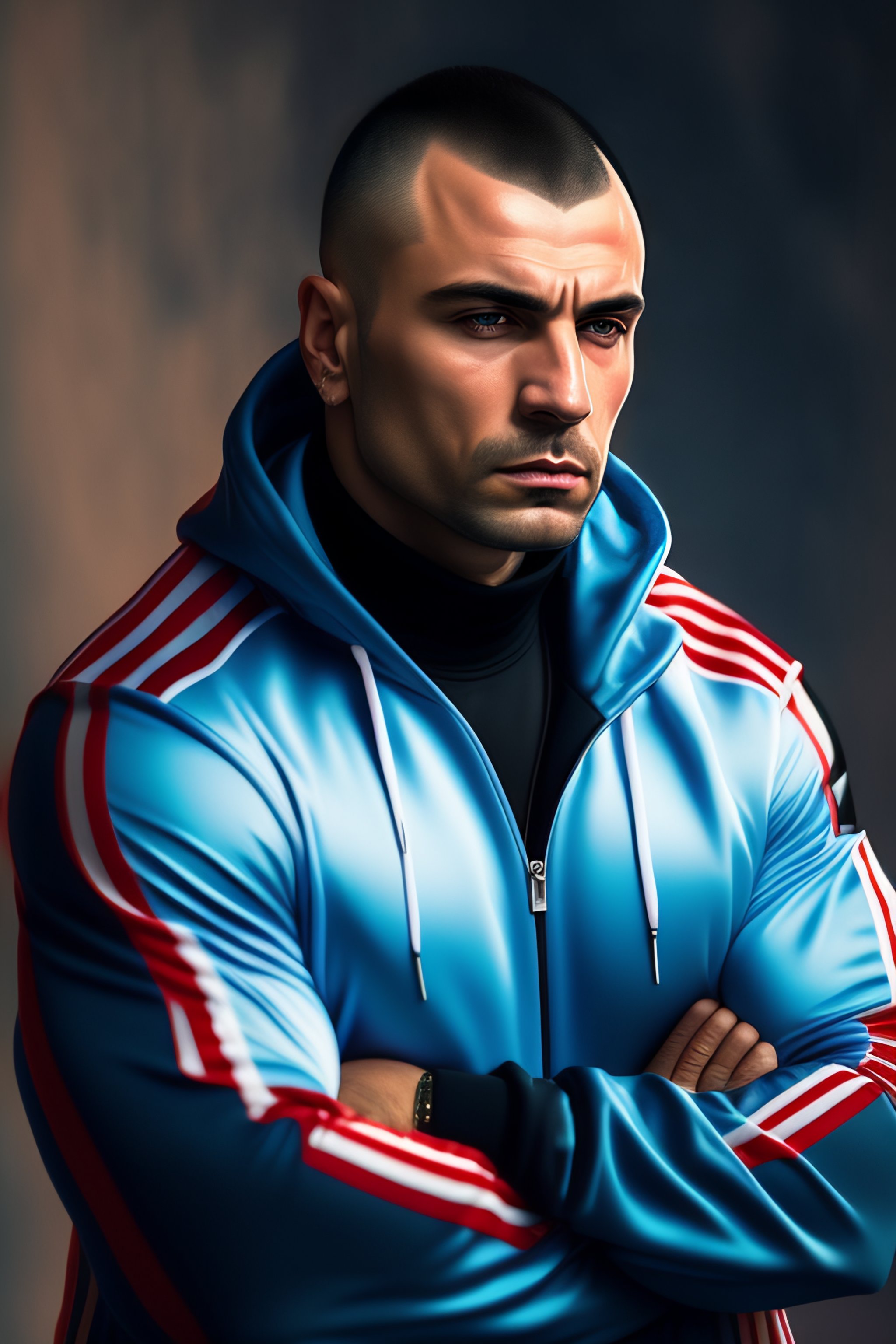 Portrait of a russian mafia guy in a tracksuit grumpy and dumb