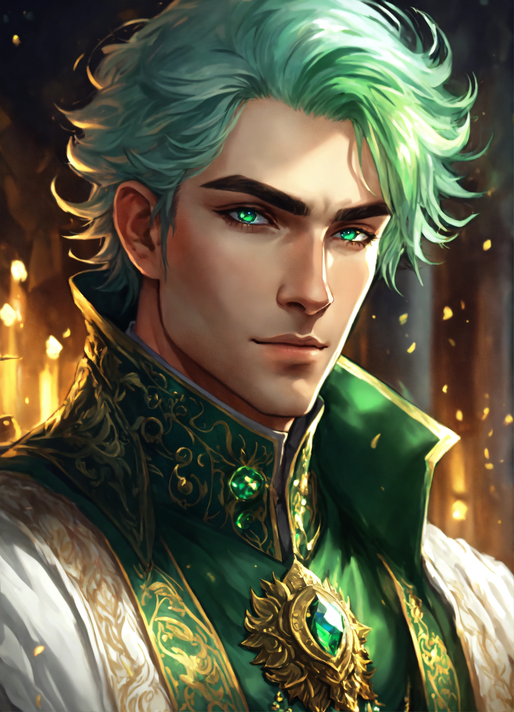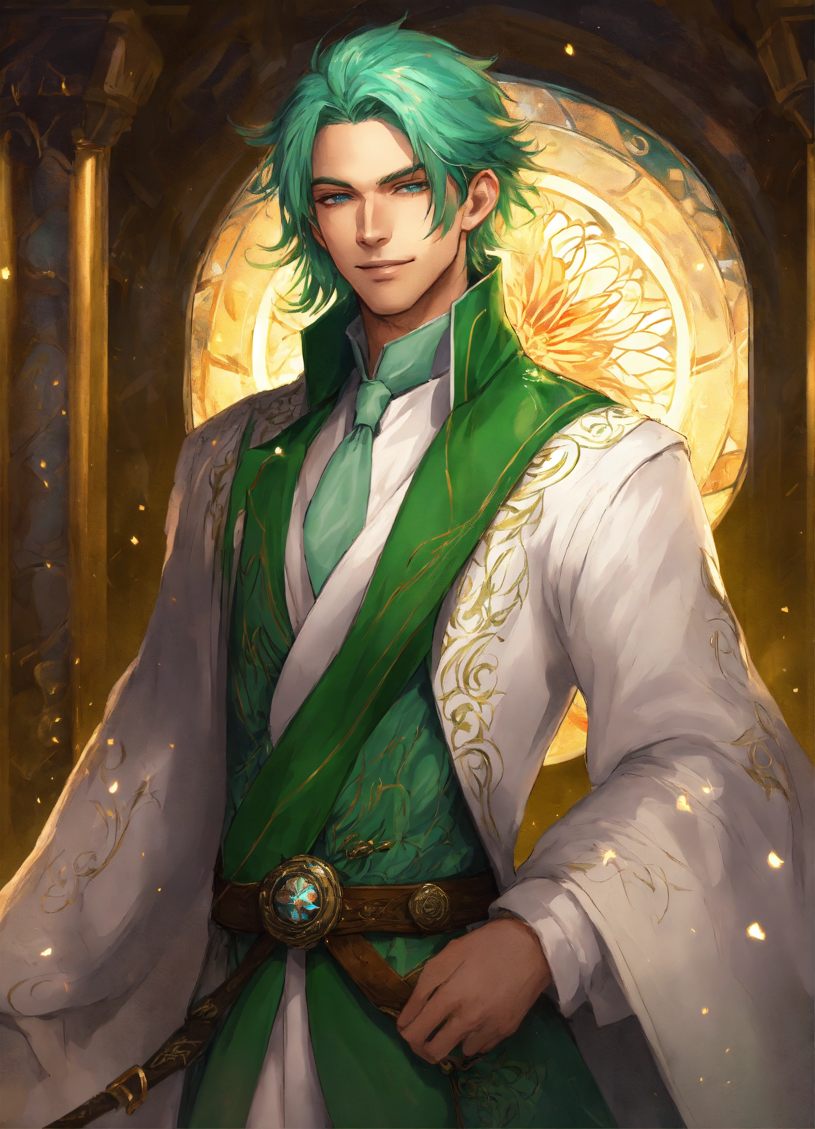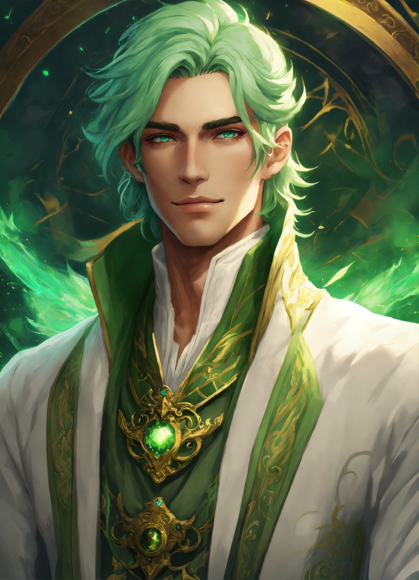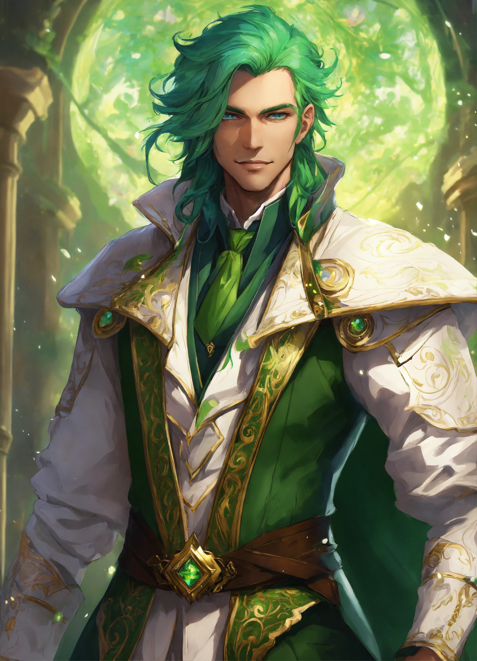Confident male wind mage, green hair, nobleman, smirk, white long coat, magic, intricately detailed eyes, fantasy art
