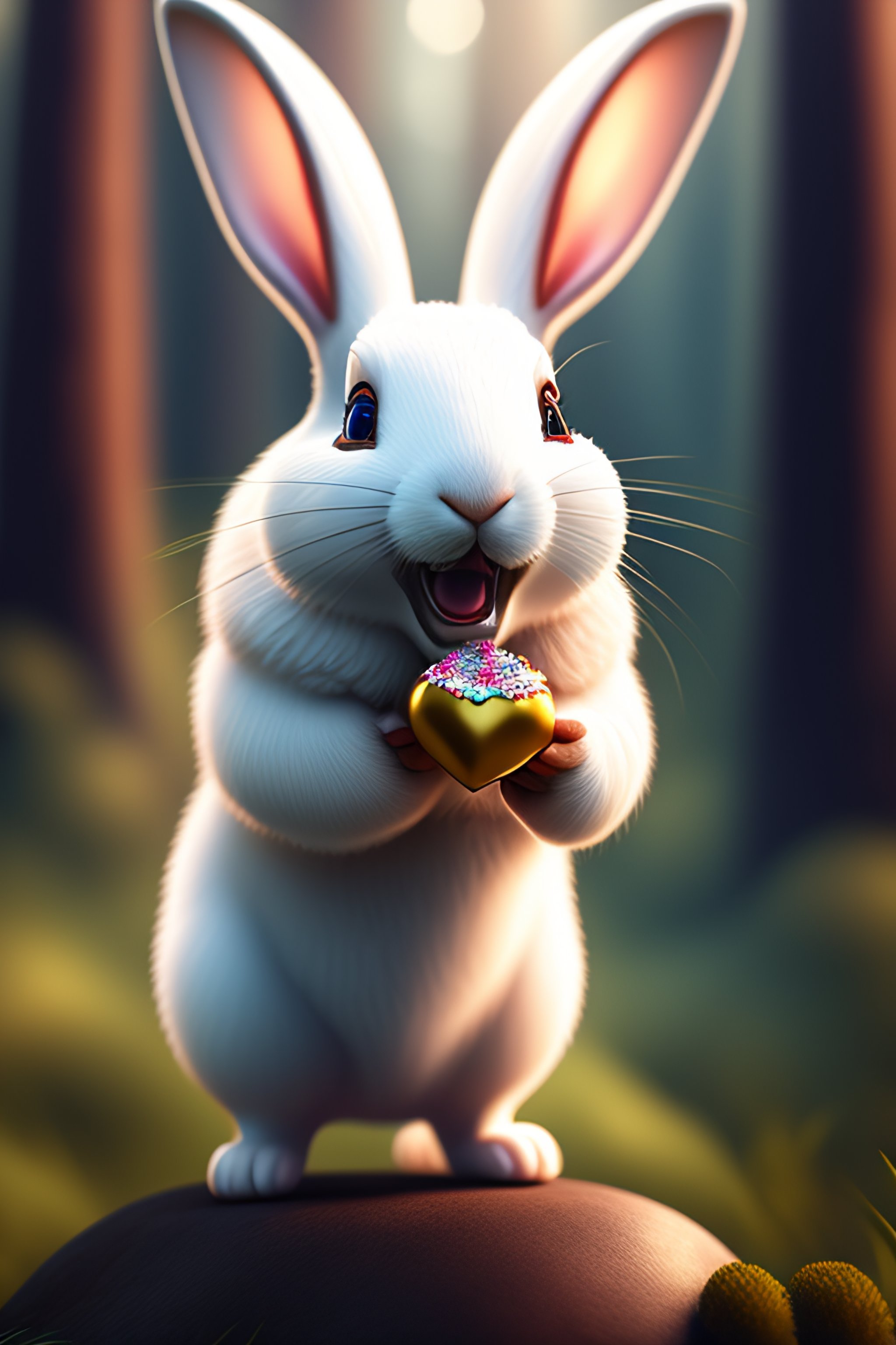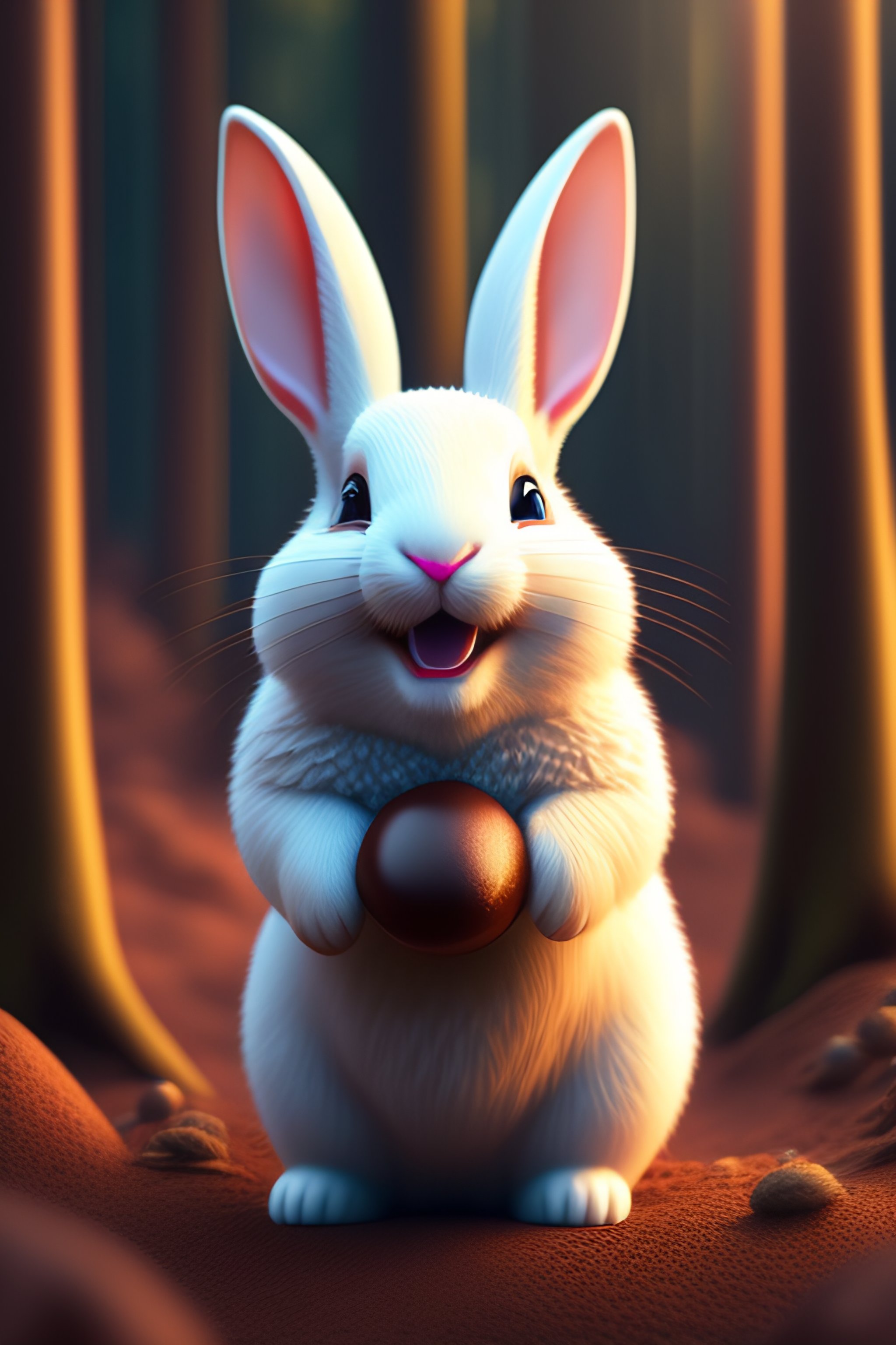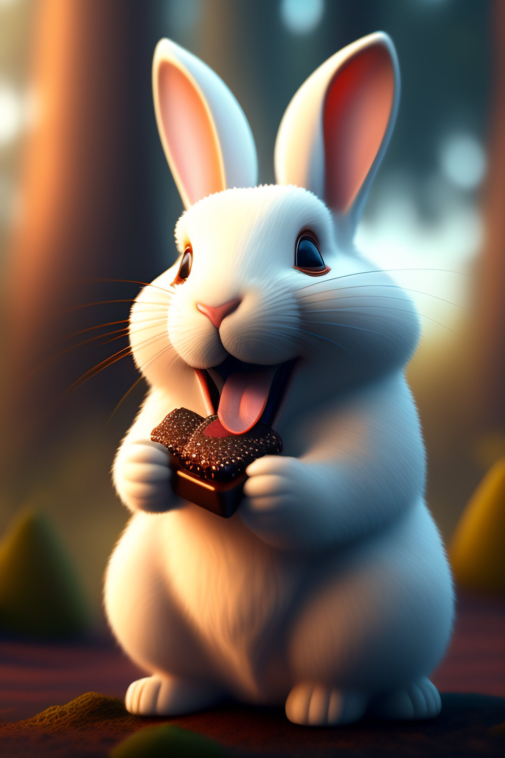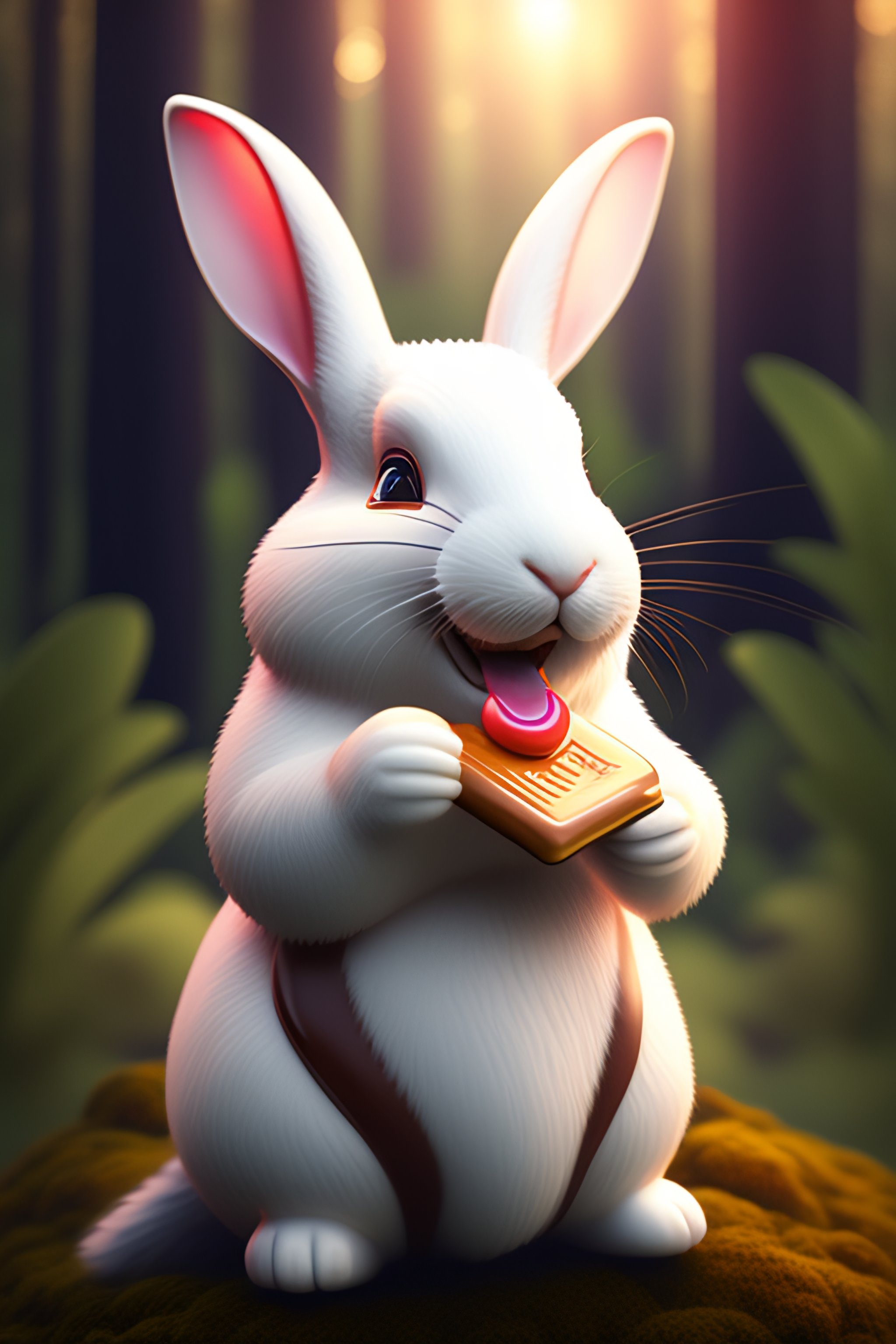 3d white rabbit, character, smiling, open mouth, big teeth, cgi, holding chocolate, forest scenary, hyperrealistic, ultrarealistic, details, 8k