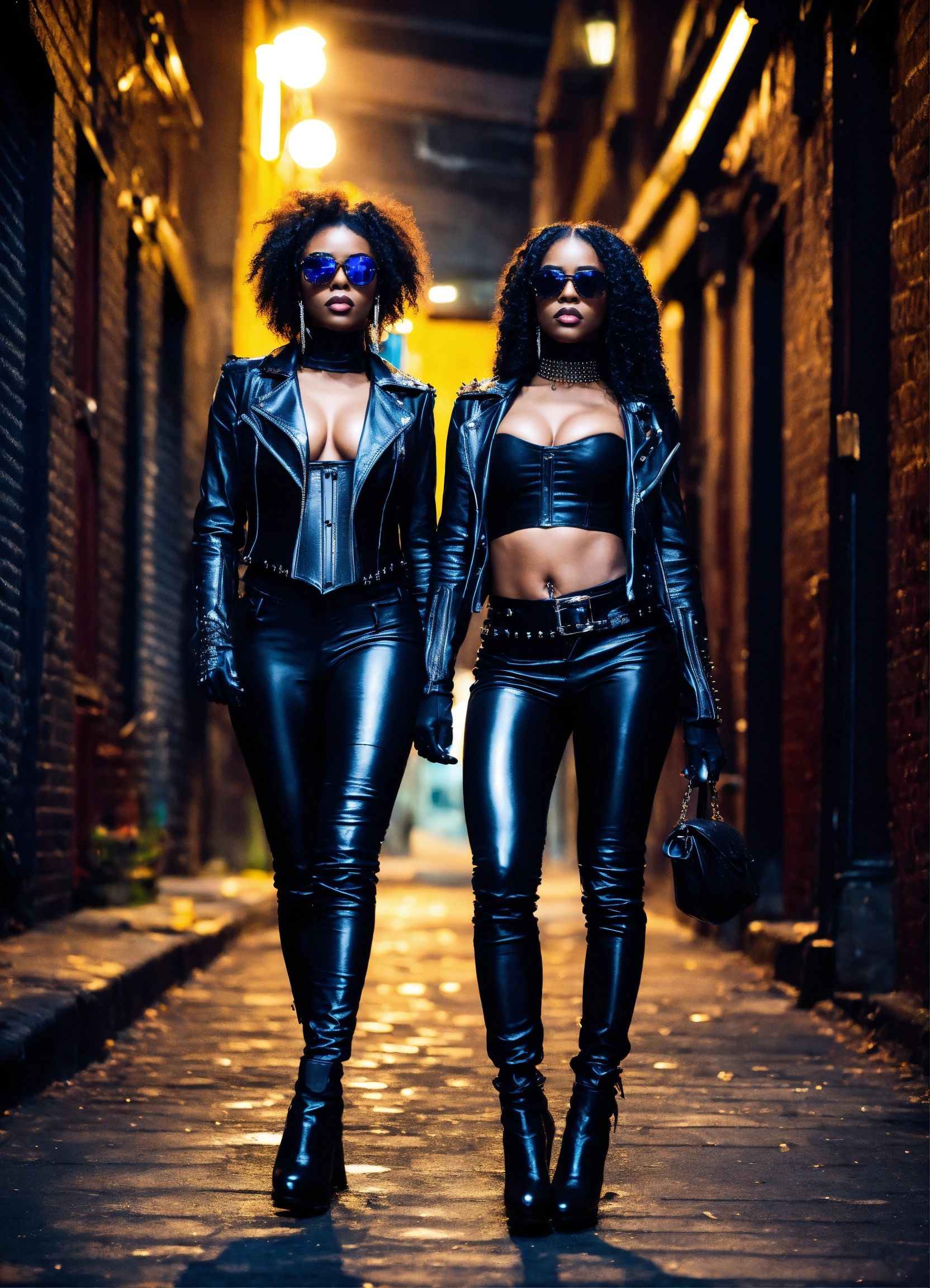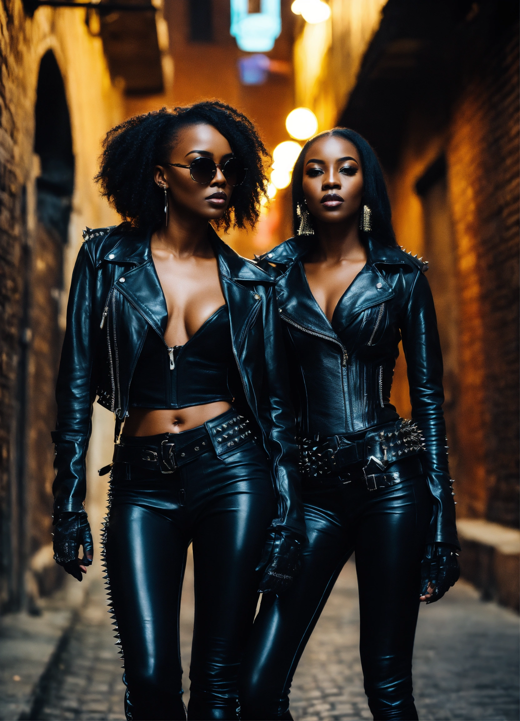Two stunning young african gothic women walking down a dark alley wearing a black leather corset and black leather pants black leather jackets gloves spikes sunglasses, hyper-realistic, photographic portrait at night