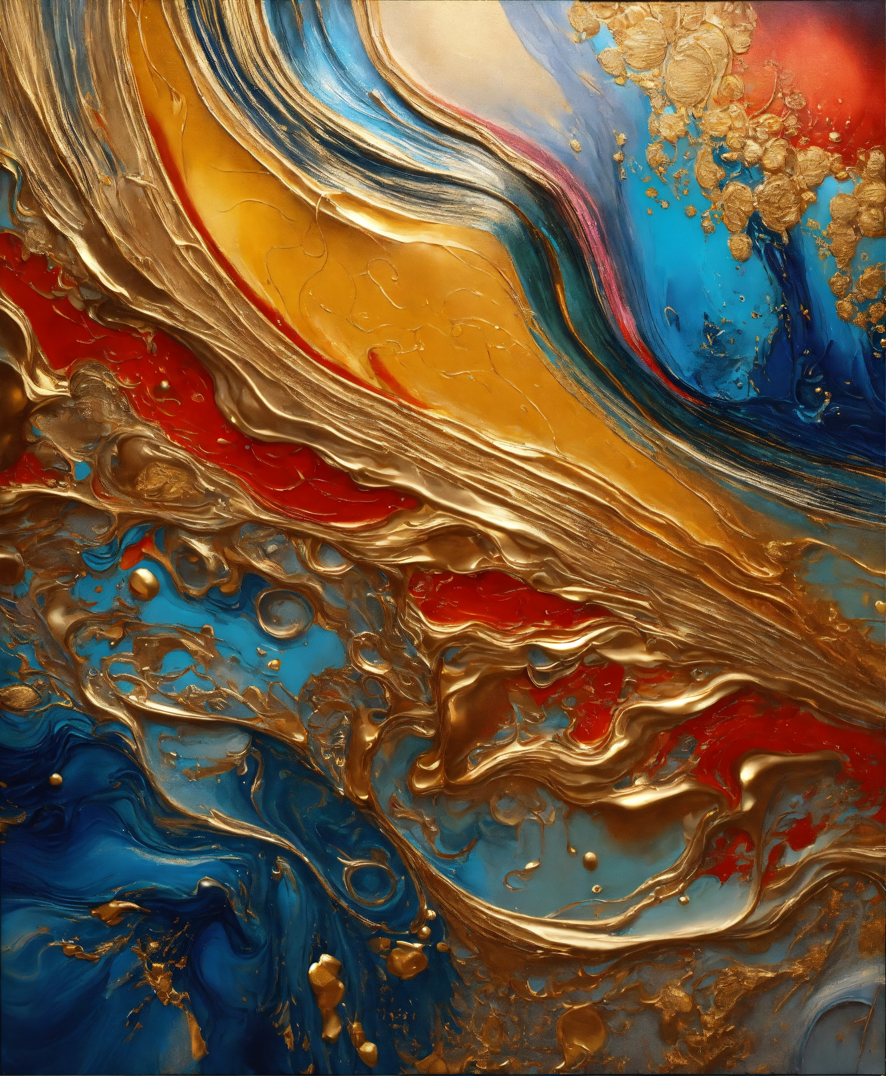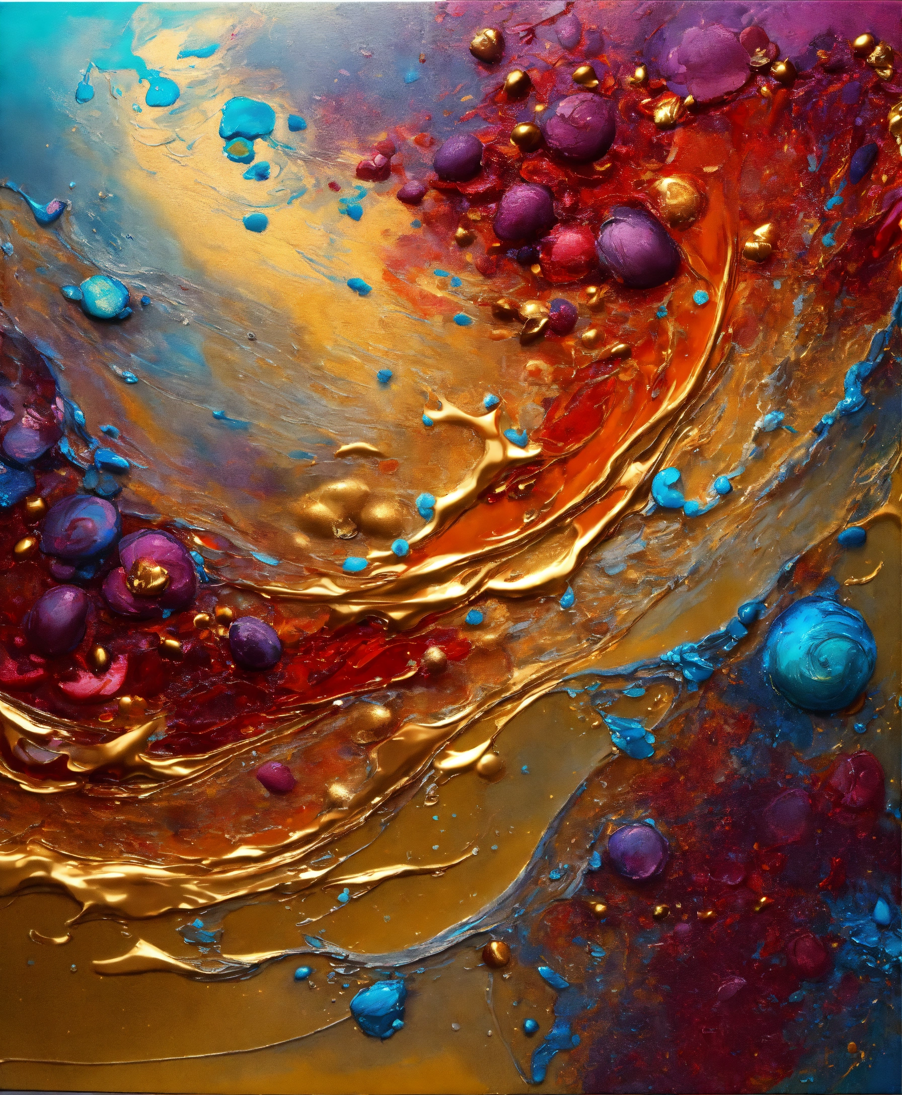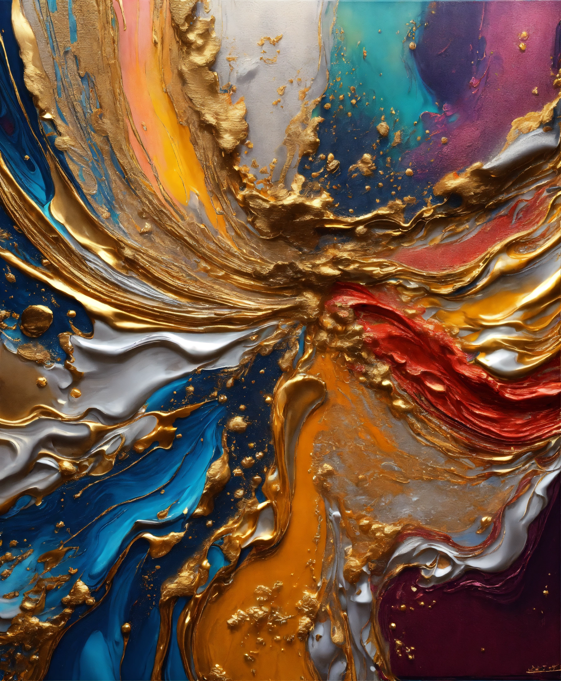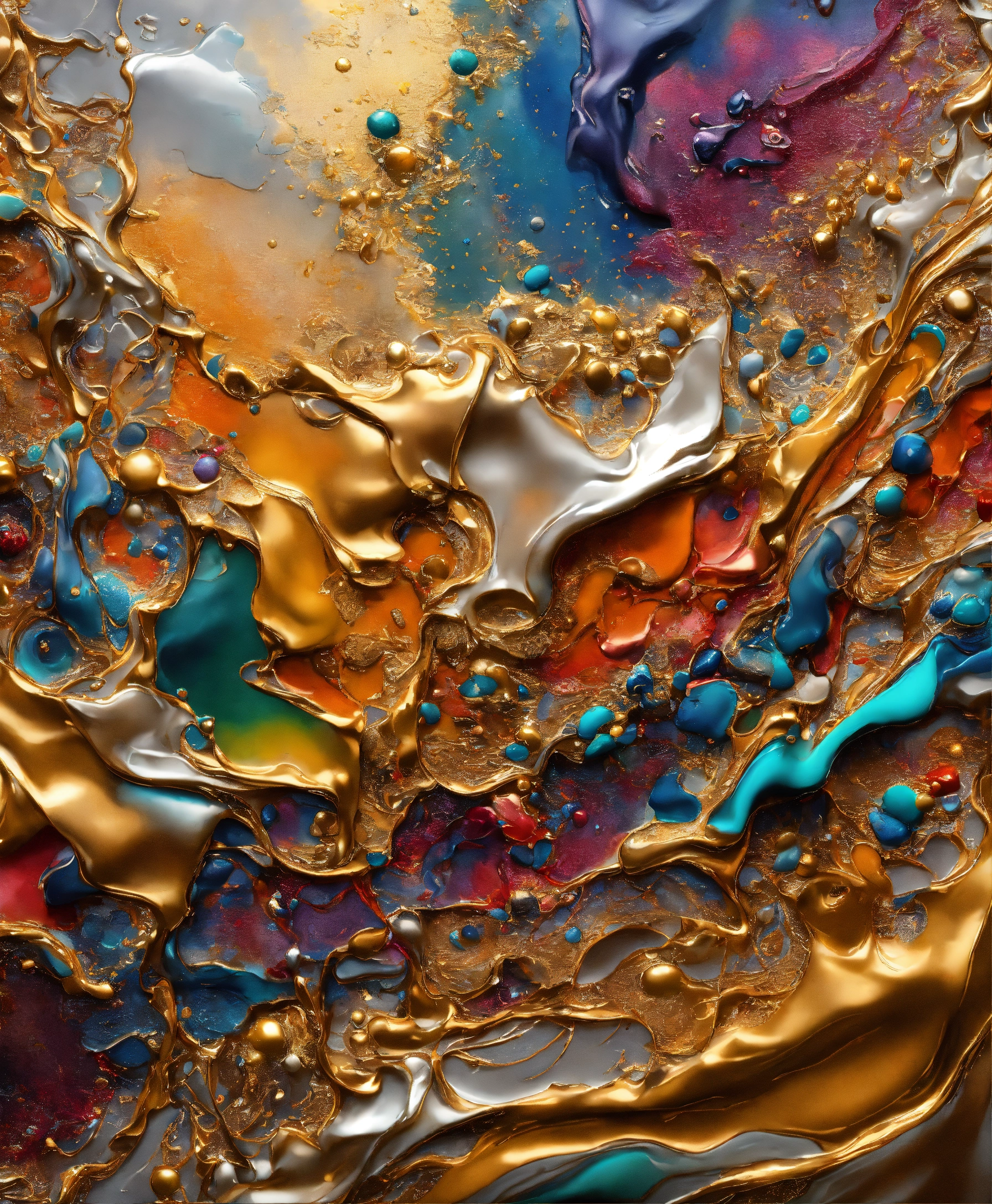 Colorful abstract painting oil and water complex complicated bright vivid colors beautiful opulent wealthy intricate all hues sublime delicate hyperdetailed masterpiece metallic sheen awesome 24k gold and silver trim 8k