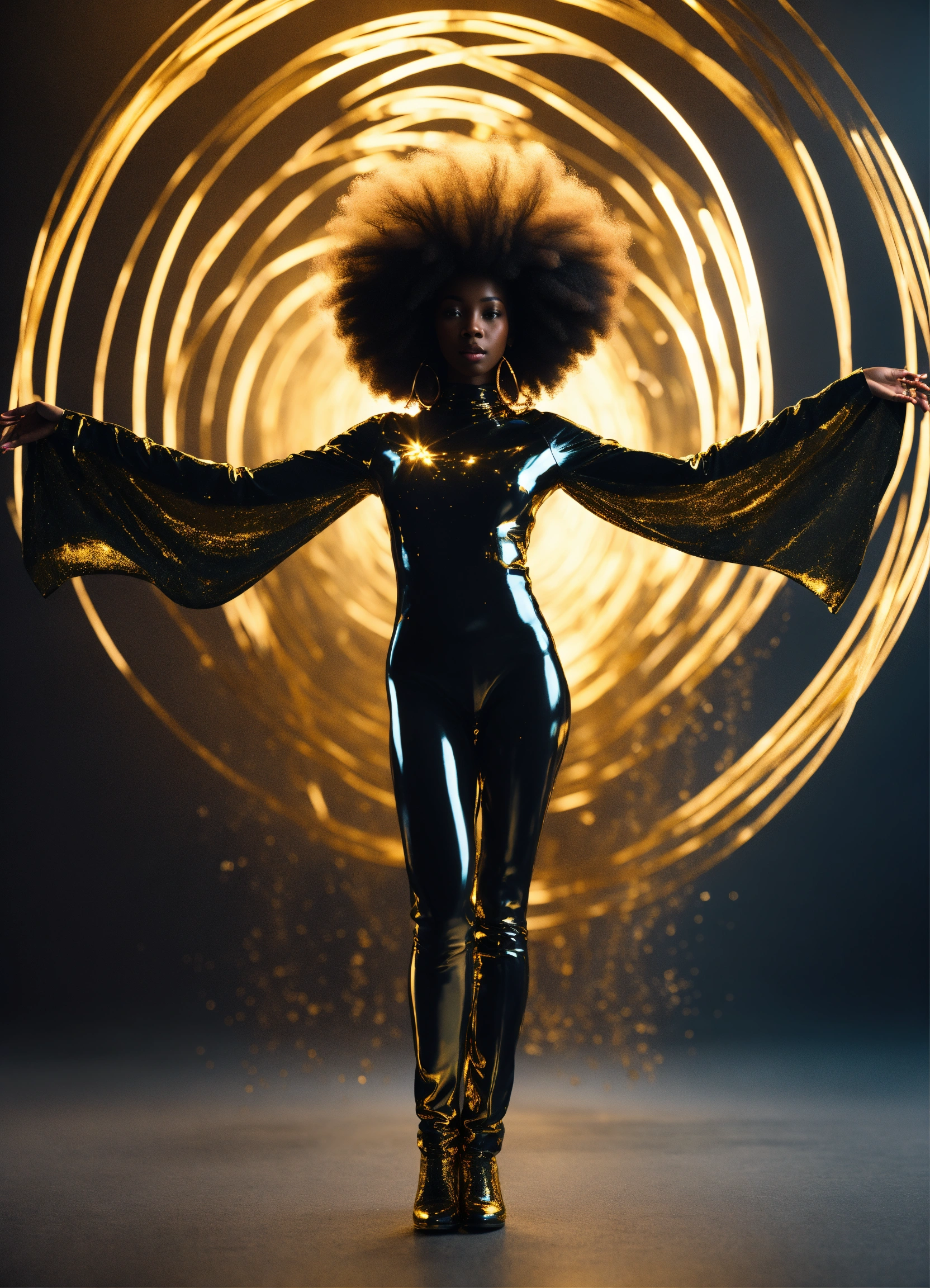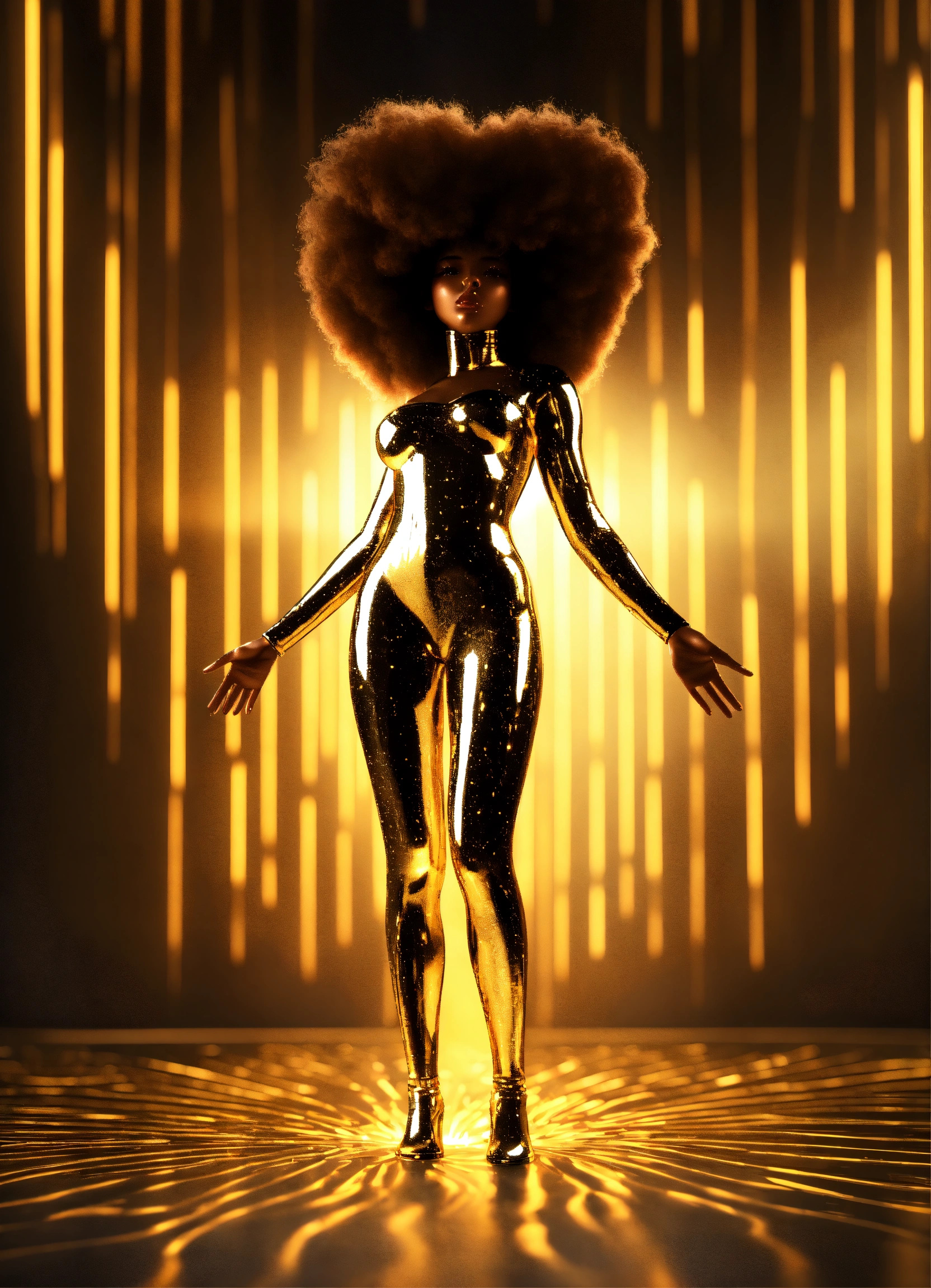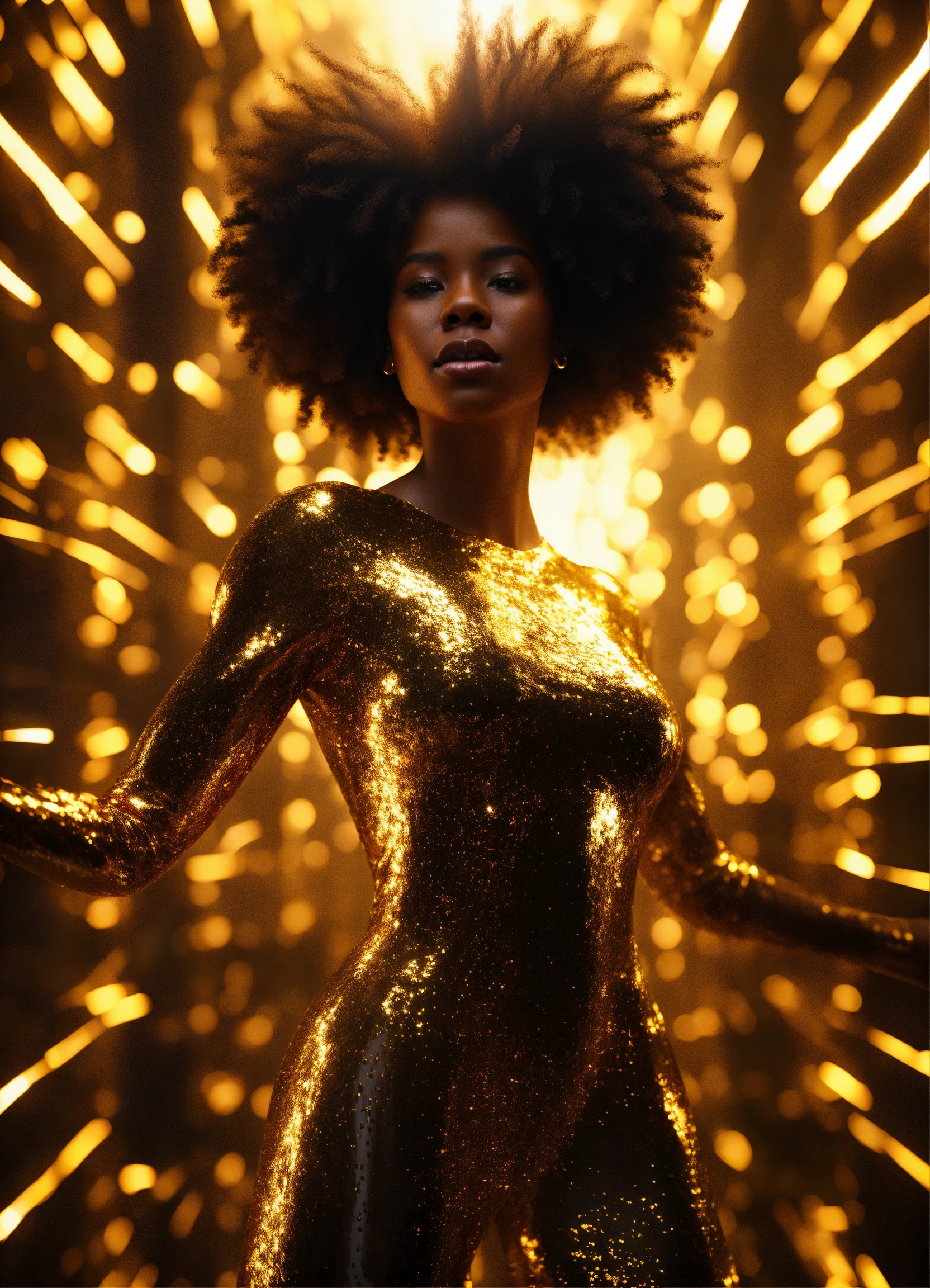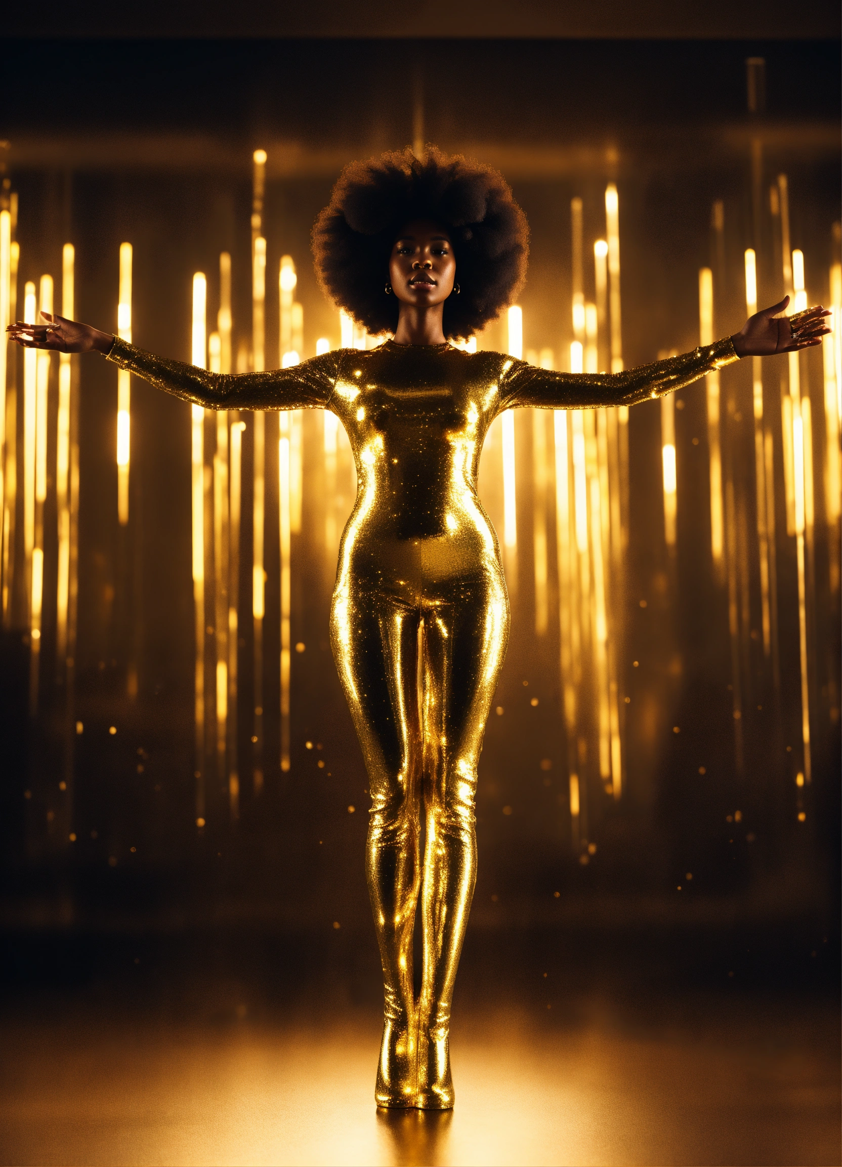 3d render of black woman with afro made entirely of glass, full body, standing, arms outstretched in welcoming, looking directly into camera, liquid gold flows through her, illuminating her form from within. taken on medium format camera, ambient lighting, zeiss distagon t* 50mm lens.