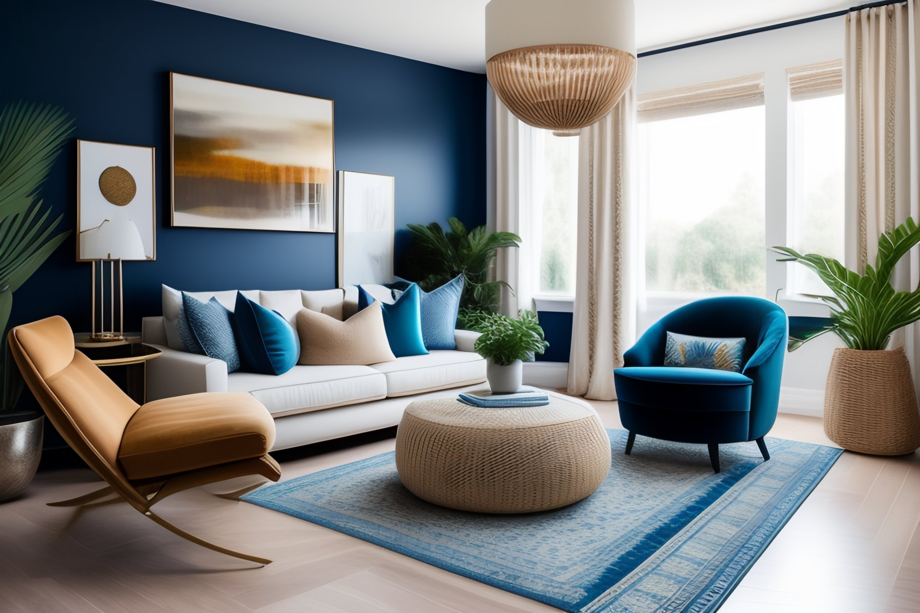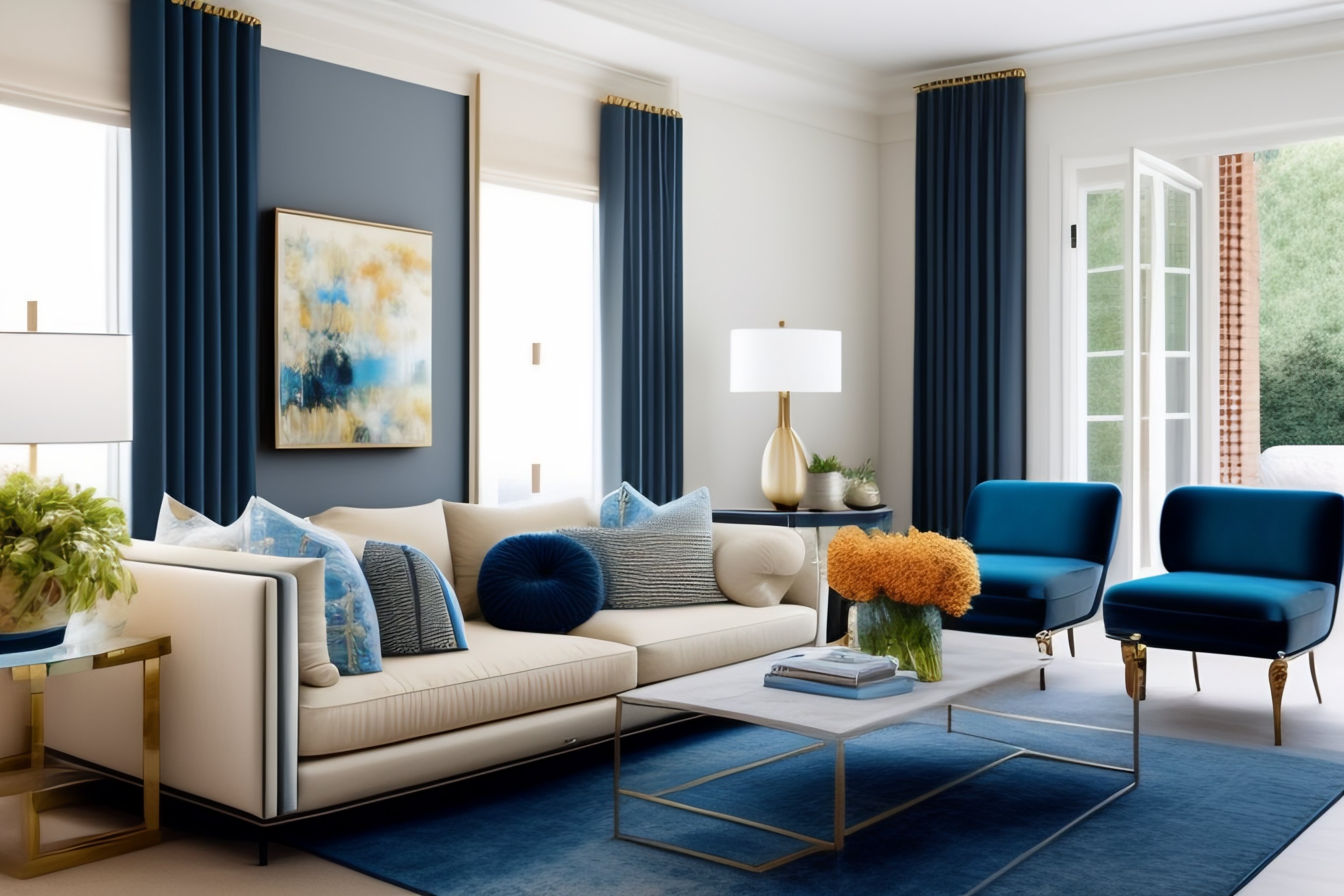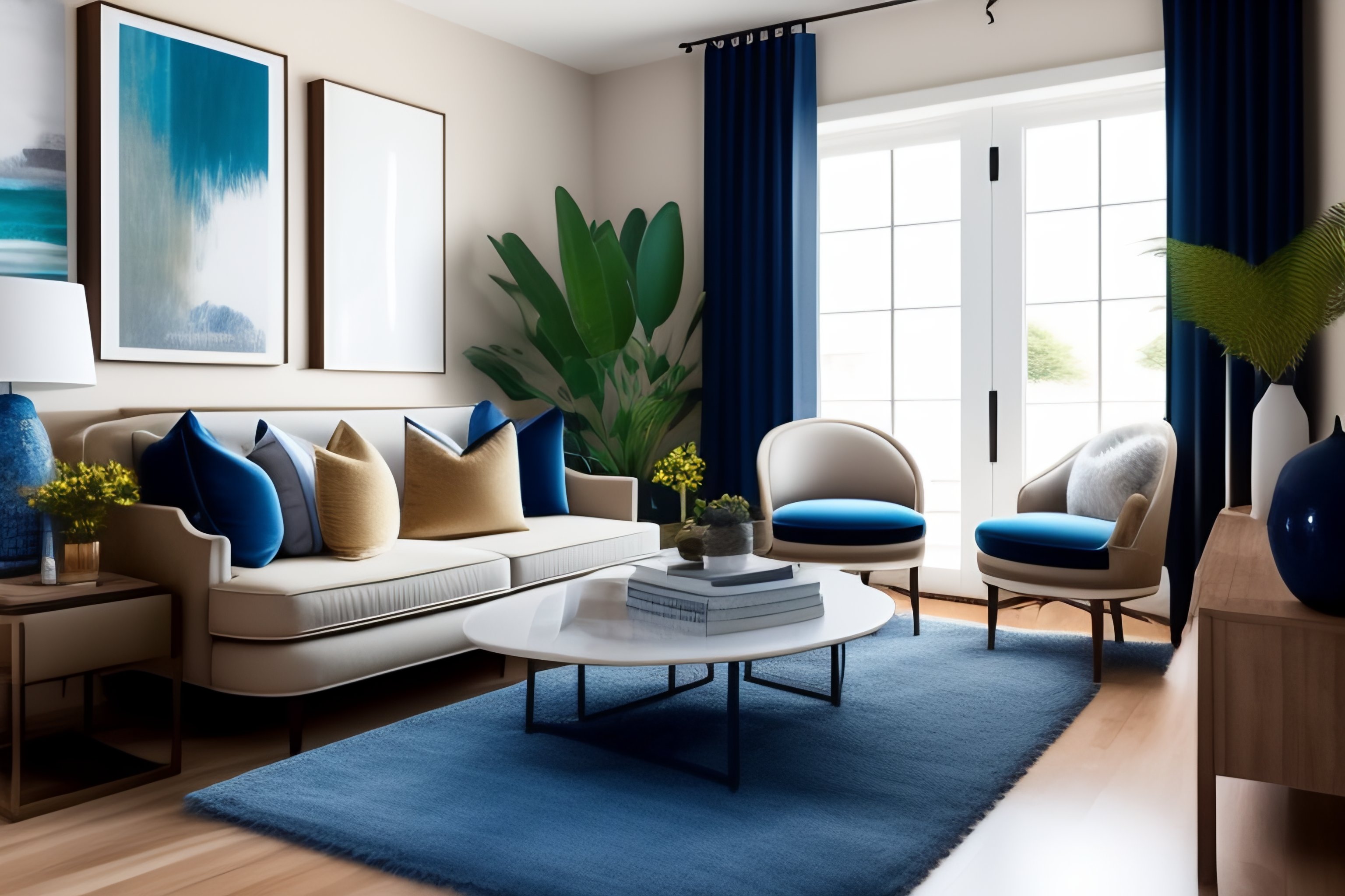 A room with beige walls that are accented with beige, and grey furniture and decor. there are small pops of color in the form of colorful throw pillows, art, and plants. a vintage rug in shades of blues, white, and beige ties the room together.