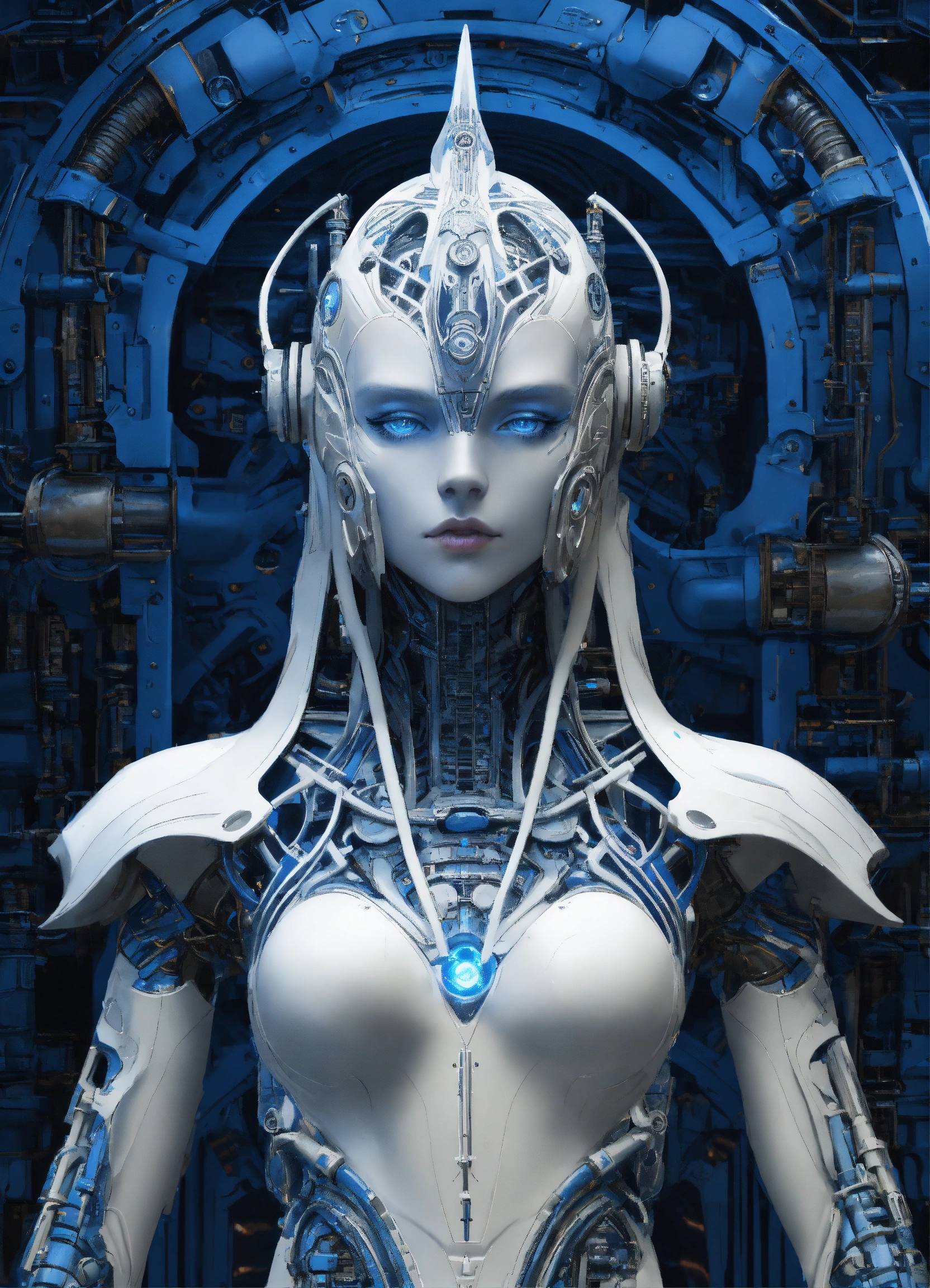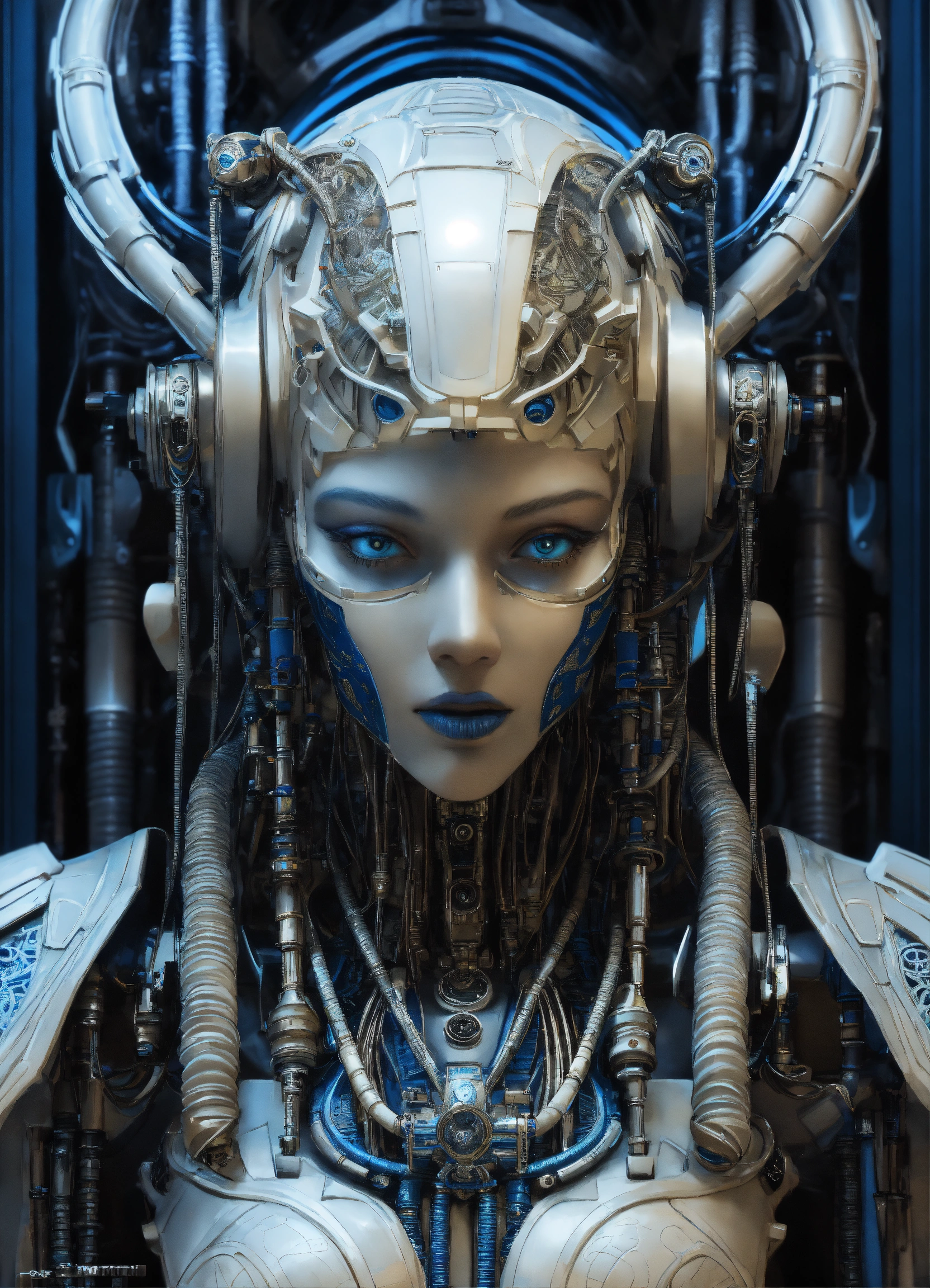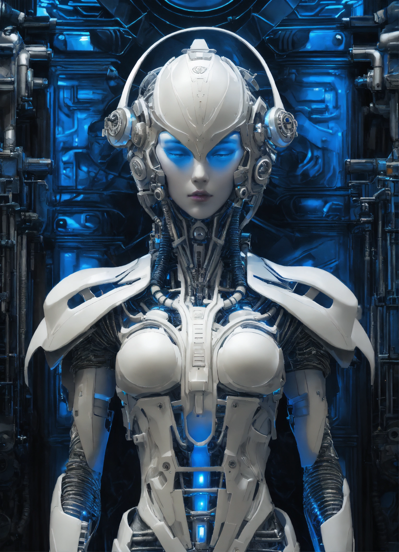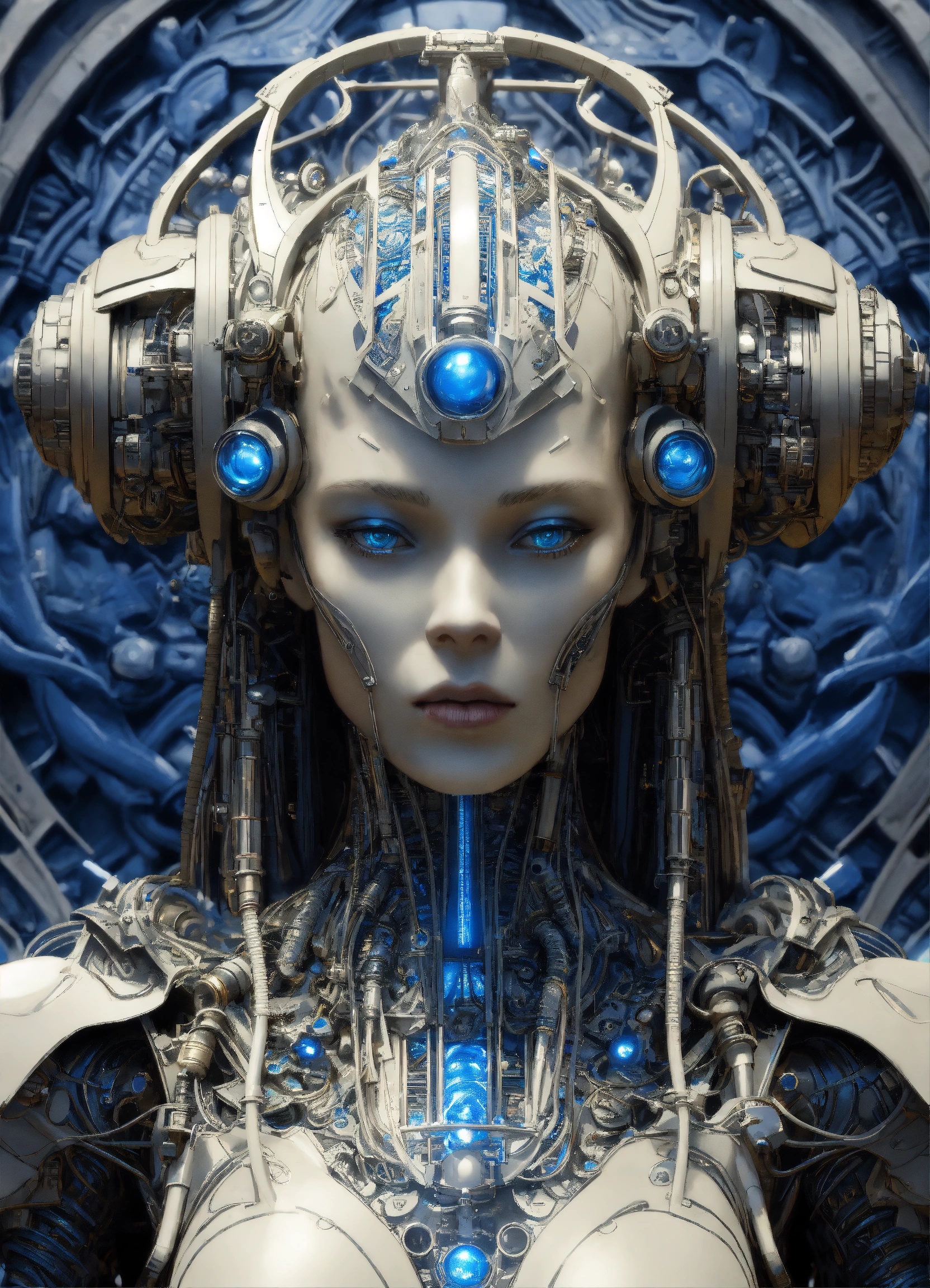 Upper body extraterrestrial mechanical deity of storms in white celtic robes by android jones alex gray m, c, escher h, r, giger android jones alex gray mark cooper beauty alien cyborg machine with helmet with lights, in blue robes and metal machine deity alex gray android jones hr giger artgerm artstation award winning photorealistic detailed hyper vivid fantasy