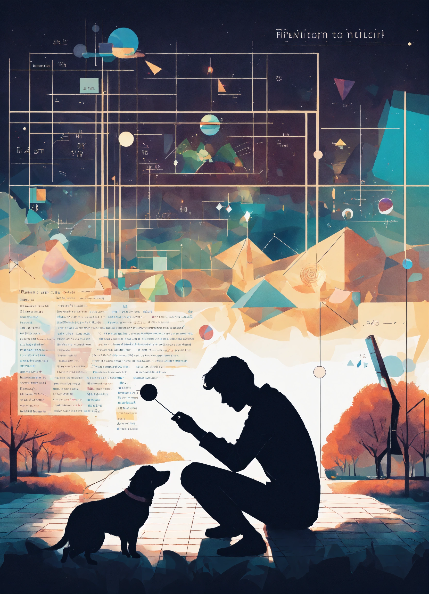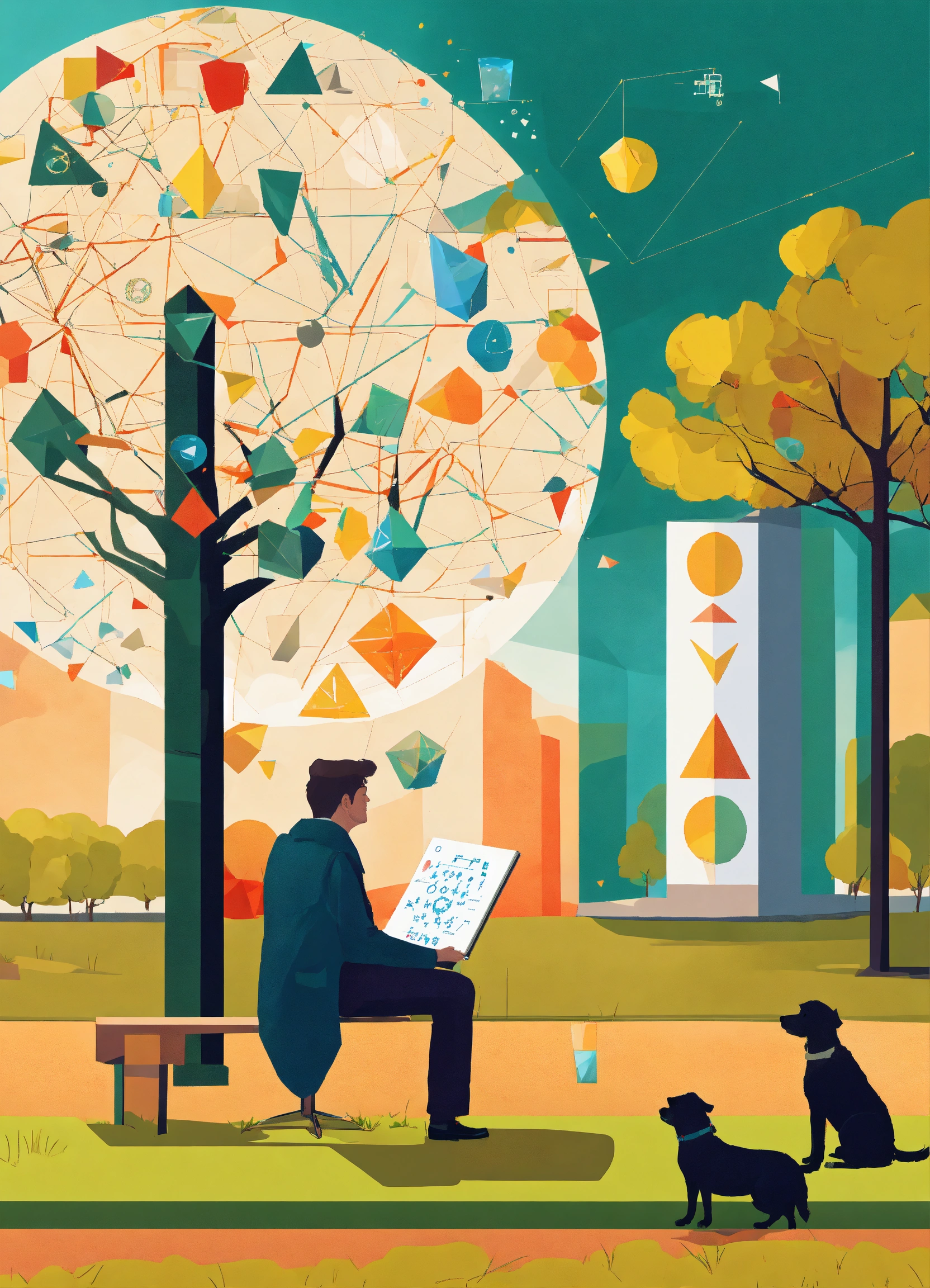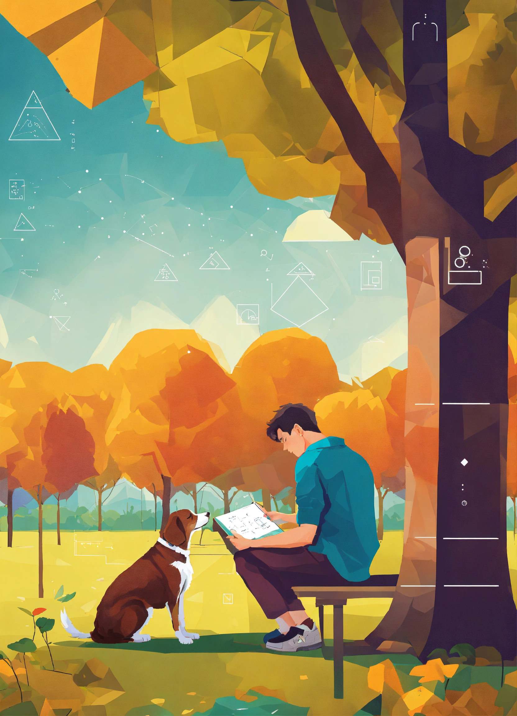 Man discovering geometric shapes like squares, triangules and circles in the world while he is sat under a tree in a park watching it, with a dog next to him. it is noon. close up to the man's face. show me written formulas to obtain area and volume in the background. vector image.