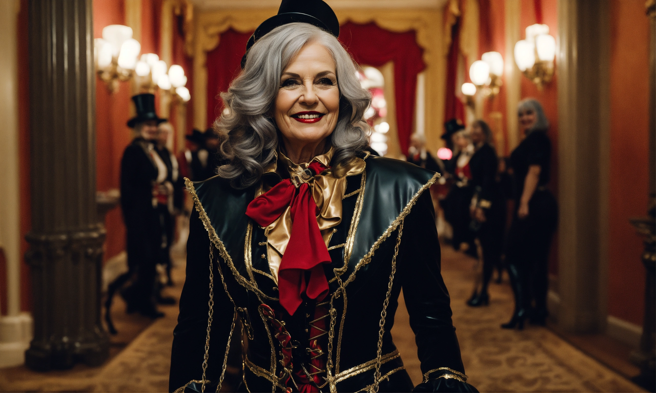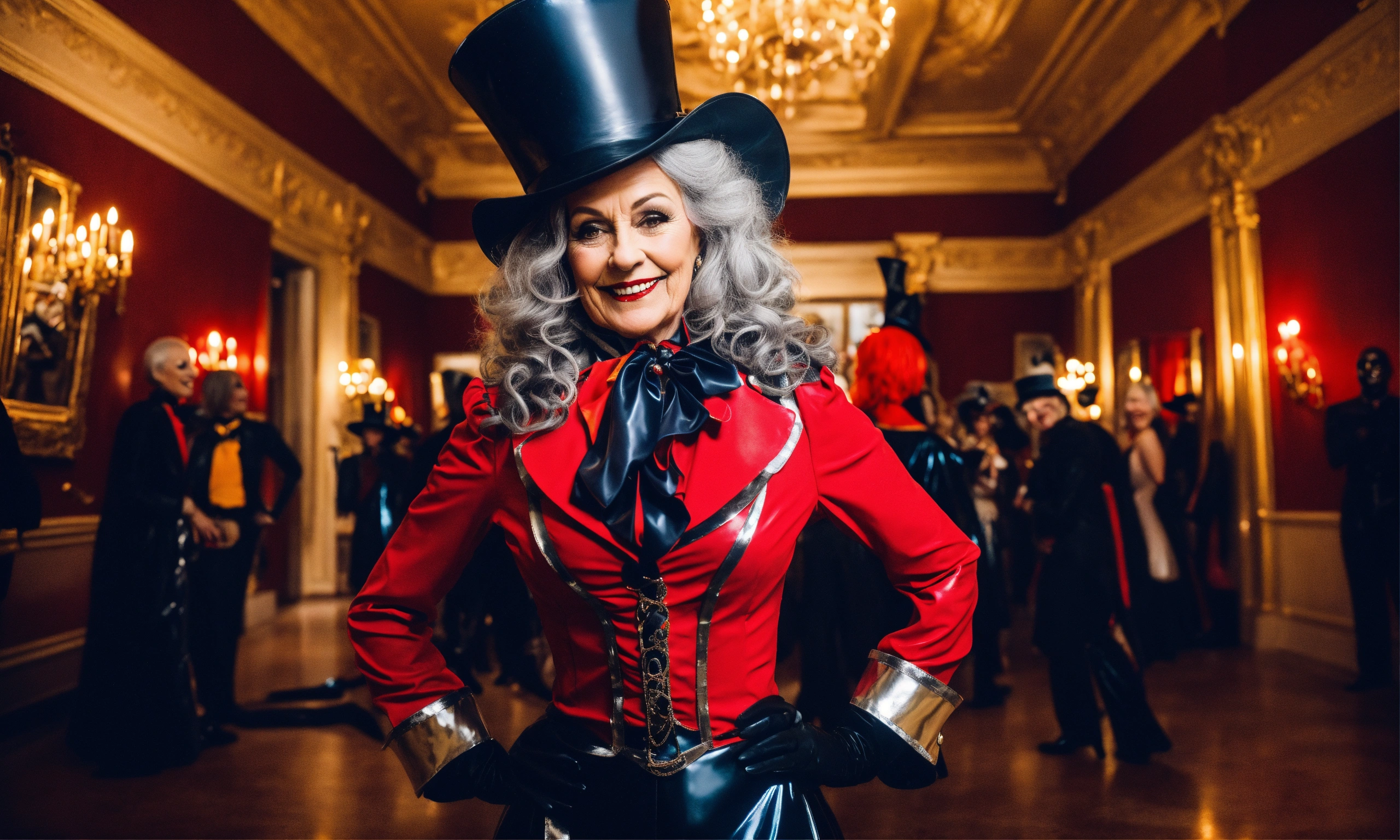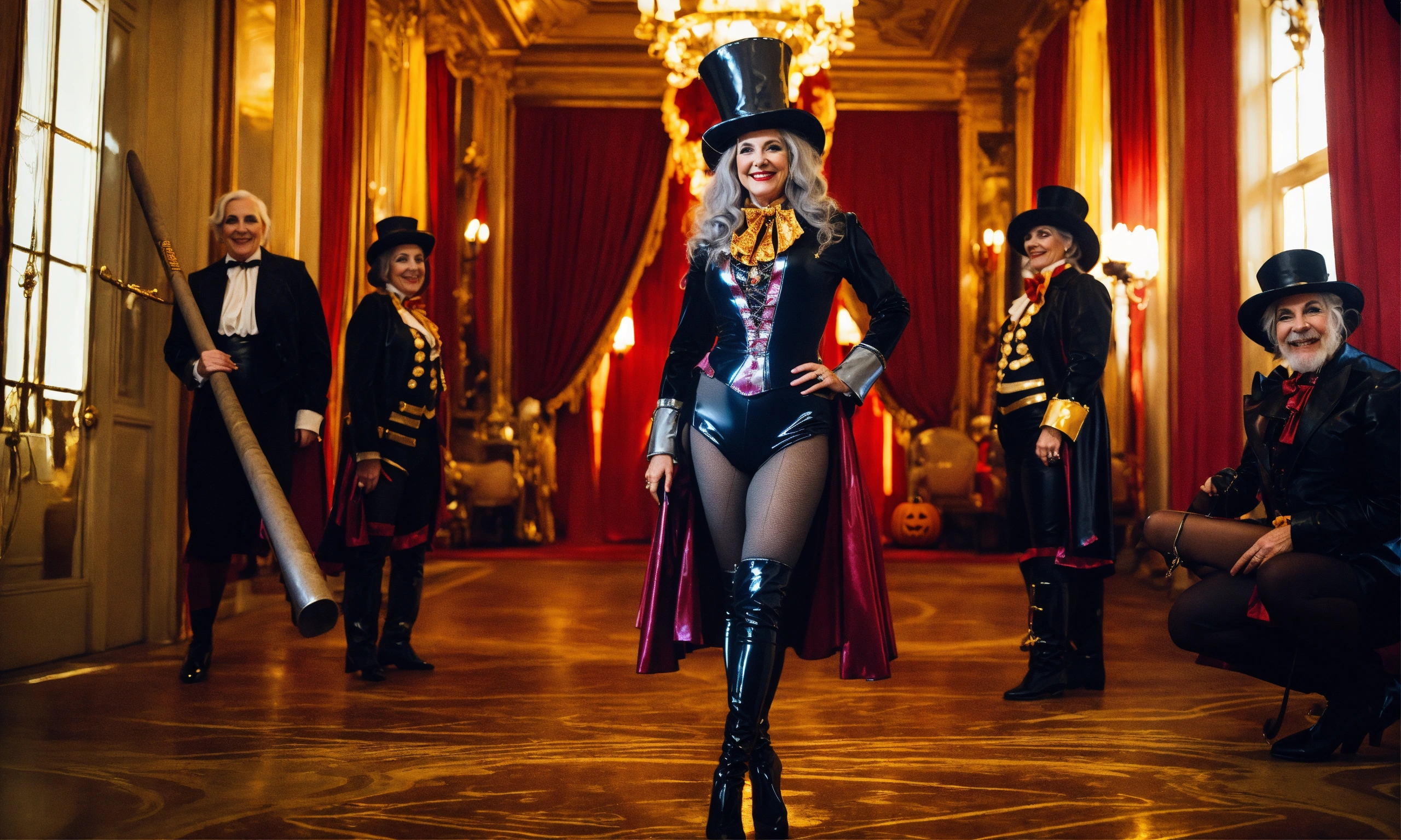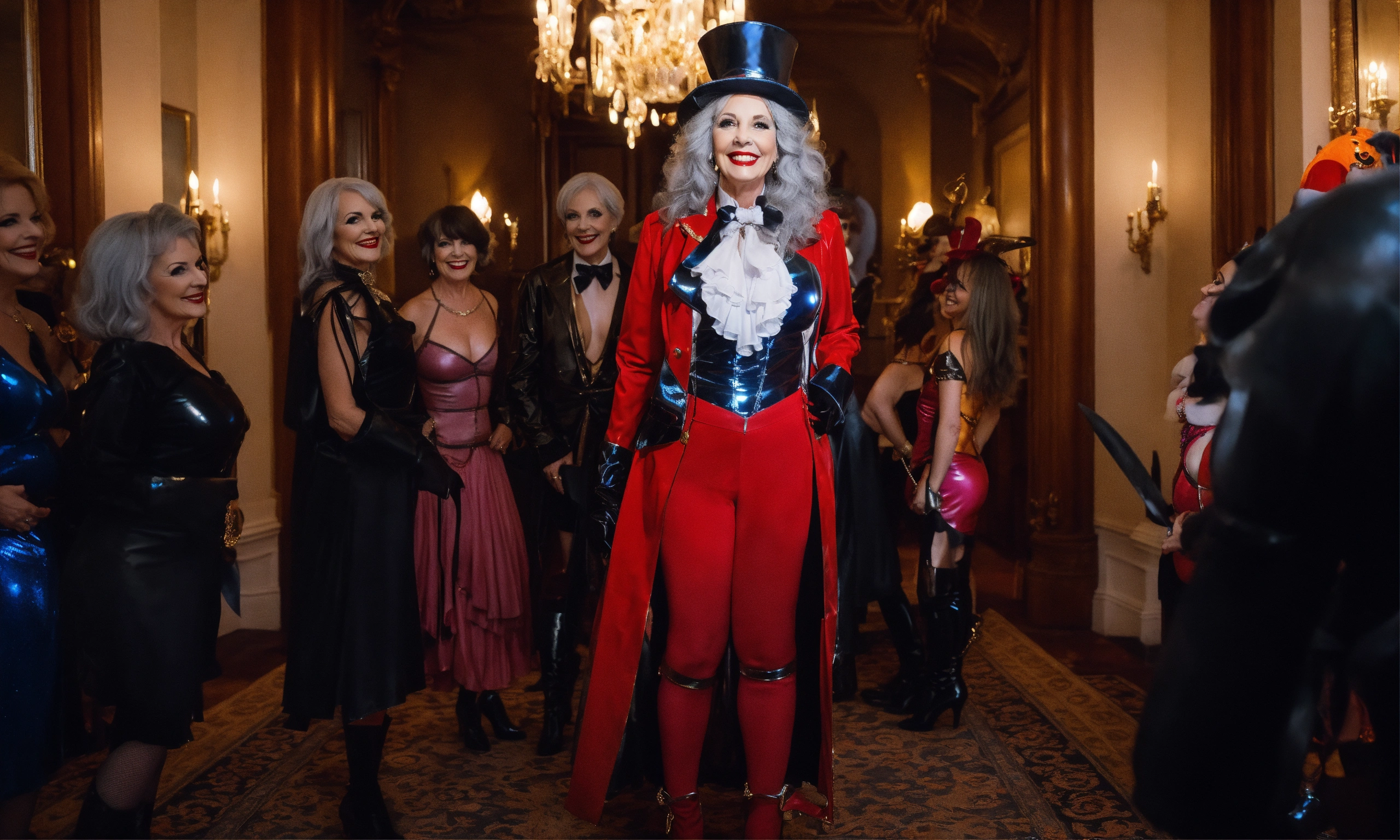 Group of chic older woman, 65, female, long flowing gray hair, wearing tight shiny latex circus ringmaster costume, standing, from a low angle, mischievous grin, halloween, mansion foyer, holding leather whip