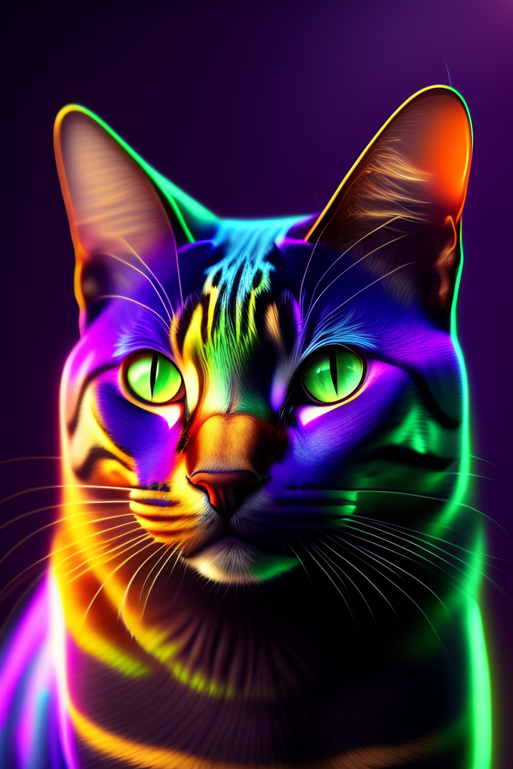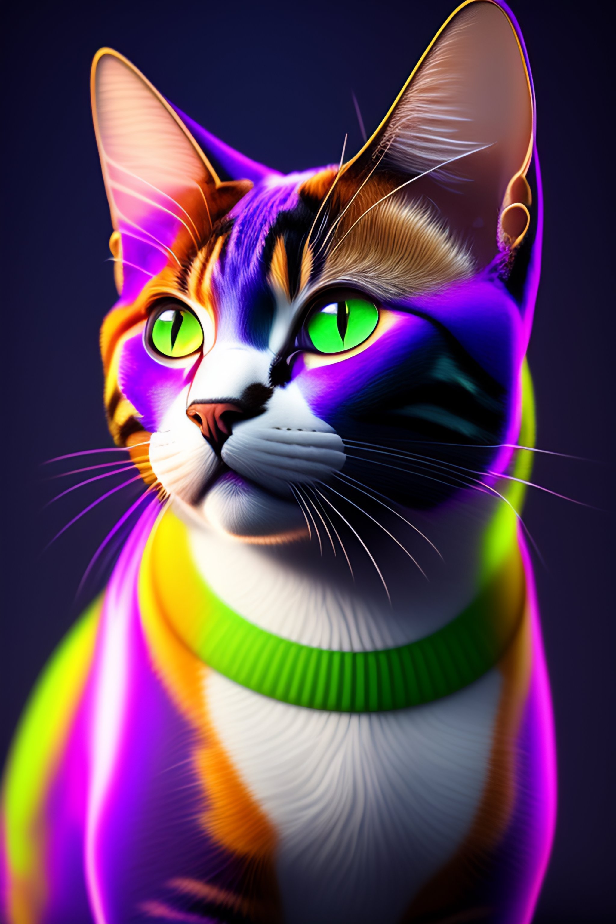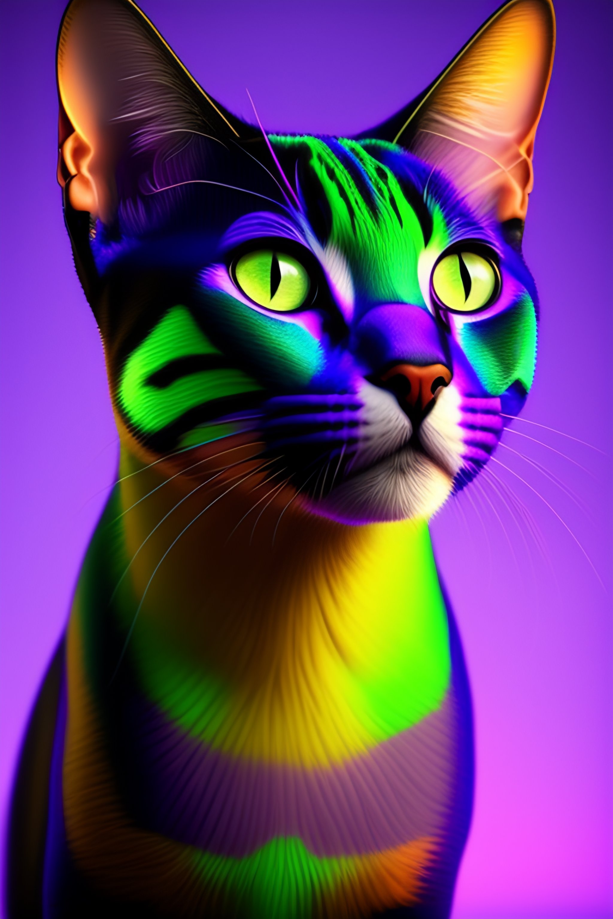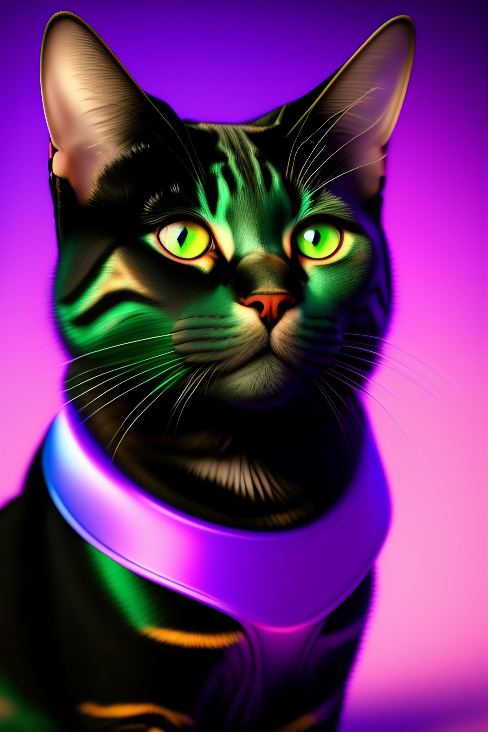 8k pixar style realistic 3d portrait cat with purple and green eyes