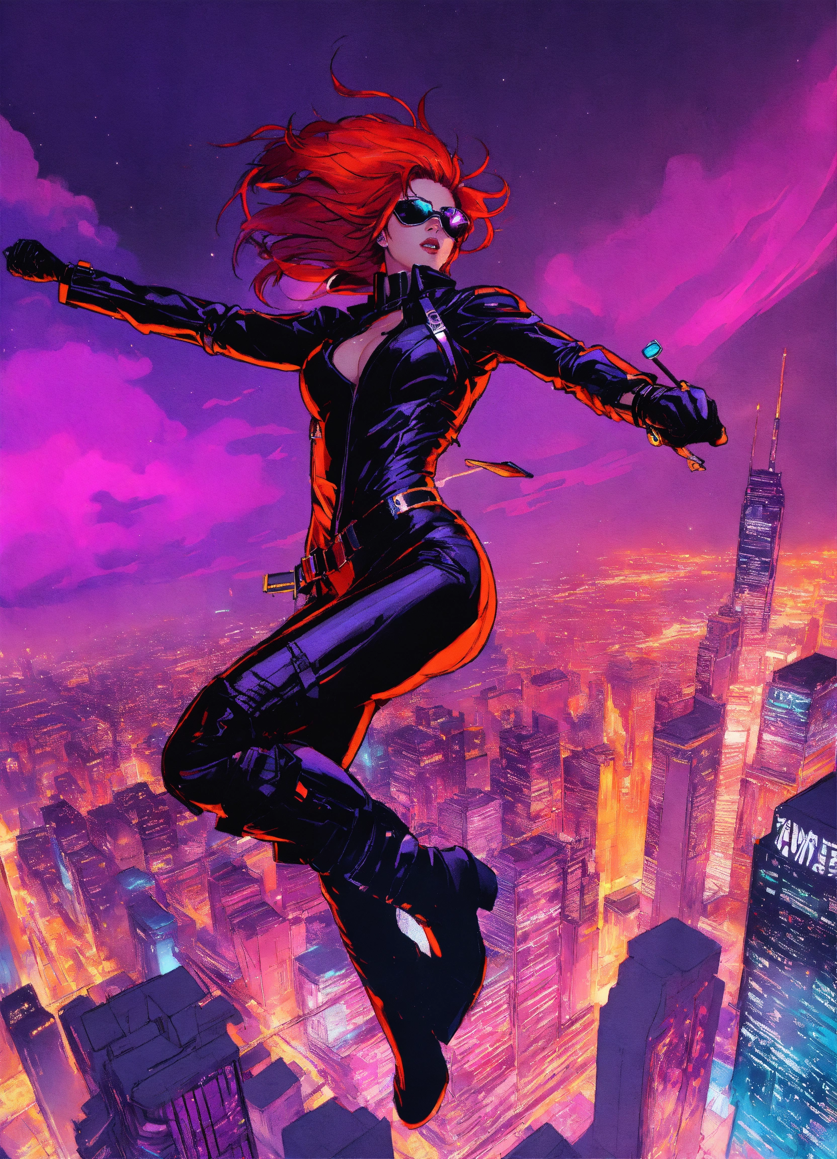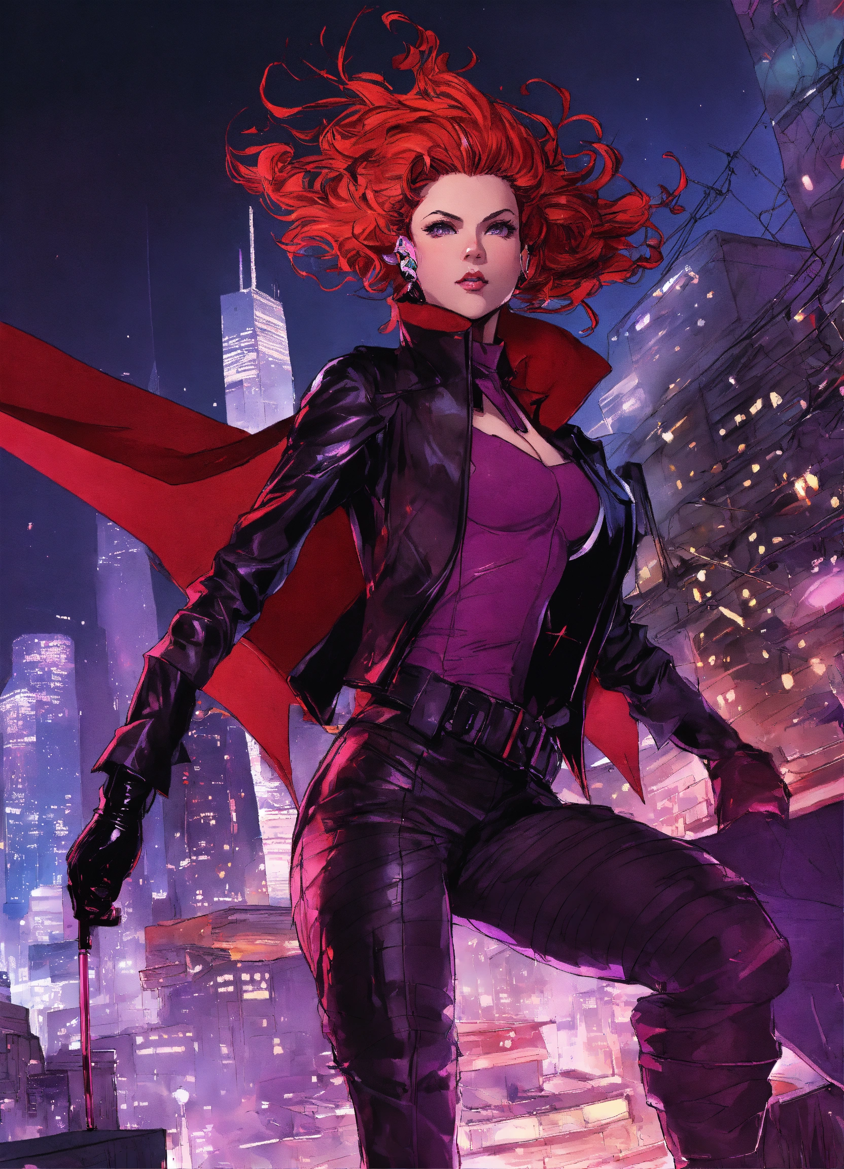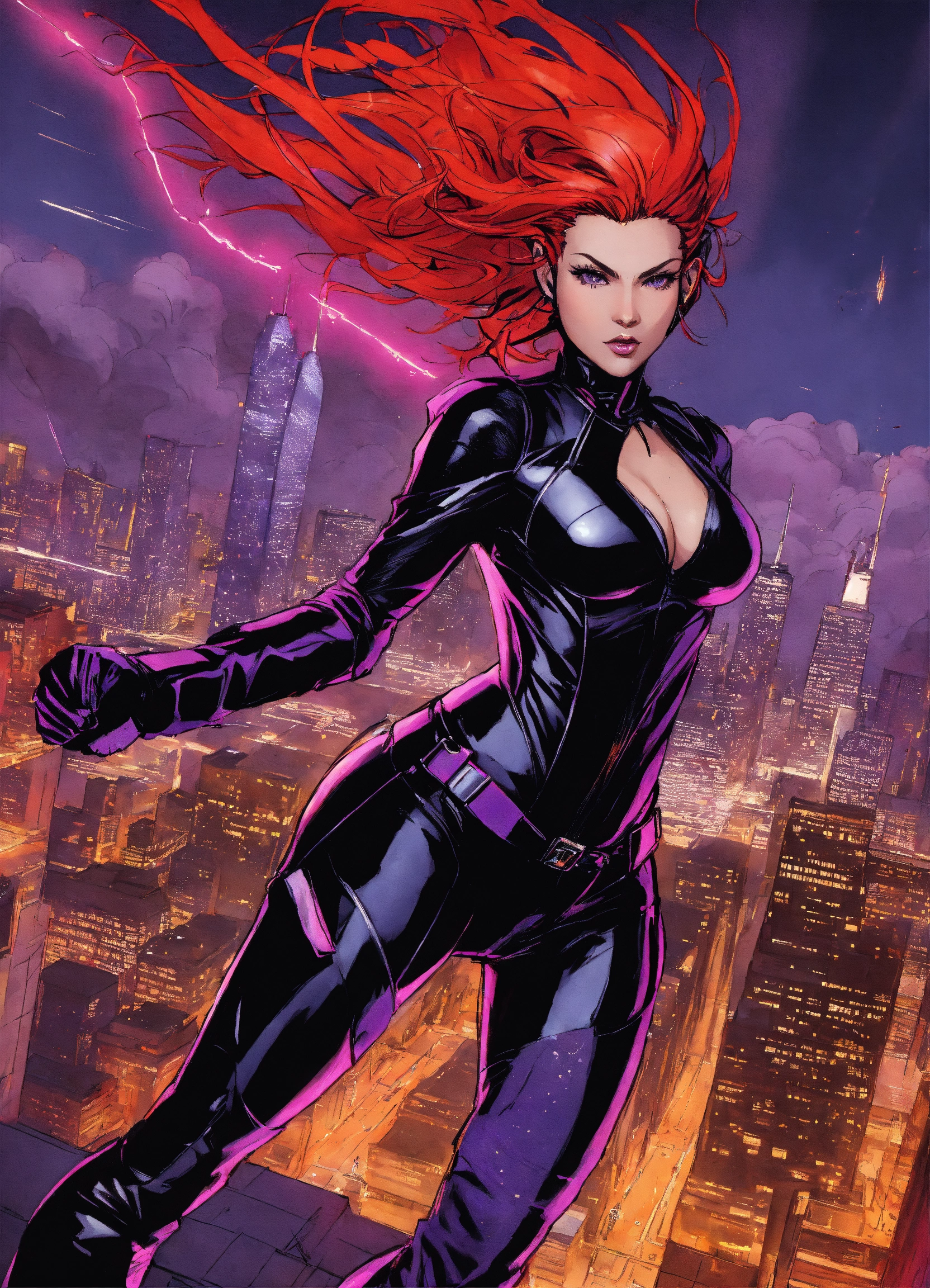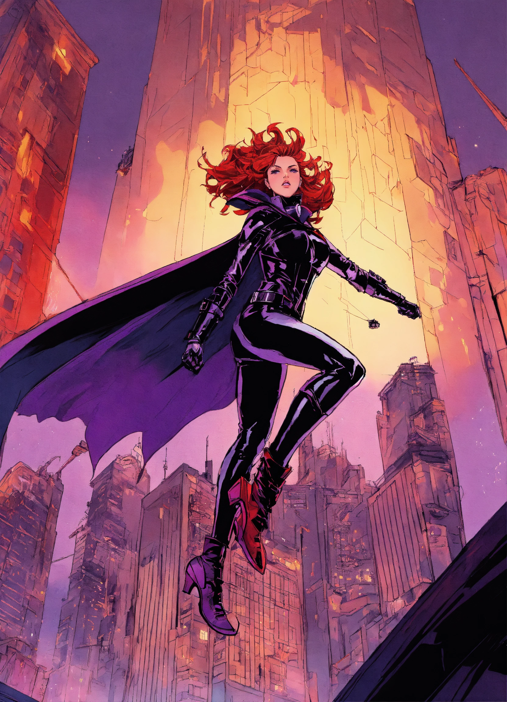 Digital art, ink, !cartoon realism, flying serious looking female villain with red spikey hair, purple/black villain suit with a powerful purple/black cape and purple/black leather boots, with clinched fist cluttered 7/11 interior environmental wise shot by hajime sorayama, greg tocchini, virgil finlay, sci-fi, colors, neon lights. line art. environmental art, dry-erase marker, flying over the city of chicago