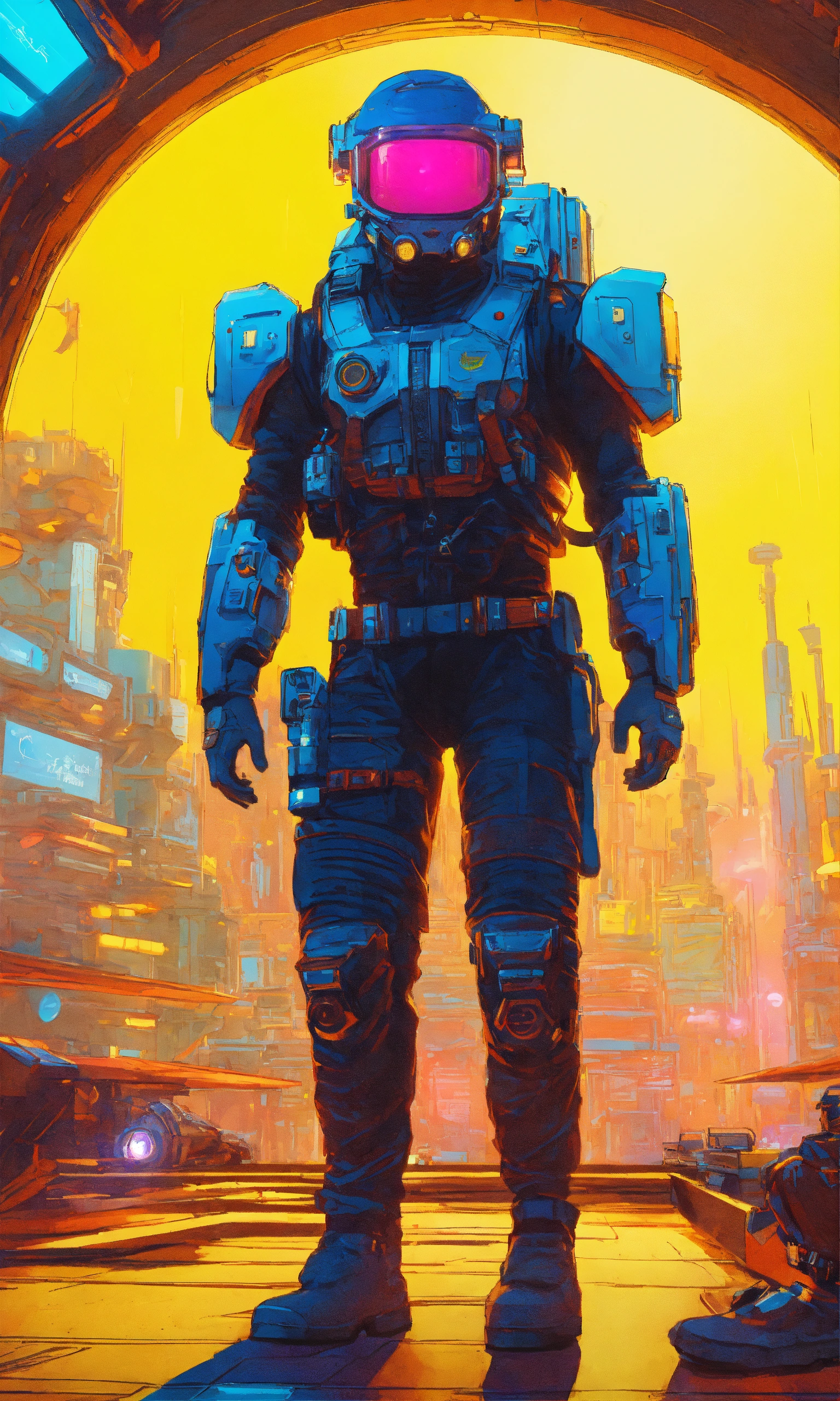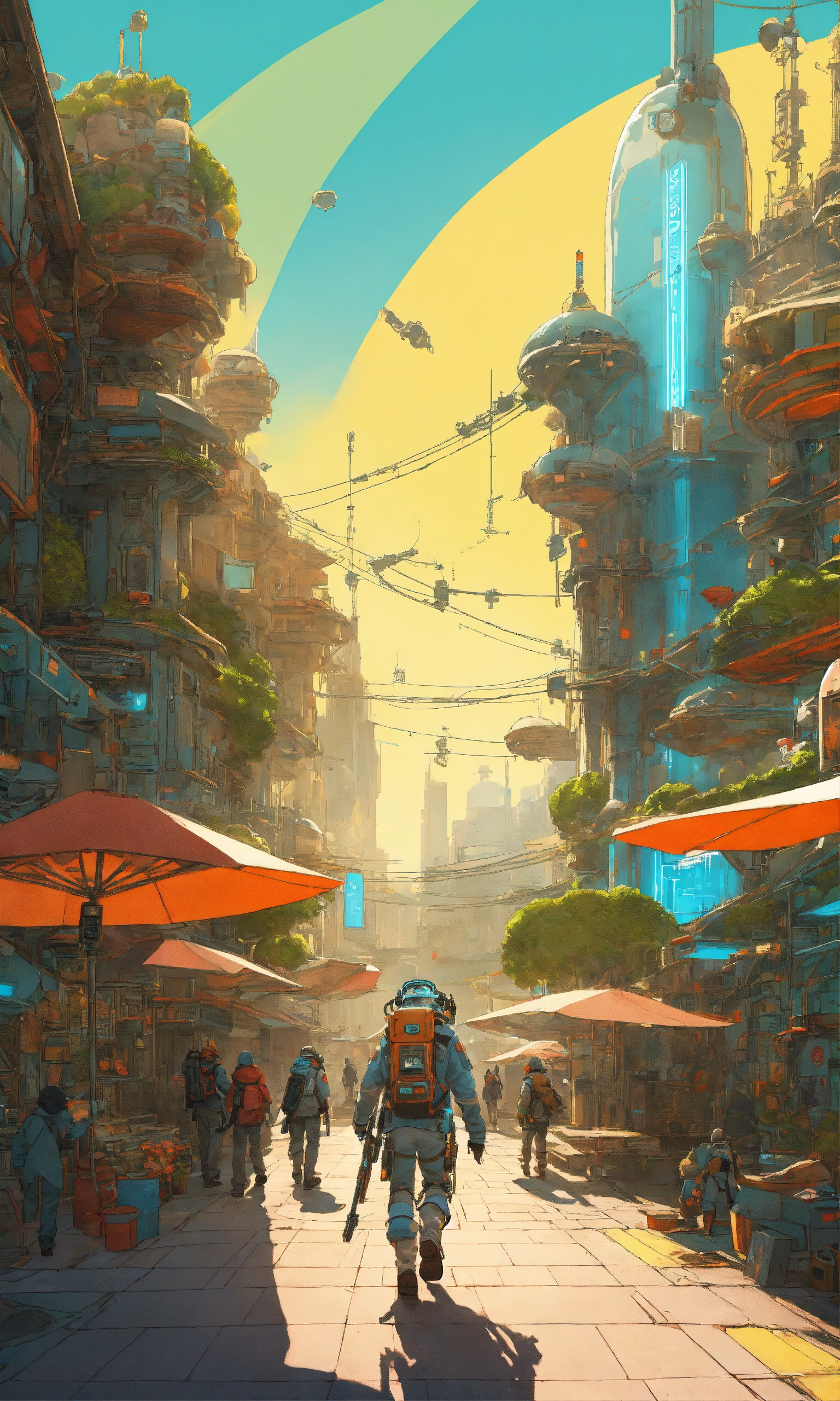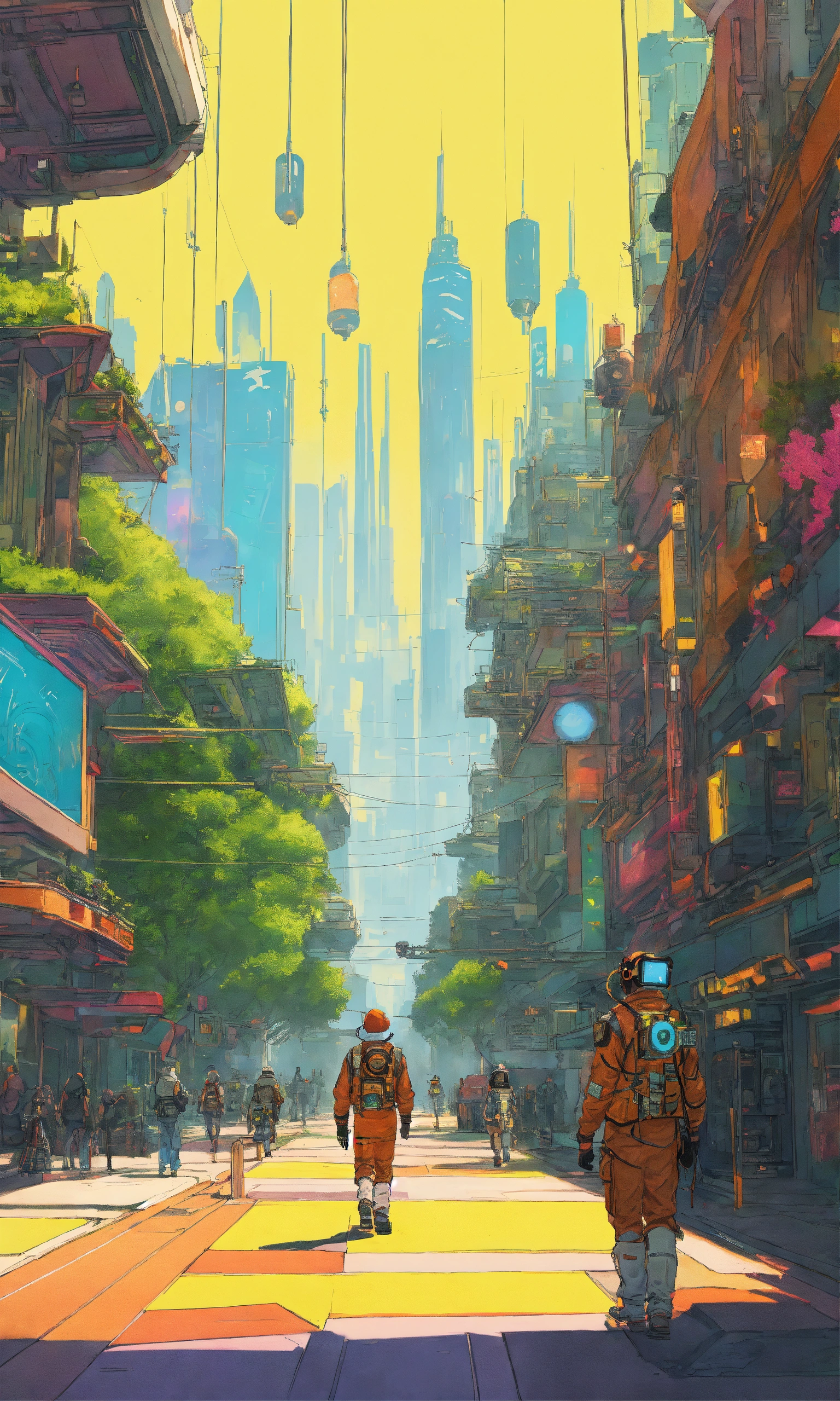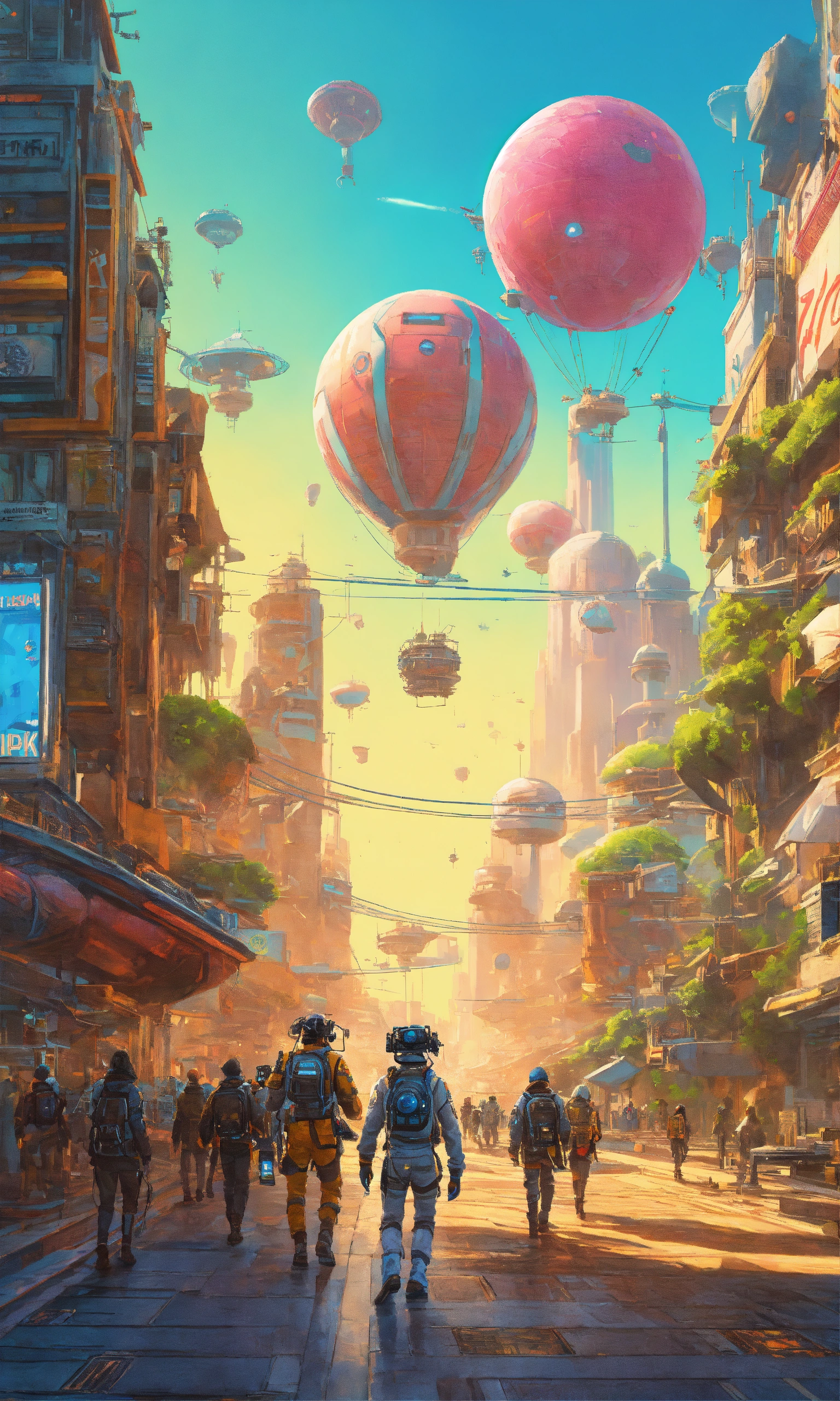 Describe a futuristic scene where a crew of futurepunk characters is walking towards a virtual reality world ready to launch. it's a sunny day with vibrant colorful lighting, creating a sci-fi atmosphere. the scene is captured in ultra-high definition (uhd) and has a cinematic feel to it. the camera zooms in on the main protagonist, showcasing intricate and detailed character design. the illustration is created by mattias adolfsson