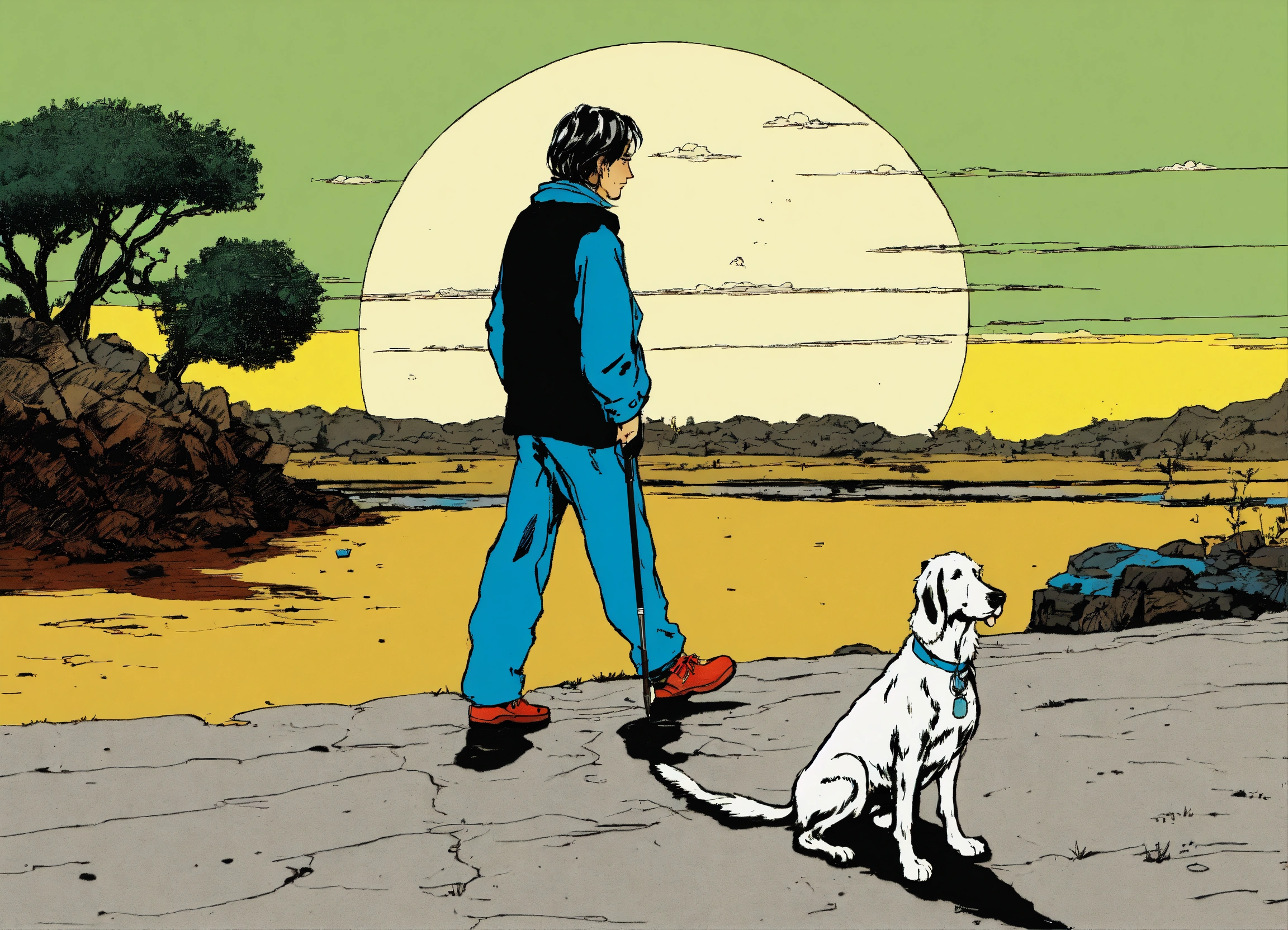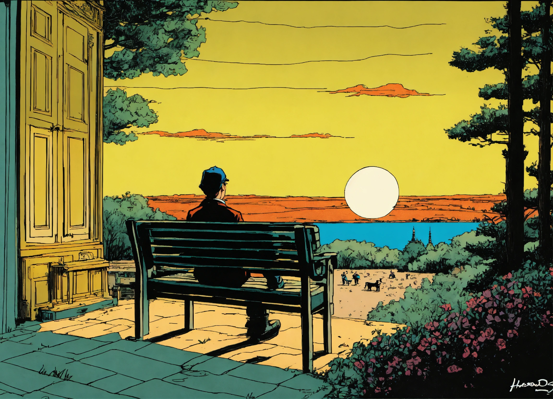 Pen and ink, illustrated by hergé, man alone forever. sadness, stunning color scheme, masterpiece, snoop dog