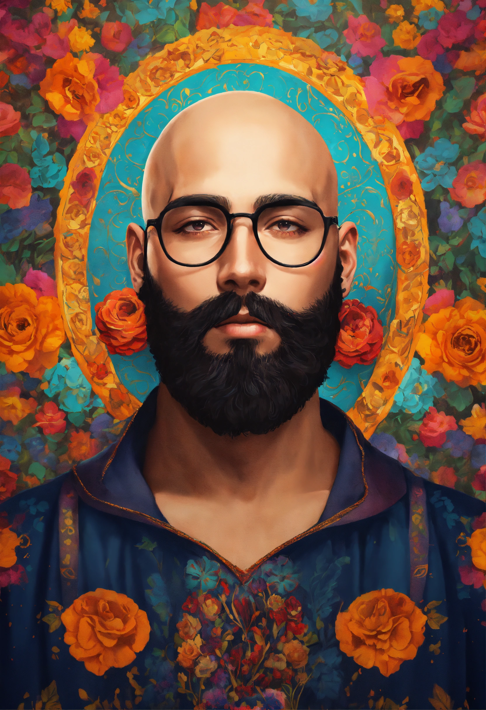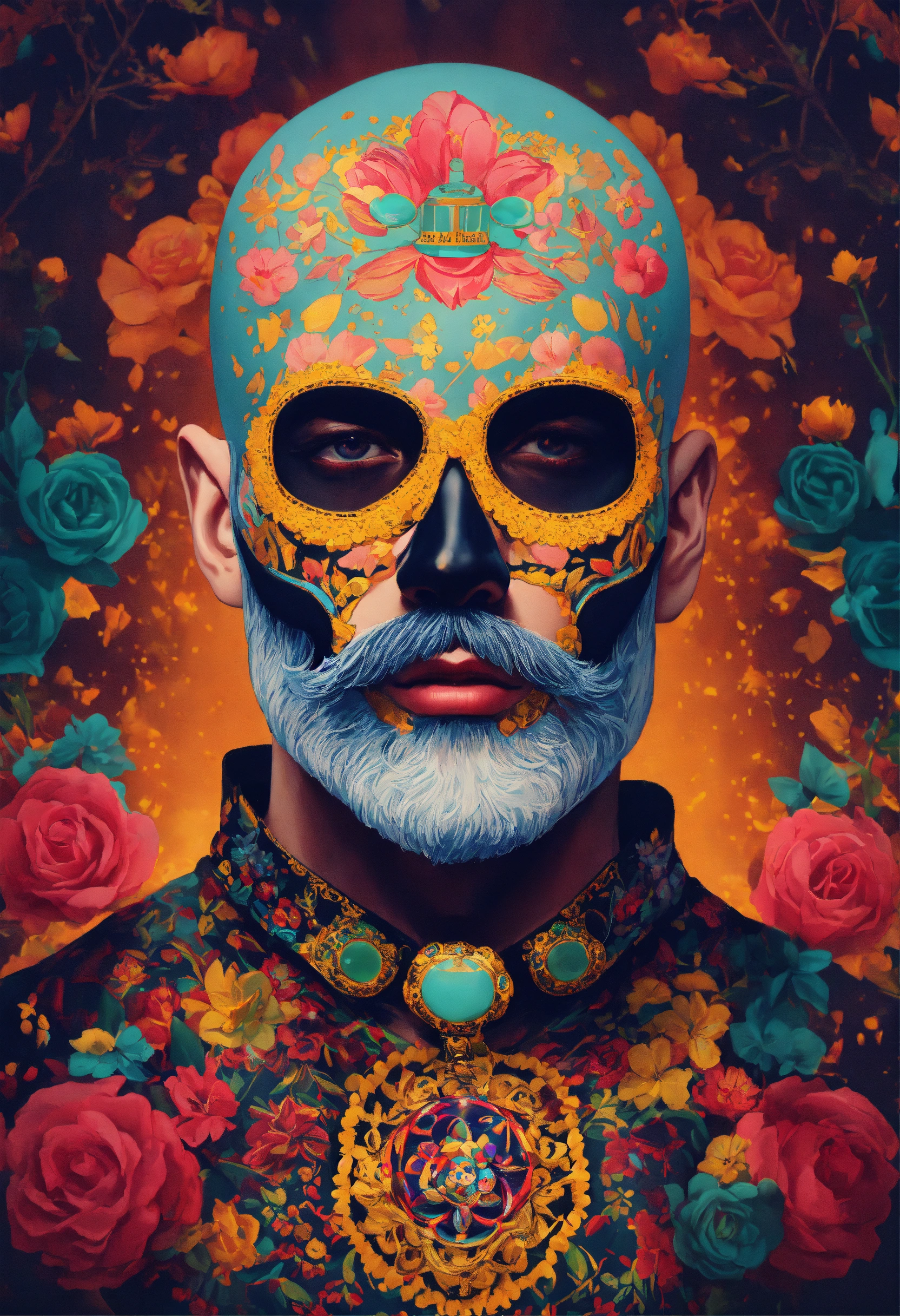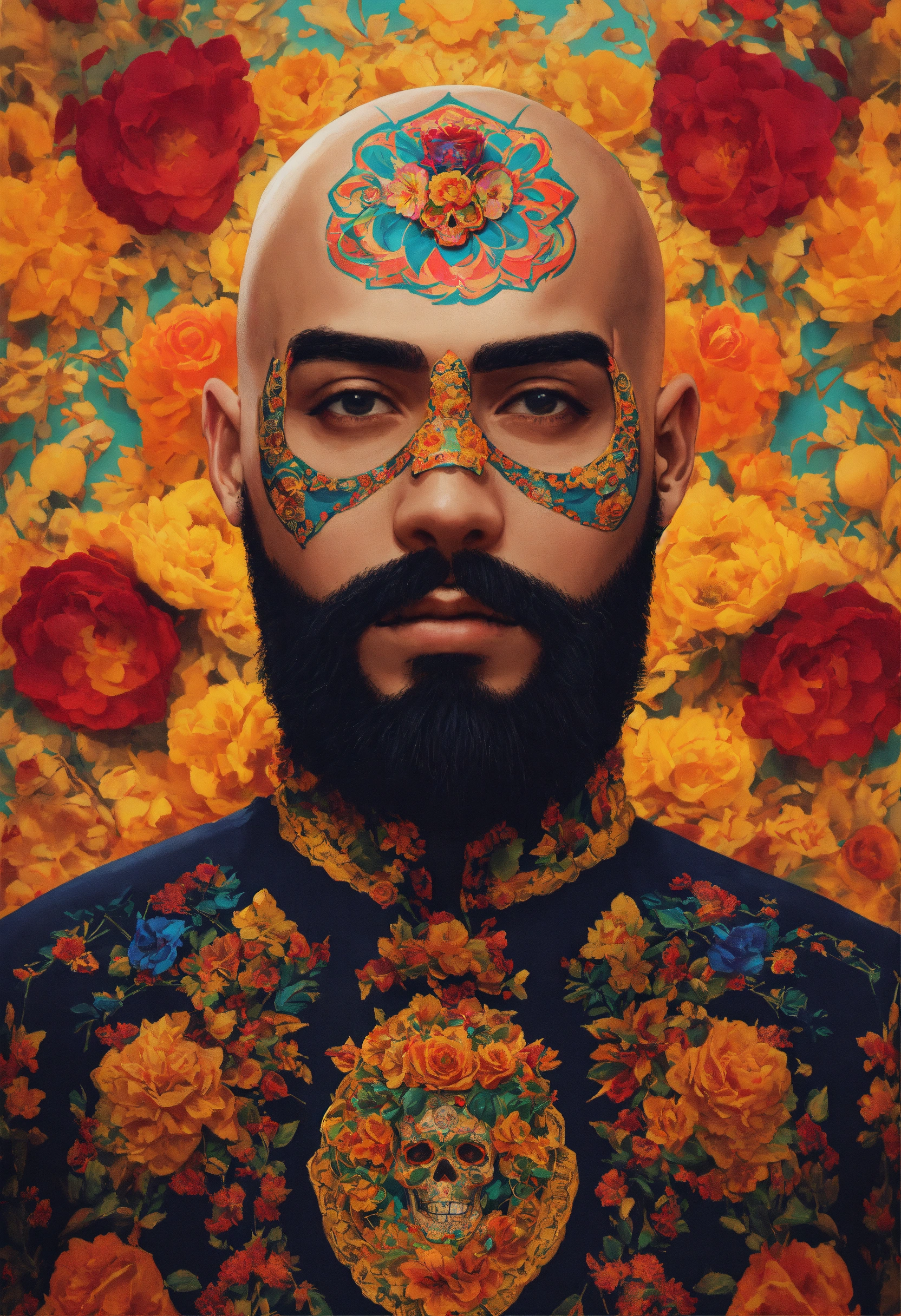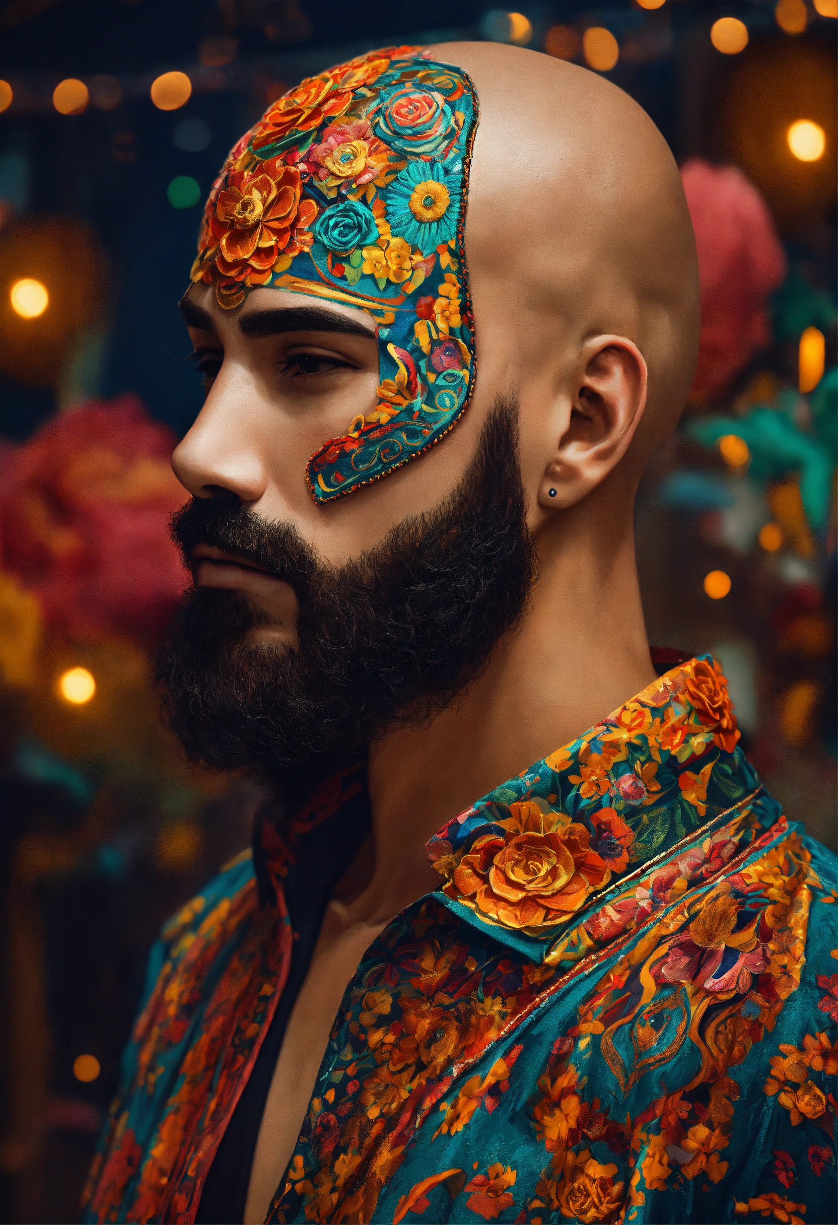 A man bald head man with beard 8k modern create an ai art piece that blends the modern and traditional elements of dia de los muertos. combine contemporary styles with classic symbolism, showcasing how this unique cultural celebration continues to evolve while honoring its roots.
