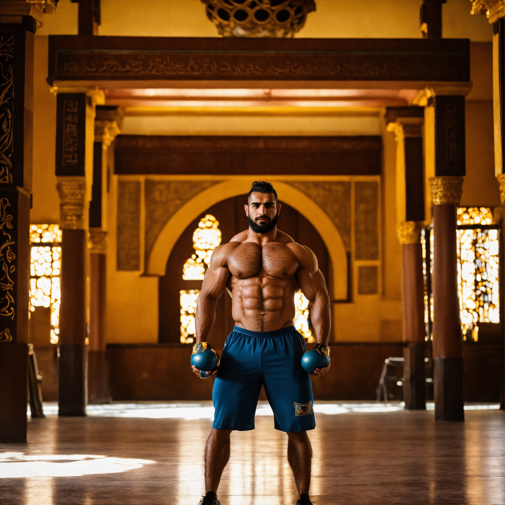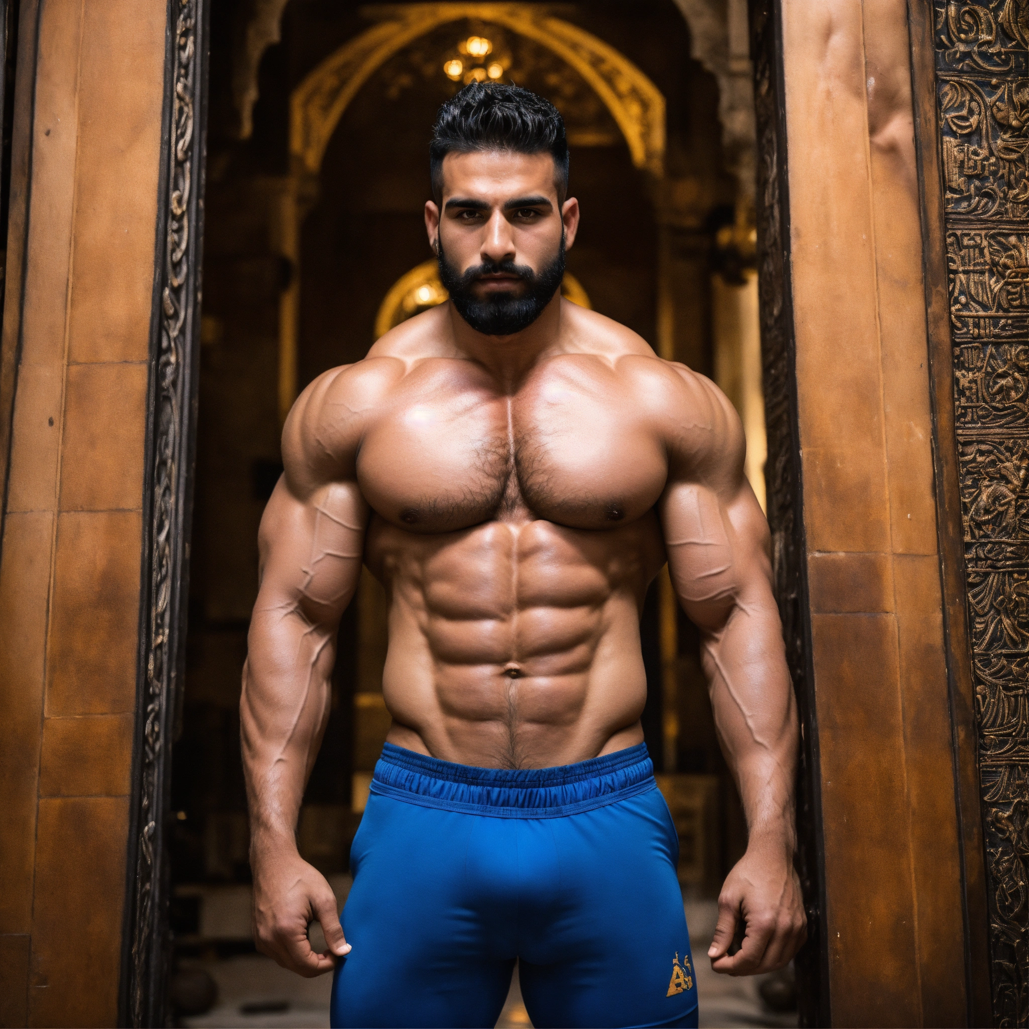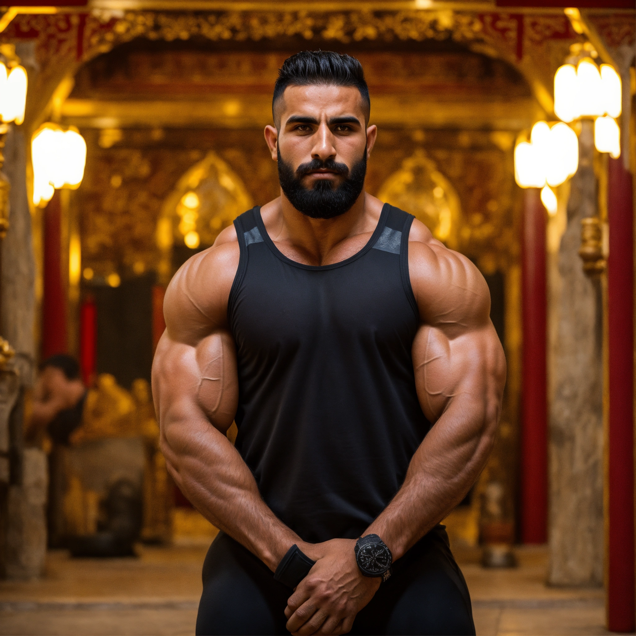 30-year-old hairy jordanian man with big muscles, big bodybuilder, body like a wrestler, fierce, in a temple