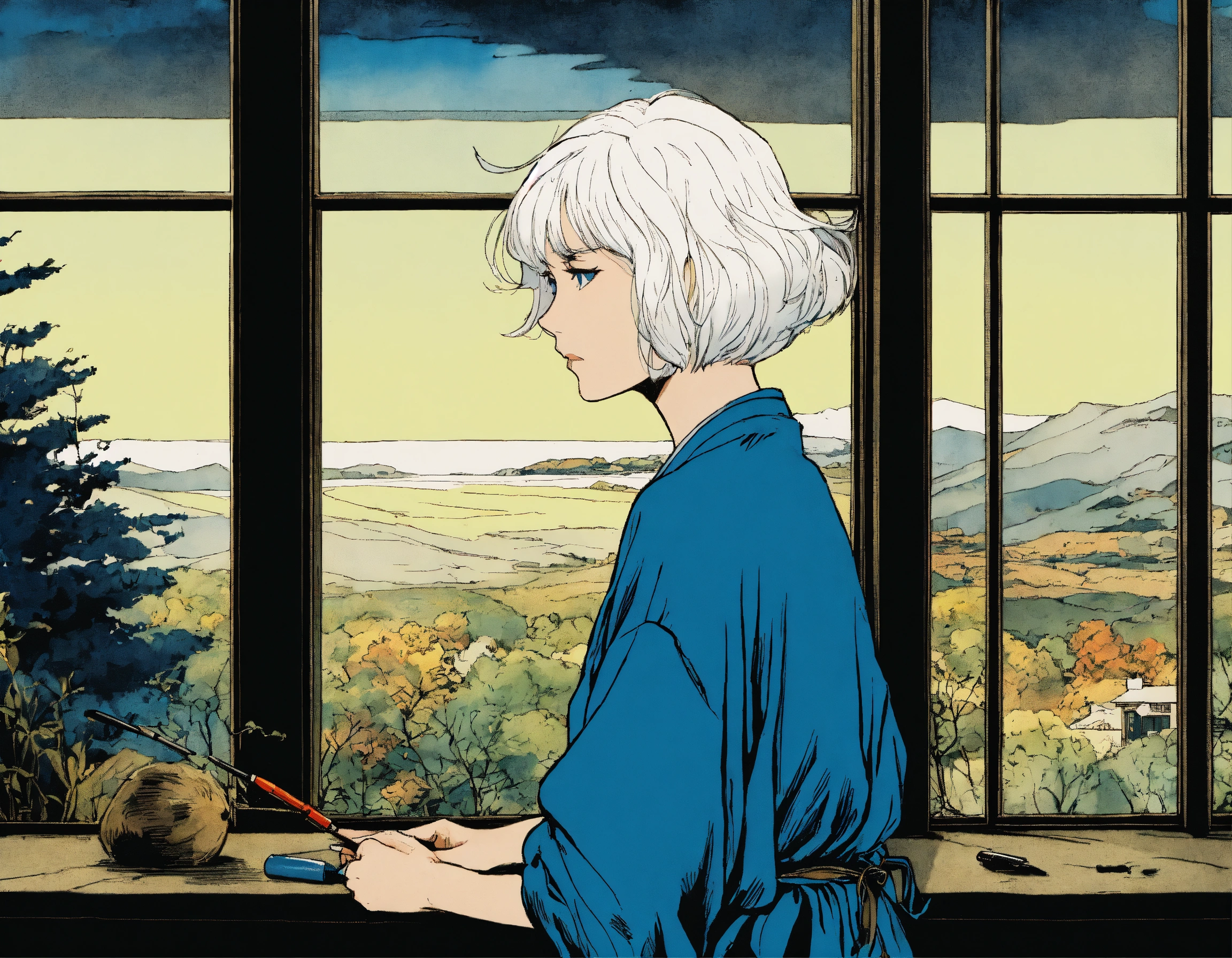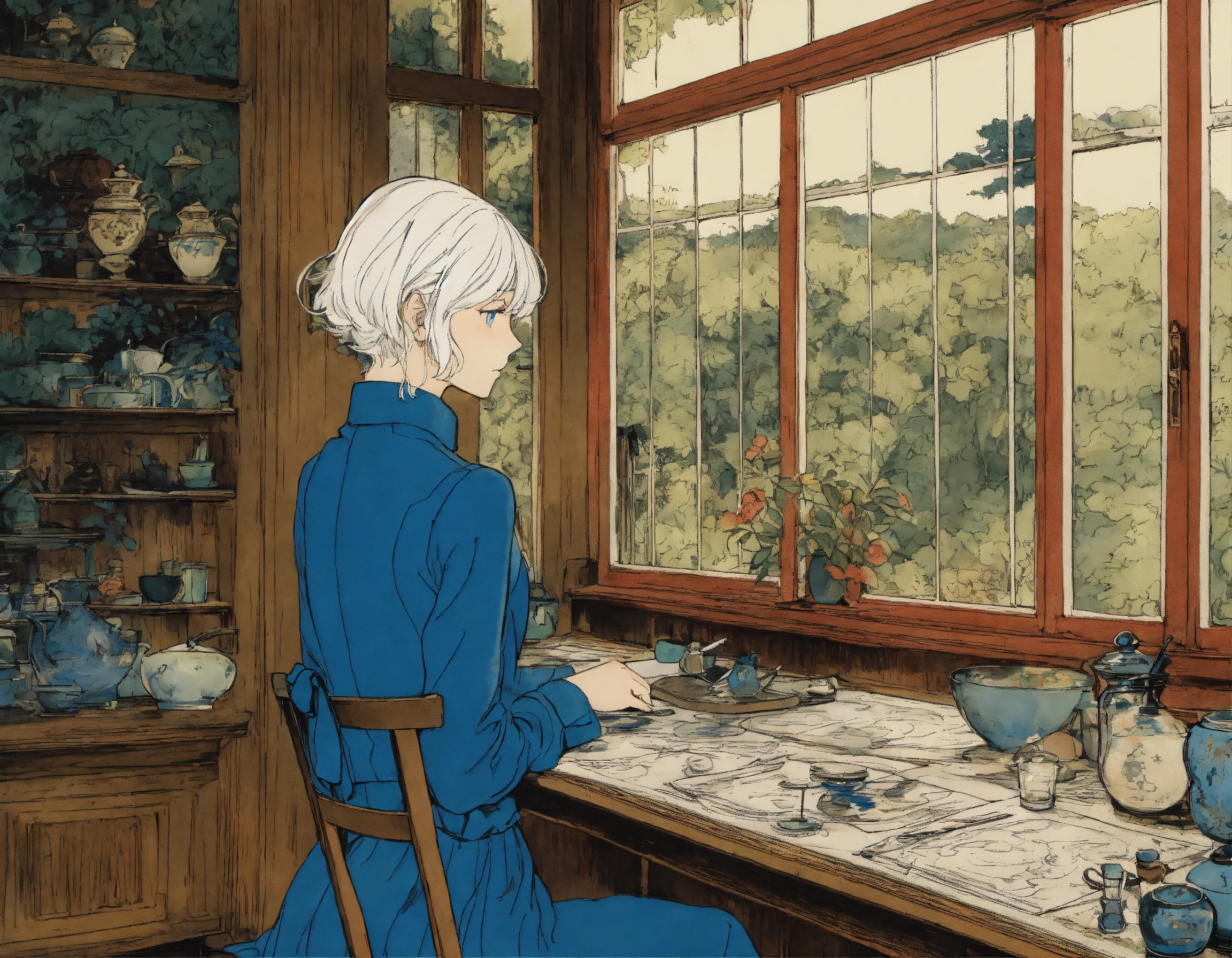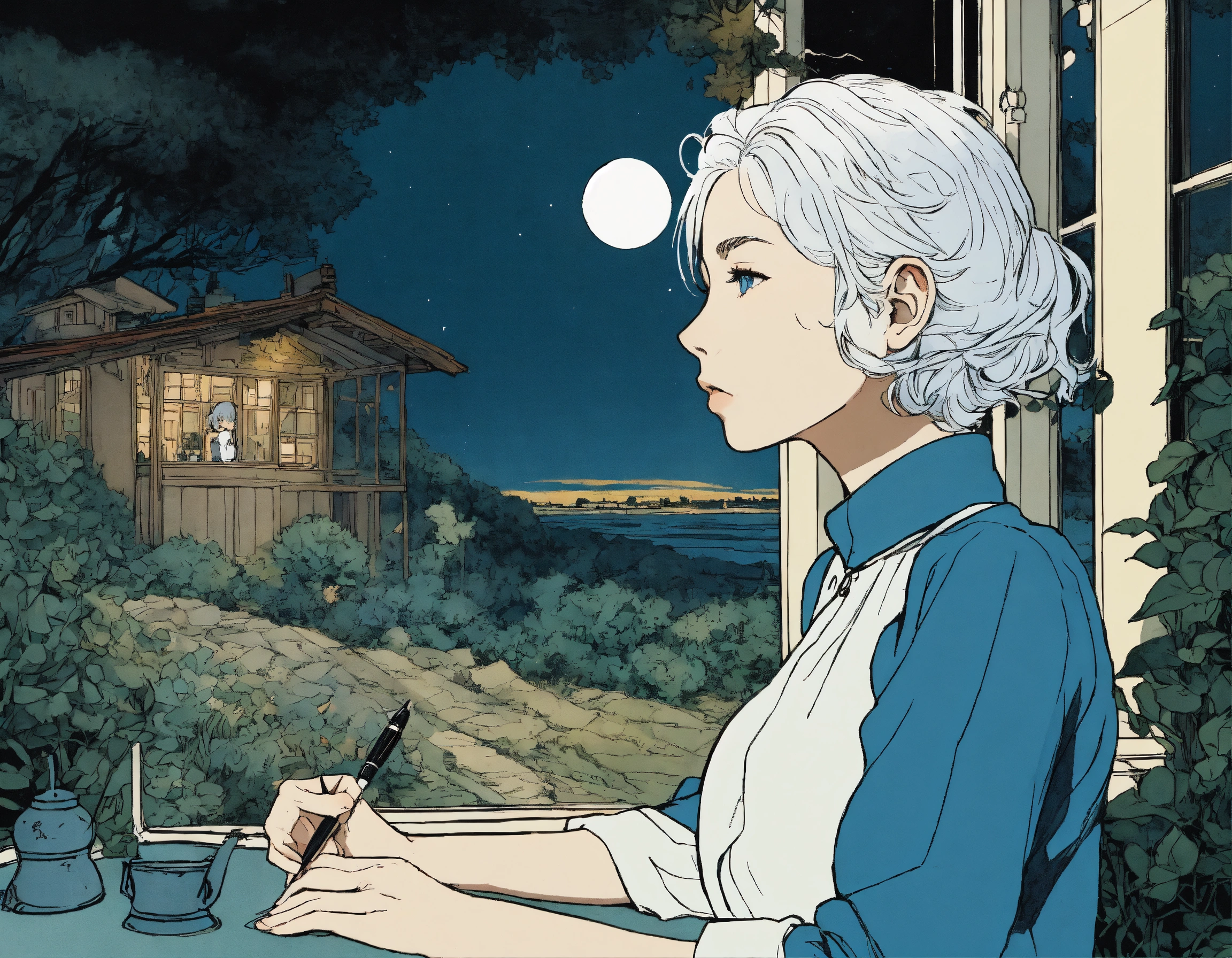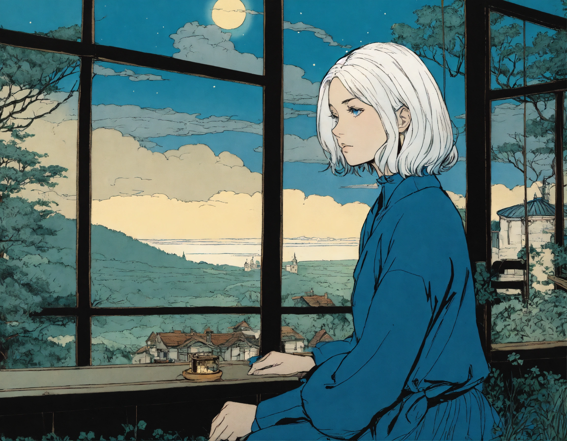Illustration by hergé of a lonely young woman with white hair and blue eyes, bang. gloomy, magic, ink and pen, dark blue scheme color, past colors. whole body. glass house. hayao miyazaki