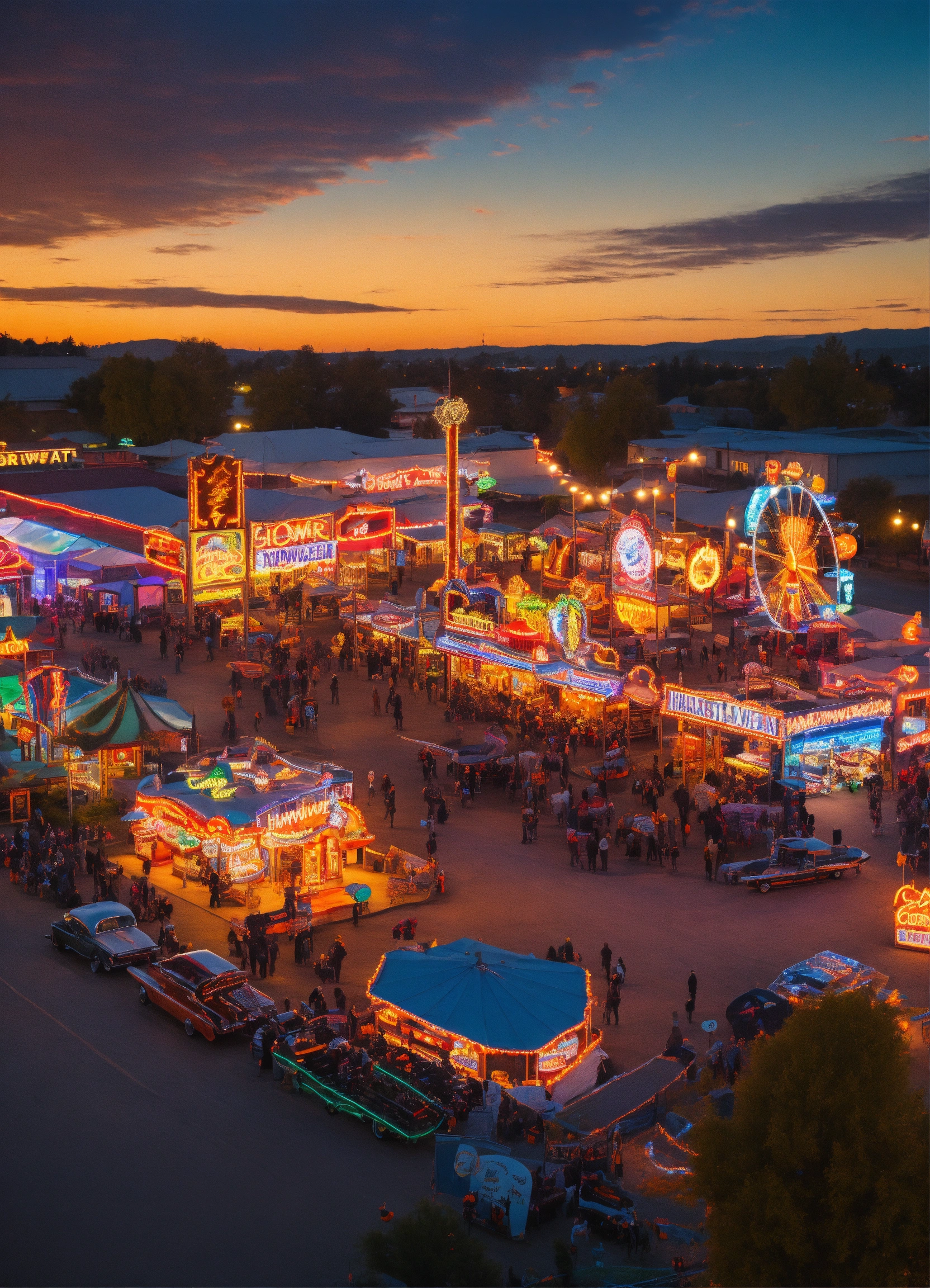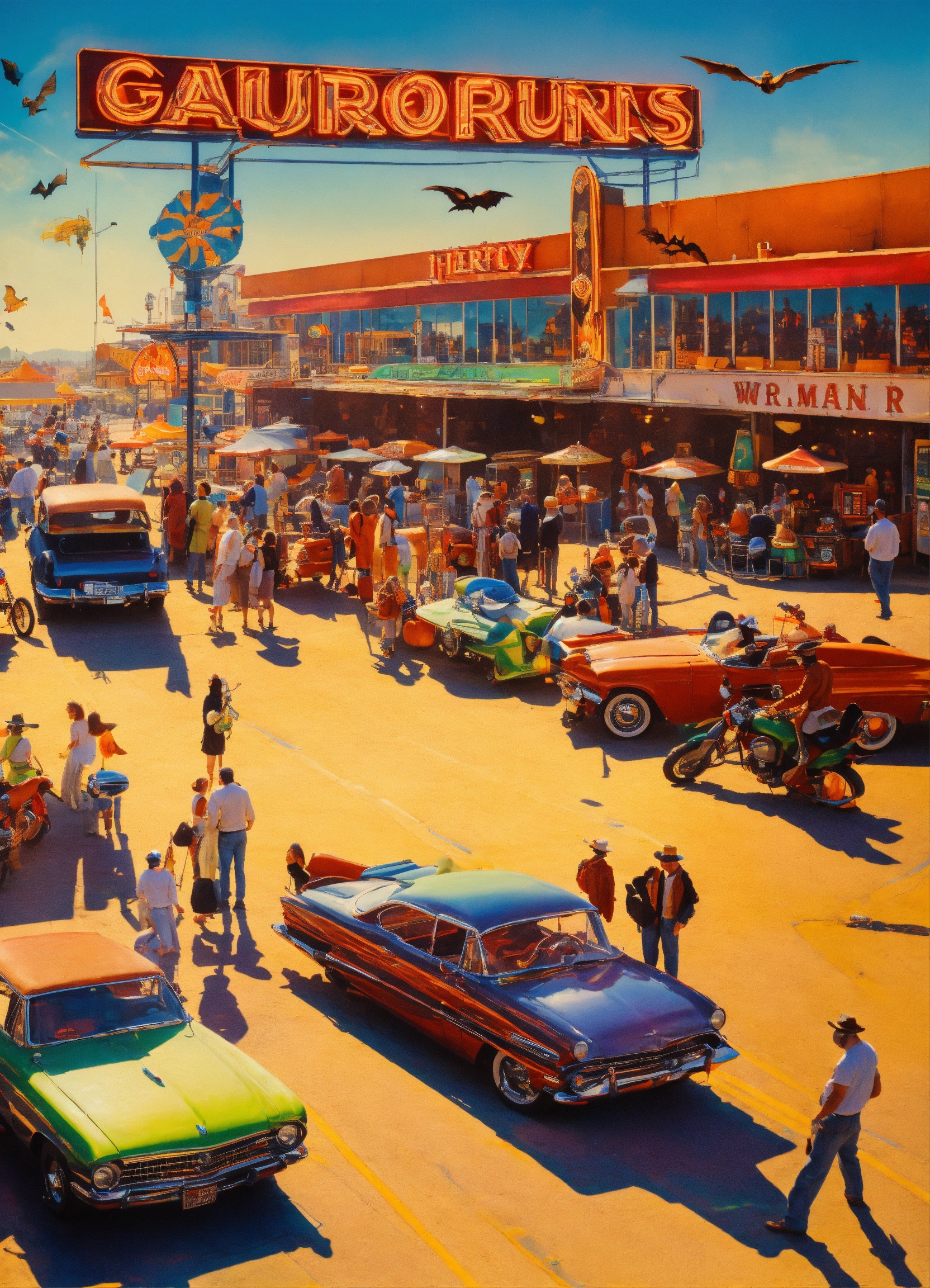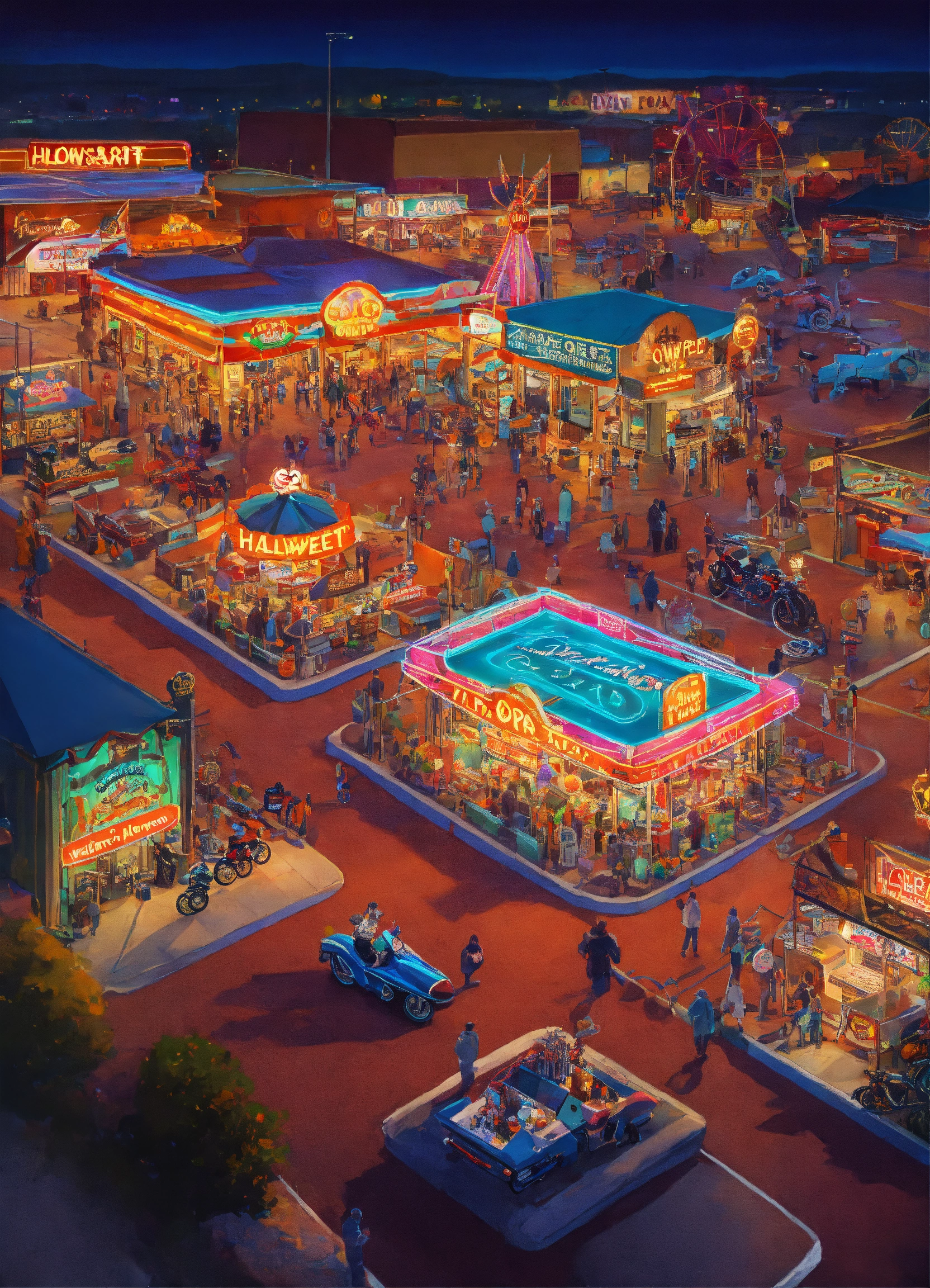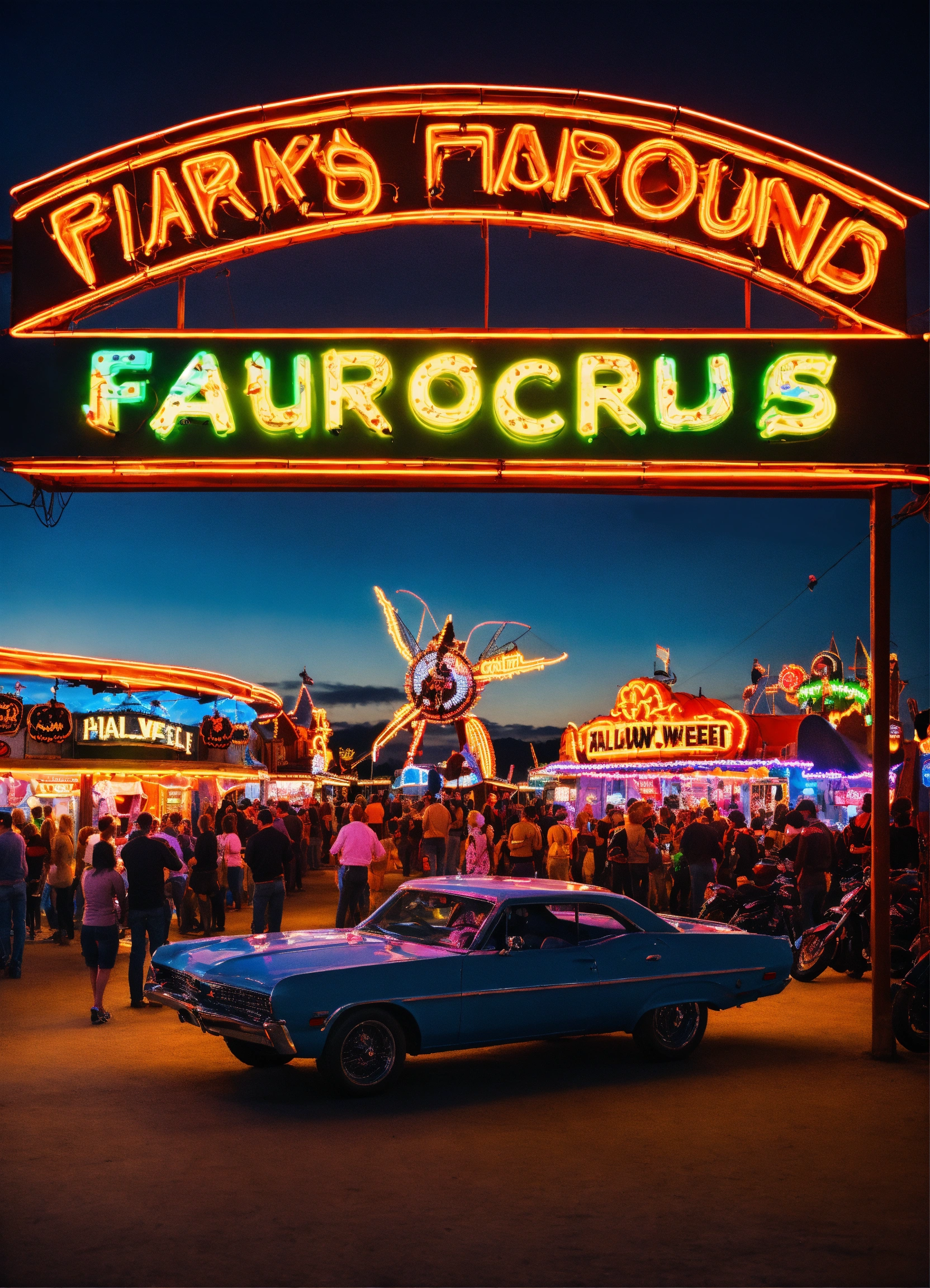 Fairgrounds, cox car, motorcycles, people with halloween mask, bird's eye view shot, ransart in neon sign, sunny atmosphere