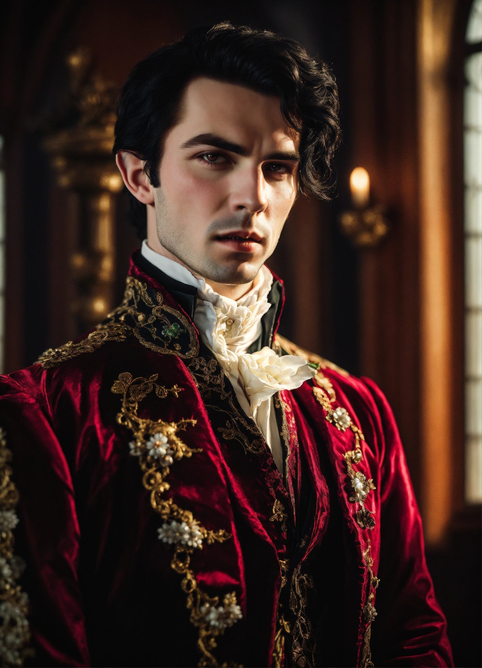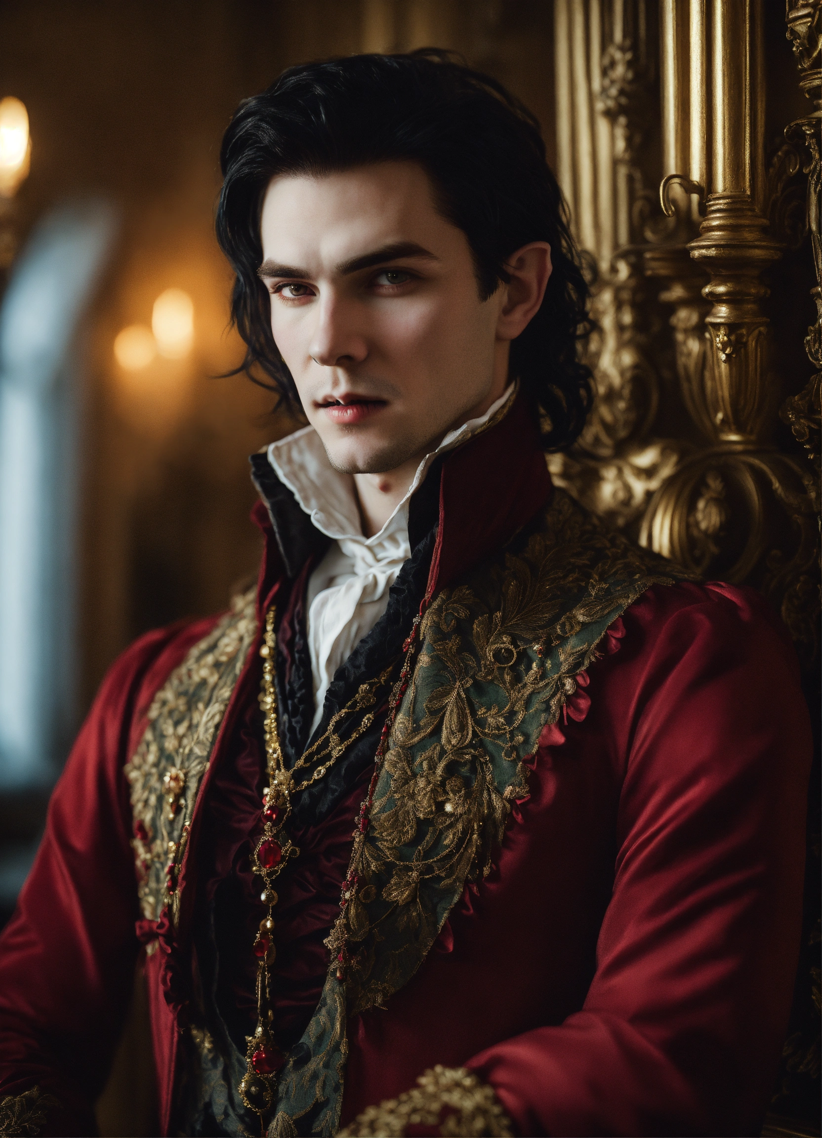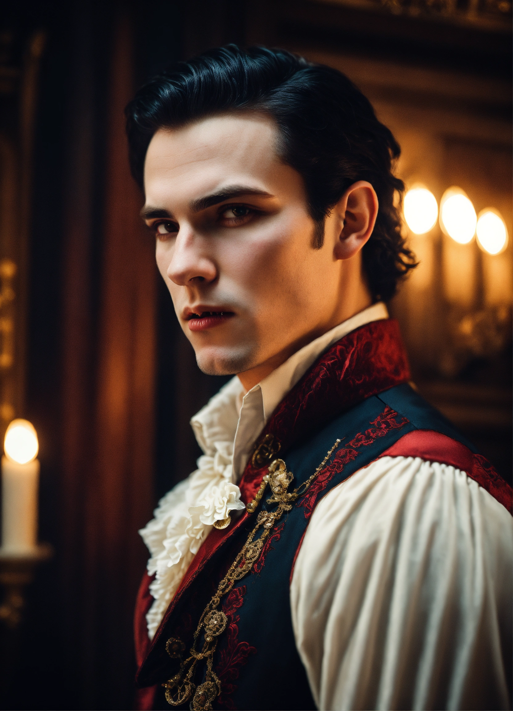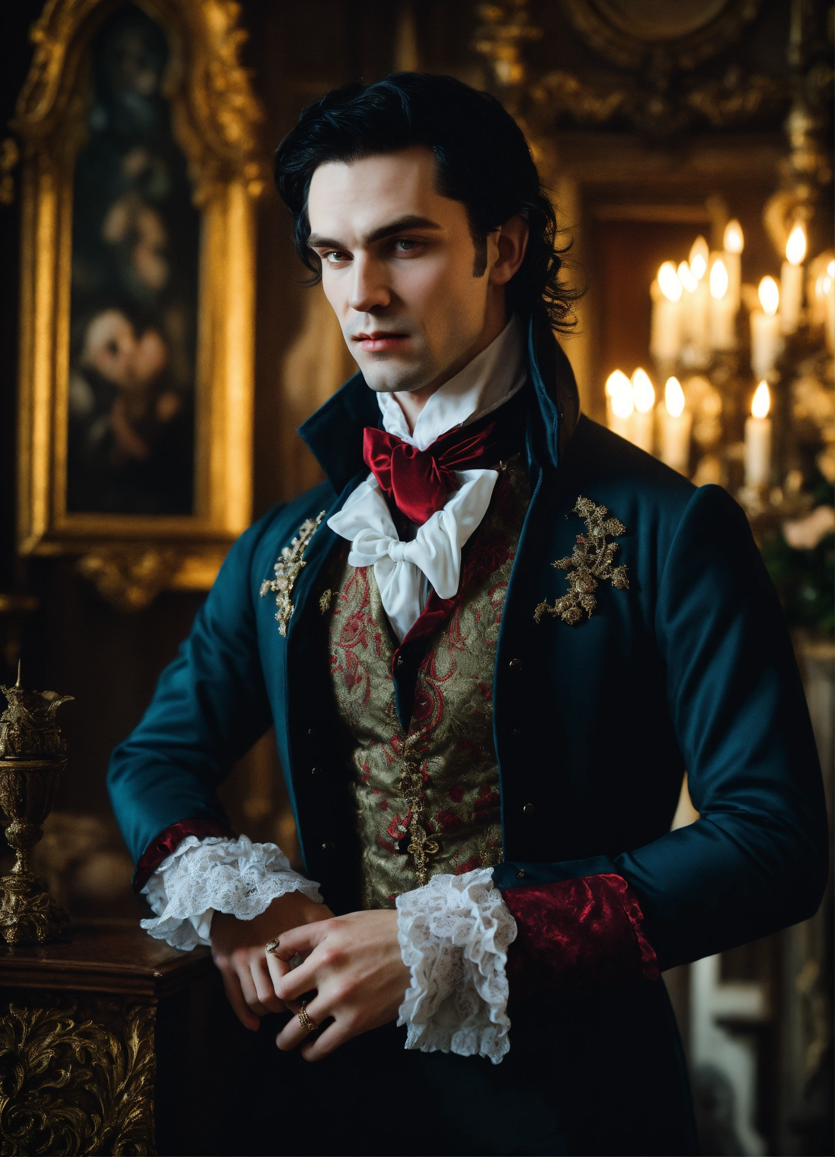 Close up portrait of a beautiful elf male vampire nobleman in an opulent vampire mansion, black hair and pale skin, elegant victorian attire