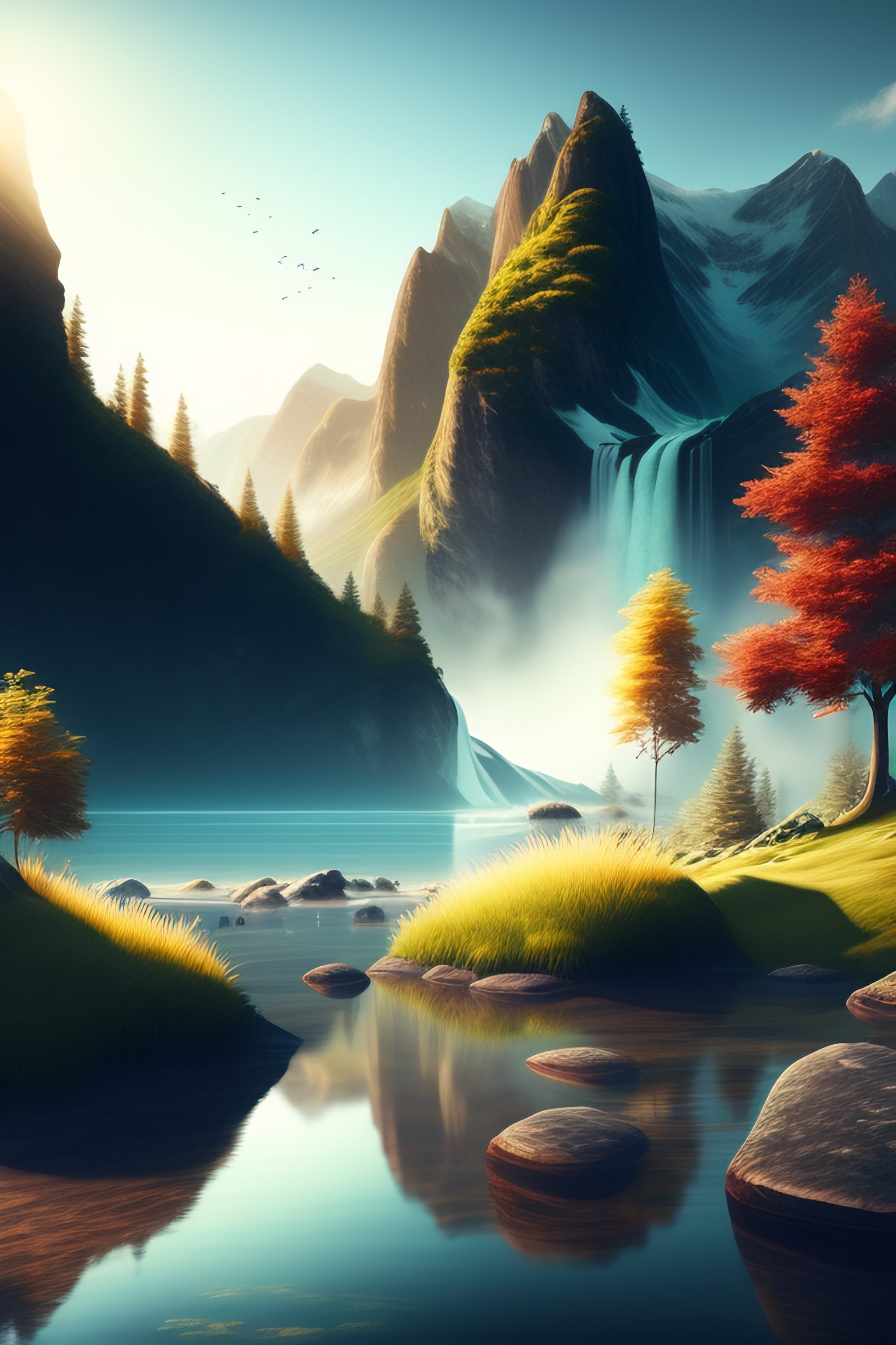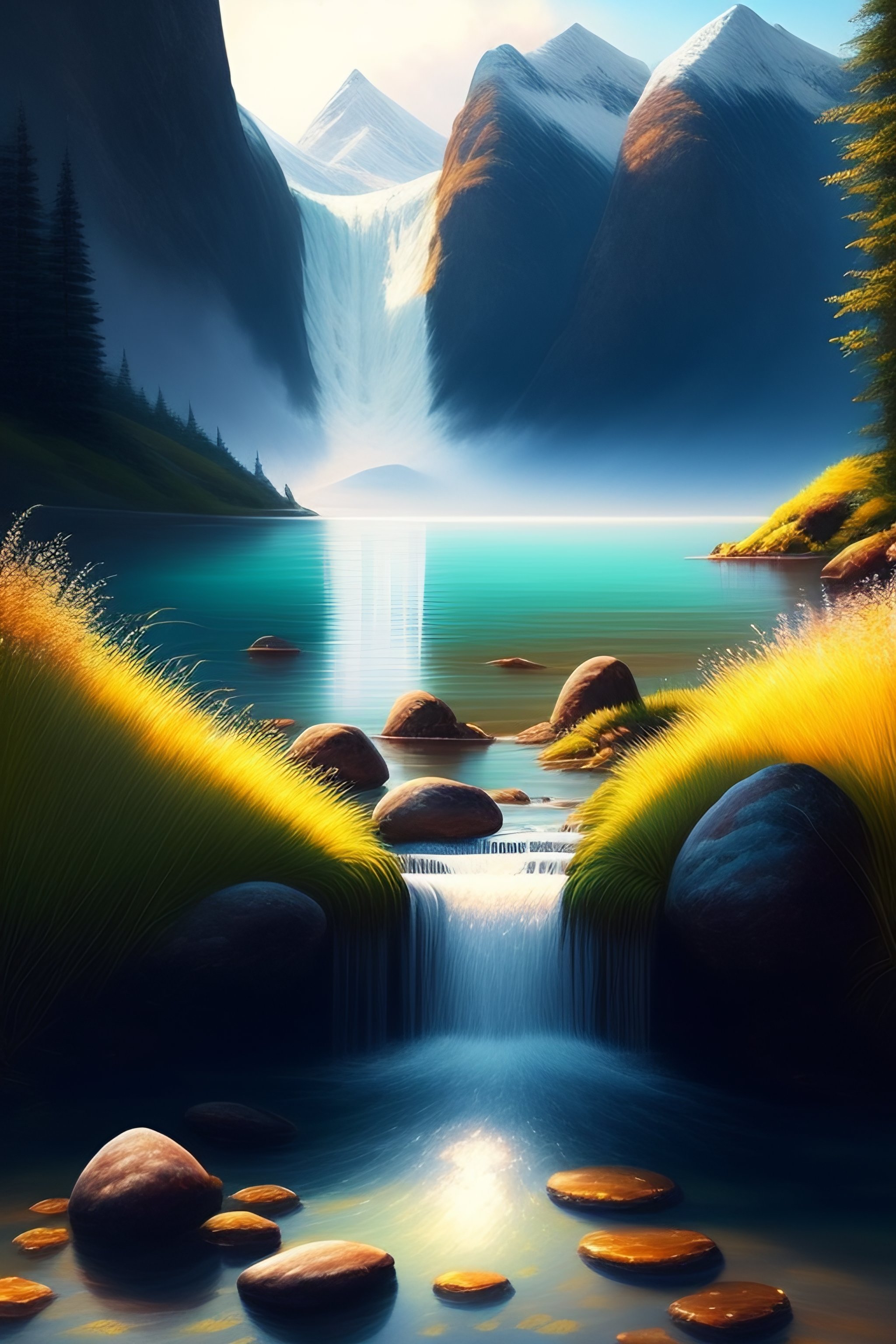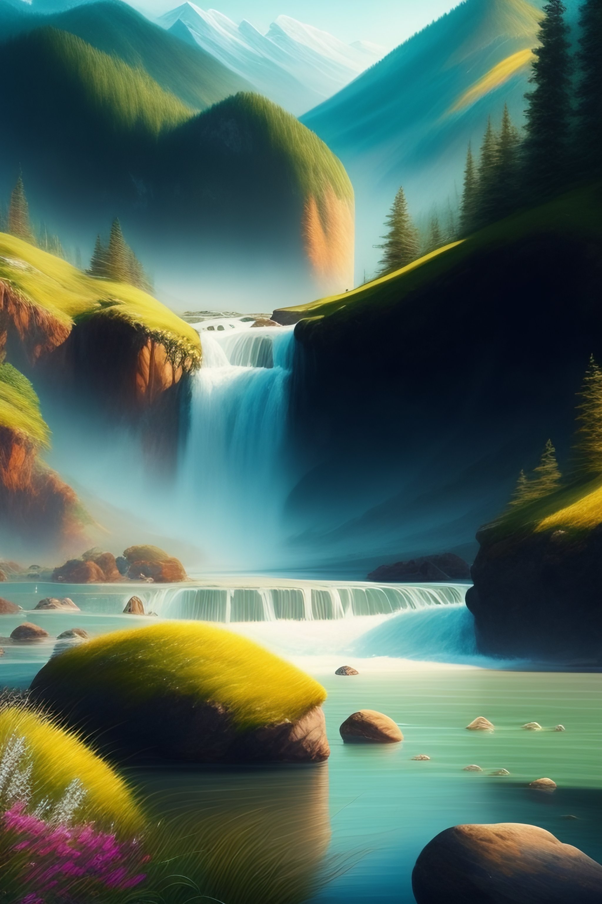 Happiness, landscape, beautiful, incredible, sunshine, mountains, water, trees, light, happy, realism, realistic, photorealism, real, leaves, grass, rocks, ripples, waterfall, mist