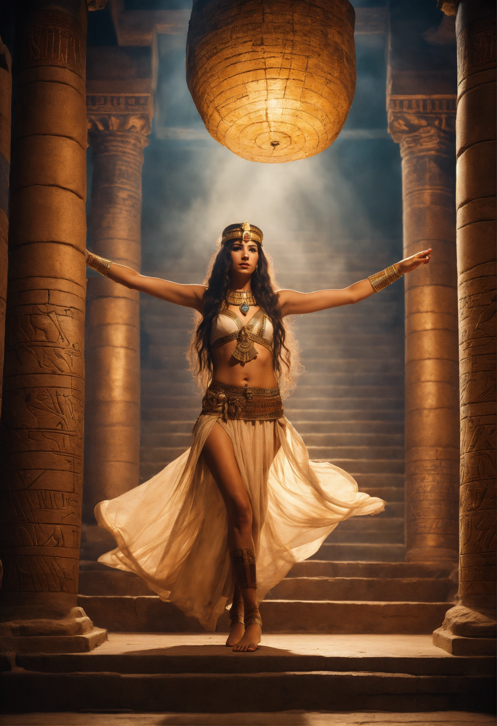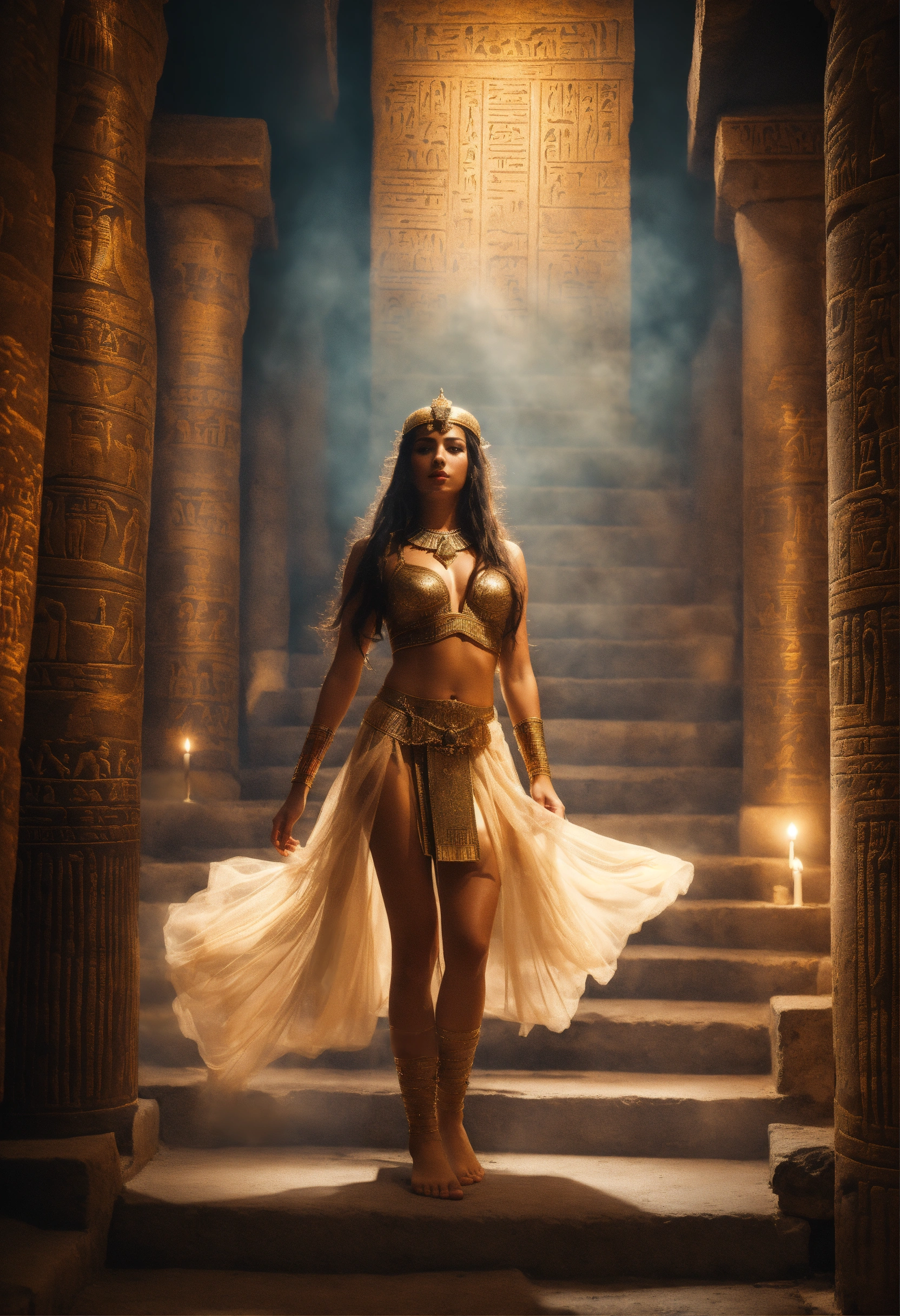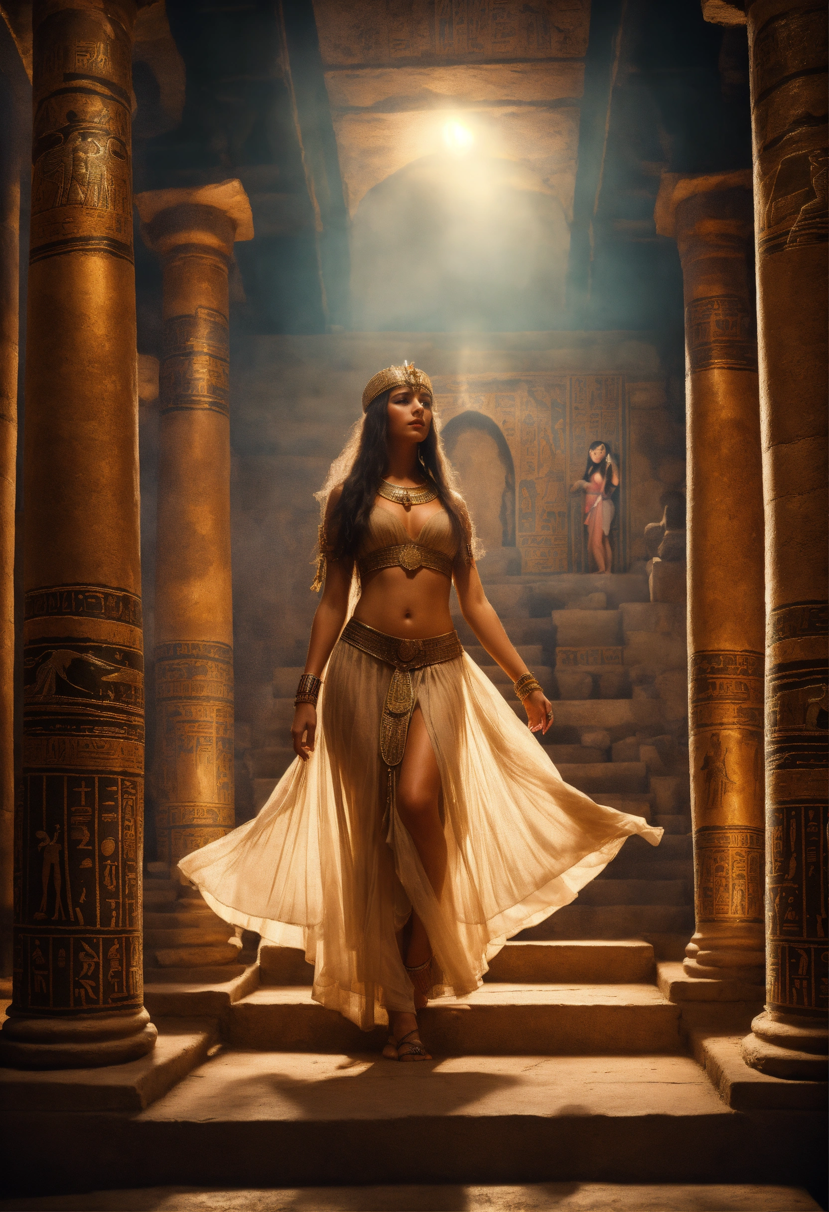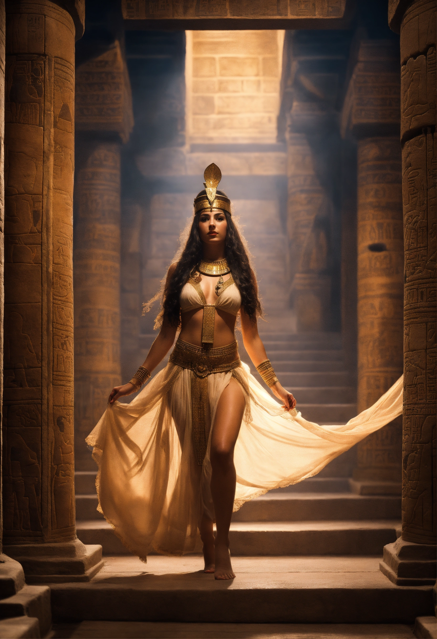 An epic fantasy scene in ancient egypt featuring a gorgeous and beautiful female with long hair, bare feet, in attractive outfit of a crete dancer, in full height, going down the stairs in a dark vault. mysterious and misty atmosphere. side view, sharp detail.